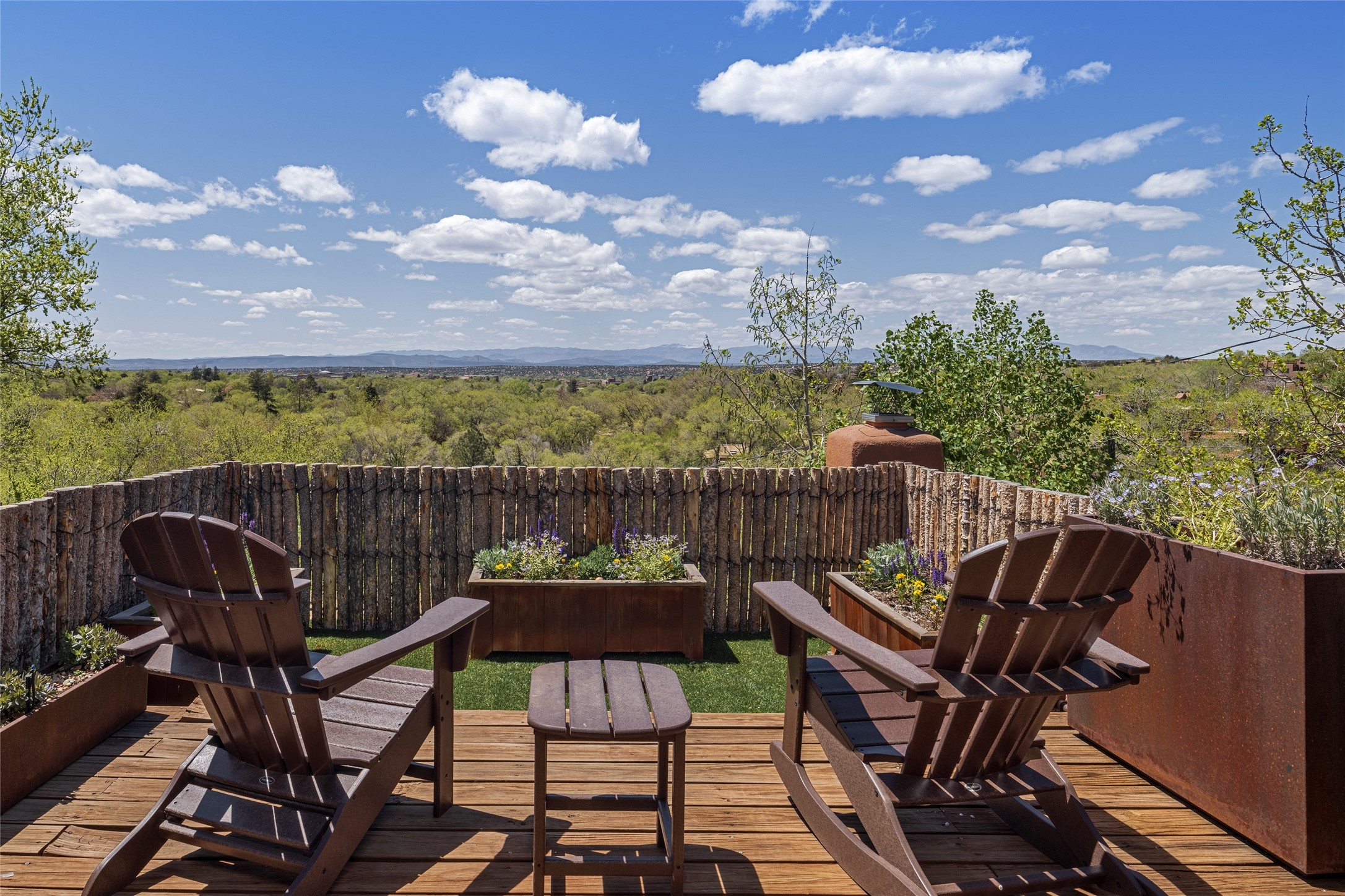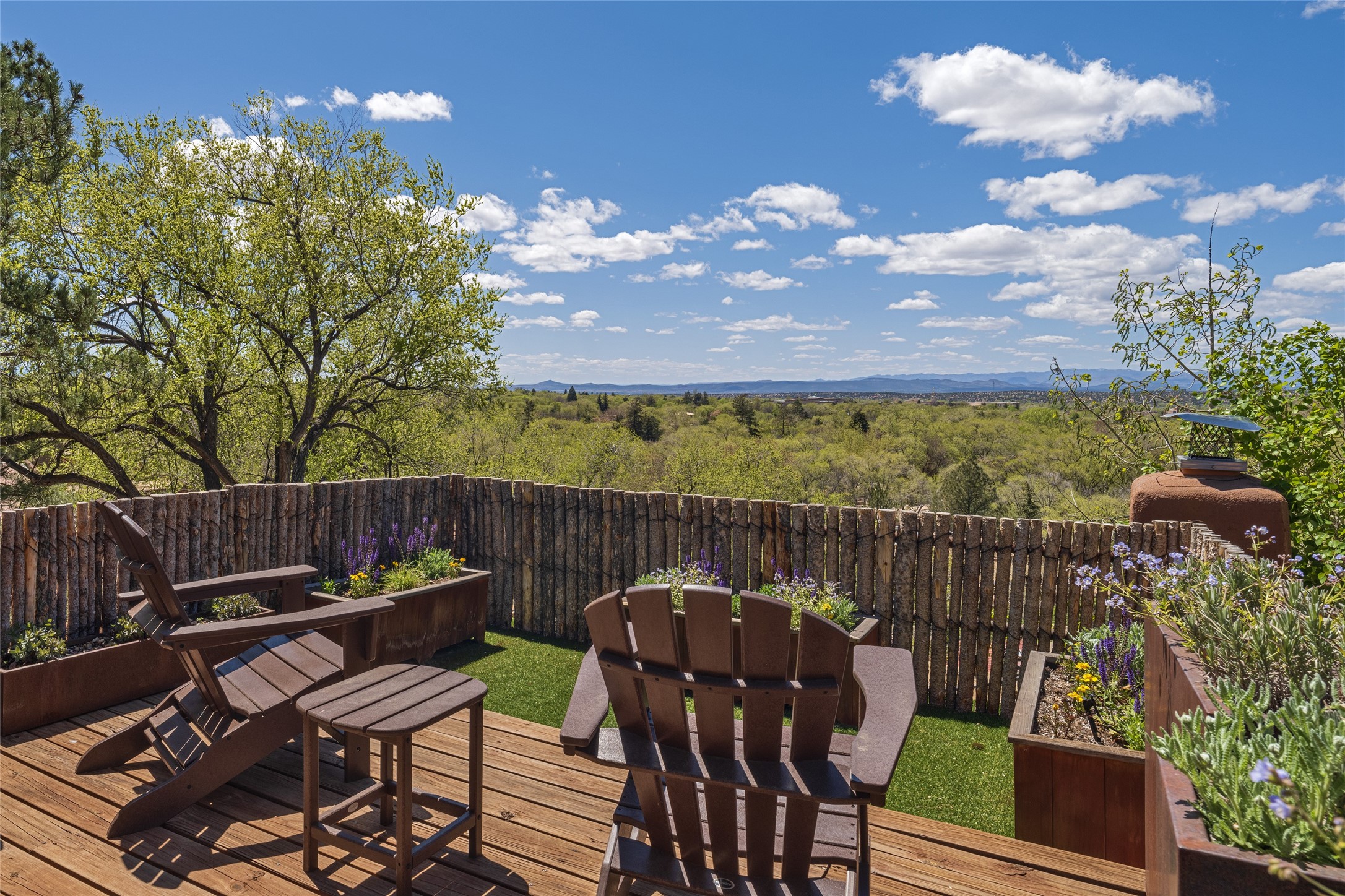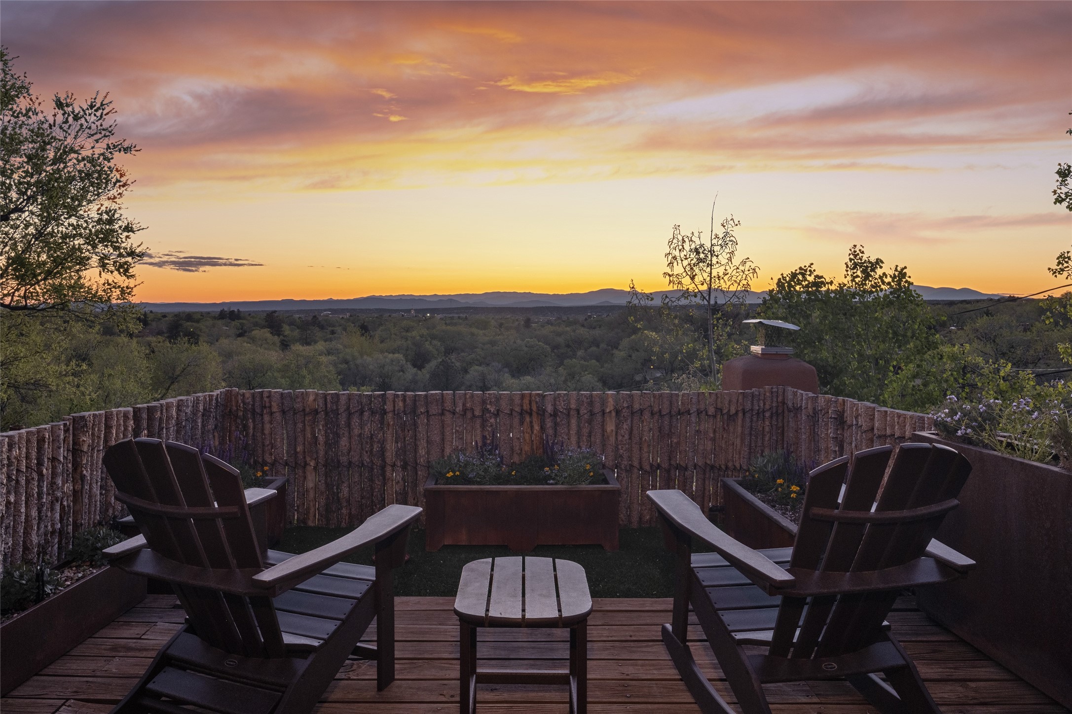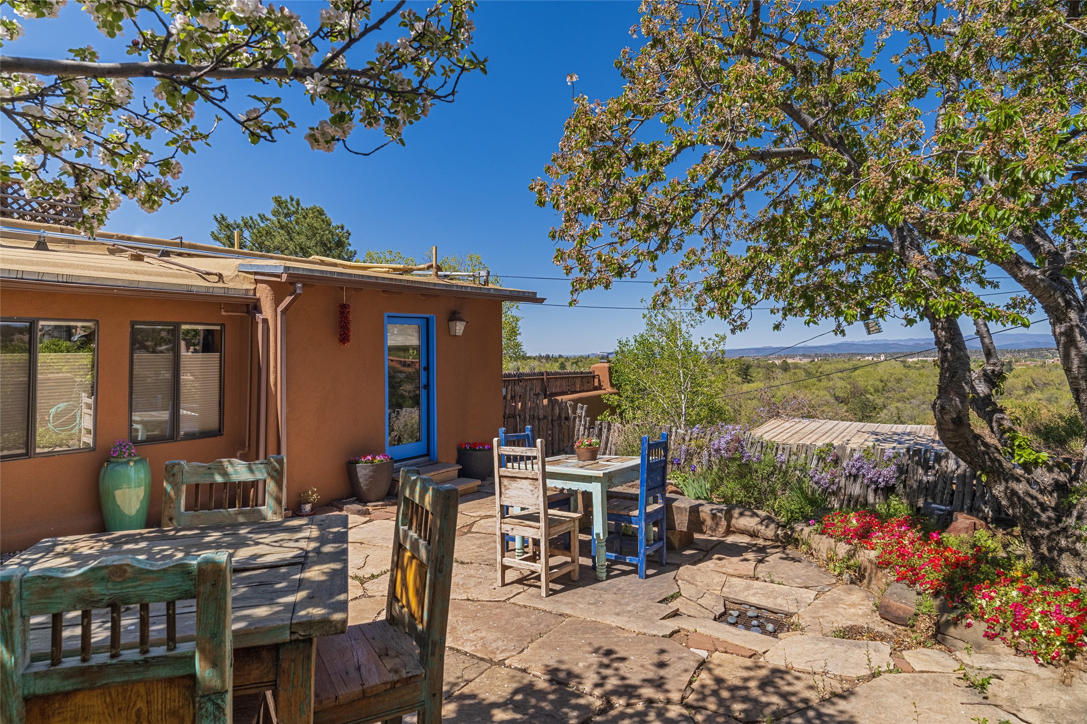 Offering spectacular, sweeping views from its prime Eastside location just above Palace Avenue and celebrated Canyon Road, this thoroughly and superbly transformed adobe & frame one bedroom plus office condo is a rare treasure. The chic open concept kitchen features high-end appliances, including an induction cooktop range & Bosch dishwasher, and beautiful custom cabinets. Upscale finishes & architectural elements throughout, with diamond finish plaster walls, graceful archways, handsome wood floors, vigas, lighted nichos, abundant accent lighting and lovely light fixtures. Additional amenities include Navien on-demand hot water, A/C mini-split units, a completely updated bathroom with walk-in shower, custom window treatments, recently replaced water lines & sewer pipes, plus upgraded electrical panel. The marvelous private deck with charming garden planters was recently expanded, a coyote fence added, and drip irrigation installed. A separate spacious terrace with potted plants and beautiful mature cherry tree is ideal for relaxation, alfresco dining and entertaining. One of just four residences in this lovely compound. Keep this special retreat for your own private enjoyment, plus have the ability to rent it for 30 days or longer, per COA documents. What a marvelous escape in this tranquil setting.