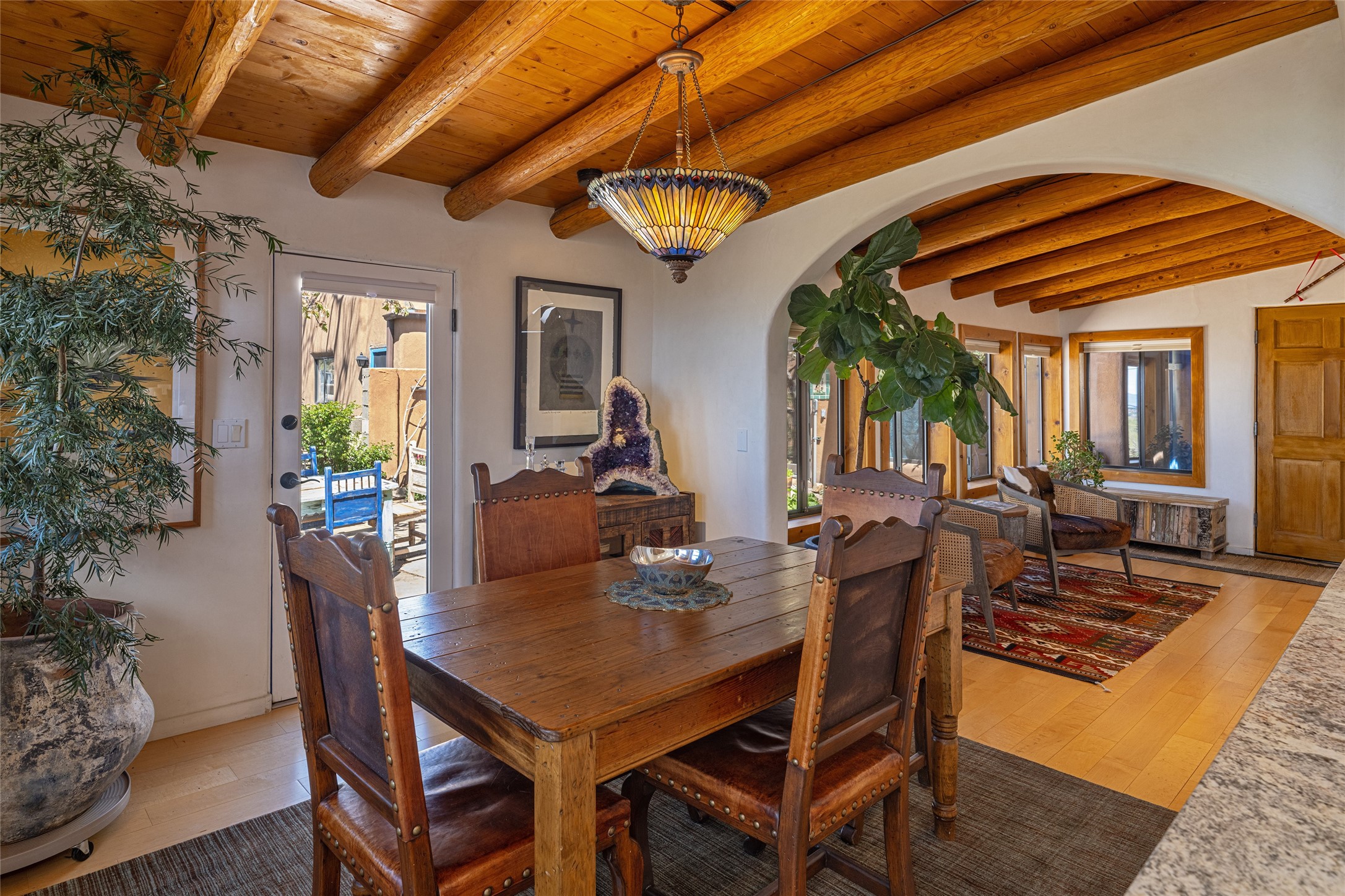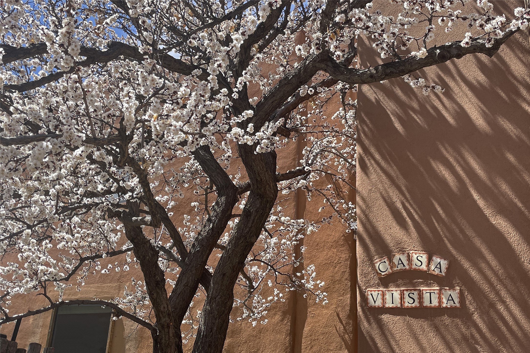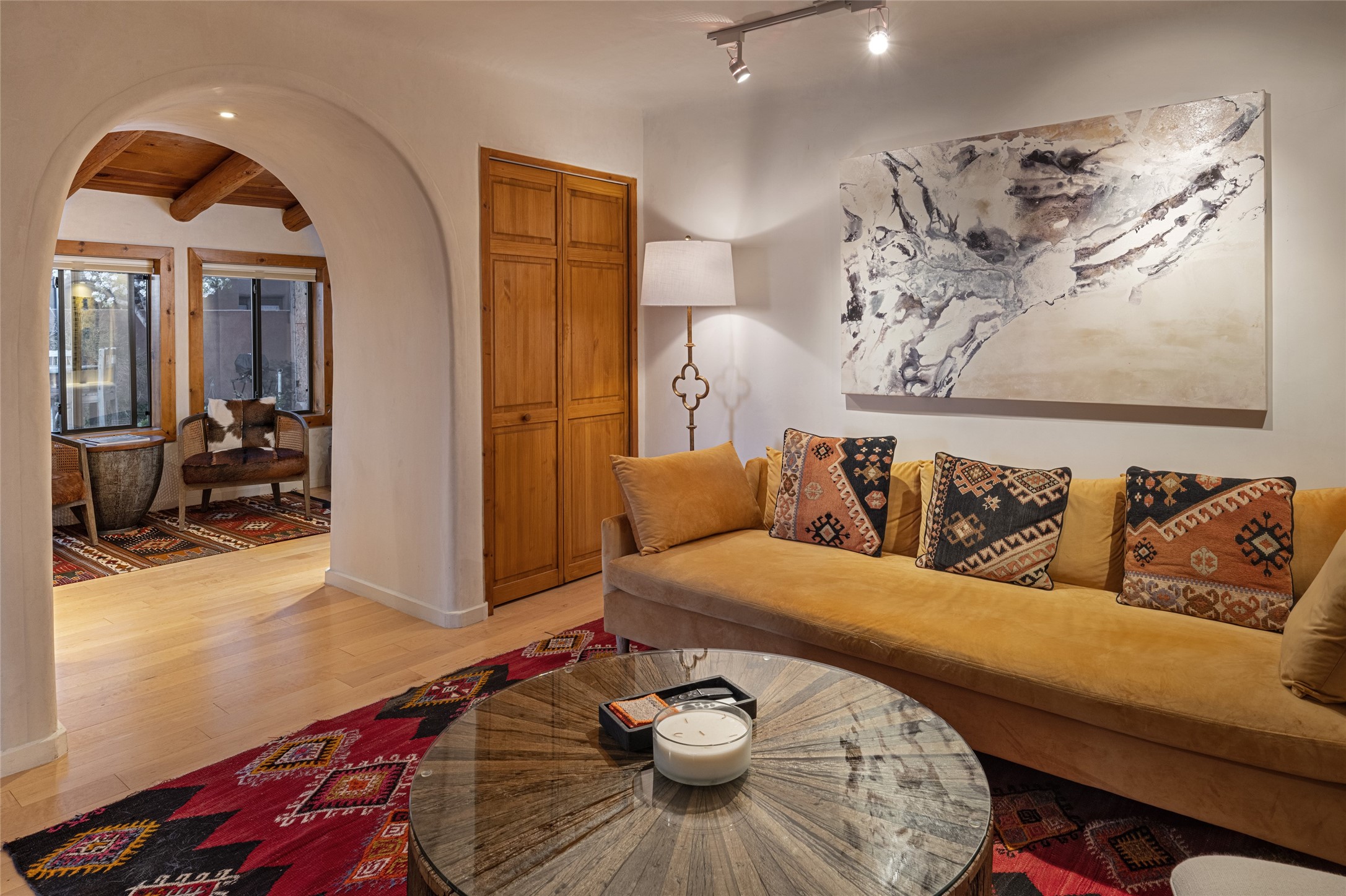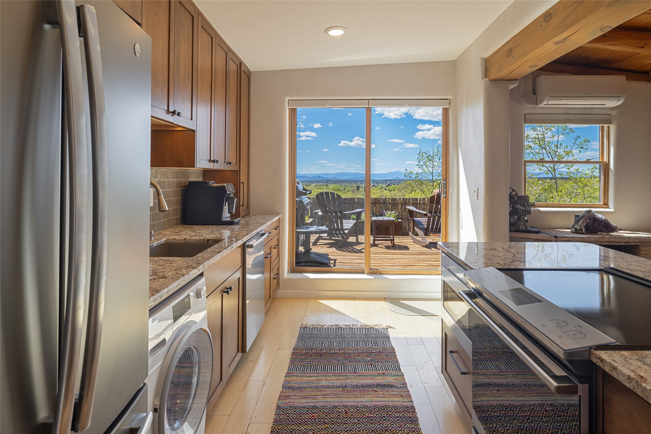 Offering spectacular, sweeping views from its prime Eastside location just above Palace Avenue and celebrated Canyon Road, this thoroughly and superbly transformed adobe & frame one bedroom plus office condo is a rare treasure. The chic open concept kitchen features high-end appliances, including an induction cooktop range & Bosch dishwasher, and beautiful custom cabinets. Upscale finishes & architectural elements throughout, with diamond finish plaster walls, graceful archways, handsome wood floors, vigas, lighted nichos, abundant accent lighting and lovely light fixtures. Additional amenities include Navien on-demand hot water, A/C mini-split units, a completely updated bathroom with walk-in shower, custom window treatments, recently replaced water lines & sewer pipes, plus upgraded electrical panel. The marvelous private deck with charming garden planters was recently expanded, a coyote fence added, and drip irrigation installed. A separate spacious terrace with potted plants and beautiful mature cherry tree is ideal for relaxation, alfresco dining and entertaining. One of just four residences in this lovely compound. Keep this special retreat for your own private enjoyment, plus have the ability to rent it for 30 days or longer, per COA documents. What a marvelous escape in this tranquil setting.
