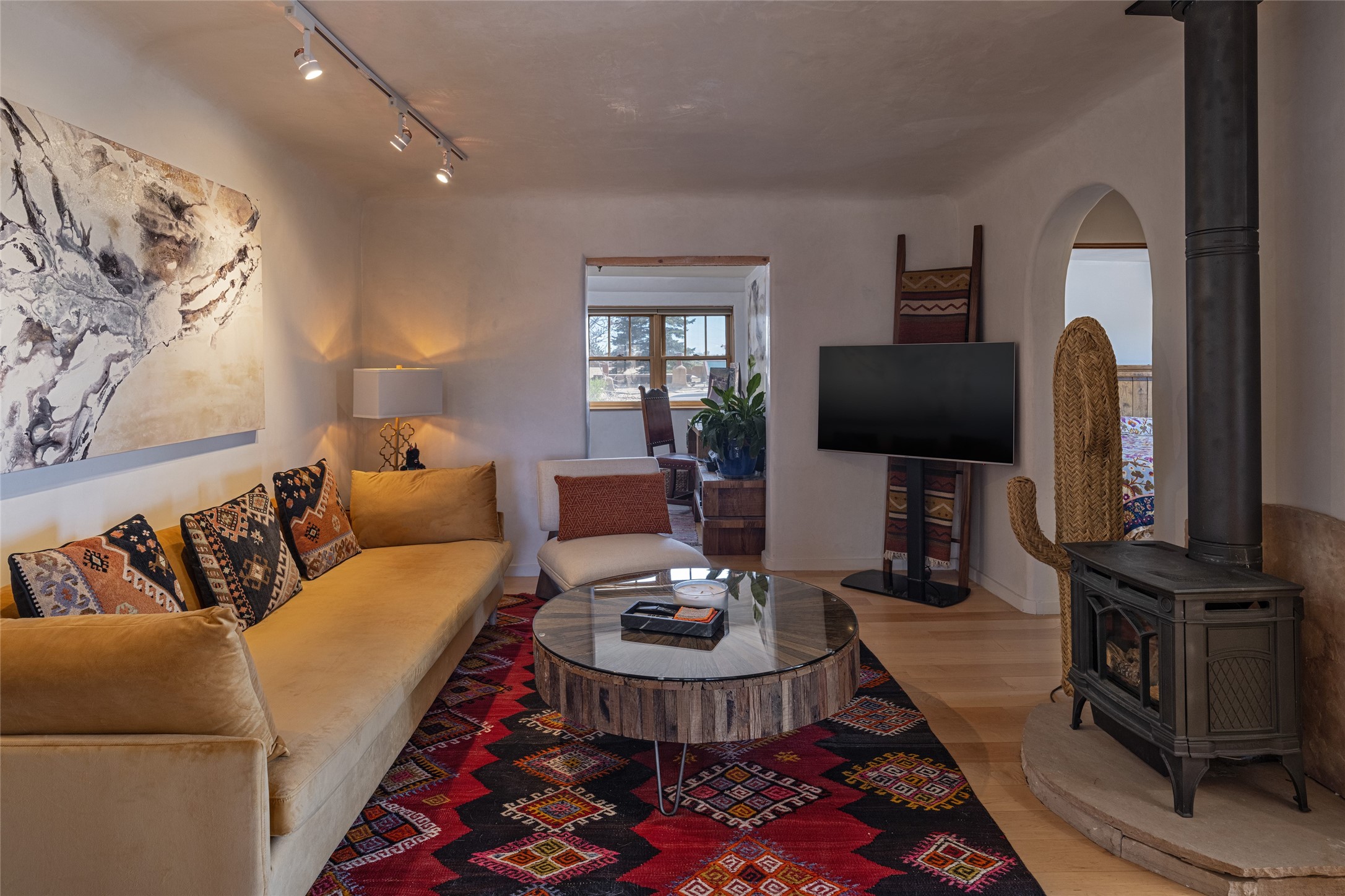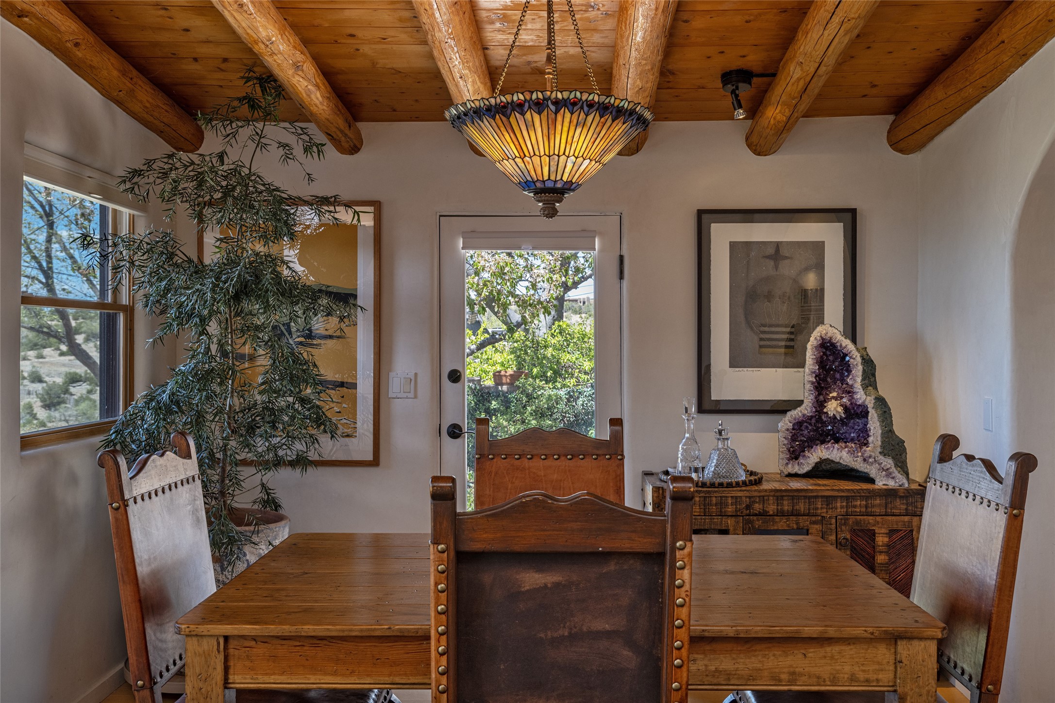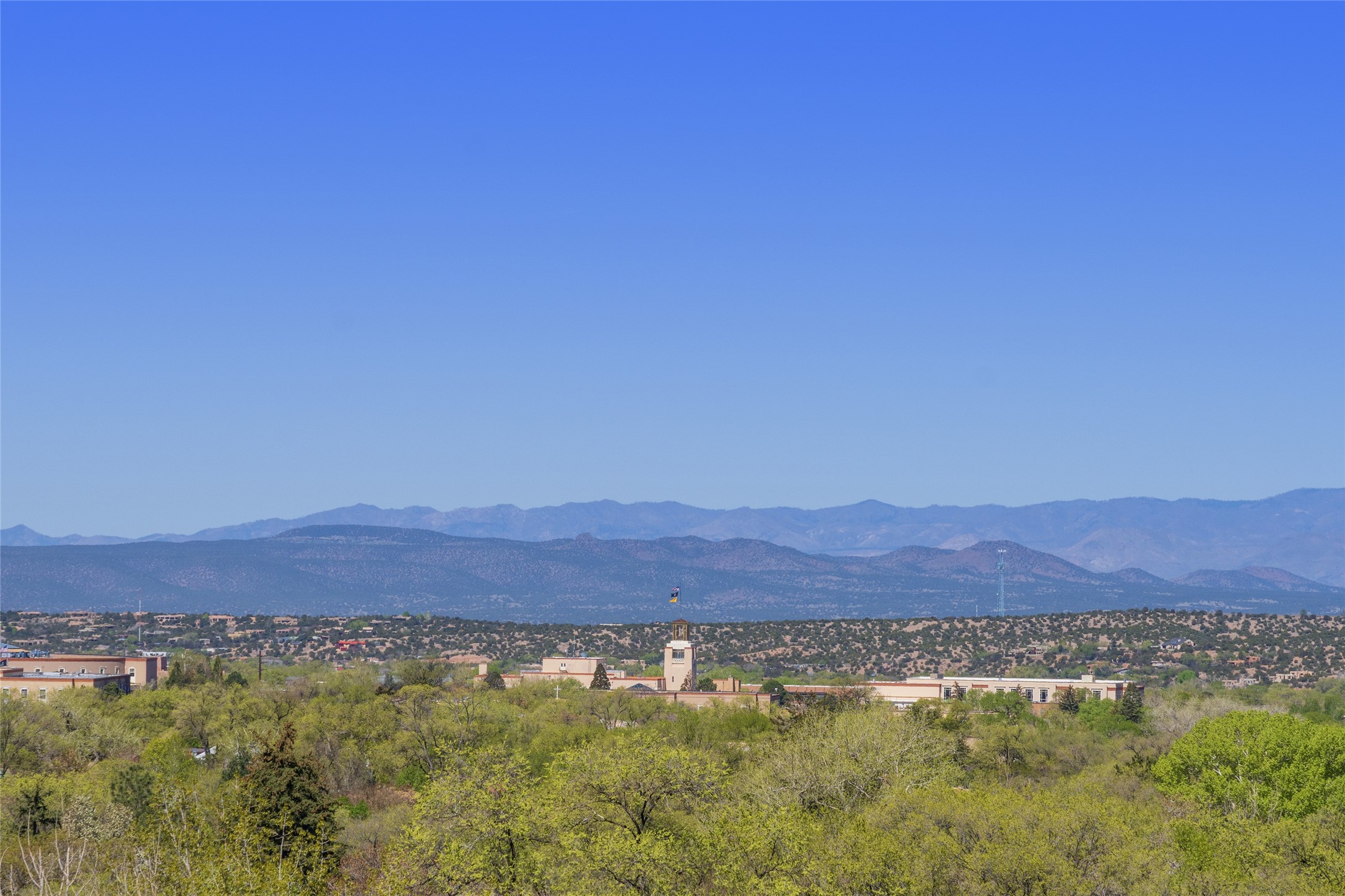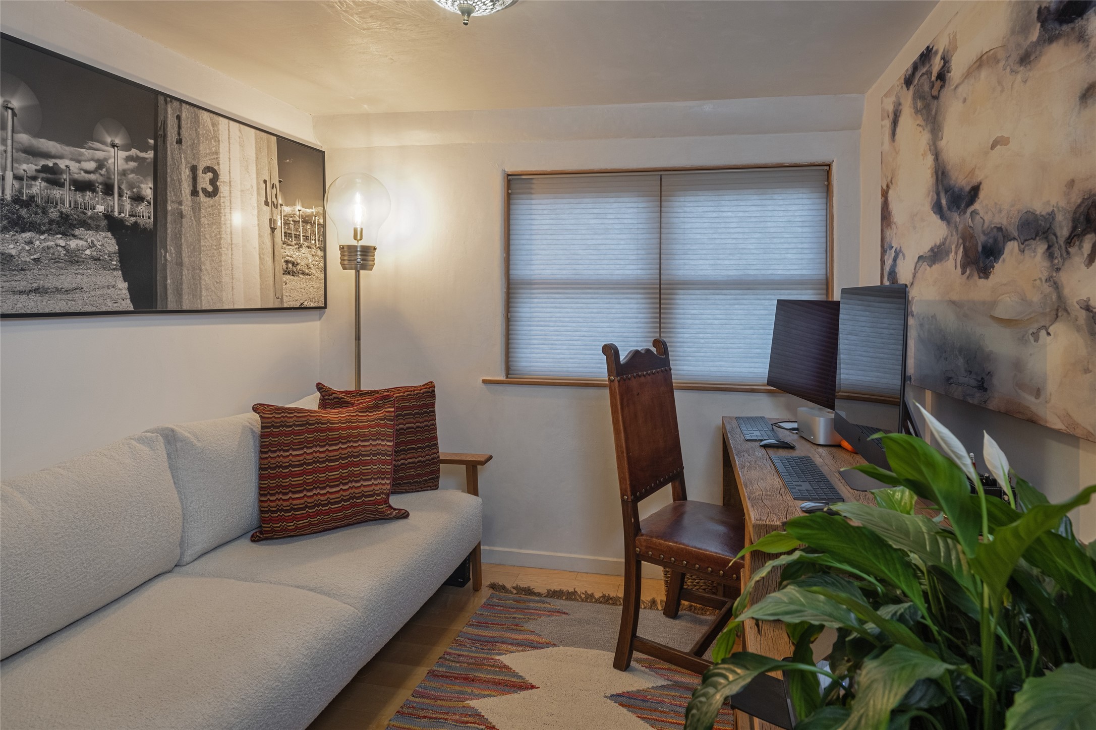 Offering spectacular, sweeping views from its prime Eastside location just above Palace Avenue and celebrated Canyon Road, this thoroughly and superbly transformed adobe & frame one bedroom plus office condo is a rare treasure. The chic open concept kitchen features high-end appliances, including an induction cooktop range & Bosch dishwasher, and beautiful custom cabinets. Upscale finishes & architectural elements throughout, with diamond finish plaster walls, graceful archways, handsome wood floors, vigas, lighted nichos, abundant accent lighting and lovely light fixtures. Additional amenities include Navien on-demand hot water, A/C mini-split units, a completely updated bathroom with walk-in shower, custom window treatments, recently replaced water lines & sewer pipes, plus upgraded electrical panel. The marvelous private deck with charming garden planters was recently expanded, a coyote fence added, and drip irrigation installed. A separate spacious terrace with potted plants and beautiful mature cherry tree is ideal for relaxation, alfresco dining and entertaining. One of just four residences in this lovely compound. Keep this special retreat for your own private enjoyment, plus have the ability to rent it for 30 days or longer, per COA documents. What a marvelous escape in this tranquil setting.