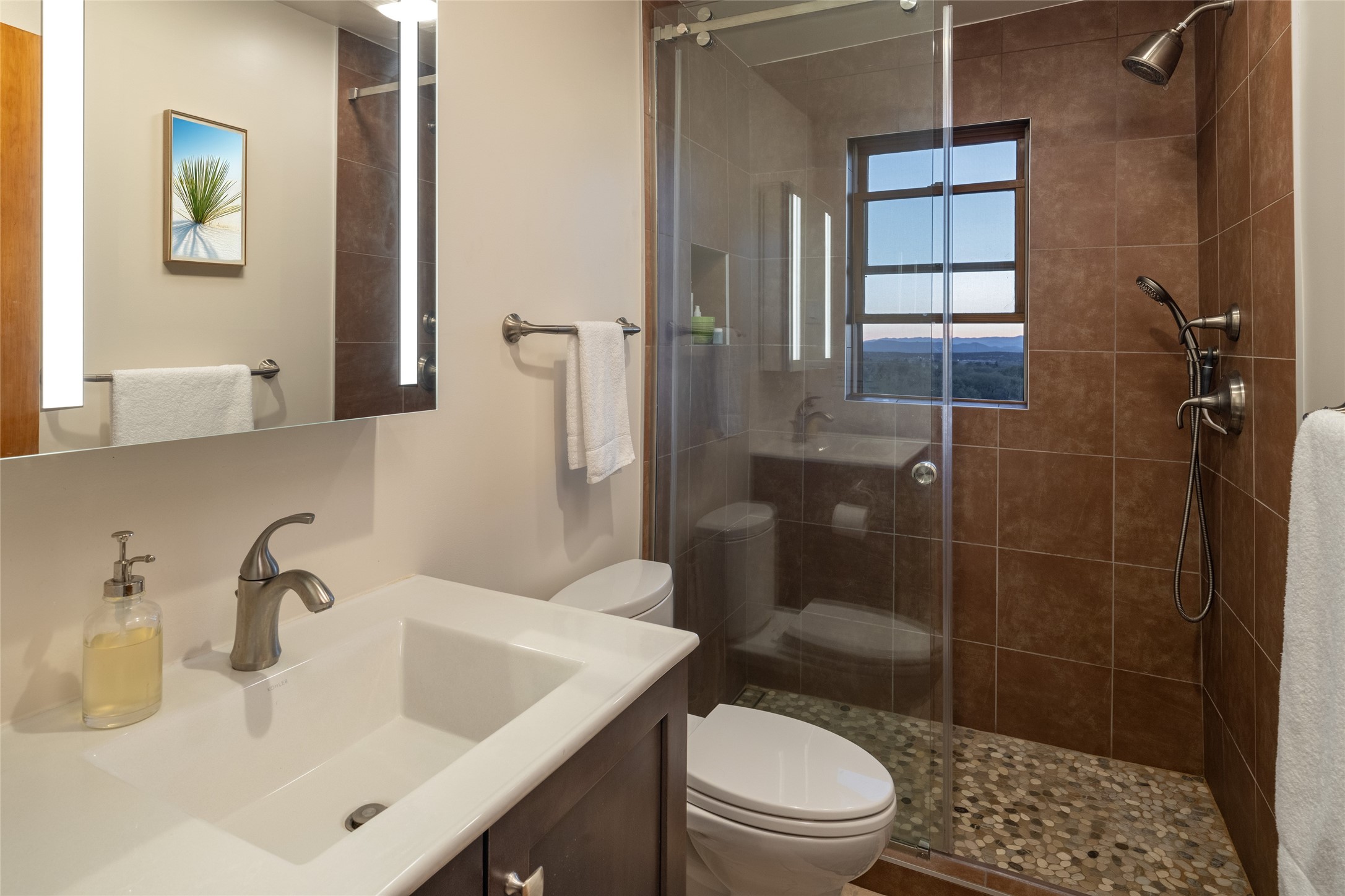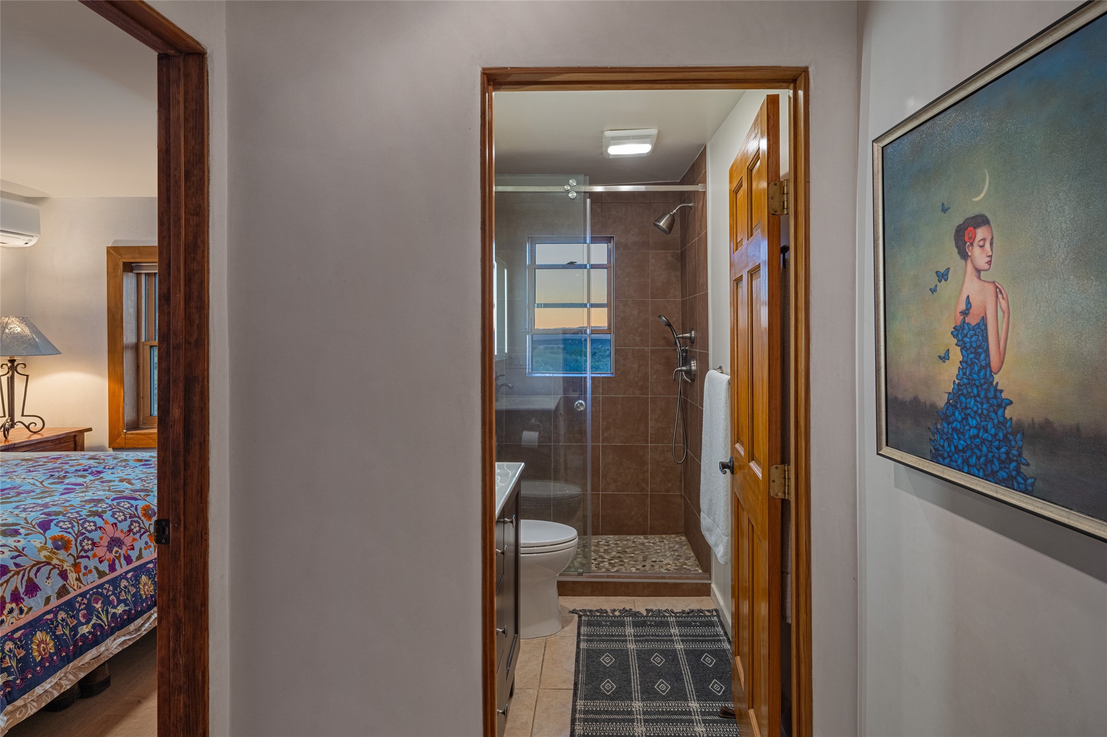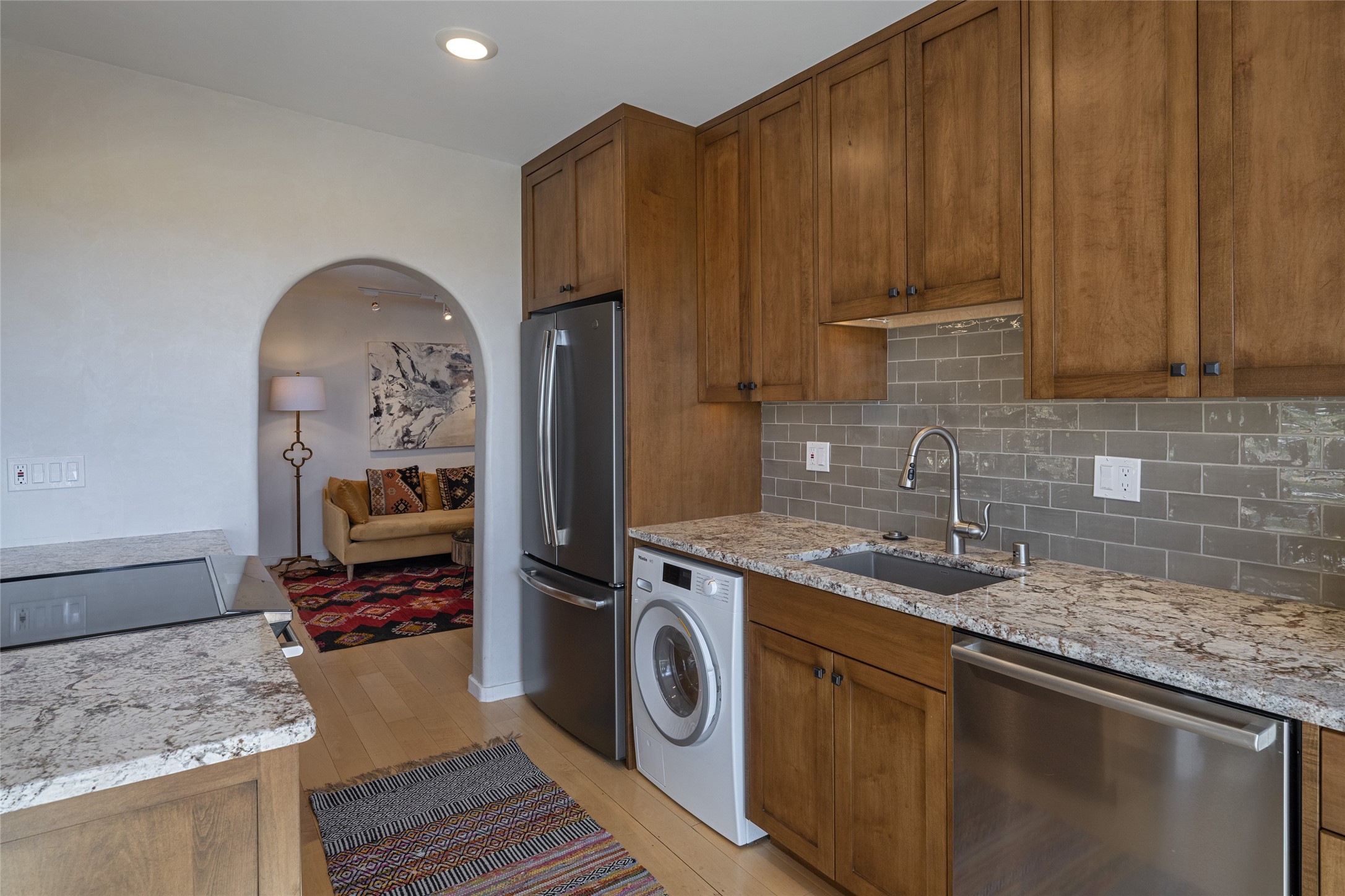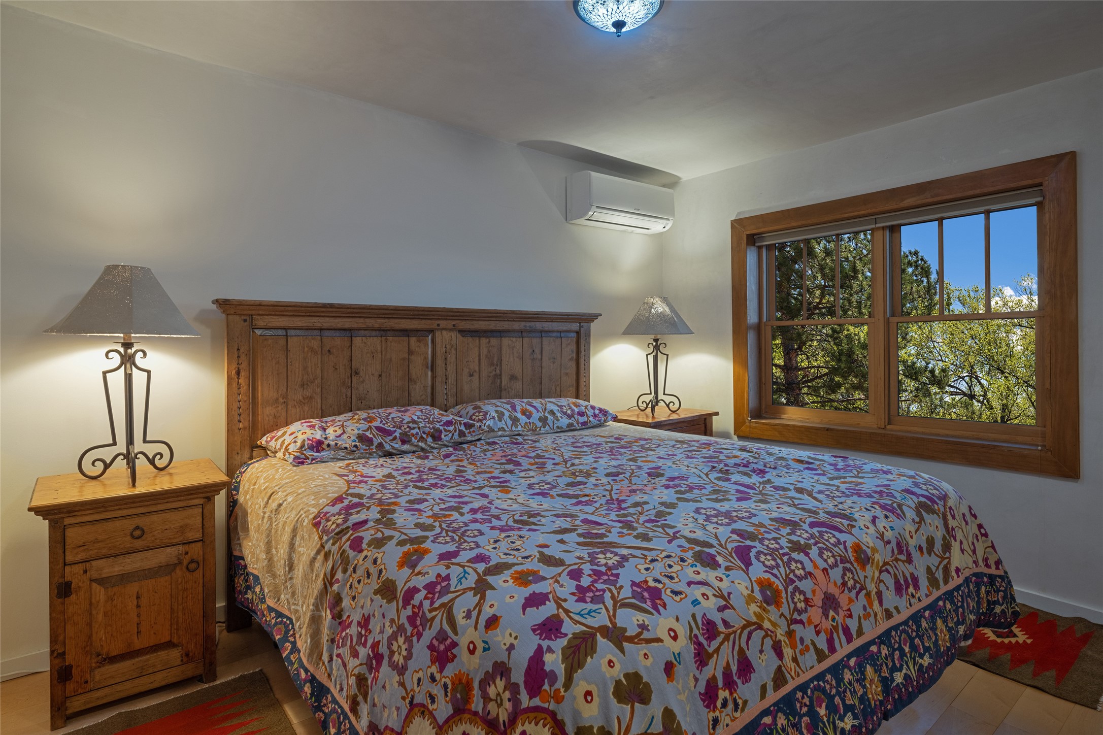 Offering spectacular, sweeping views from its prime Eastside location just above Palace Avenue and celebrated Canyon Road, this thoroughly and superbly transformed adobe & frame one bedroom plus office condo is a rare treasure. The chic open concept kitchen features high-end appliances, including an induction cooktop range & Bosch dishwasher, and beautiful custom cabinets. Upscale finishes & architectural elements throughout, with diamond finish plaster walls, graceful archways, handsome wood floors, vigas, lighted nichos, abundant accent lighting and lovely light fixtures. Additional amenities include Navien on-demand hot water, A/C mini-split units, a completely updated bathroom with walk-in shower, custom window treatments, recently replaced water lines & sewer pipes, plus upgraded electrical panel. The marvelous private deck with charming garden planters was recently expanded, a coyote fence added, and drip irrigation installed. A separate spacious terrace with potted plants and beautiful mature cherry tree is ideal for relaxation, alfresco dining and entertaining. One of just four residences in this lovely compound. Keep this special retreat for your own private enjoyment, plus have the ability to rent it for 30 days or longer, per COA documents. What a marvelous escape in this tranquil setting.
