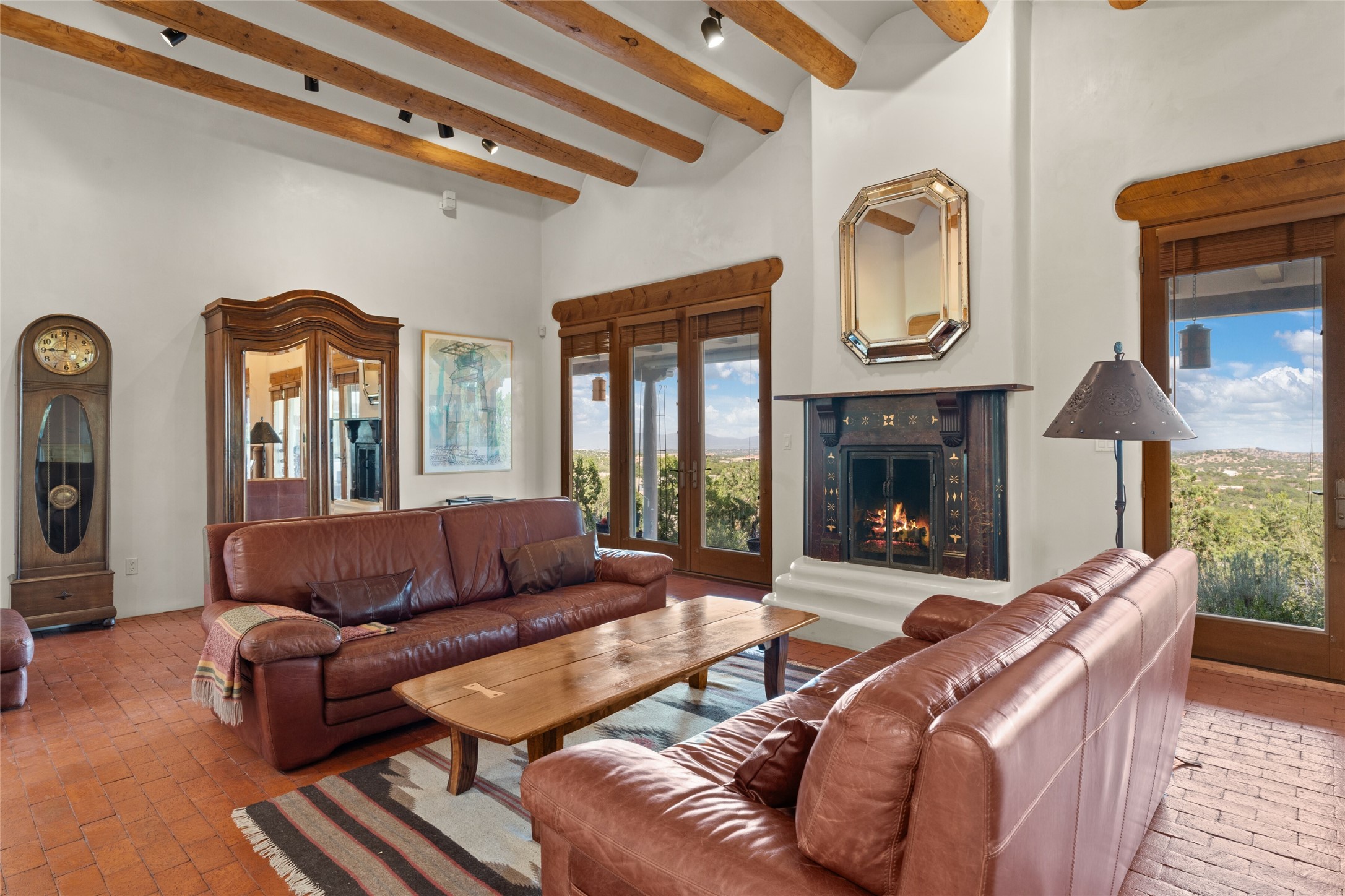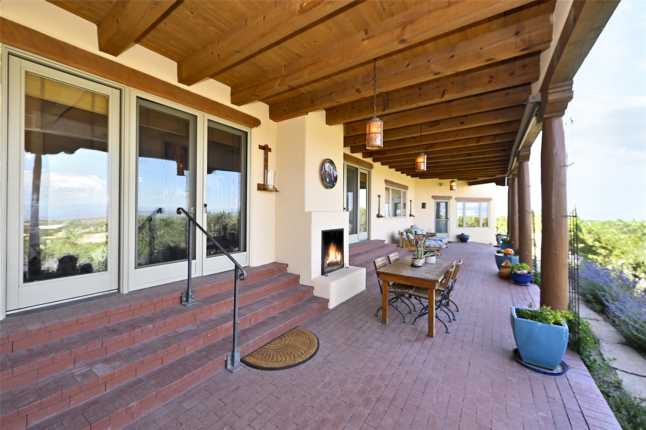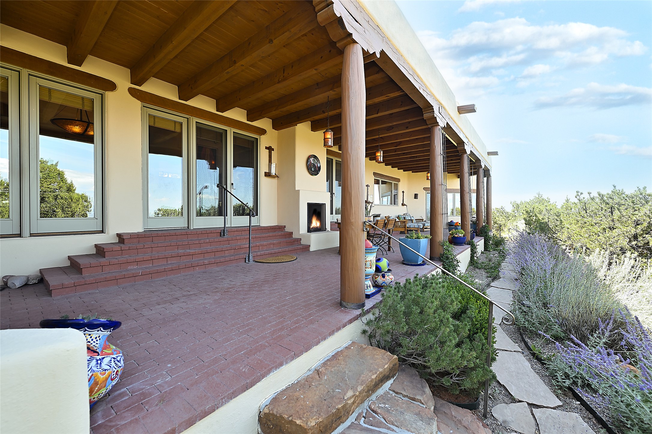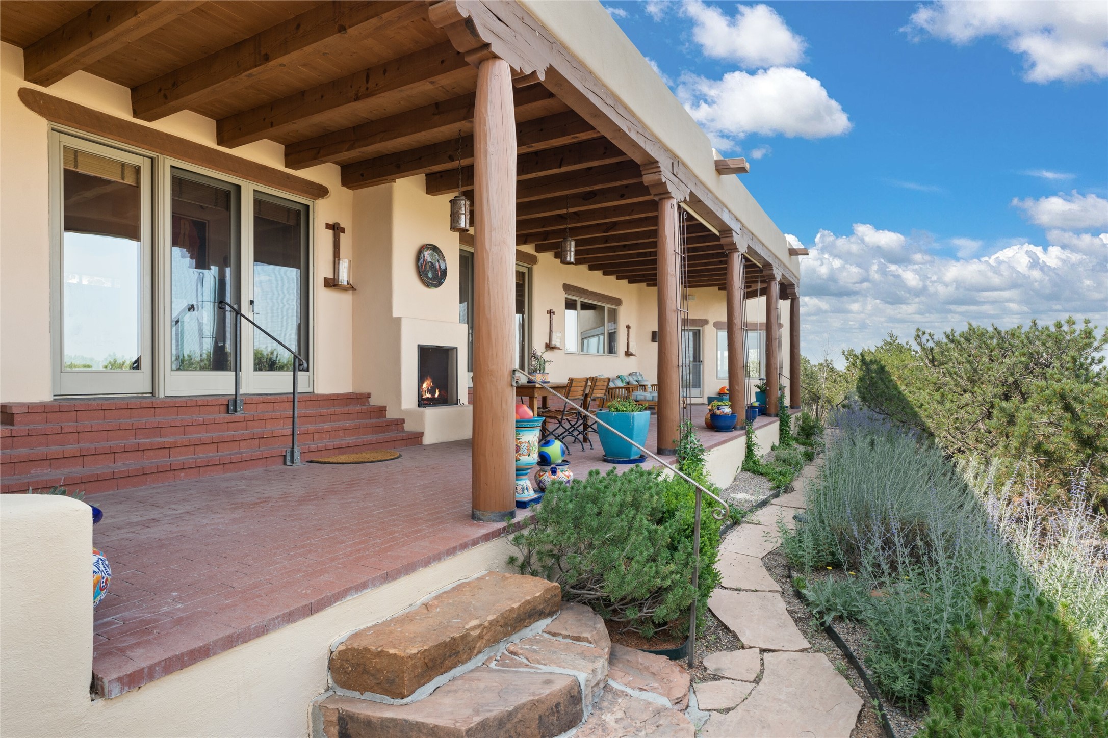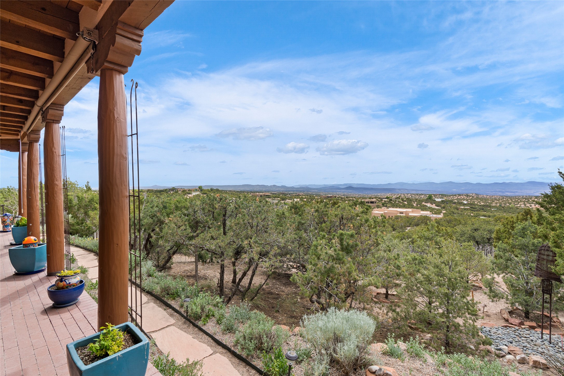 Ready to sell! Experience spectacular mountain views in every direction from this traditional Pueblo-style residence, perched on a knoll atop approximately 2.5 acres. This home radiates warmth and charm throughout, featuring vigas, coved ceilings, plank and latilla ceilings. The newly plastered walls are adorned with charming nichos. Alder wood doors and cabinetry are found throughout the home. Tall French doors and windows in the living and dining rooms bathe the space in natural light while framing breathtaking views. Eighteen-foot ceilings create an expansive, open feel, and additional French doors lead to an extraordinary portal that offers panoramic views, ample seating, dining areas, a fireplace, and a grill--perfect for outdoor living. The surrounding landscape is meticulously maintained, with lovely gardens. The kitchen shares its own lush garden portal. The spacious primary bedroom, which includes a kiva fireplace, two generous closets, and a luxurious bath. The second bedroom boasts exceptional views and an ensuite bath. A large art studio with stunning vistas, which can also serve as a third bedroom, has direct access to the portal. The home is rich with history, featuring nineteenth-century double entry doors shipped from St. Louis and a slate and iron fireplace in the living room, adding an artful touch from the past. A charming walled front courtyard, filled with vibrant flowers, creates a delightful entrance. Beyond the beautiful architecture, the private location offers peaceful, noiseless nights under a sky full of stars--all just a short drive from the city. This remarkable property is now ready for its next chapter!