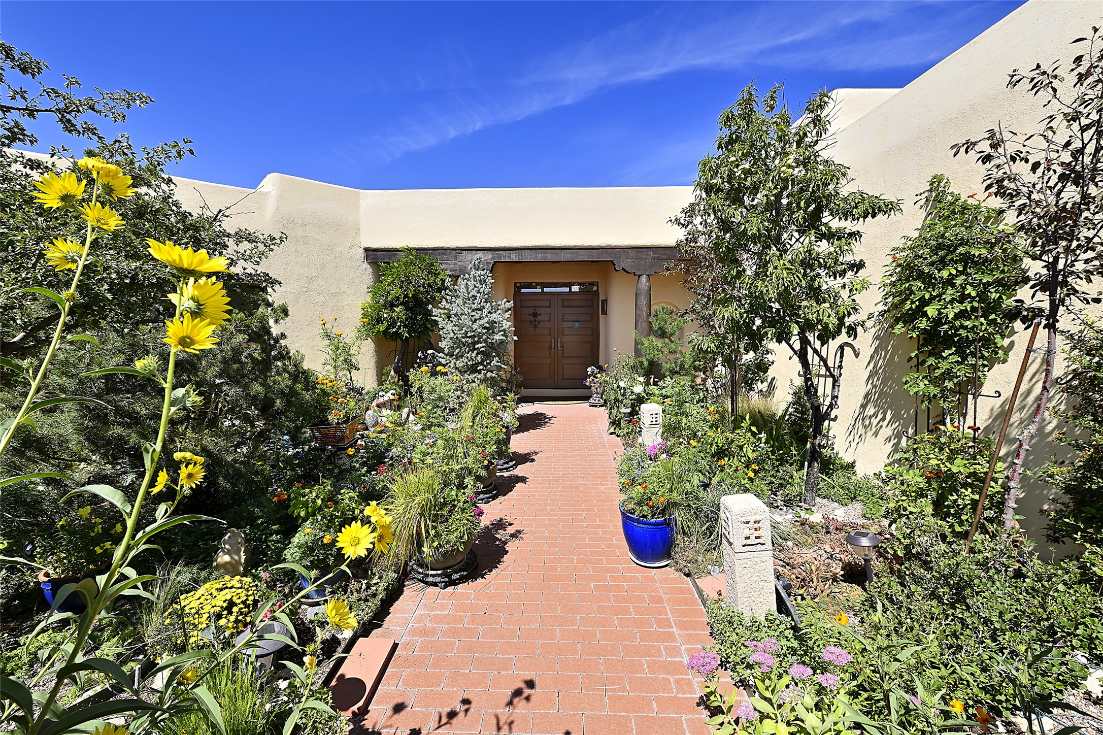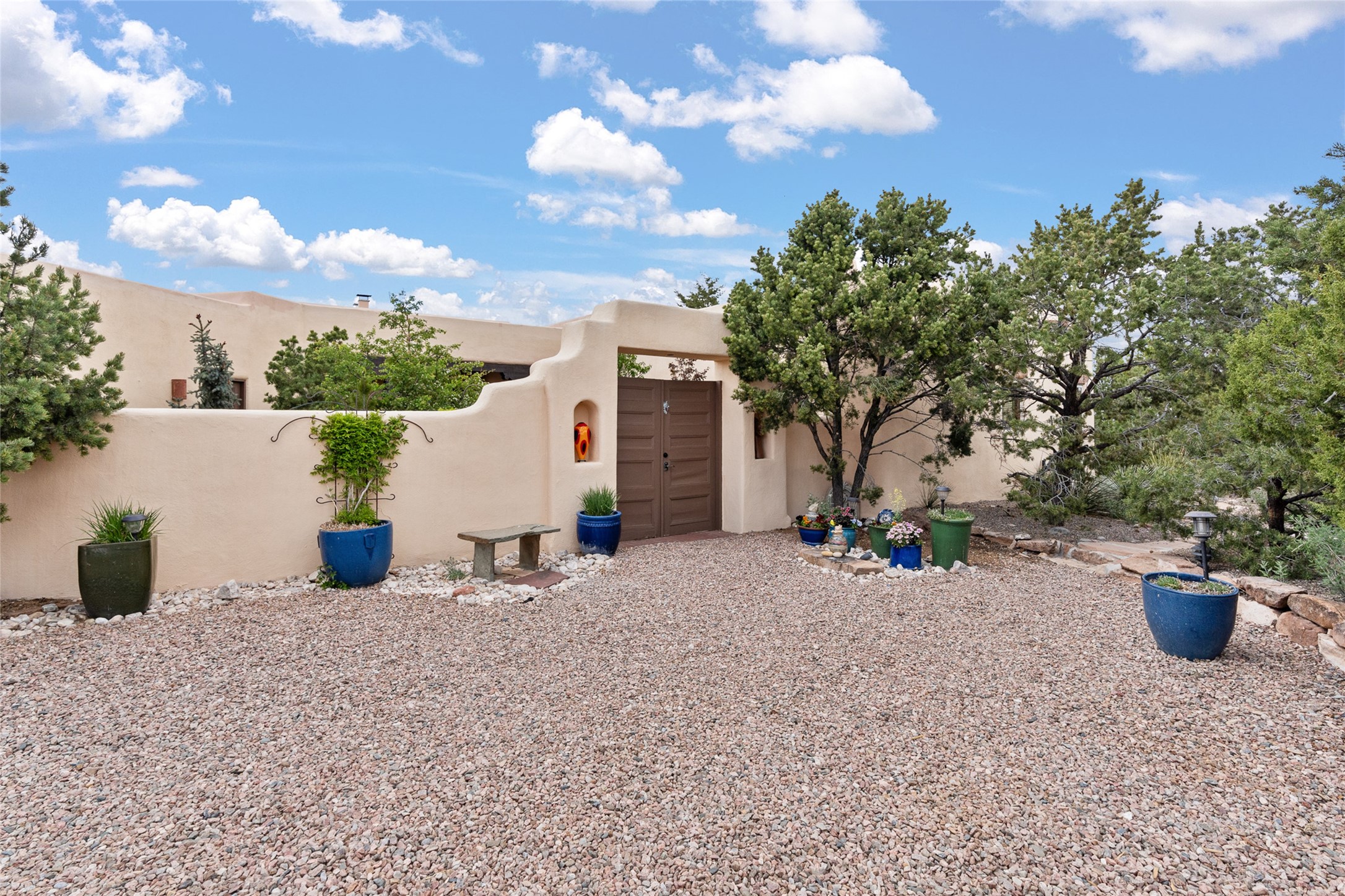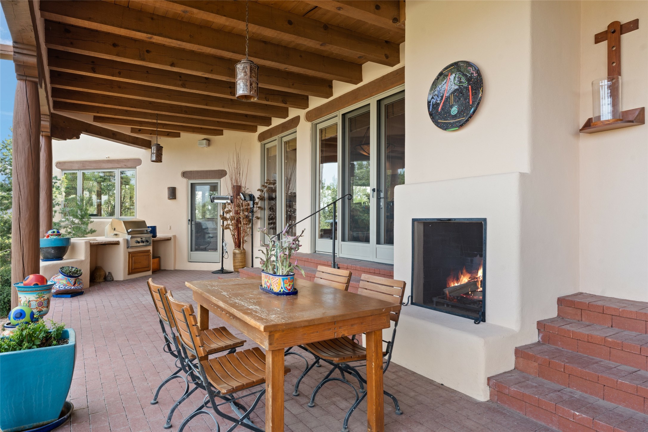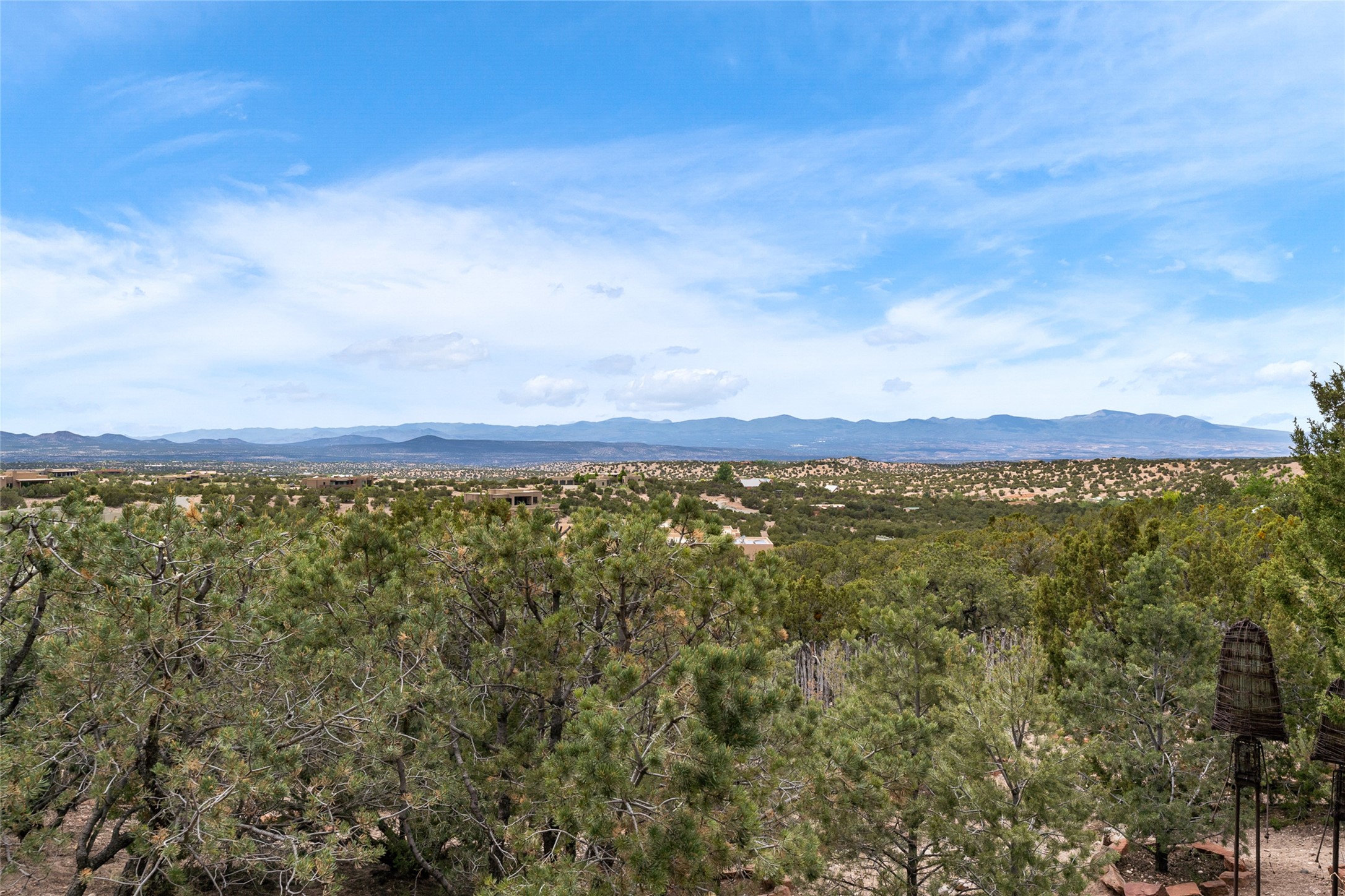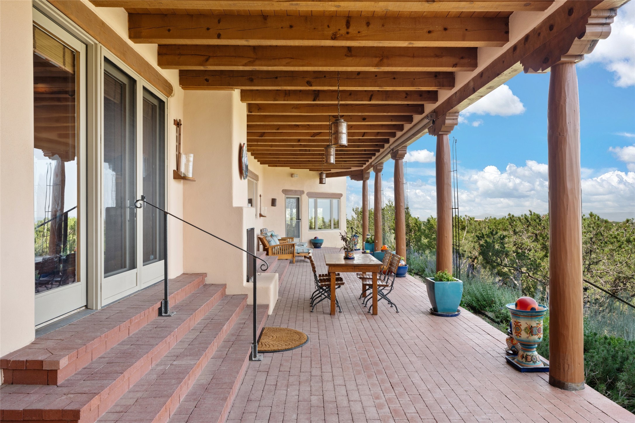 Ready to sell! Experience spectacular mountain views in every direction from this traditional Pueblo-style residence, perched on a knoll atop approximately 2.5 acres. This home radiates warmth and charm throughout, featuring vigas, coved ceilings, plank and latilla ceilings. The newly plastered walls are adorned with charming nichos. Alder wood doors and cabinetry are found throughout the home. Tall French doors and windows in the living and dining rooms bathe the space in natural light while framing breathtaking views. Eighteen-foot ceilings create an expansive, open feel, and additional French doors lead to an extraordinary portal that offers panoramic views, ample seating, dining areas, a fireplace, and a grill--perfect for outdoor living. The surrounding landscape is meticulously maintained, with lovely gardens. The kitchen shares its own lush garden portal. The spacious primary bedroom, which includes a kiva fireplace, two generous closets, and a luxurious bath. The second bedroom boasts exceptional views and an ensuite bath. A large art studio with stunning vistas, which can also serve as a third bedroom, has direct access to the portal. The home is rich with history, featuring nineteenth-century double entry doors shipped from St. Louis and a slate and iron fireplace in the living room, adding an artful touch from the past. A charming walled front courtyard, filled with vibrant flowers, creates a delightful entrance. Beyond the beautiful architecture, the private location offers peaceful, noiseless nights under a sky full of stars--all just a short drive from the city. This remarkable property is now ready for its next chapter!