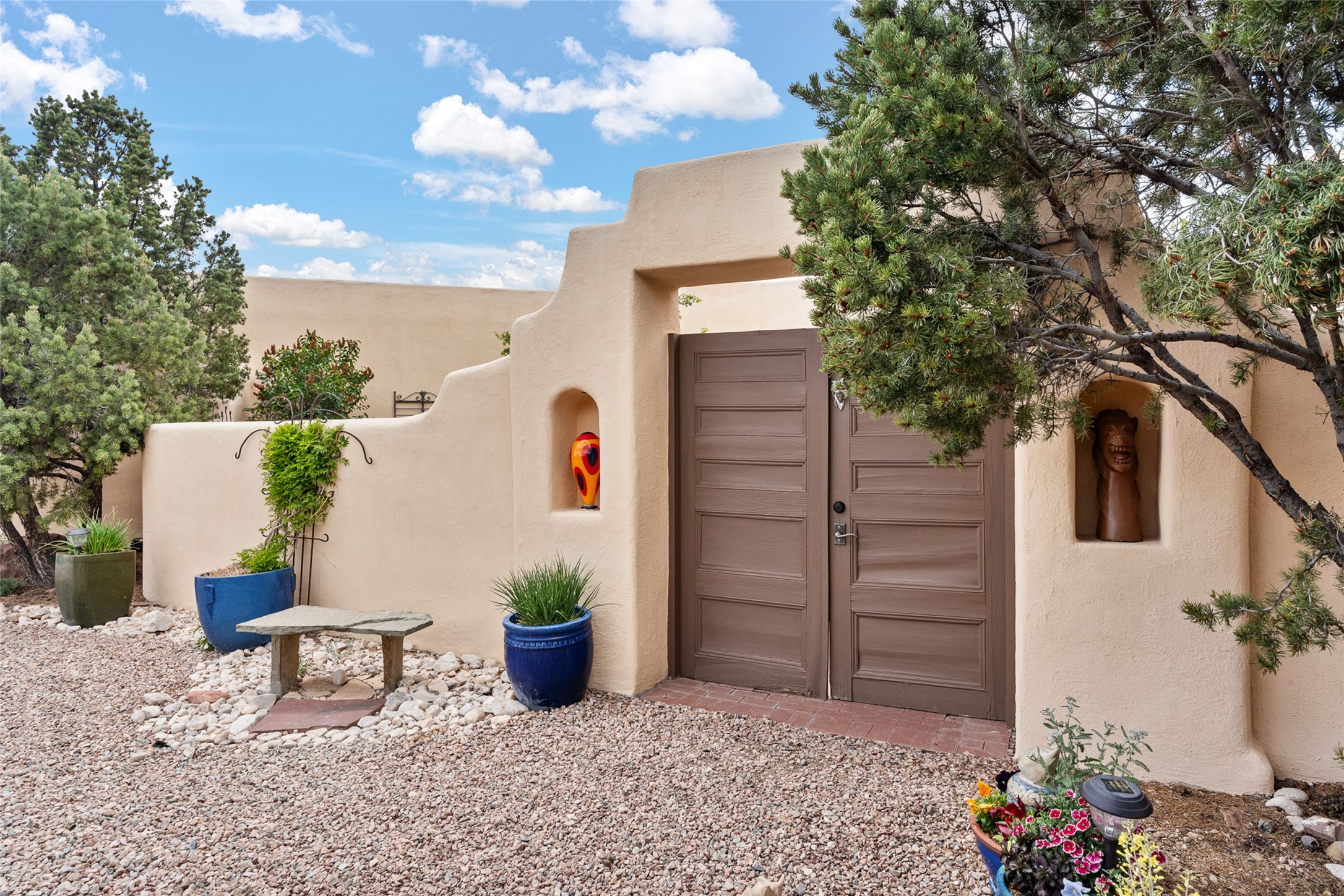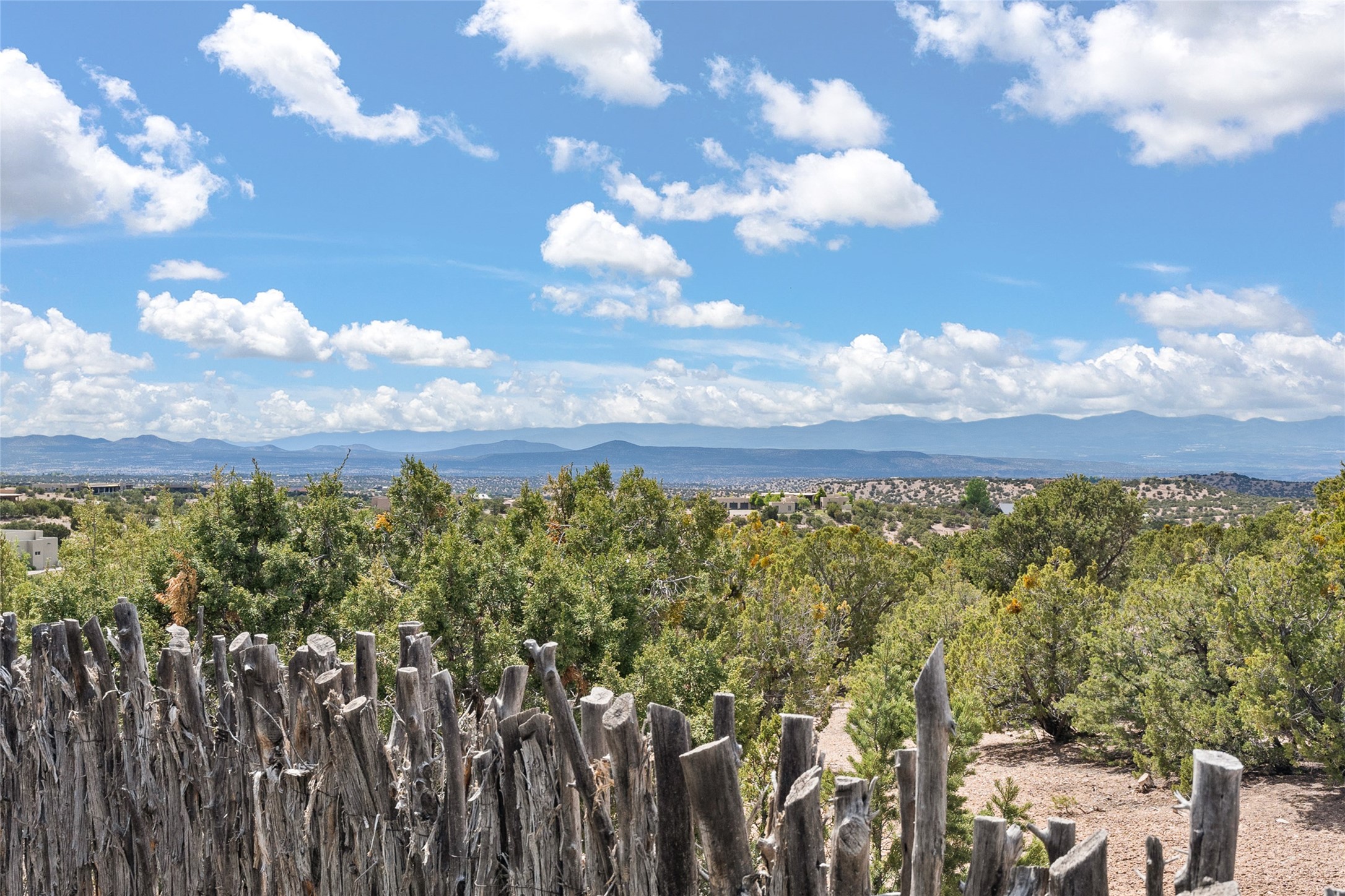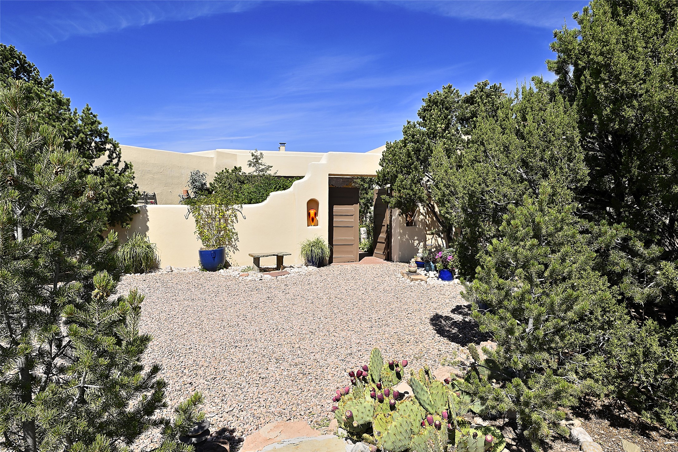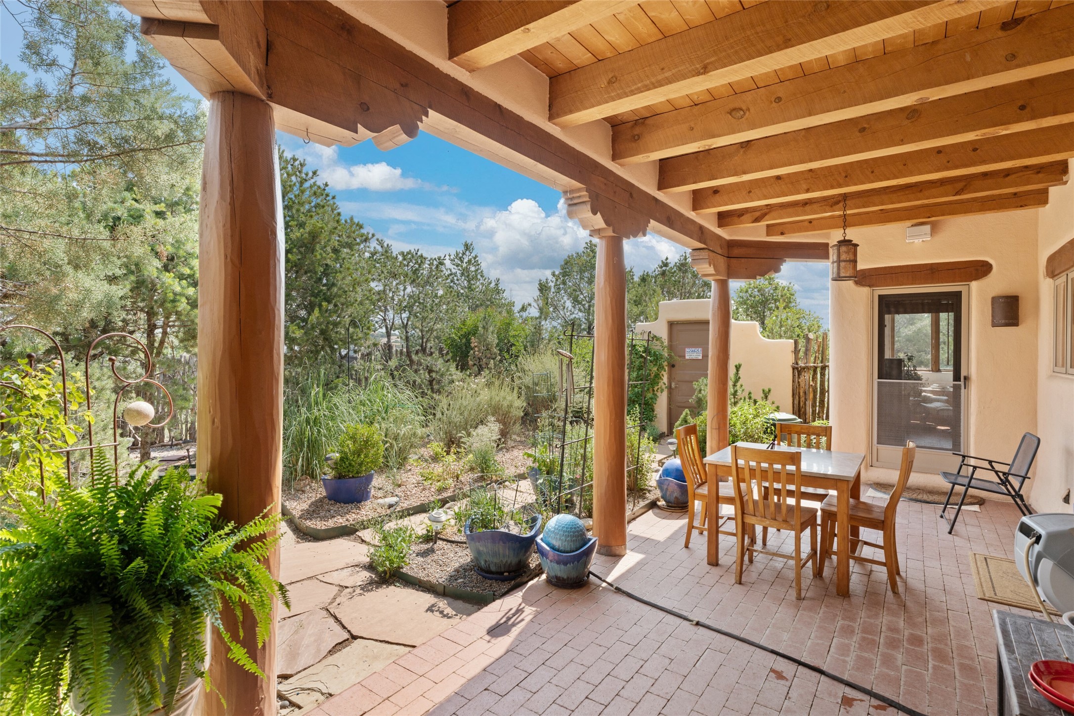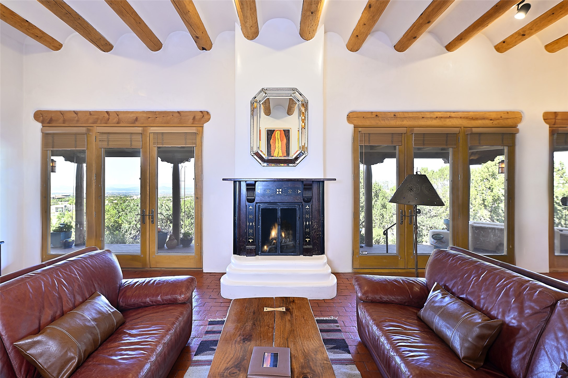Ready to sell! Experience spectacular mountain views in every direction from this traditional Pueblo-style residence, perched on a knoll atop approximately 2.5 acres. This home radiates warmth and charm throughout, featuring vigas, coved ceilings, plank and latilla ceilings. The newly plastered walls are adorned with charming nichos. Alder wood doors and cabinetry are found throughout the home. Tall French doors and windows in the living and dining rooms bathe the space in natural light while framing breathtaking views. Eighteen-foot ceilings create an expansive, open feel, and additional French doors lead to an extraordinary portal that offers panoramic views, ample seating, dining areas, a fireplace, and a grill--perfect for outdoor living. The surrounding landscape is meticulously maintained, with lovely gardens. The kitchen shares its own lush garden portal. The spacious primary bedroom, which includes a kiva fireplace, two generous closets, and a luxurious bath. The second bedroom boasts exceptional views and an ensuite bath. A large art studio with stunning vistas, which can also serve as a third bedroom, has direct access to the portal. The home is rich with history, featuring nineteenth-century double entry doors shipped from St. Louis and a slate and iron fireplace in the living room, adding an artful touch from the past. A charming walled front courtyard, filled with vibrant flowers, creates a delightful entrance. Beyond the beautiful architecture, the private location offers peaceful, noiseless nights under a sky full of stars--all just a short drive from the city. This remarkable property is now ready for its next chapter!