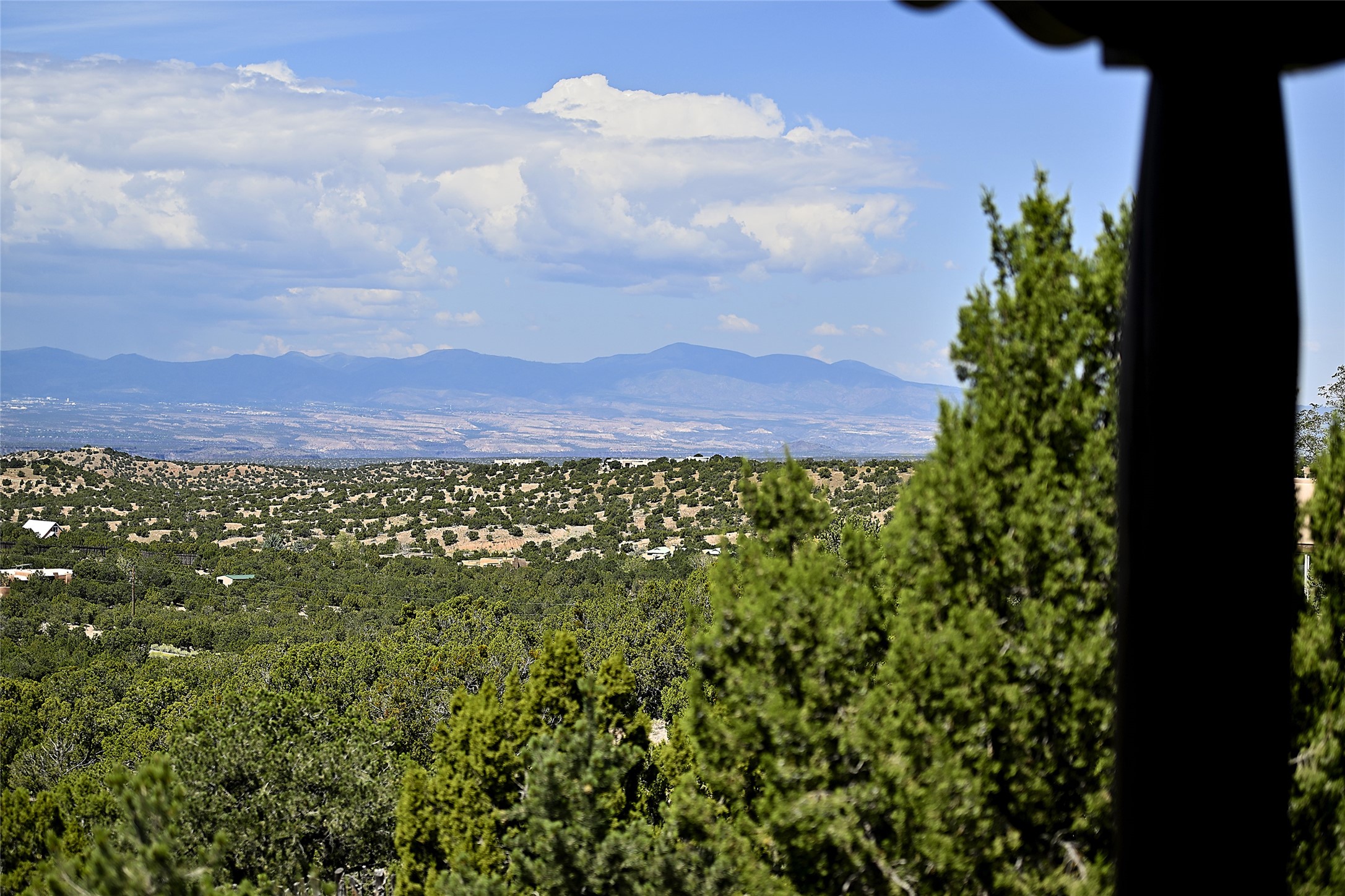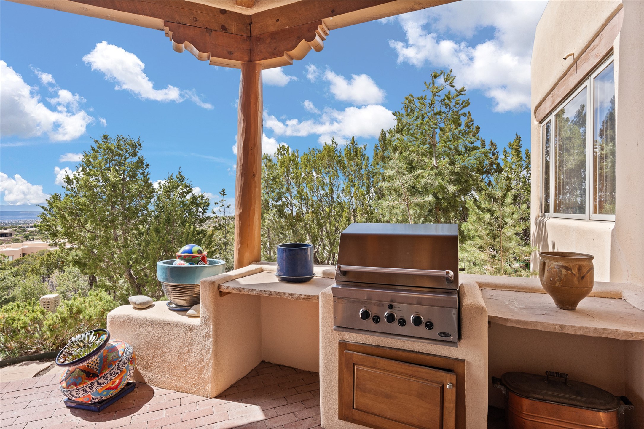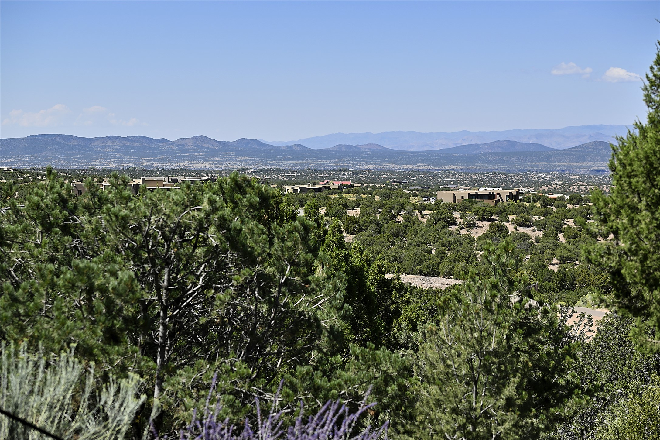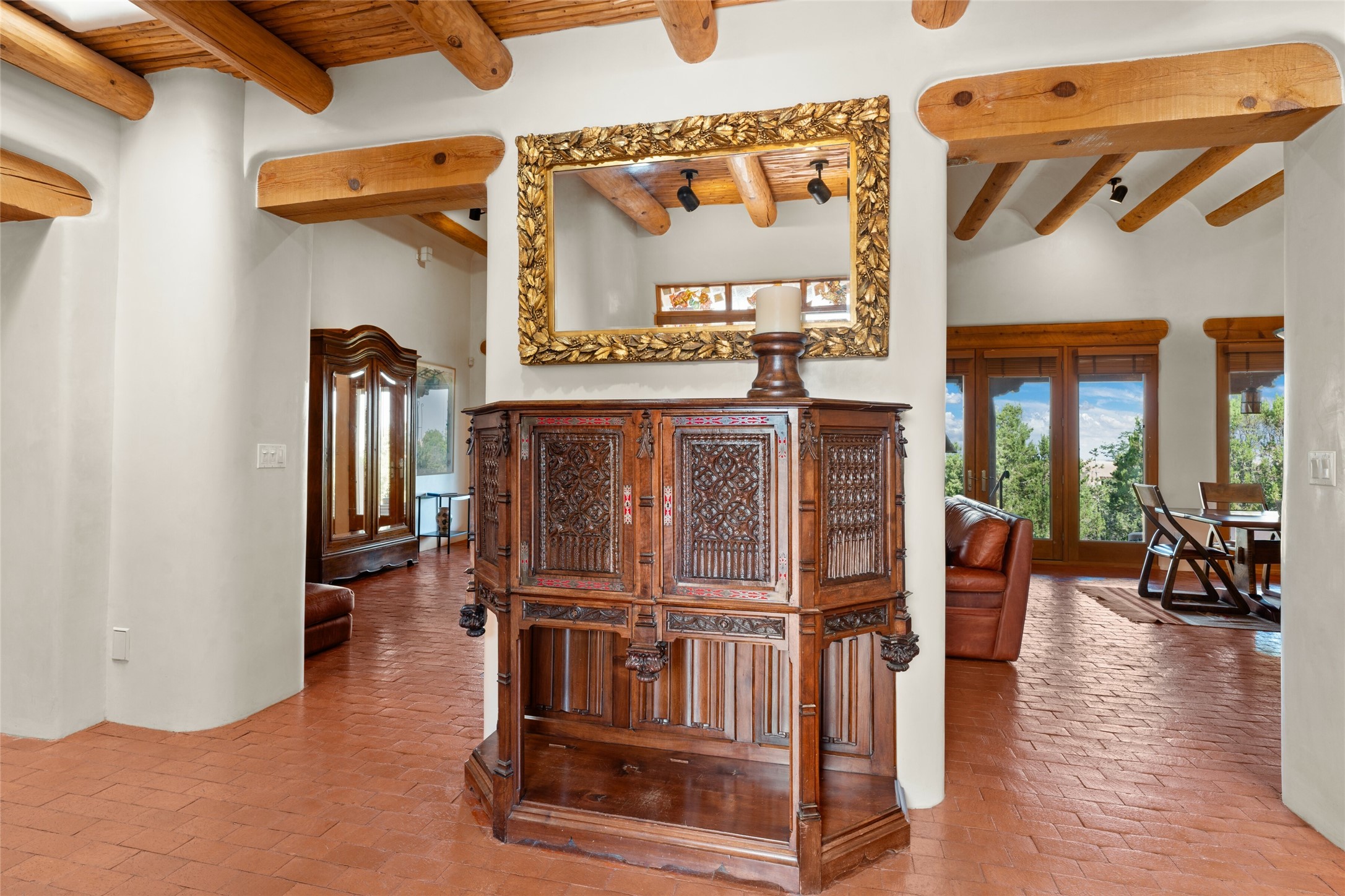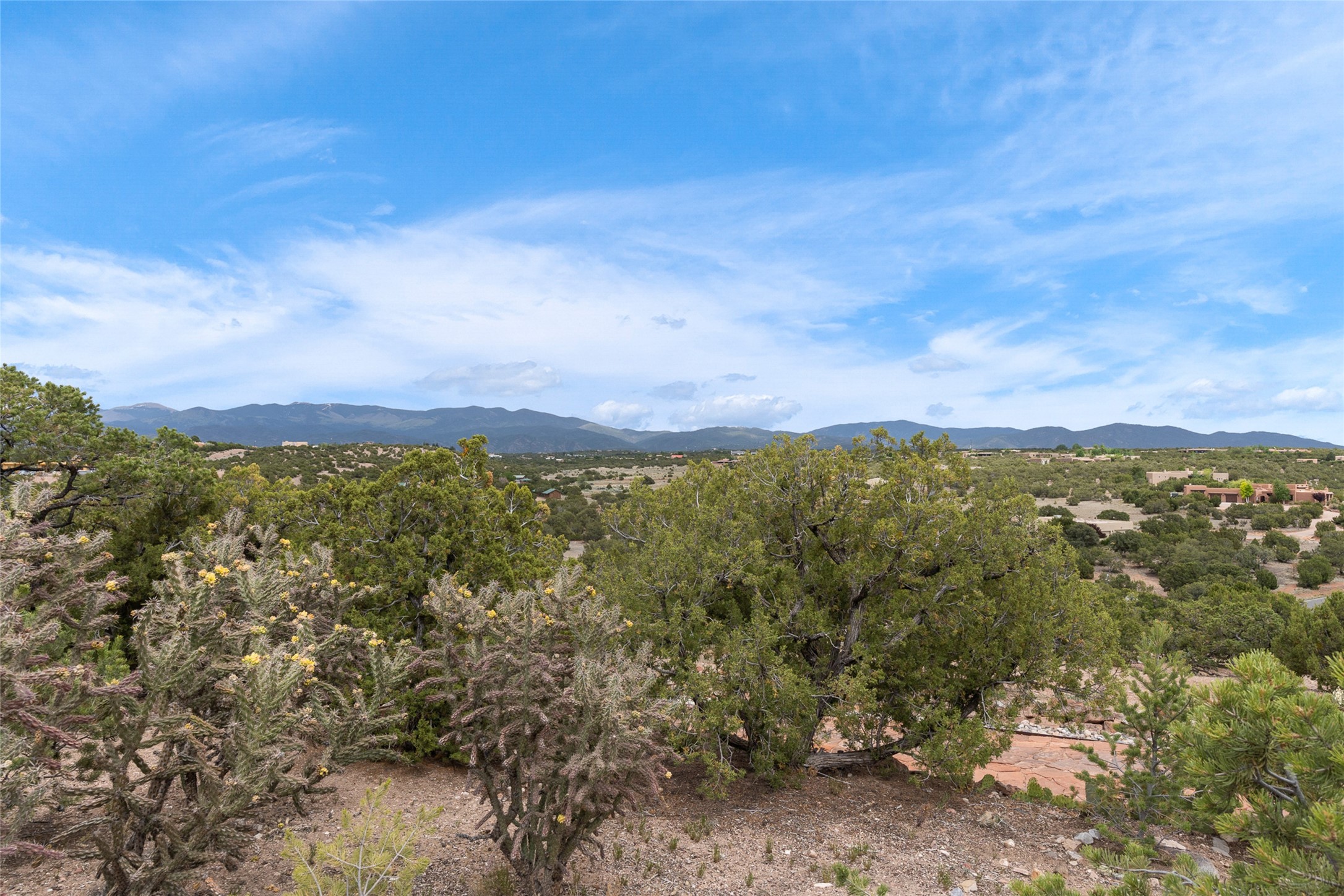 Ready to sell! Experience spectacular mountain views in every direction from this traditional Pueblo-style residence, perched on a knoll atop approximately 2.5 acres. This home radiates warmth and charm throughout, featuring vigas, coved ceilings, plank and latilla ceilings. The newly plastered walls are adorned with charming nichos. Alder wood doors and cabinetry are found throughout the home. Tall French doors and windows in the living and dining rooms bathe the space in natural light while framing breathtaking views. Eighteen-foot ceilings create an expansive, open feel, and additional French doors lead to an extraordinary portal that offers panoramic views, ample seating, dining areas, a fireplace, and a grill--perfect for outdoor living. The surrounding landscape is meticulously maintained, with lovely gardens. The kitchen shares its own lush garden portal. The spacious primary bedroom, which includes a kiva fireplace, two generous closets, and a luxurious bath. The second bedroom boasts exceptional views and an ensuite bath. A large art studio with stunning vistas, which can also serve as a third bedroom, has direct access to the portal. The home is rich with history, featuring nineteenth-century double entry doors shipped from St. Louis and a slate and iron fireplace in the living room, adding an artful touch from the past. A charming walled front courtyard, filled with vibrant flowers, creates a delightful entrance. Beyond the beautiful architecture, the private location offers peaceful, noiseless nights under a sky full of stars--all just a short drive from the city. This remarkable property is now ready for its next chapter!
