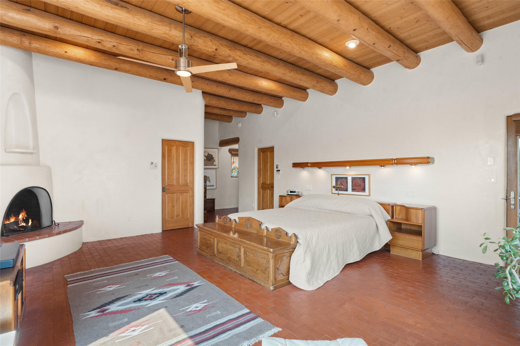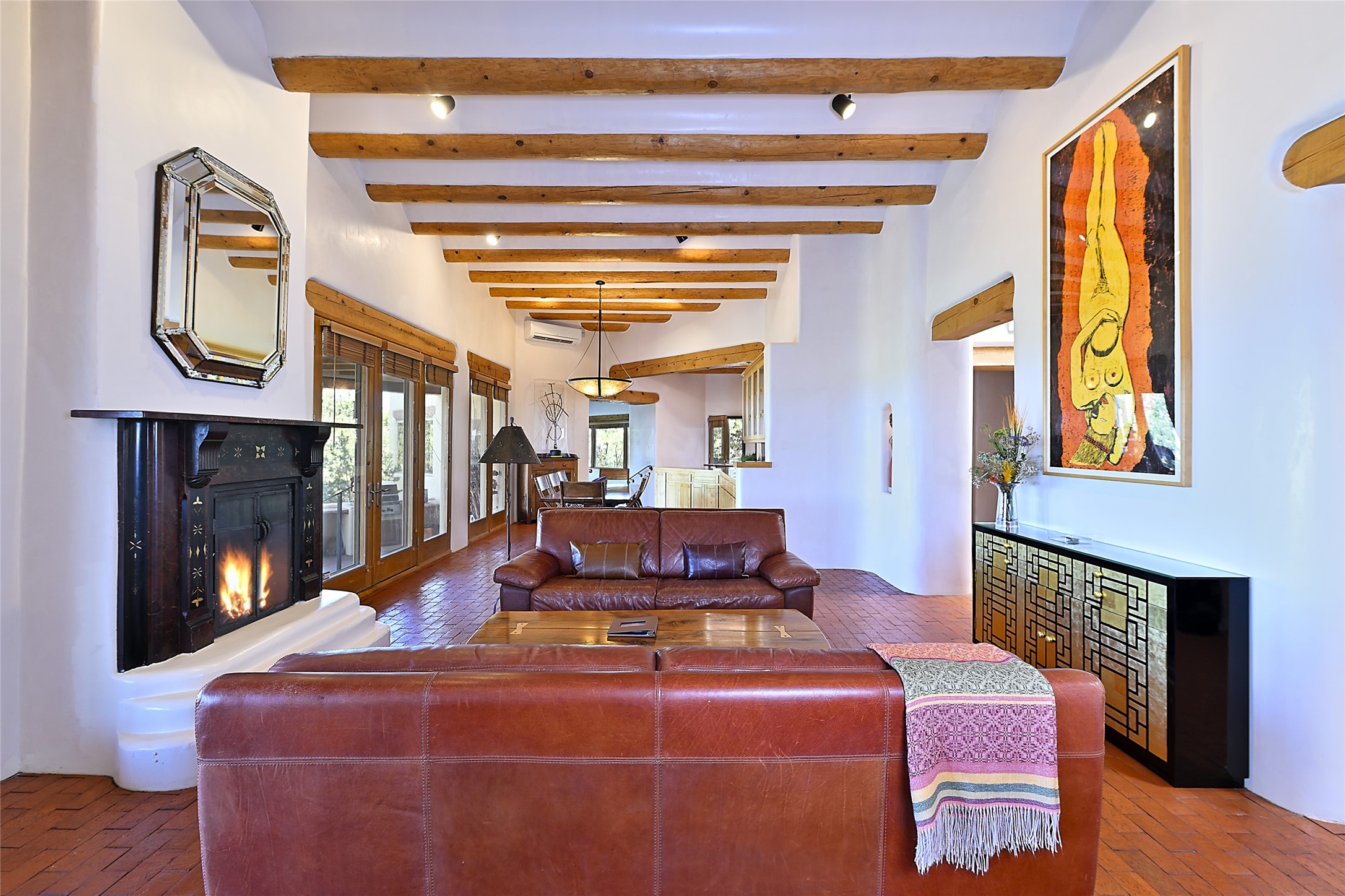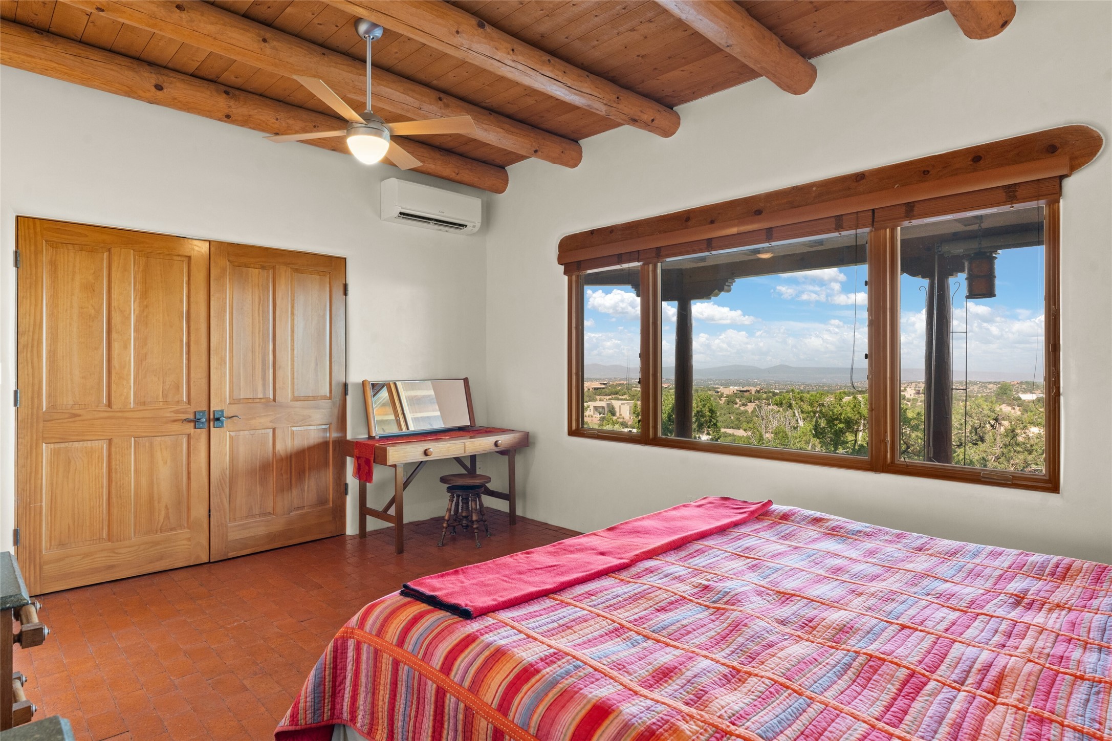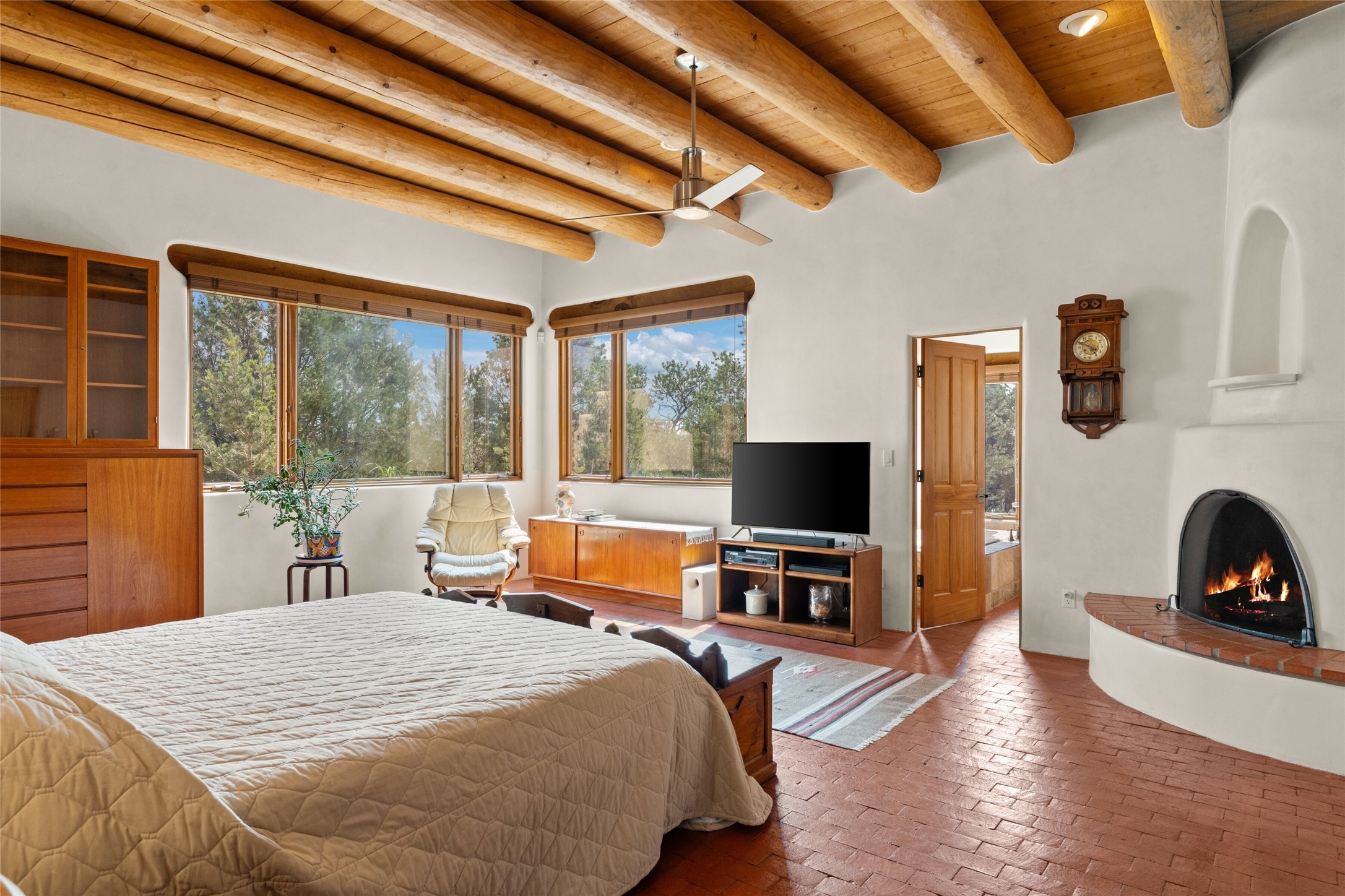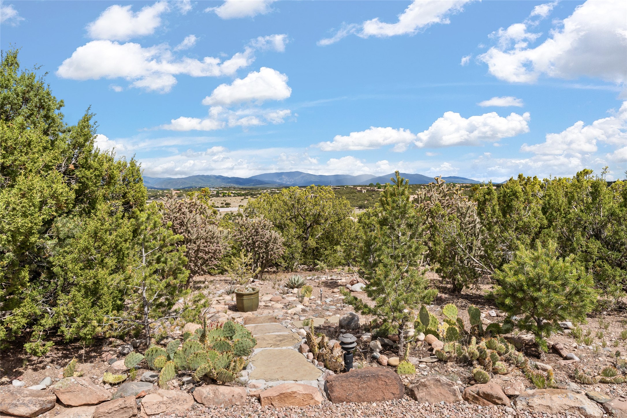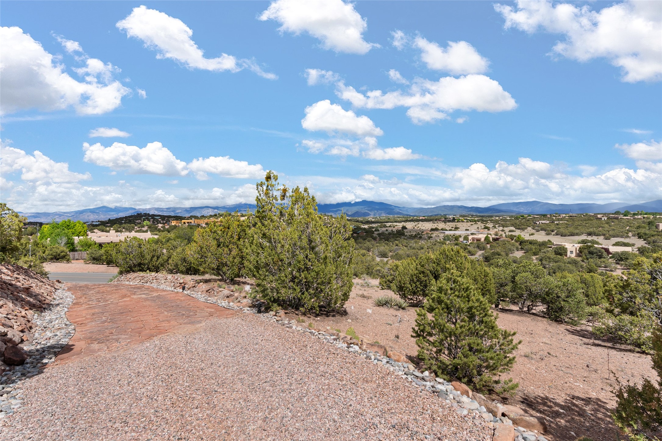Ready to sell! Experience spectacular mountain views in every direction from this traditional Pueblo-style residence, perched on a knoll atop approximately 2.5 acres. This home radiates warmth and charm throughout, featuring vigas, coved ceilings, plank and latilla ceilings. The newly plastered walls are adorned with charming nichos. Alder wood doors and cabinetry are found throughout the home. Tall French doors and windows in the living and dining rooms bathe the space in natural light while framing breathtaking views. Eighteen-foot ceilings create an expansive, open feel, and additional French doors lead to an extraordinary portal that offers panoramic views, ample seating, dining areas, a fireplace, and a grill--perfect for outdoor living. The surrounding landscape is meticulously maintained, with lovely gardens. The kitchen shares its own lush garden portal. The spacious primary bedroom, which includes a kiva fireplace, two generous closets, and a luxurious bath. The second bedroom boasts exceptional views and an ensuite bath. A large art studio with stunning vistas, which can also serve as a third bedroom, has direct access to the portal. The home is rich with history, featuring nineteenth-century double entry doors shipped from St. Louis and a slate and iron fireplace in the living room, adding an artful touch from the past. A charming walled front courtyard, filled with vibrant flowers, creates a delightful entrance. Beyond the beautiful architecture, the private location offers peaceful, noiseless nights under a sky full of stars--all just a short drive from the city. This remarkable property is now ready for its next chapter!