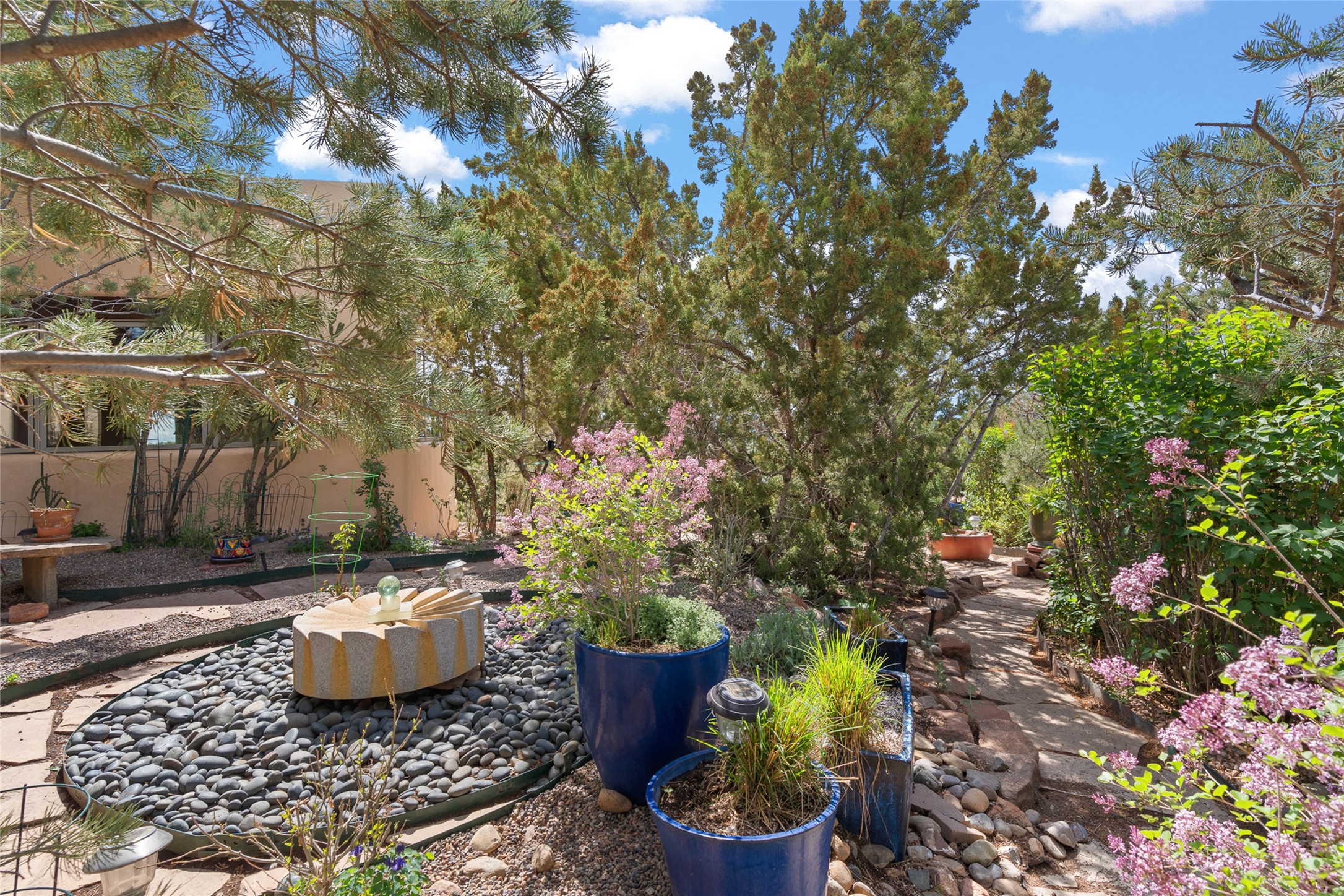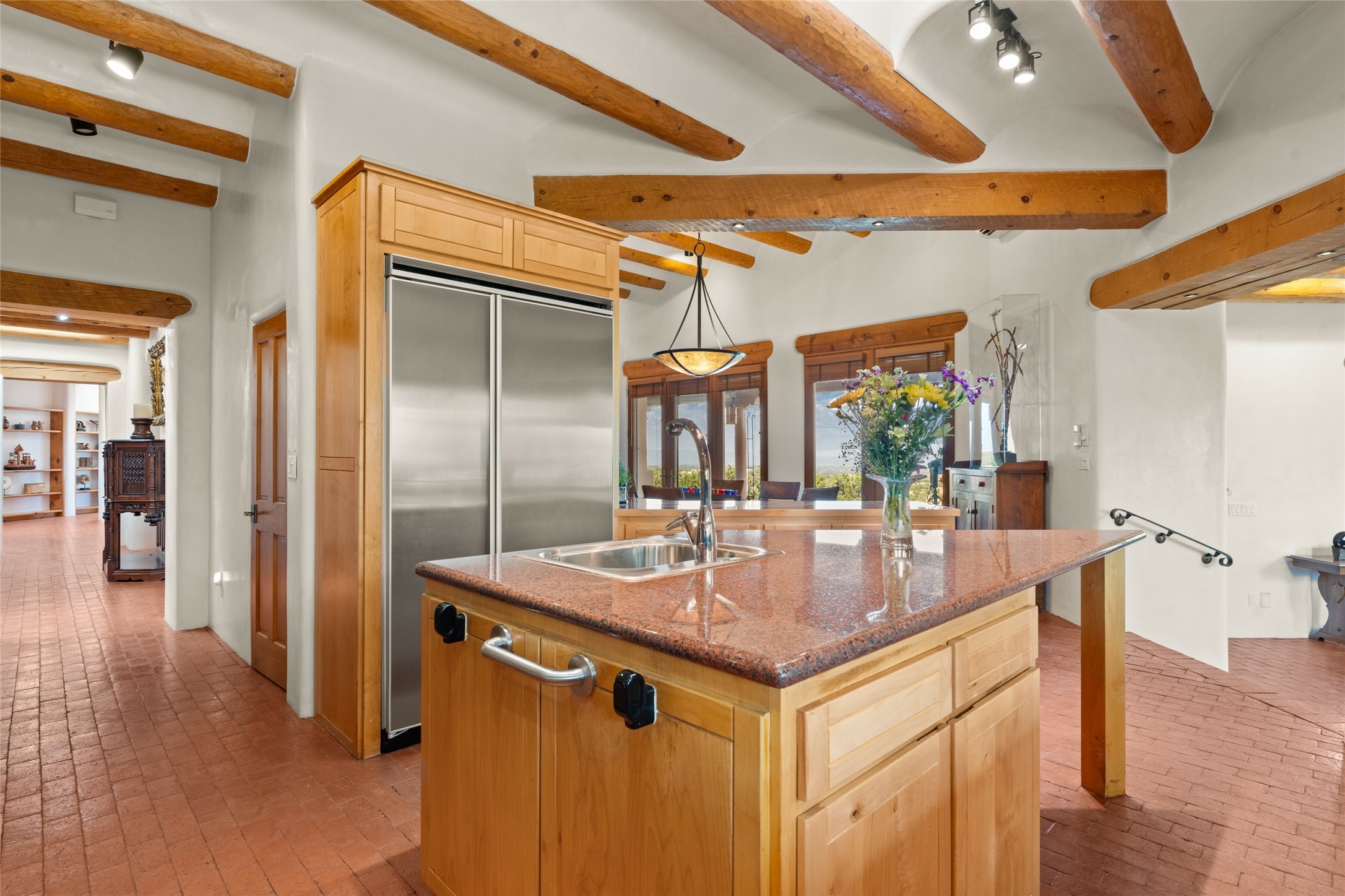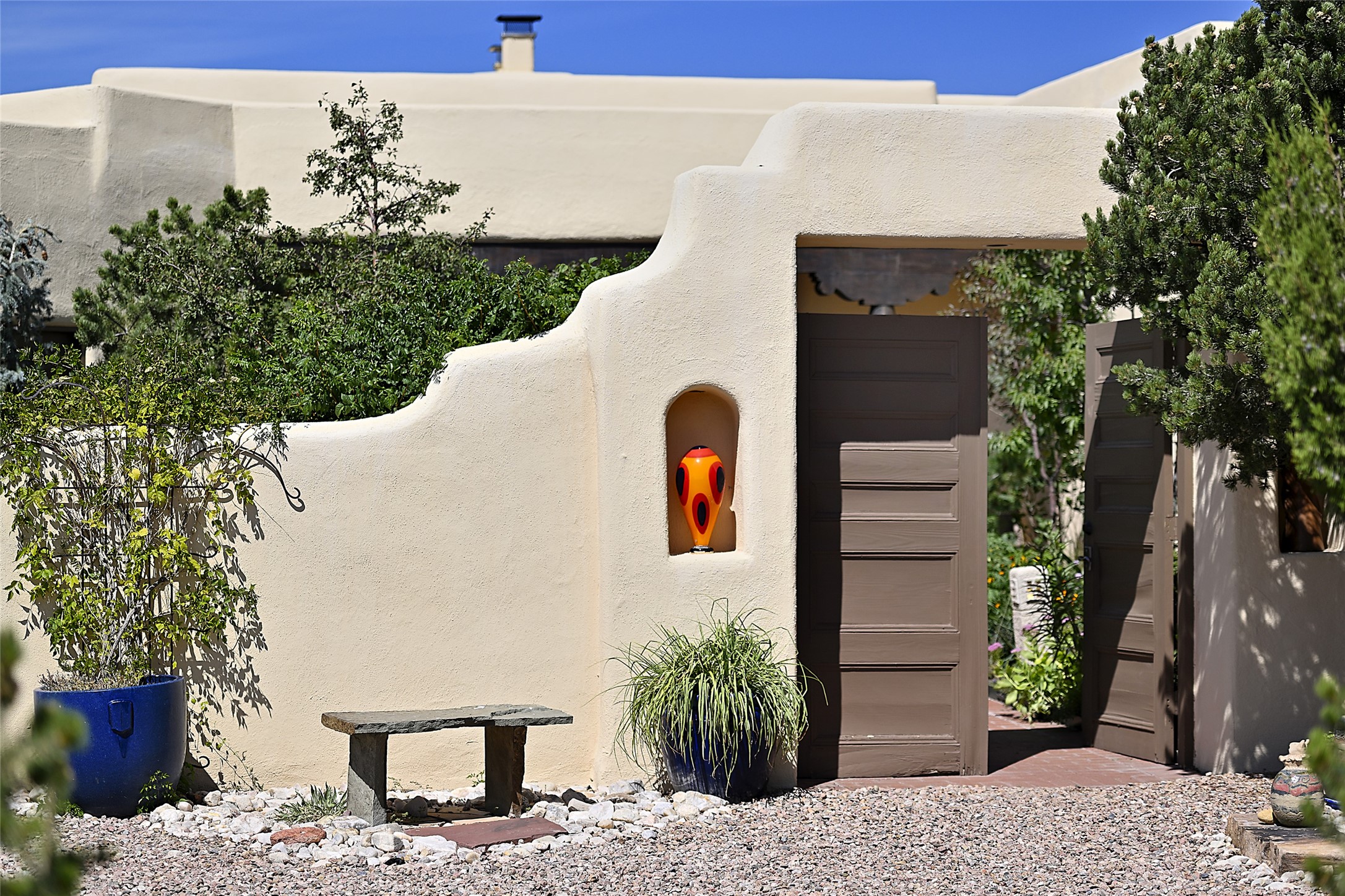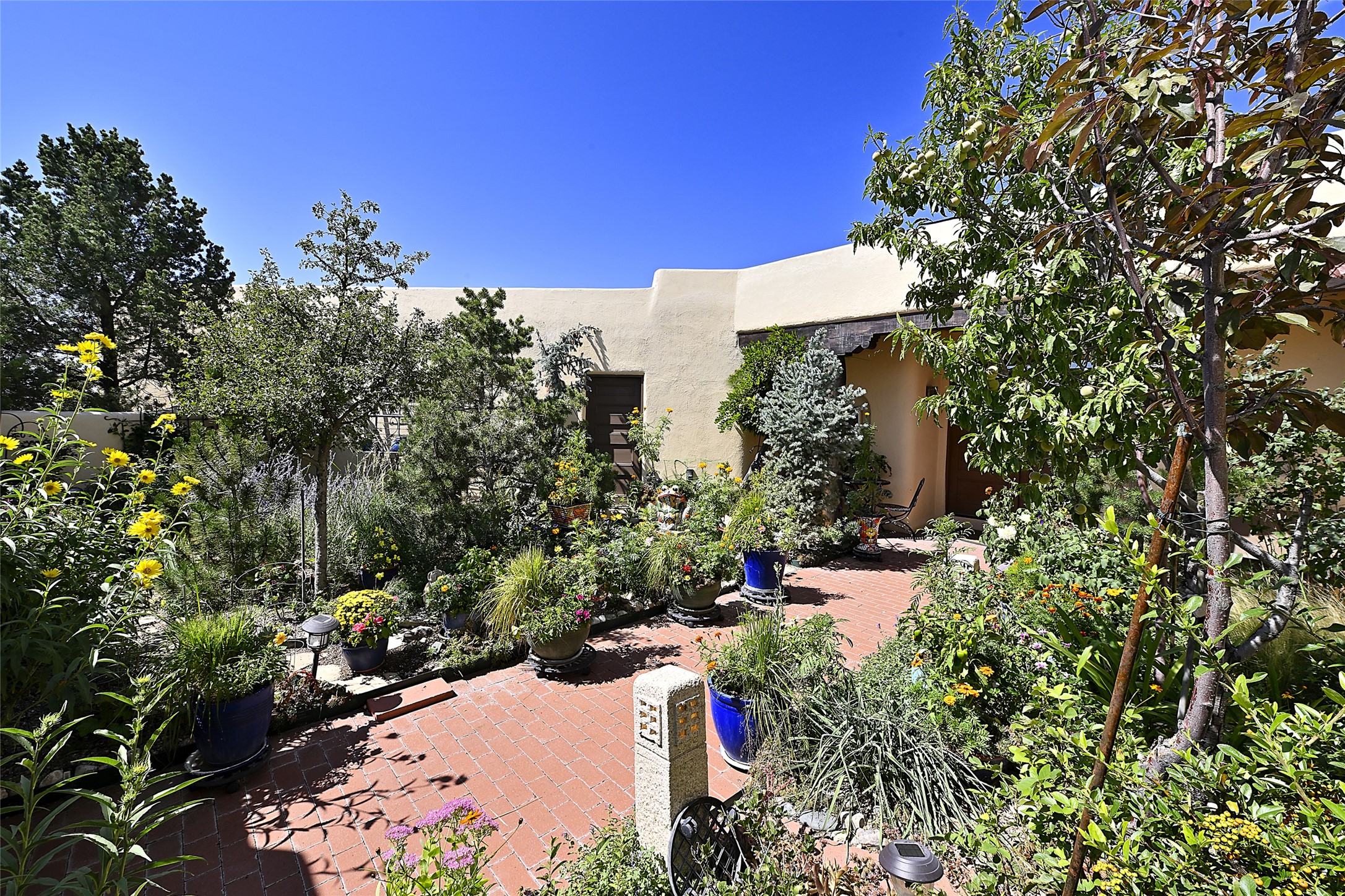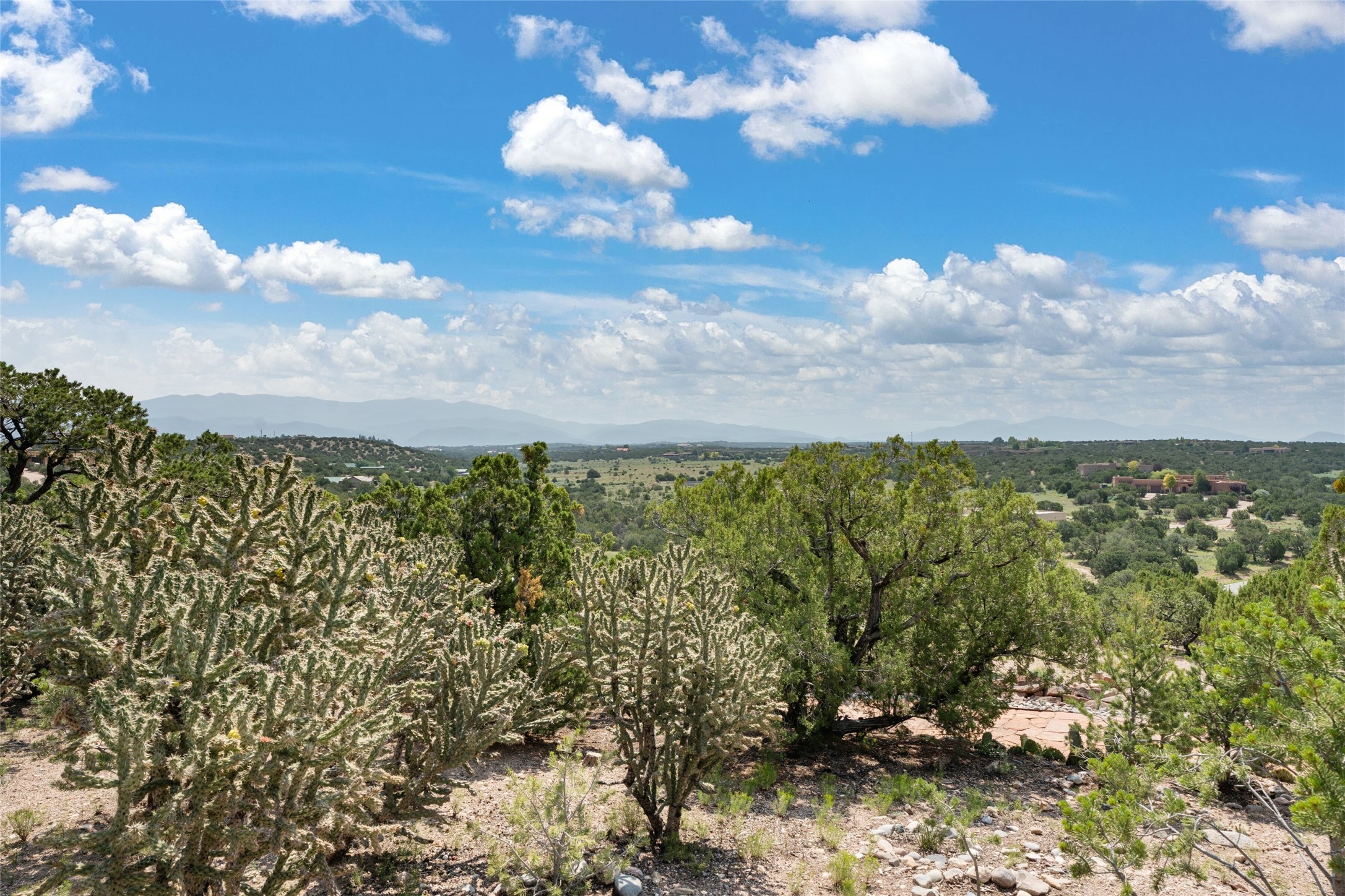 Ready to sell! Experience spectacular mountain views in every direction from this traditional Pueblo-style residence, perched on a knoll atop approximately 2.5 acres. This home radiates warmth and charm throughout, featuring vigas, coved ceilings, plank and latilla ceilings. The newly plastered walls are adorned with charming nichos. Alder wood doors and cabinetry are found throughout the home. Tall French doors and windows in the living and dining rooms bathe the space in natural light while framing breathtaking views. Eighteen-foot ceilings create an expansive, open feel, and additional French doors lead to an extraordinary portal that offers panoramic views, ample seating, dining areas, a fireplace, and a grill--perfect for outdoor living. The surrounding landscape is meticulously maintained, with lovely gardens. The kitchen shares its own lush garden portal. The spacious primary bedroom, which includes a kiva fireplace, two generous closets, and a luxurious bath. The second bedroom boasts exceptional views and an ensuite bath. A large art studio with stunning vistas, which can also serve as a third bedroom, has direct access to the portal. The home is rich with history, featuring nineteenth-century double entry doors shipped from St. Louis and a slate and iron fireplace in the living room, adding an artful touch from the past. A charming walled front courtyard, filled with vibrant flowers, creates a delightful entrance. Beyond the beautiful architecture, the private location offers peaceful, noiseless nights under a sky full of stars--all just a short drive from the city. This remarkable property is now ready for its next chapter!