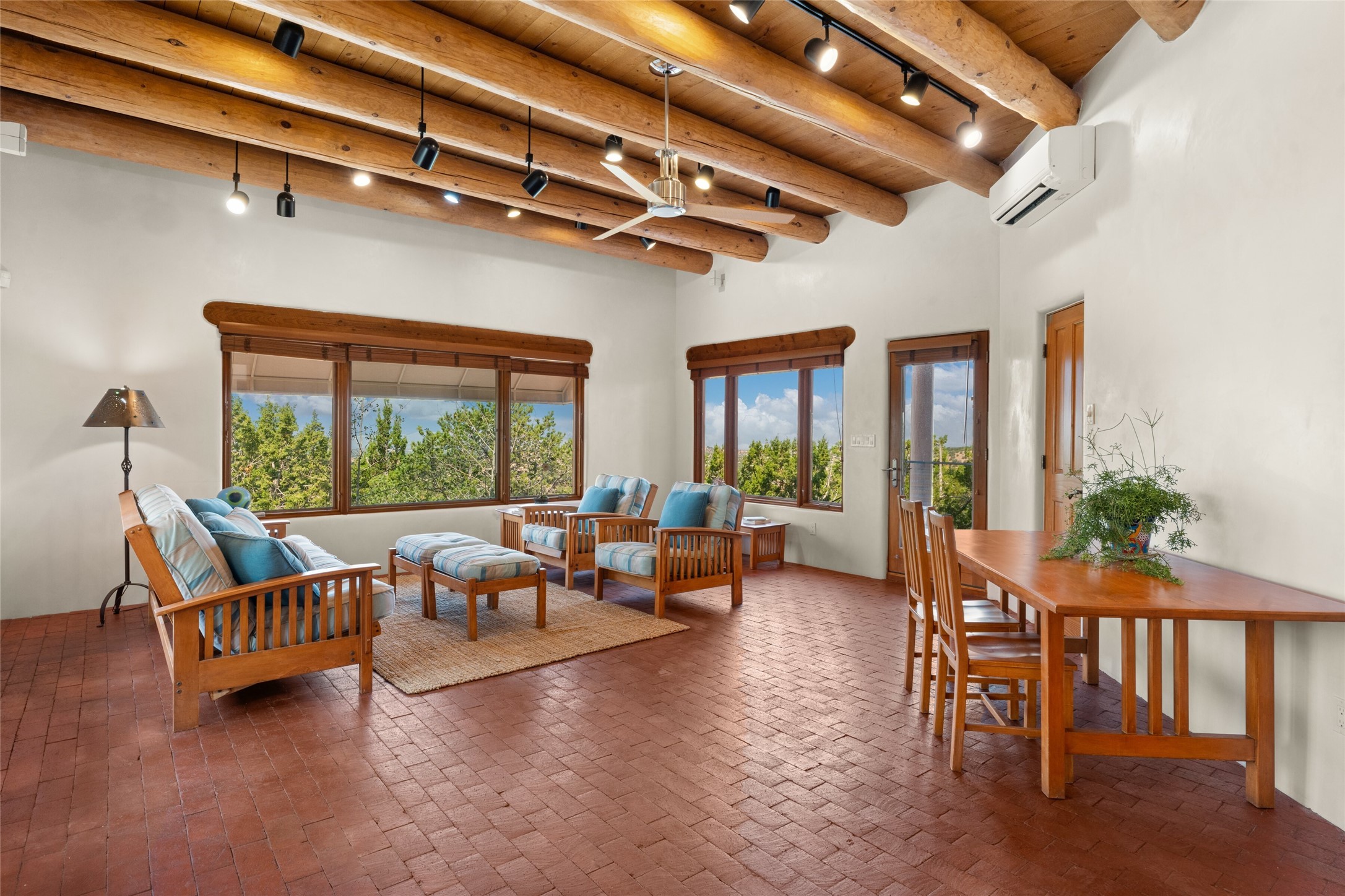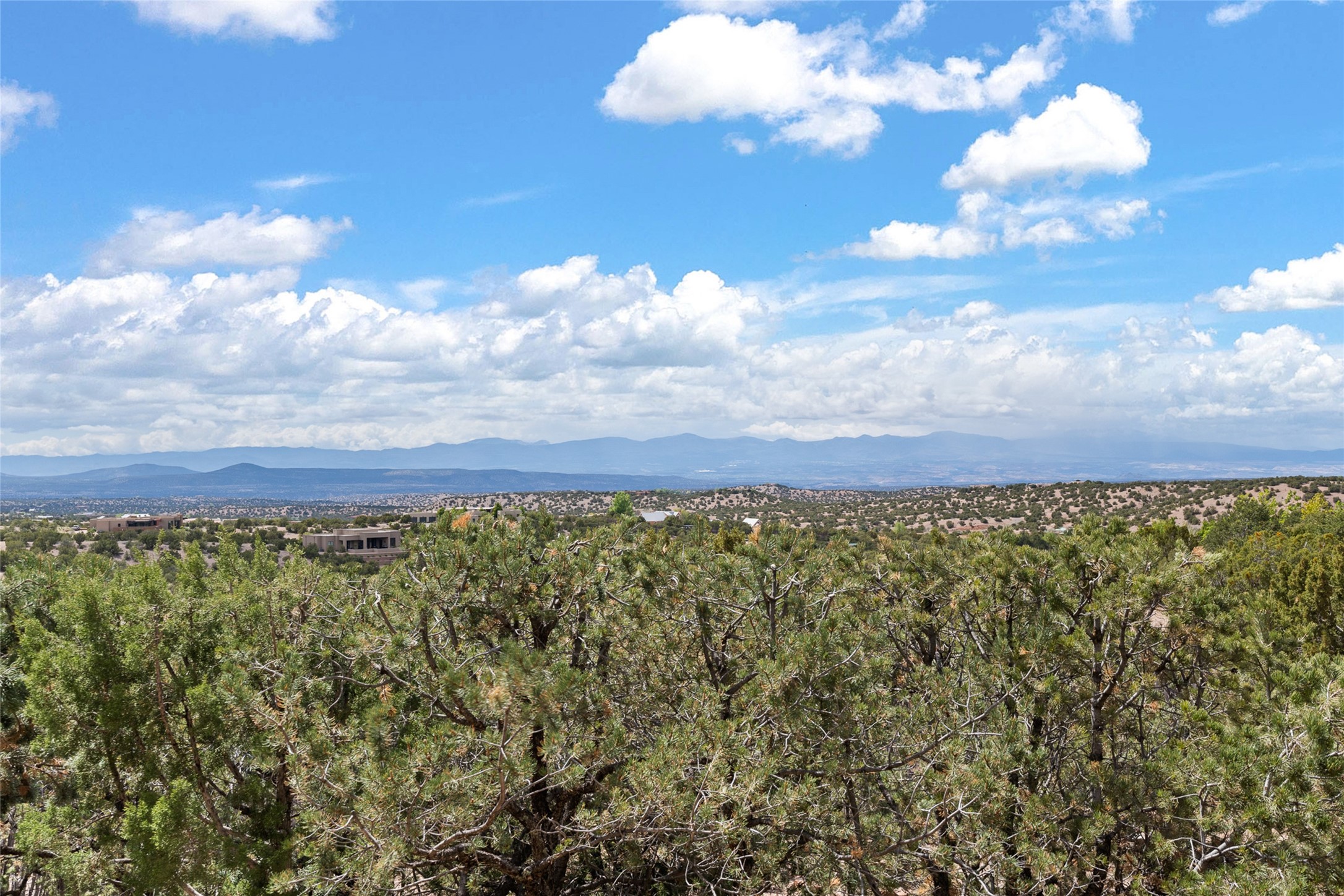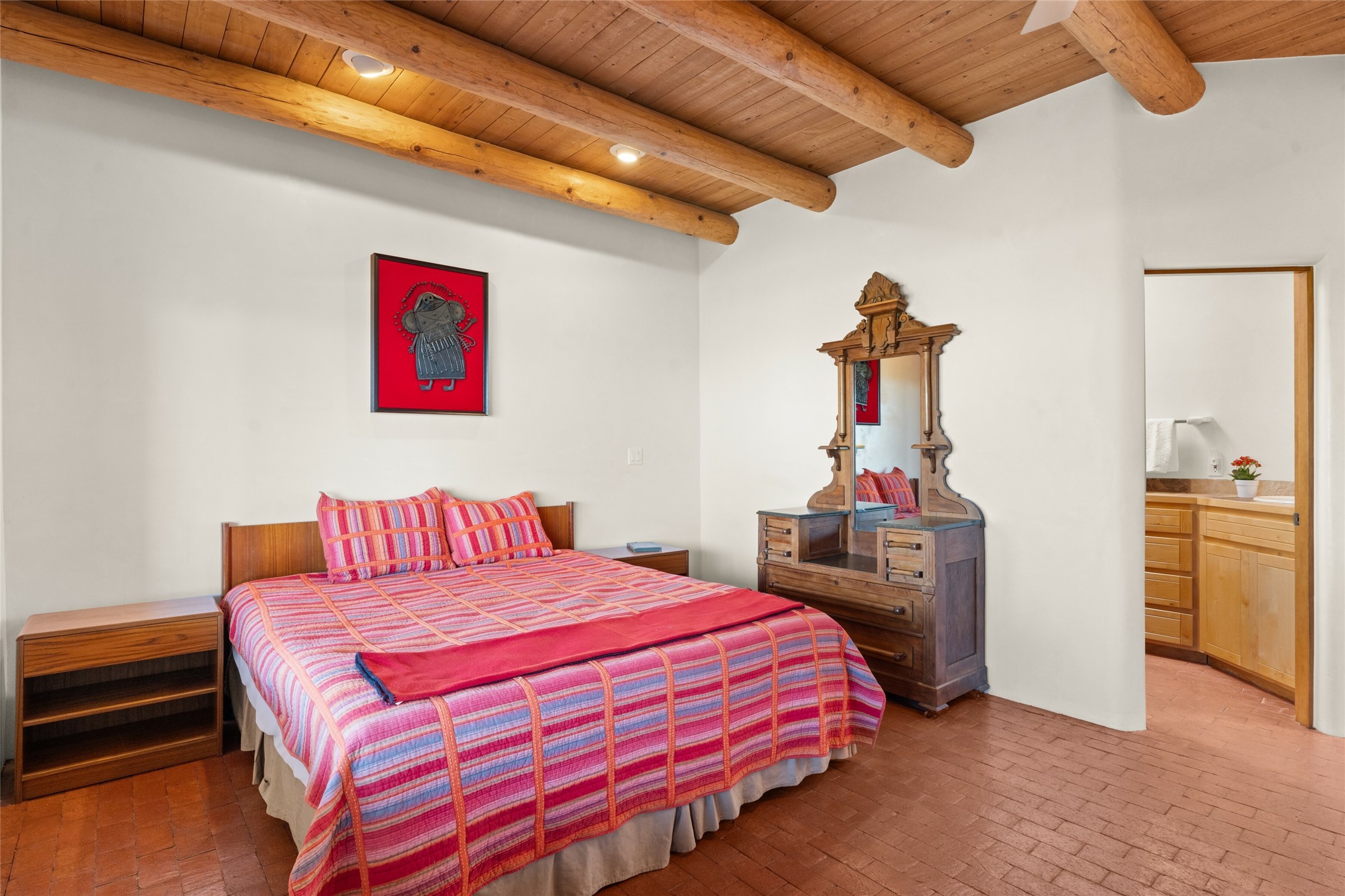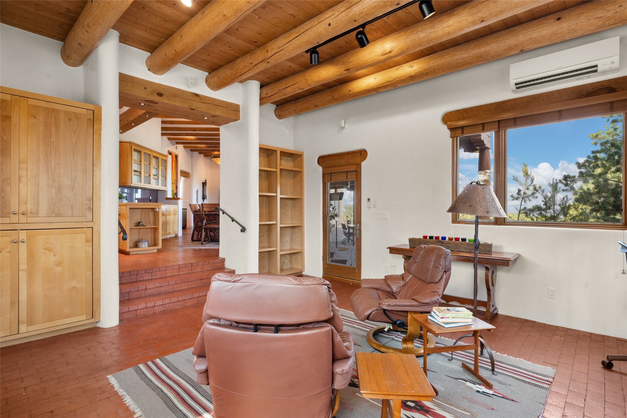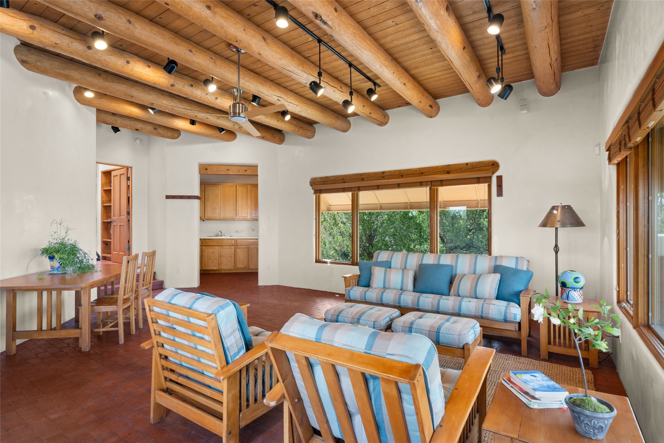 Ready to sell! Experience spectacular mountain views in every direction from this traditional Pueblo-style residence, perched on a knoll atop approximately 2.5 acres. This home radiates warmth and charm throughout, featuring vigas, coved ceilings, plank and latilla ceilings. The newly plastered walls are adorned with charming nichos. Alder wood doors and cabinetry are found throughout the home. Tall French doors and windows in the living and dining rooms bathe the space in natural light while framing breathtaking views. Eighteen-foot ceilings create an expansive, open feel, and additional French doors lead to an extraordinary portal that offers panoramic views, ample seating, dining areas, a fireplace, and a grill--perfect for outdoor living. The surrounding landscape is meticulously maintained, with lovely gardens. The kitchen shares its own lush garden portal. The spacious primary bedroom, which includes a kiva fireplace, two generous closets, and a luxurious bath. The second bedroom boasts exceptional views and an ensuite bath. A large art studio with stunning vistas, which can also serve as a third bedroom, has direct access to the portal. The home is rich with history, featuring nineteenth-century double entry doors shipped from St. Louis and a slate and iron fireplace in the living room, adding an artful touch from the past. A charming walled front courtyard, filled with vibrant flowers, creates a delightful entrance. Beyond the beautiful architecture, the private location offers peaceful, noiseless nights under a sky full of stars--all just a short drive from the city. This remarkable property is now ready for its next chapter!