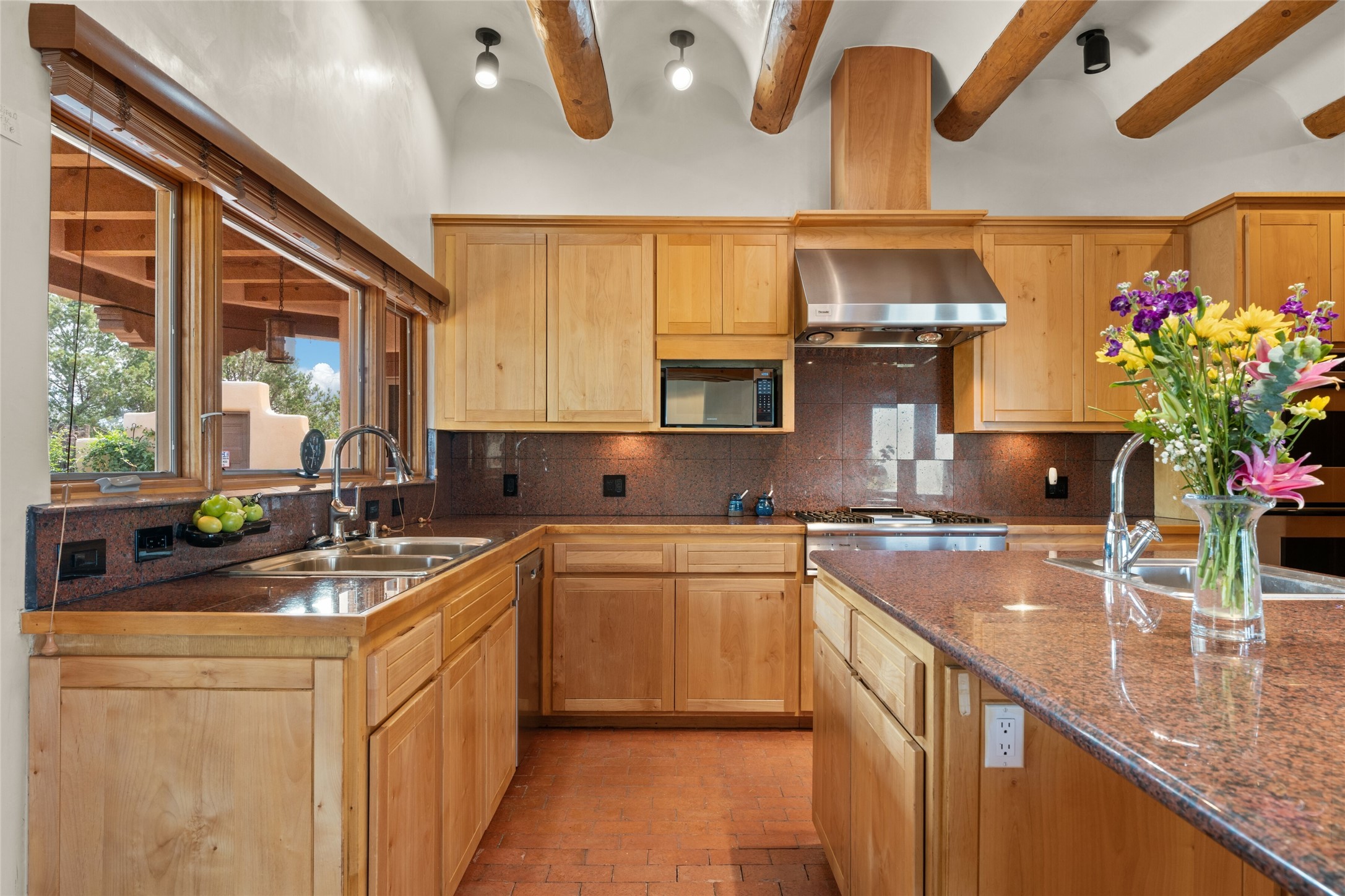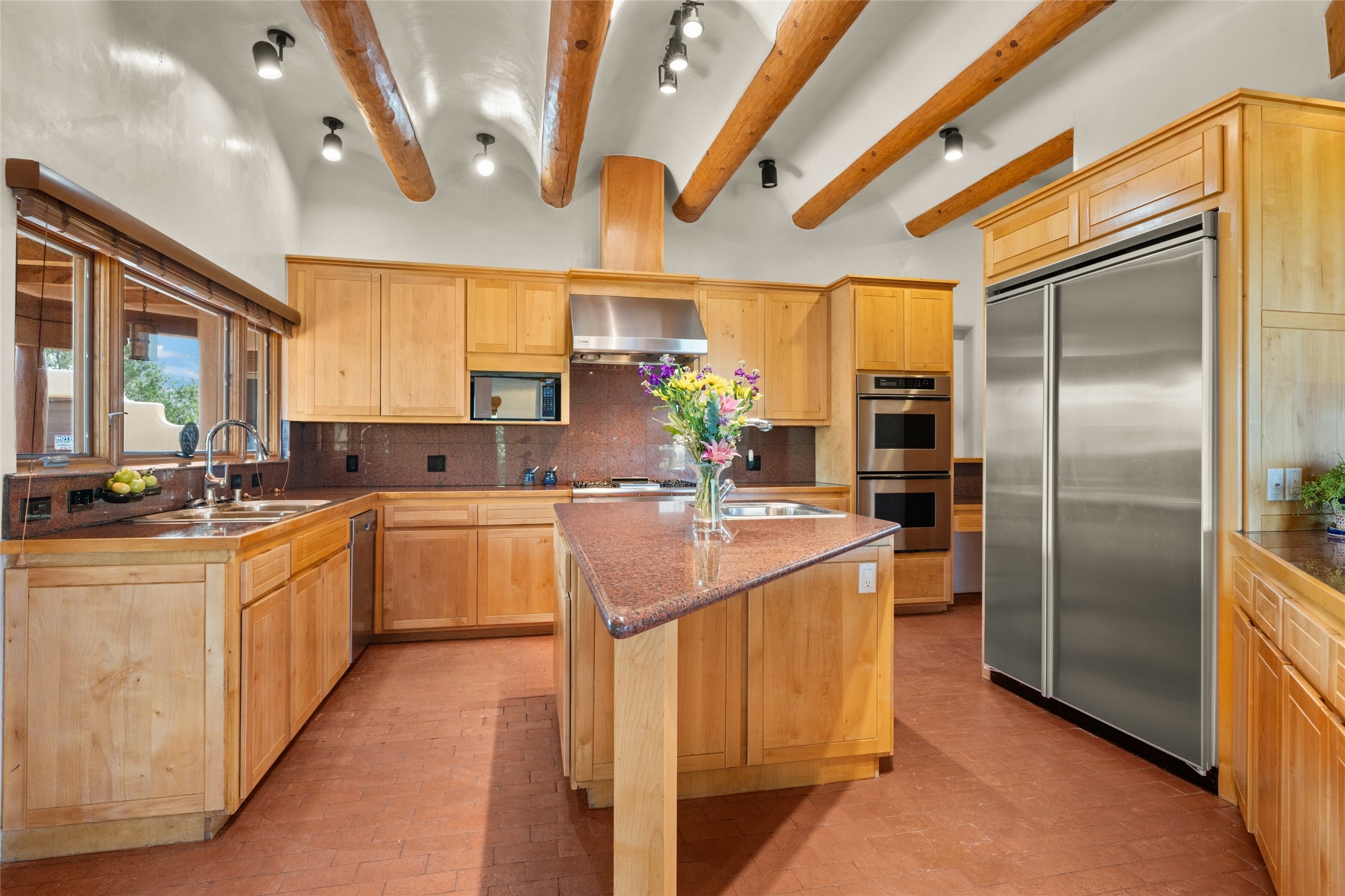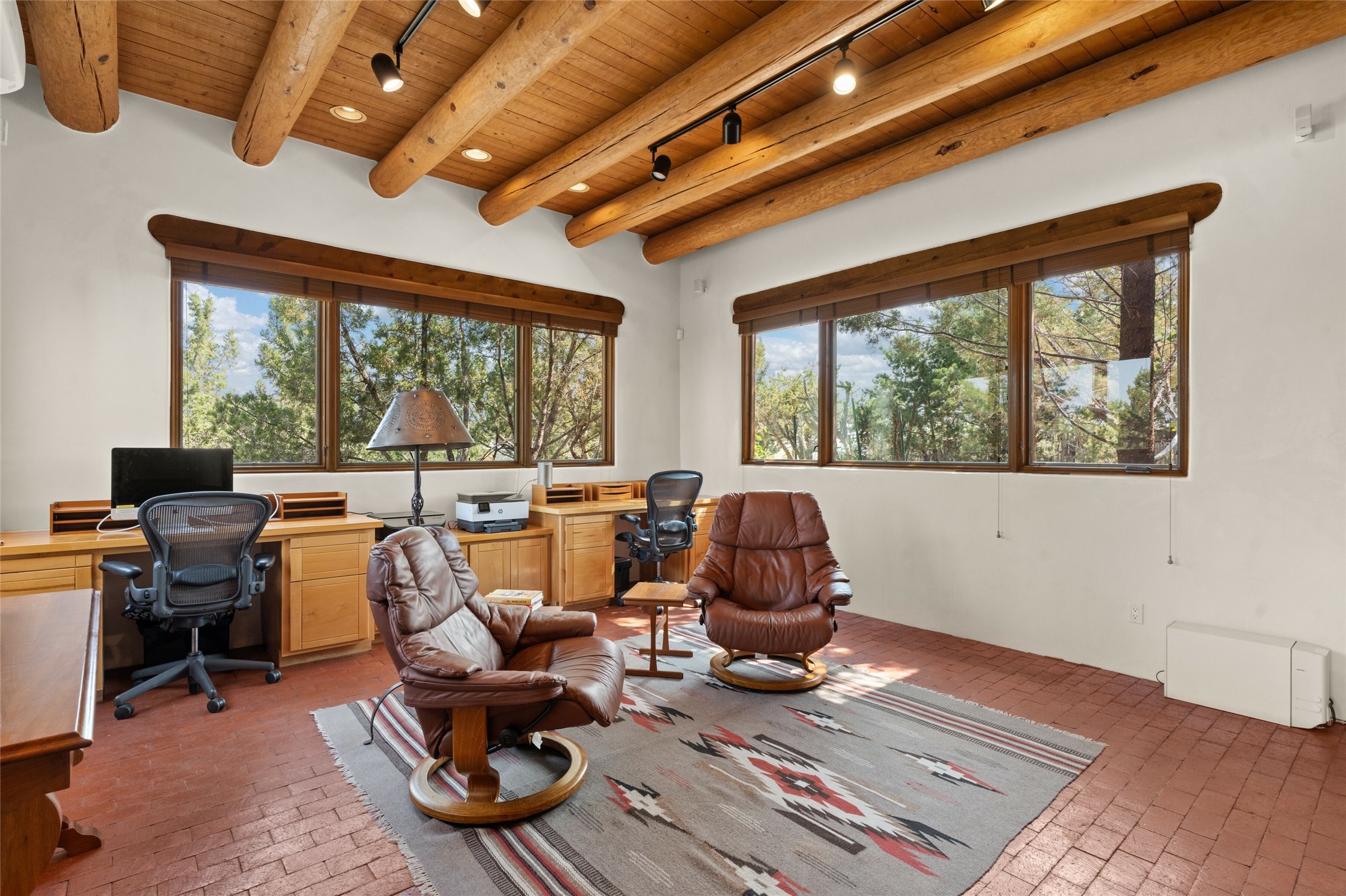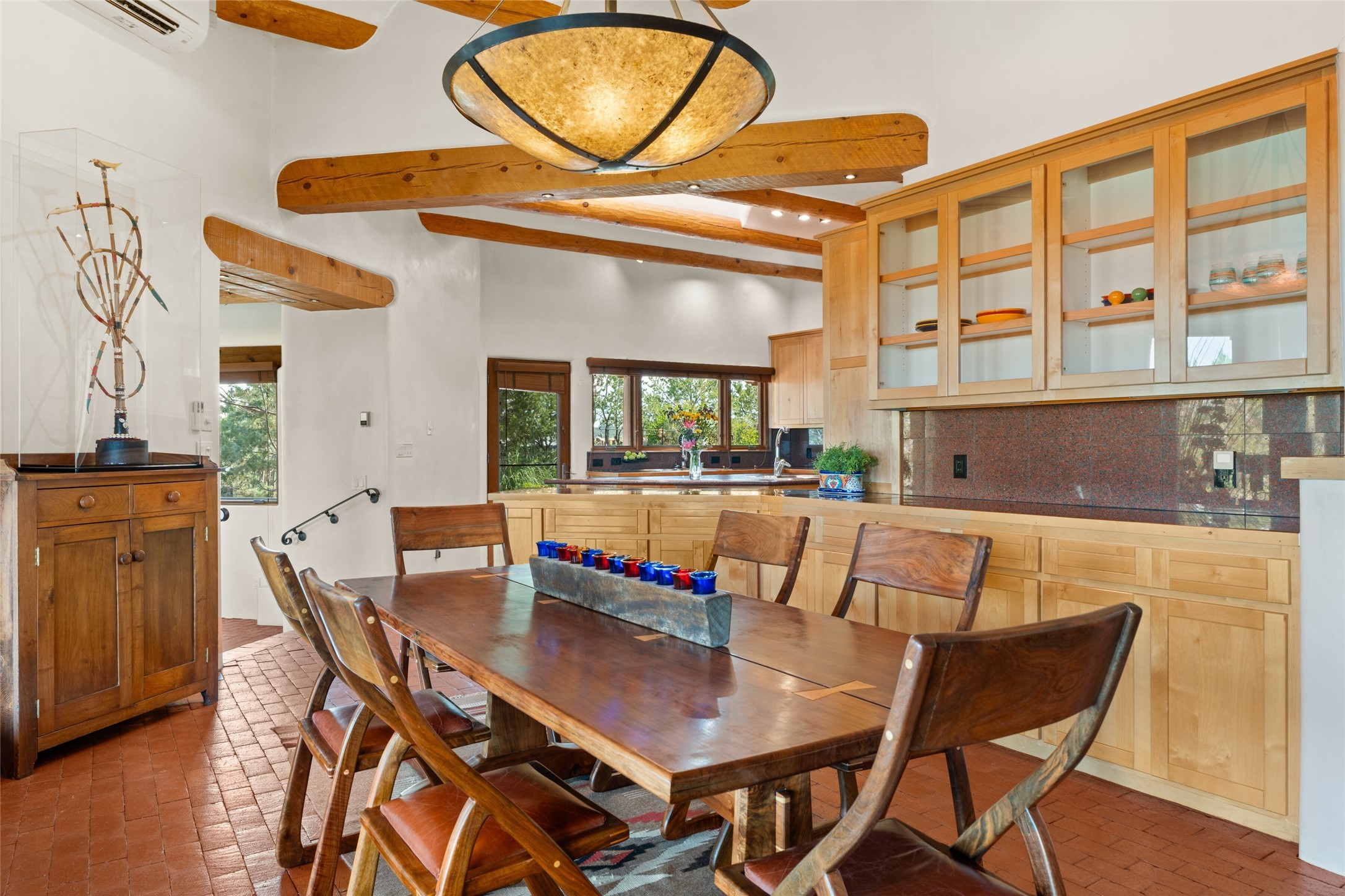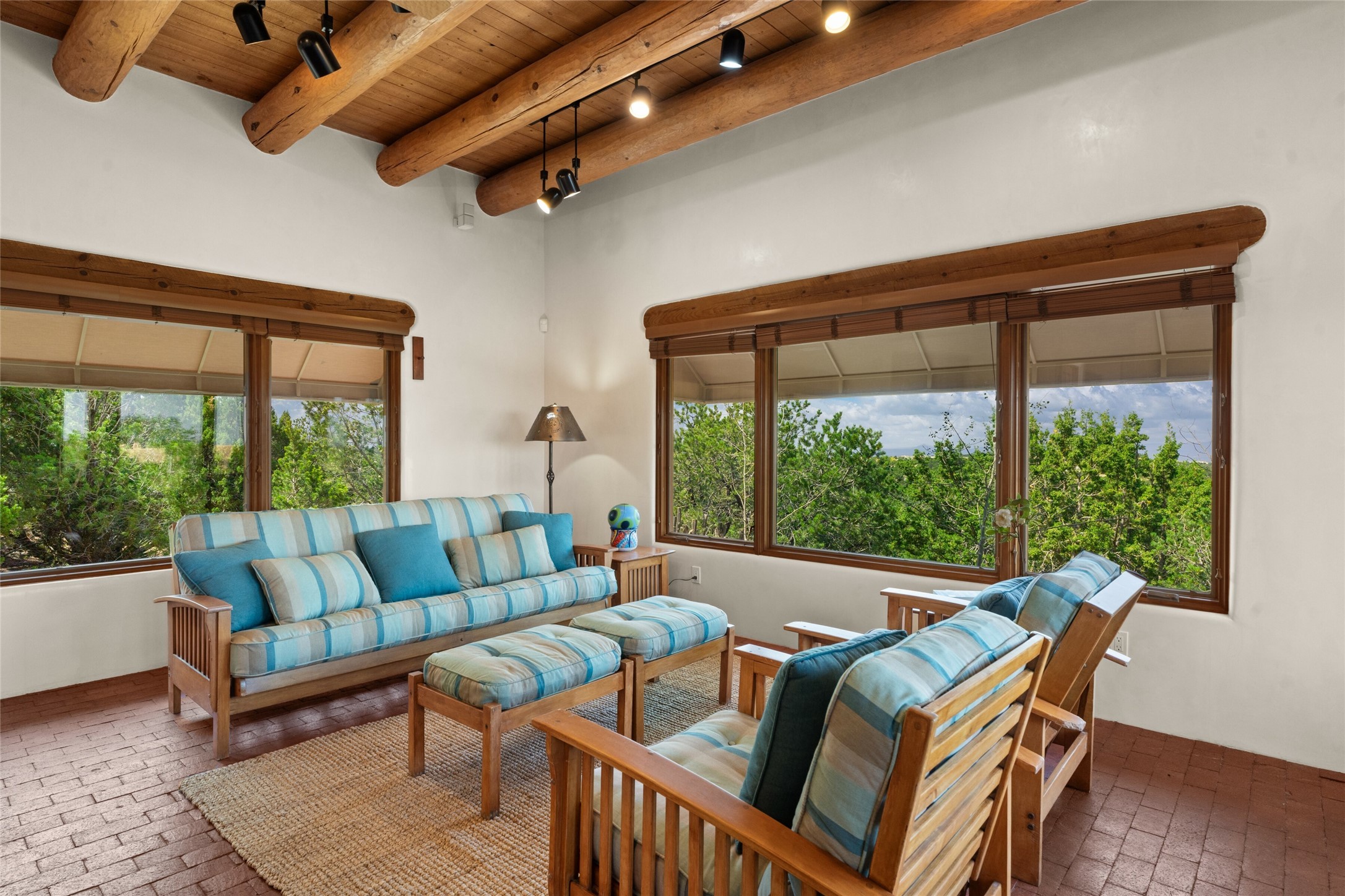 Ready to sell! Experience spectacular mountain views in every direction from this traditional Pueblo-style residence, perched on a knoll atop approximately 2.5 acres. This home radiates warmth and charm throughout, featuring vigas, coved ceilings, plank and latilla ceilings. The newly plastered walls are adorned with charming nichos. Alder wood doors and cabinetry are found throughout the home. Tall French doors and windows in the living and dining rooms bathe the space in natural light while framing breathtaking views. Eighteen-foot ceilings create an expansive, open feel, and additional French doors lead to an extraordinary portal that offers panoramic views, ample seating, dining areas, a fireplace, and a grill--perfect for outdoor living. The surrounding landscape is meticulously maintained, with lovely gardens. The kitchen shares its own lush garden portal. The spacious primary bedroom, which includes a kiva fireplace, two generous closets, and a luxurious bath. The second bedroom boasts exceptional views and an ensuite bath. A large art studio with stunning vistas, which can also serve as a third bedroom, has direct access to the portal. The home is rich with history, featuring nineteenth-century double entry doors shipped from St. Louis and a slate and iron fireplace in the living room, adding an artful touch from the past. A charming walled front courtyard, filled with vibrant flowers, creates a delightful entrance. Beyond the beautiful architecture, the private location offers peaceful, noiseless nights under a sky full of stars--all just a short drive from the city. This remarkable property is now ready for its next chapter!