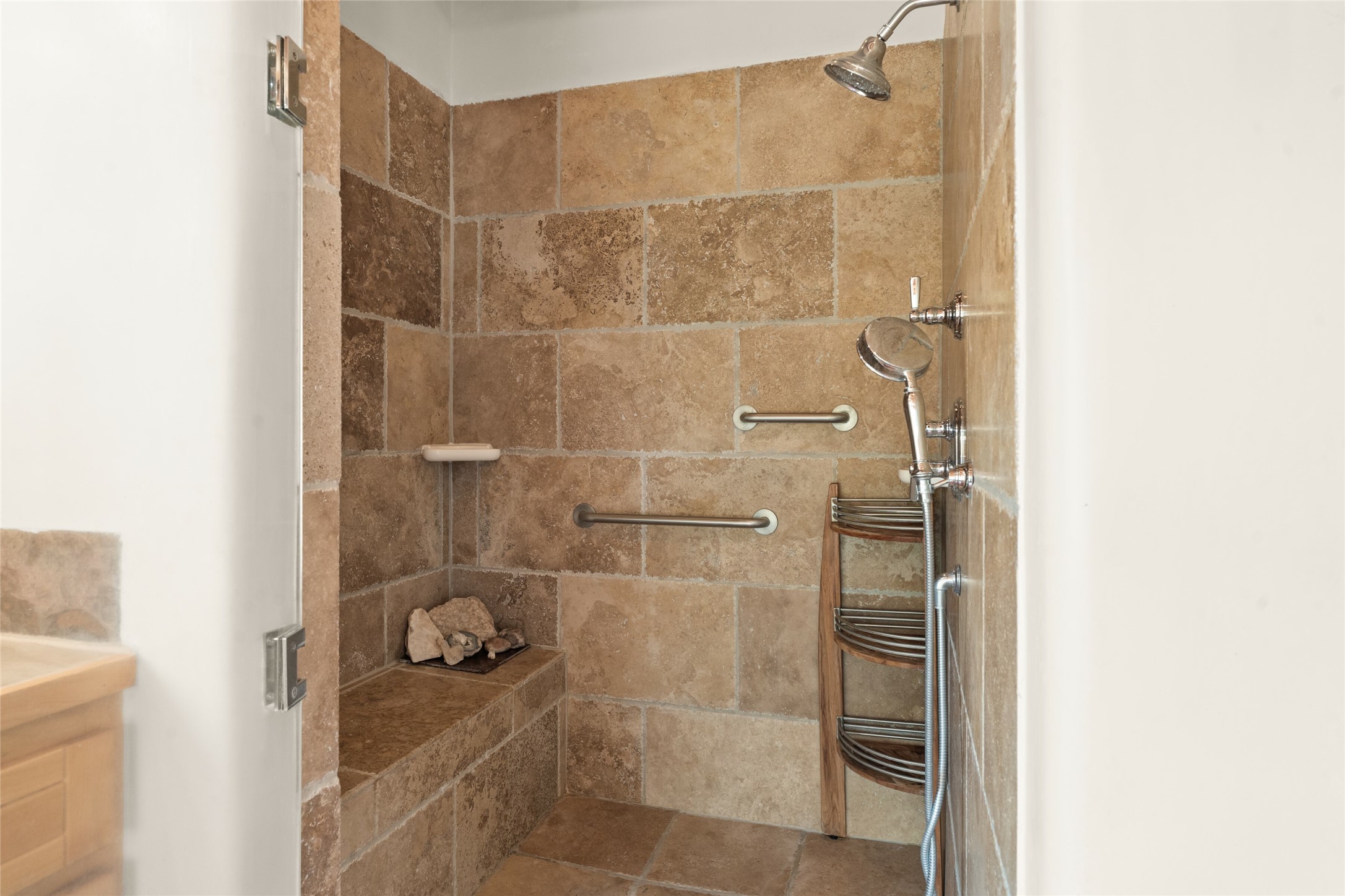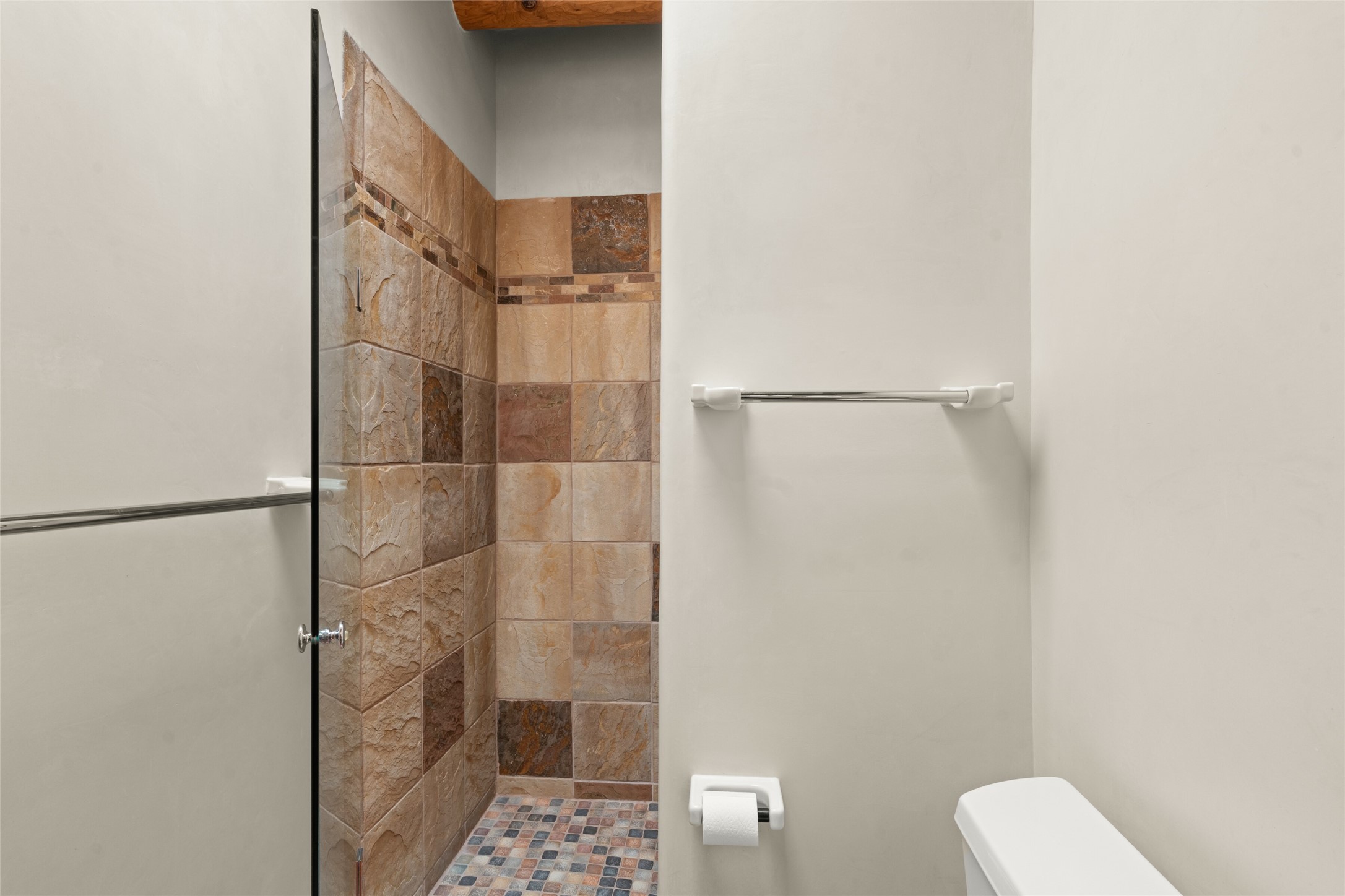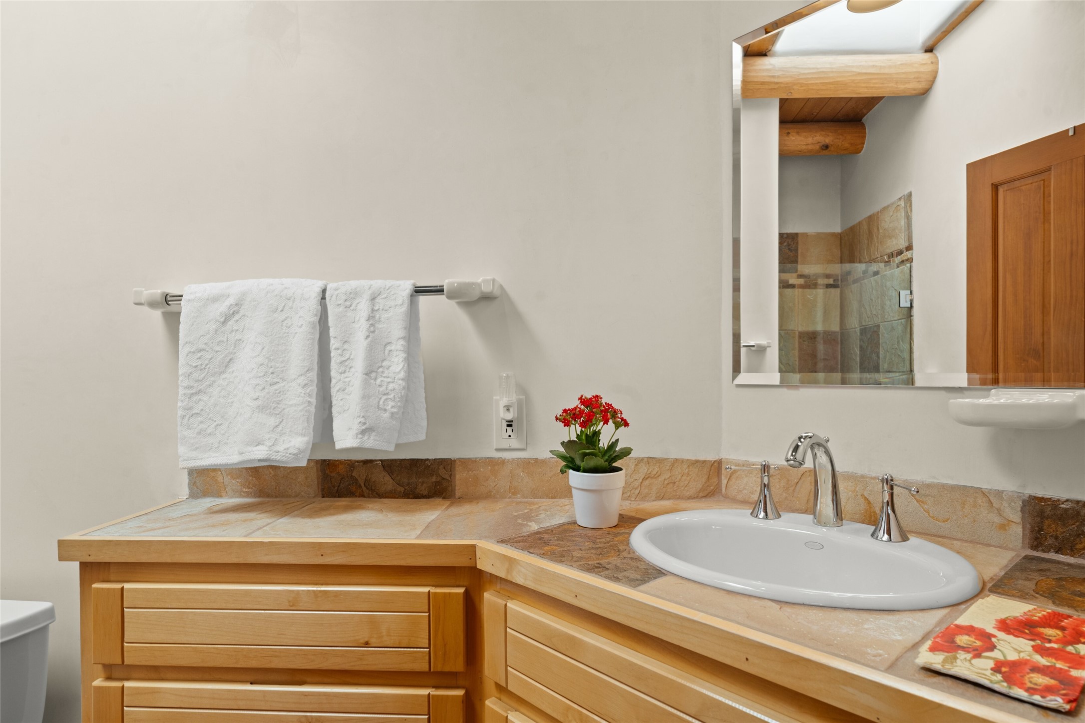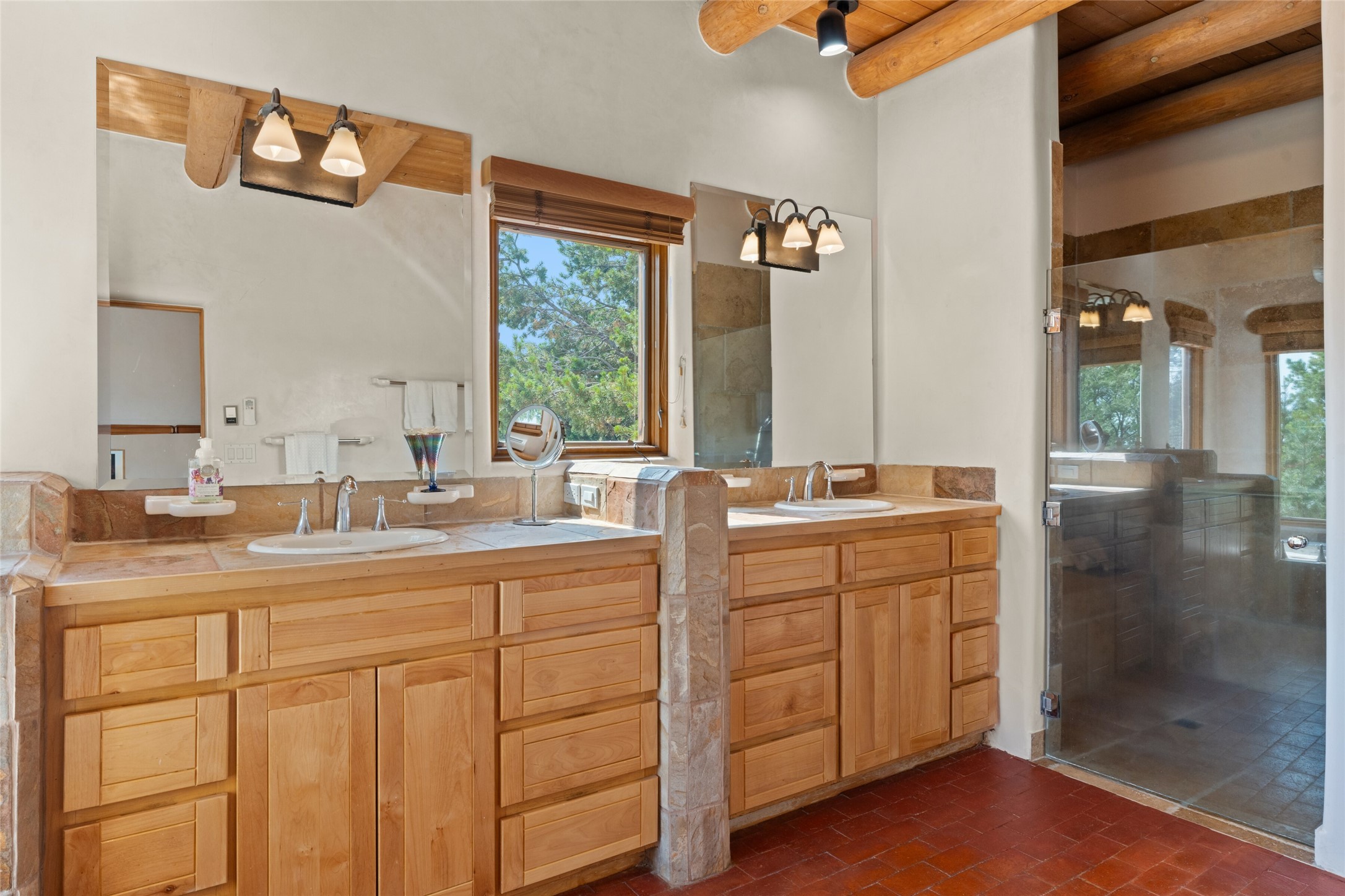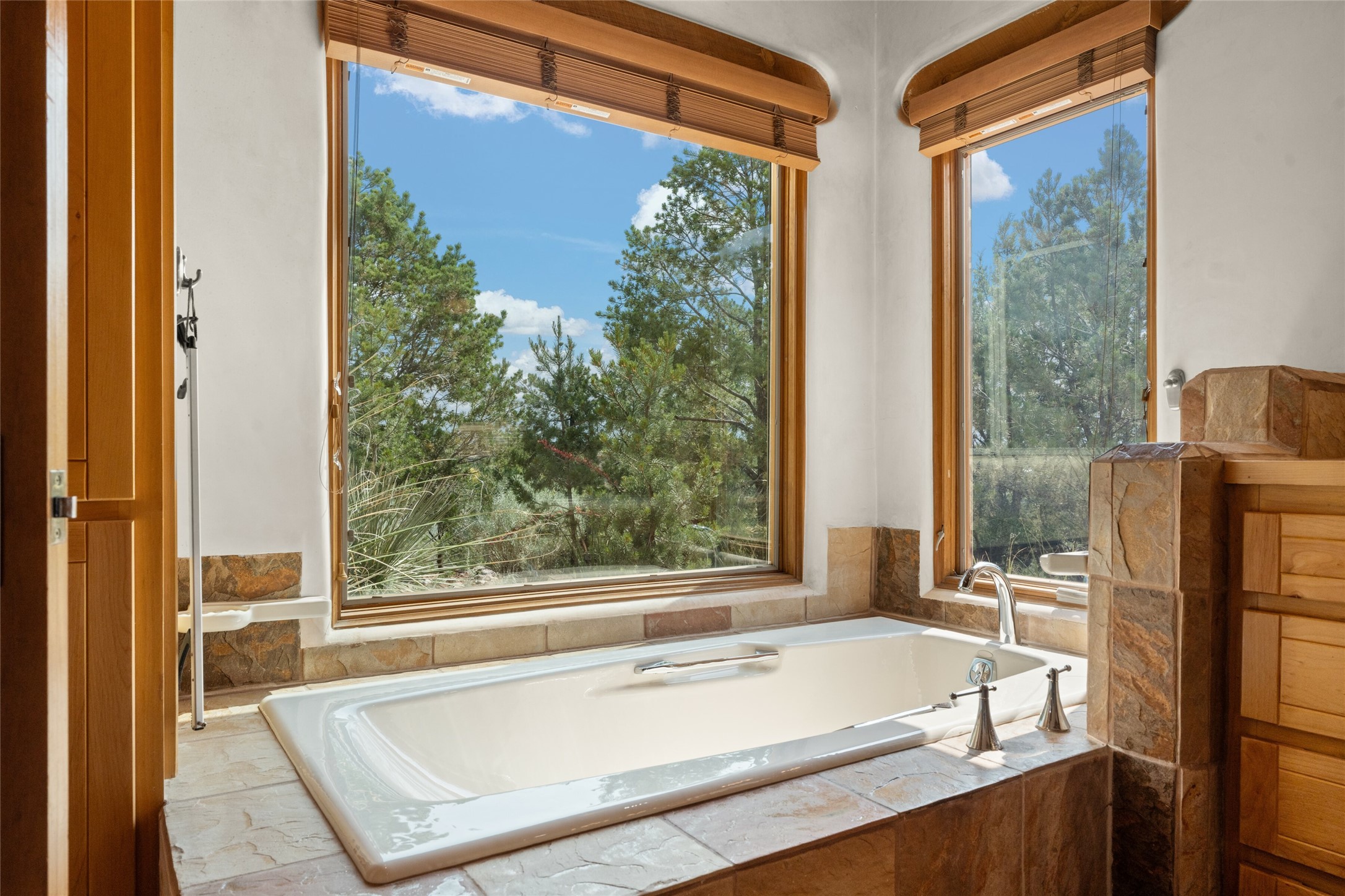 Ready to sell! Experience spectacular mountain views in every direction from this traditional Pueblo-style residence, perched on a knoll atop approximately 2.5 acres. This home radiates warmth and charm throughout, featuring vigas, coved ceilings, plank and latilla ceilings. The newly plastered walls are adorned with charming nichos. Alder wood doors and cabinetry are found throughout the home. Tall French doors and windows in the living and dining rooms bathe the space in natural light while framing breathtaking views. Eighteen-foot ceilings create an expansive, open feel, and additional French doors lead to an extraordinary portal that offers panoramic views, ample seating, dining areas, a fireplace, and a grill--perfect for outdoor living. The surrounding landscape is meticulously maintained, with lovely gardens. The kitchen shares its own lush garden portal. The spacious primary bedroom, which includes a kiva fireplace, two generous closets, and a luxurious bath. The second bedroom boasts exceptional views and an ensuite bath. A large art studio with stunning vistas, which can also serve as a third bedroom, has direct access to the portal. The home is rich with history, featuring nineteenth-century double entry doors shipped from St. Louis and a slate and iron fireplace in the living room, adding an artful touch from the past. A charming walled front courtyard, filled with vibrant flowers, creates a delightful entrance. Beyond the beautiful architecture, the private location offers peaceful, noiseless nights under a sky full of stars--all just a short drive from the city. This remarkable property is now ready for its next chapter!