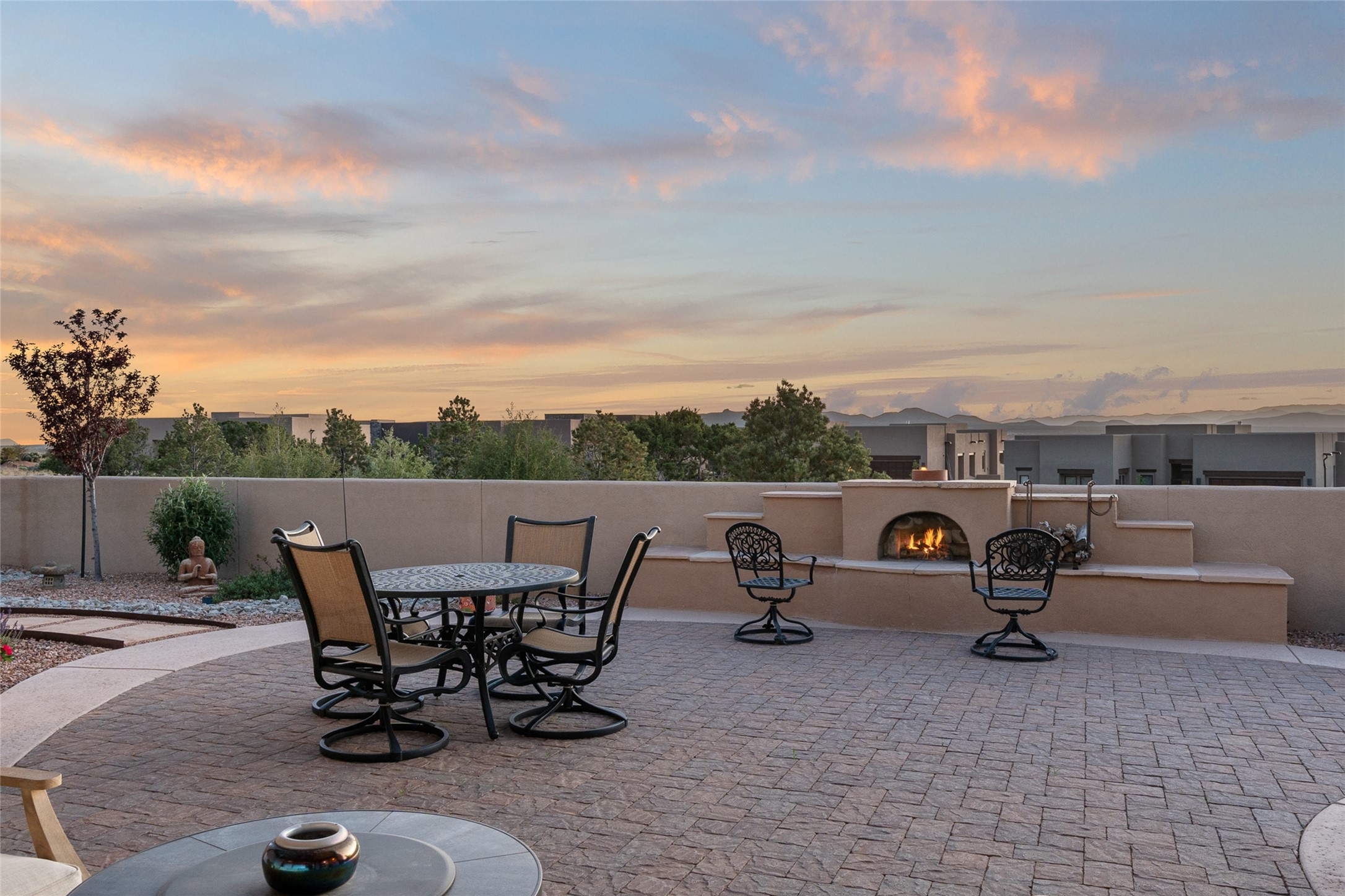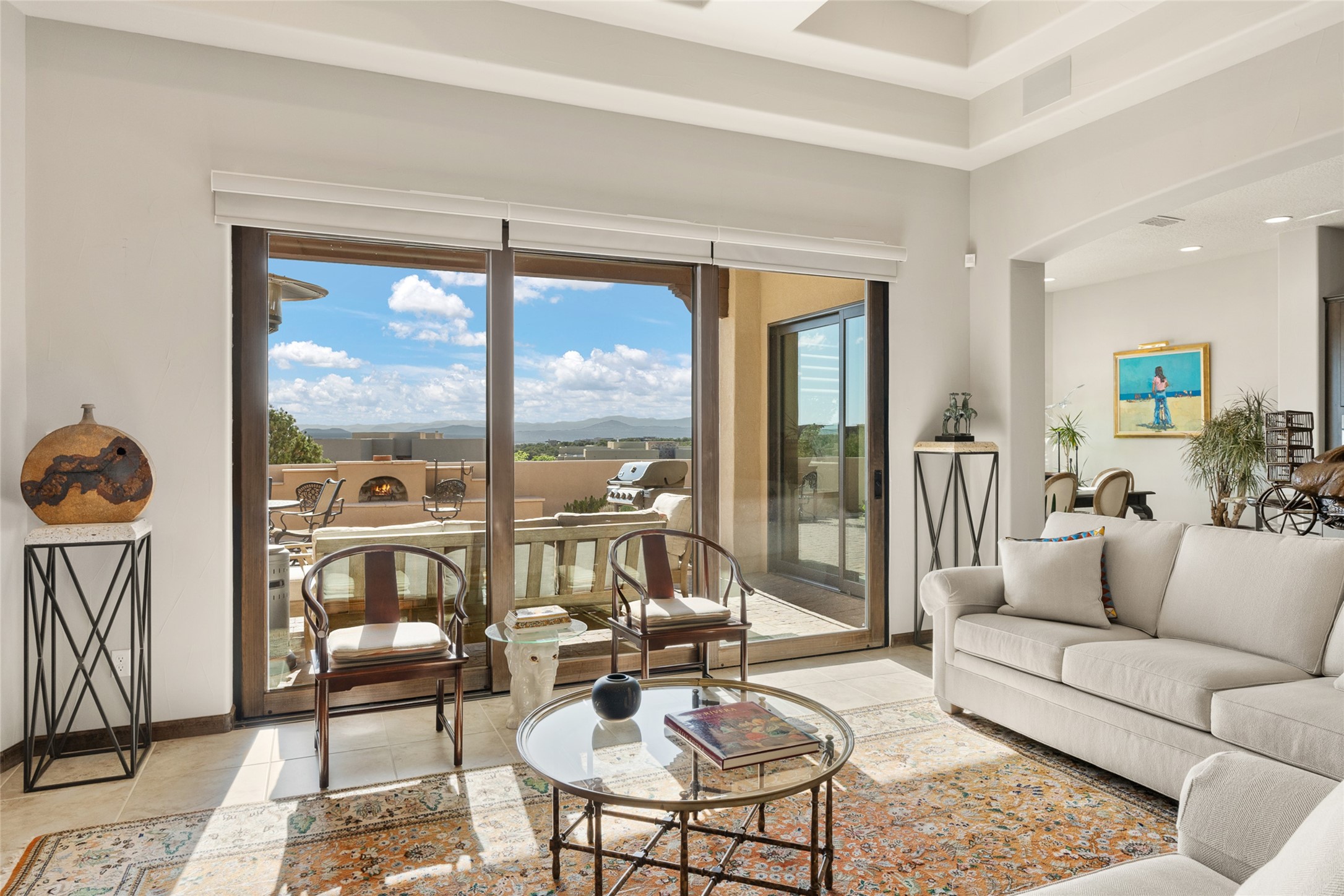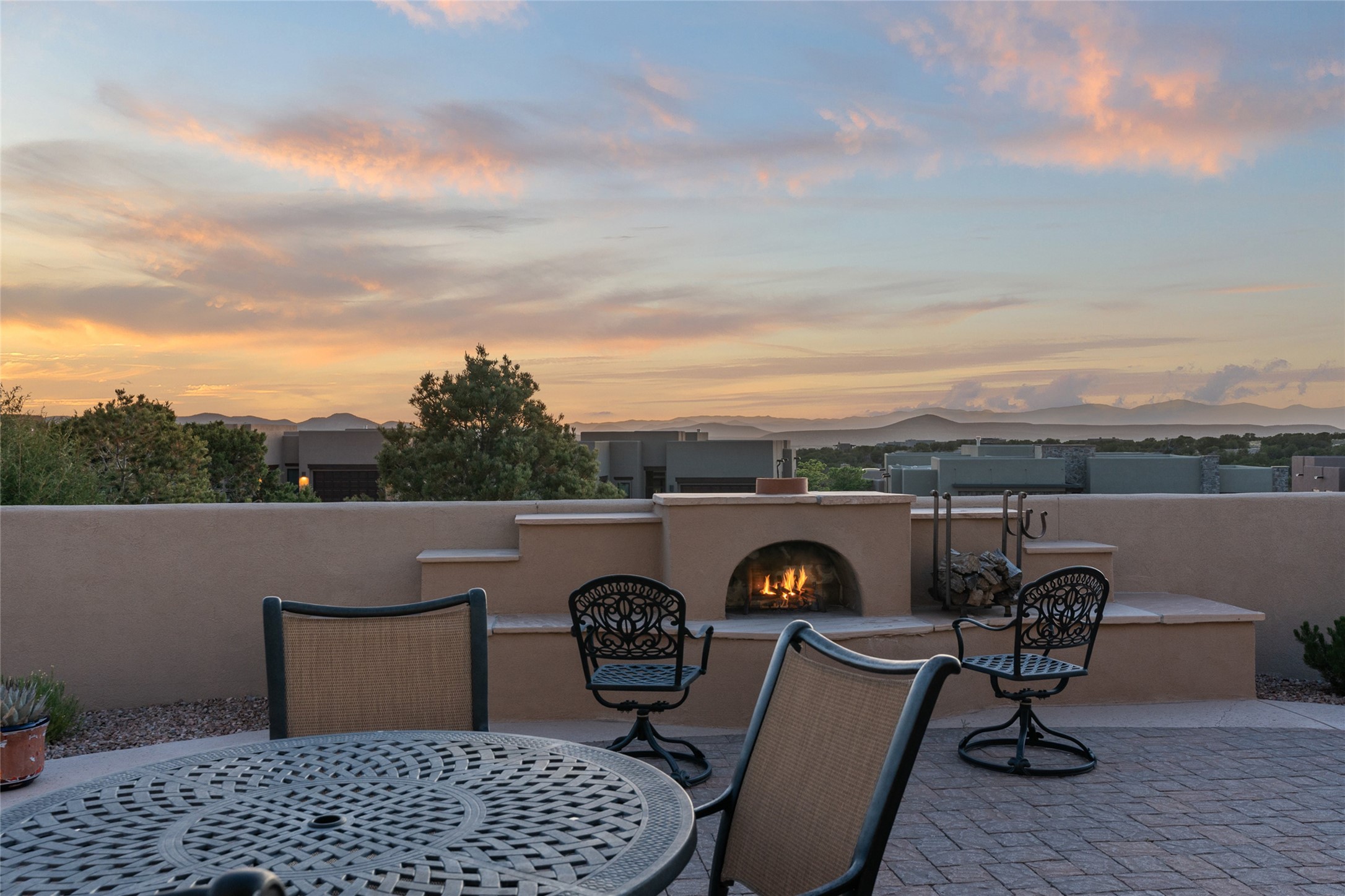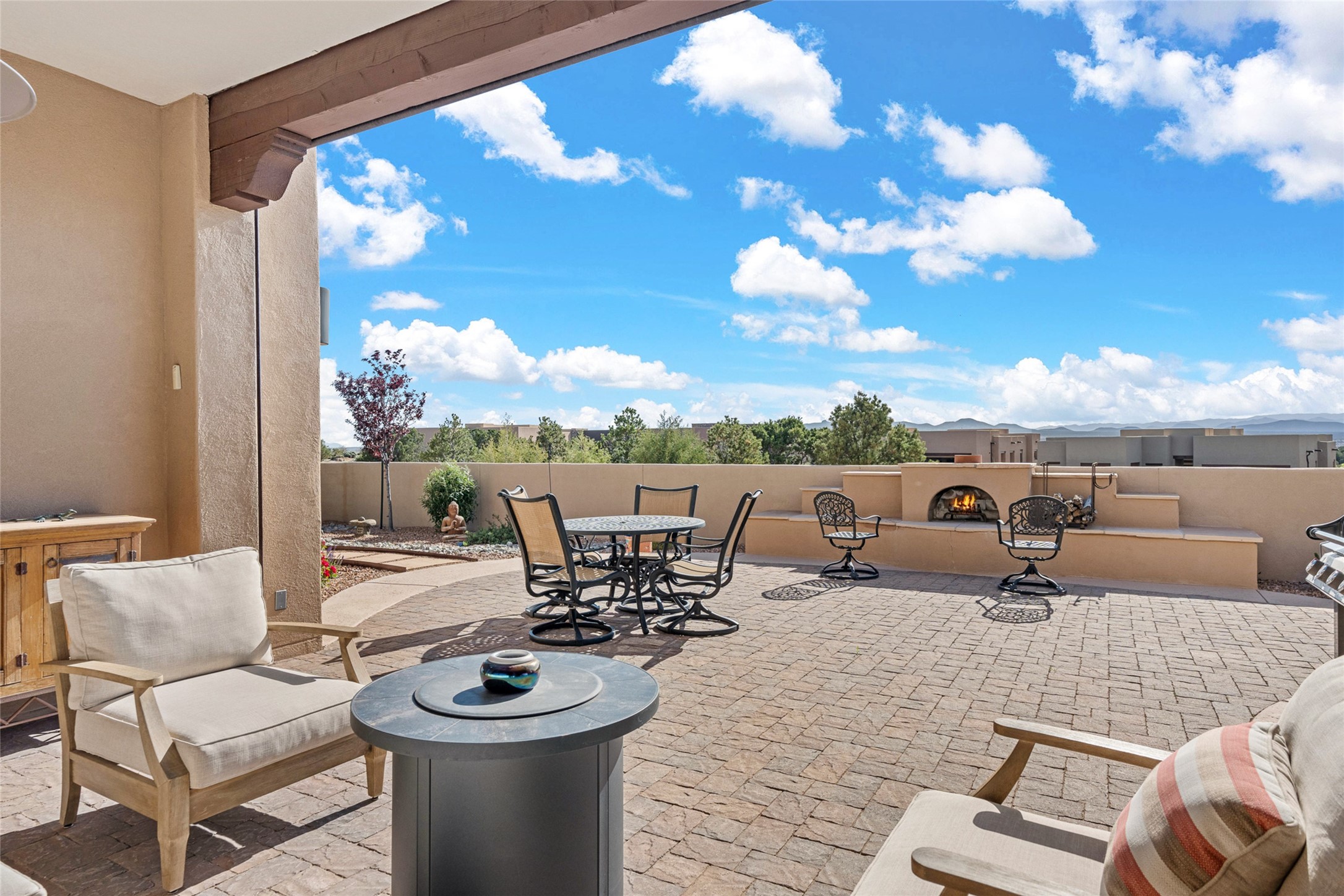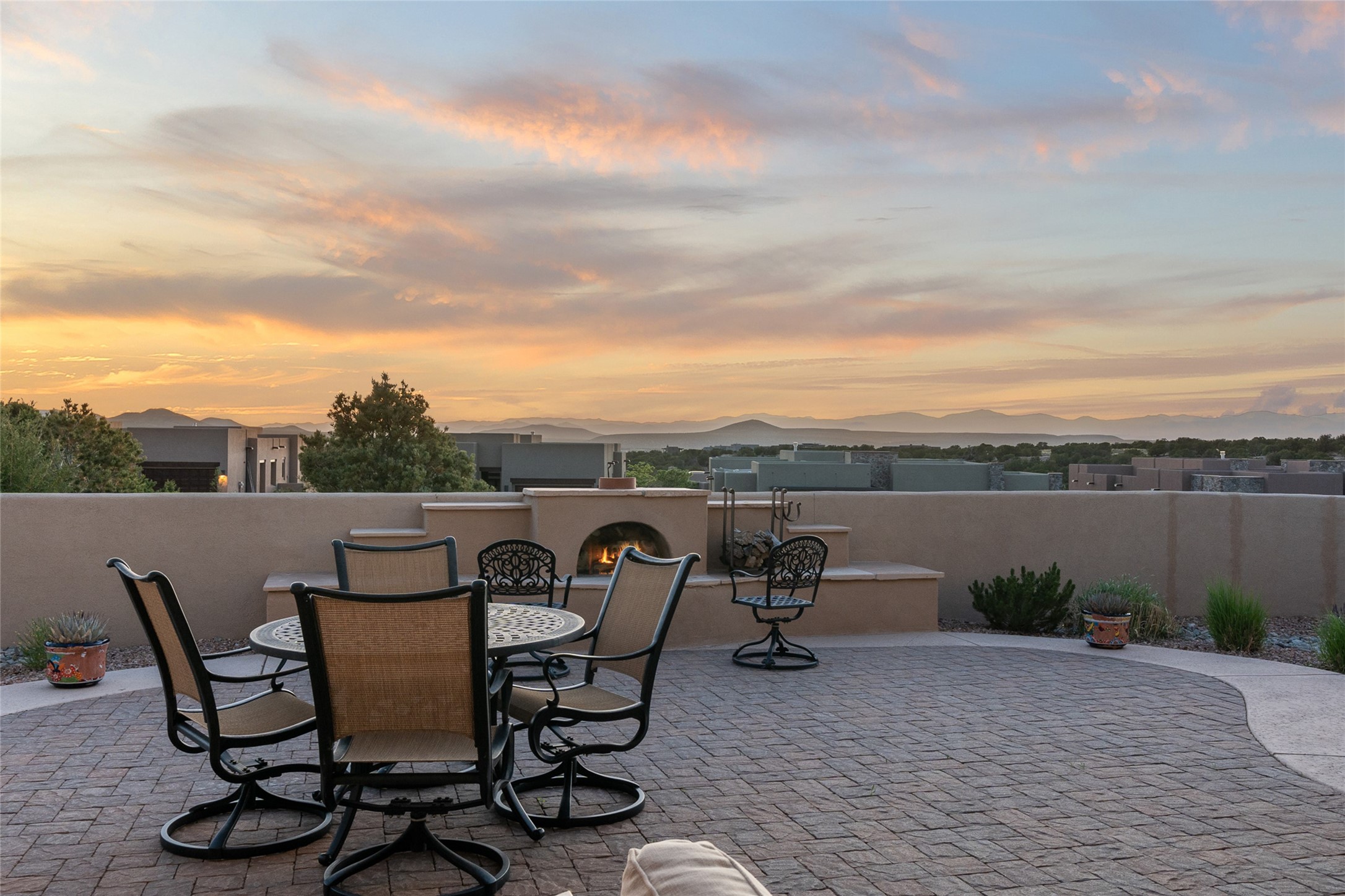 Ravishing sunsets & Jemez Mountain vistas from this stunning four-bedroom Las Campanas residence in the Las Terrazas enclave. The open concept design features a spacious living room with soaring 12' ceiling and a linear gas fireplace, and a lovely separate dining area. An excellent chef's kitchen is anchored by a huge island with breakfast bar. Kitchen countertops are a rich leathered granite, and the deep walk-in pantry offers superb storage. The split floor plan provides the outstanding primary suite blissful privacy & exquisite views. A separate guest wing boasts two bedrooms - one currently used as an office - plus a divine suite with private sitting room & bath. Tall French doors open to the handsome media room/study with entertainment center accessed off the dramatic entry hallway. The enchanting walled terrace with its wood-burning fireplace and care-free landscaped gardens on drip irrigation, is ideal for al fresco dining, entertaining and quiet relaxation. Its deep living/dining portal includes a remote screen for ease of use. Other significant improvements and upgrades include custom window treatments throughout, remote living room shades, custom fitted closets, whole house on-demand hot water, and upscale wall finishes throughout. The direct entry three-car garage has a wall to enable one bay to be used as a studio, gym, etc. if desired. This impeccable home is conveniently located near the Las Campanas Clubhouse & Spa. Through the HOA, homeowners enjoy 24-hour security, (both gate and roving patrol), 24-hour paramedics, front & side yard landscape maintenance, and vacation watch when away. Purchase of Membership to The Club is required to use Las Campanas amenities, including Club restaurants, fitness center, pools, beauty treatments, tennis, pickle ball and horse facilities. Information for Club golf membership application for use of the two Jack Nicklaus Signature courses may be obtained from Isabel Chavarria, Director of Membership Development.
