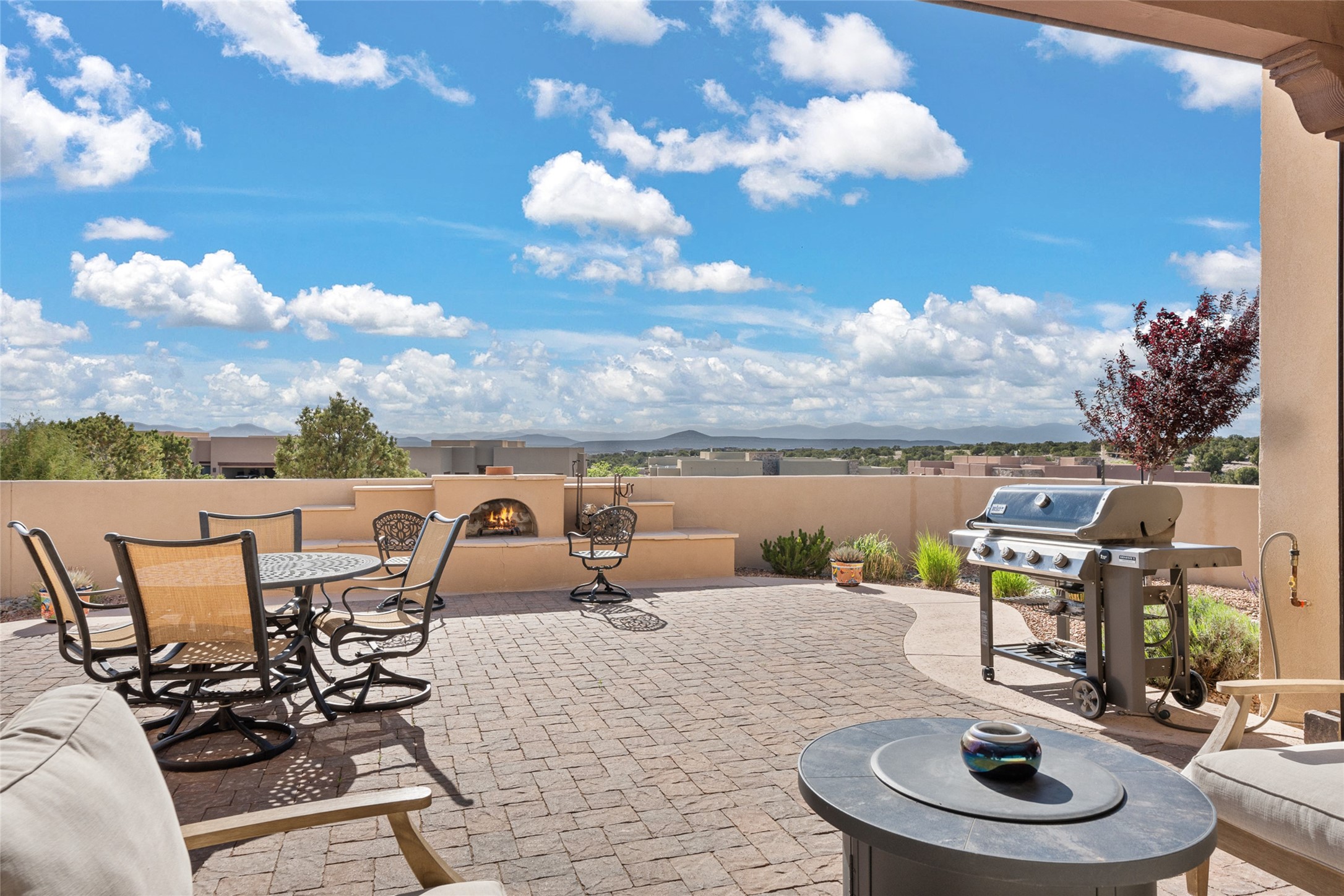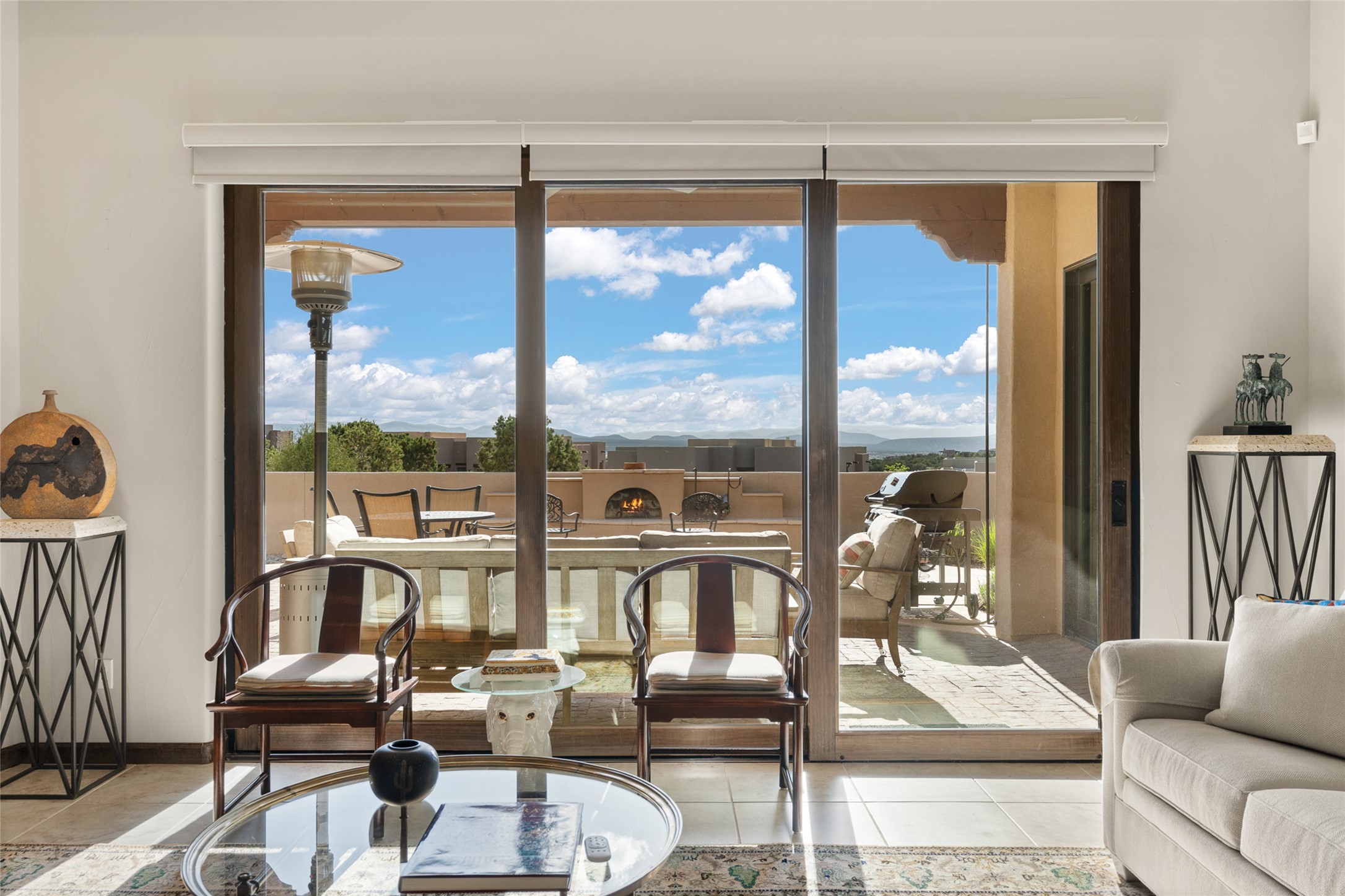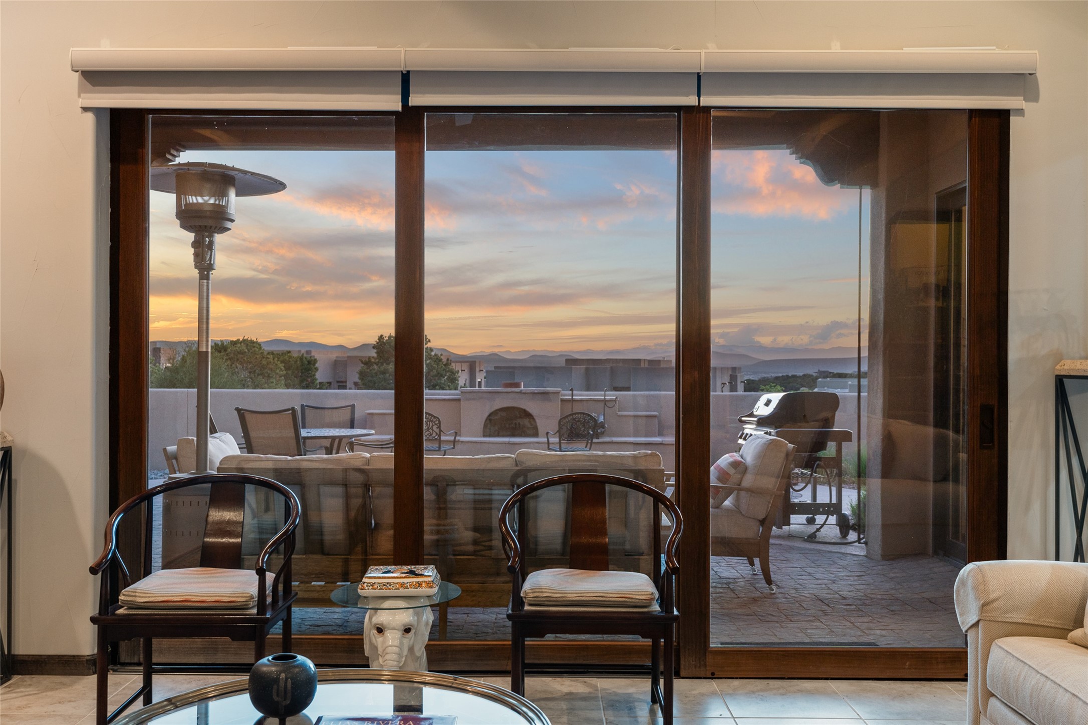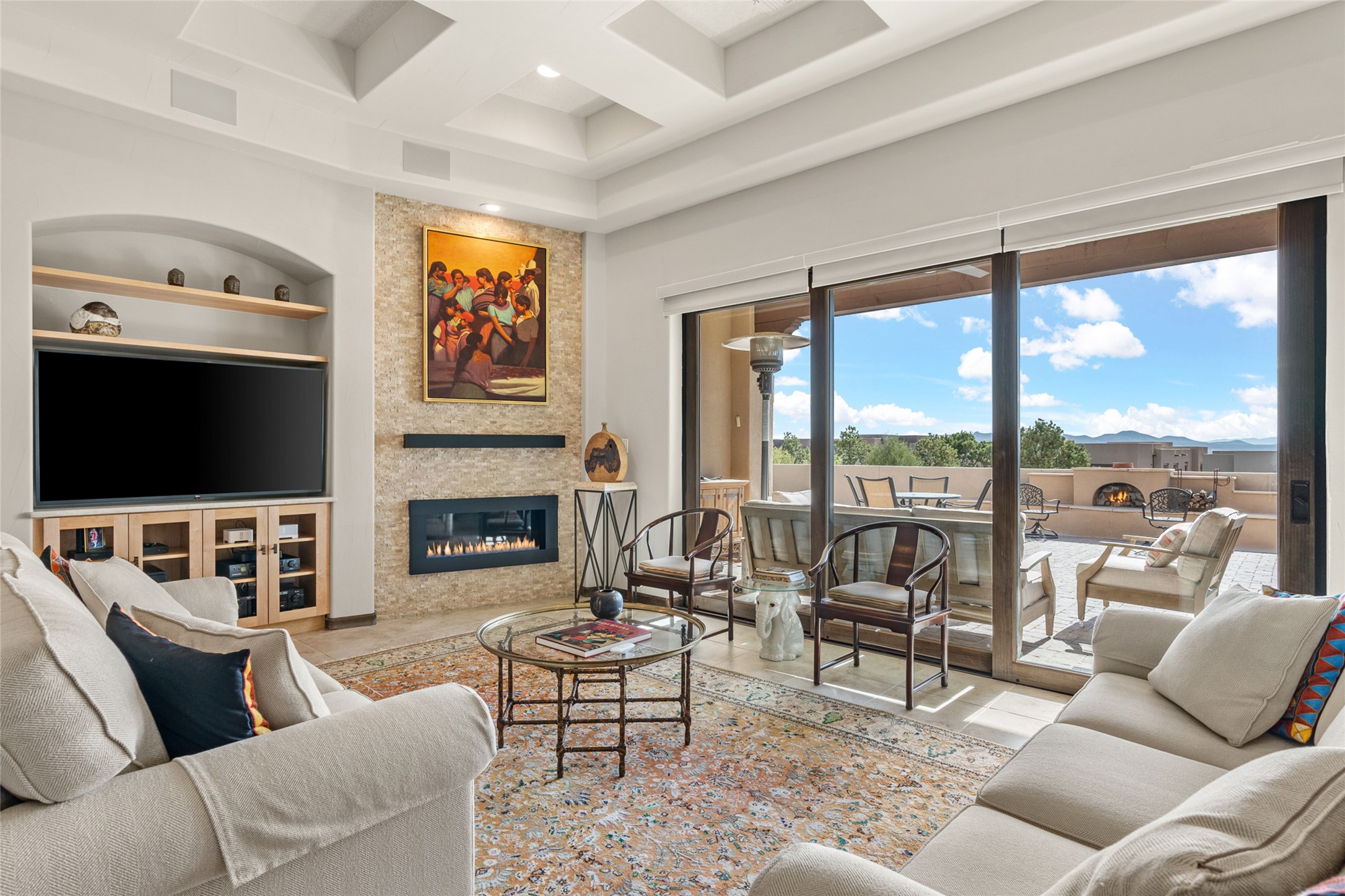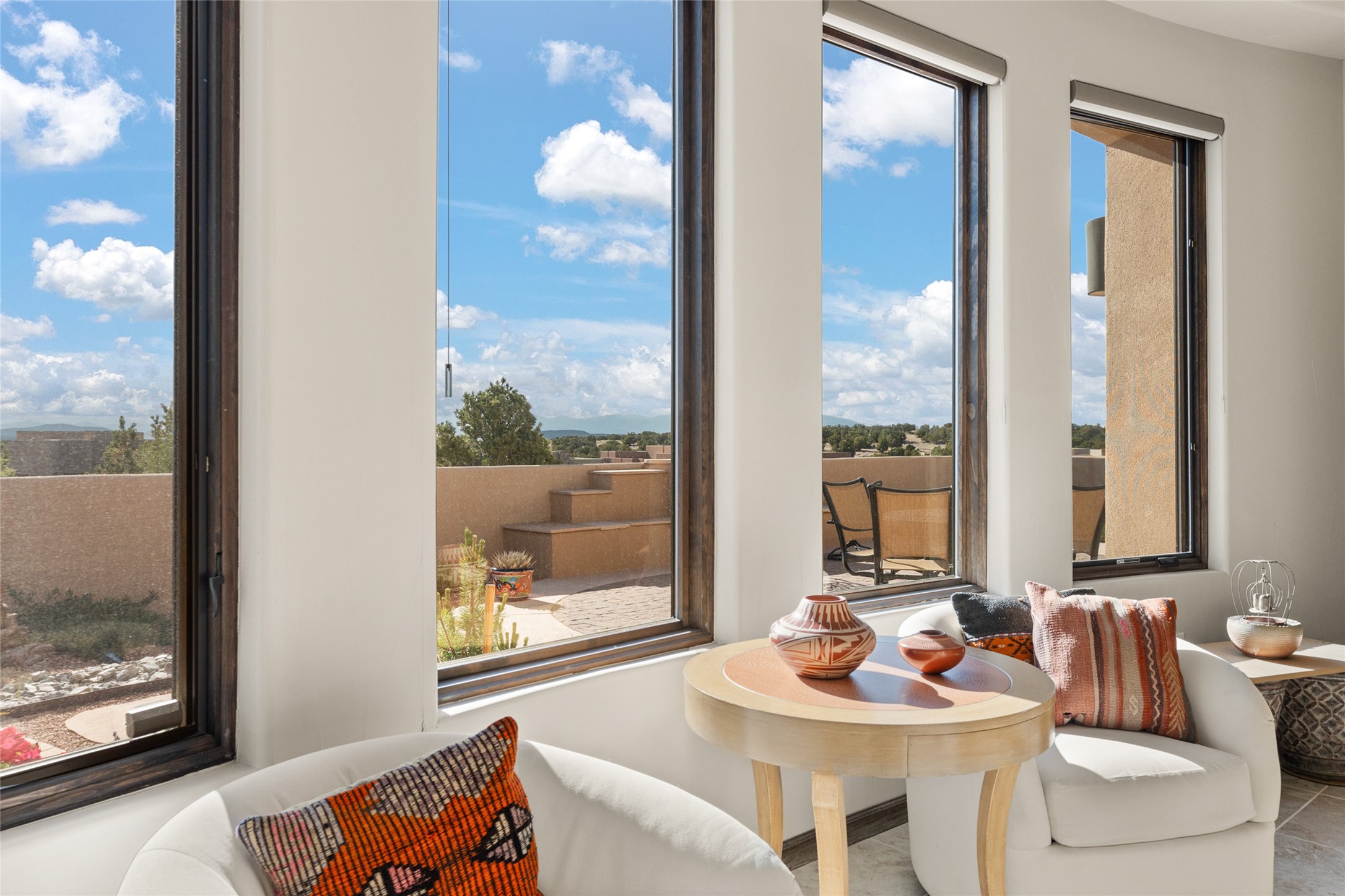 Ravishing sunsets & Jemez Mountain vistas from this stunning four-bedroom Las Campanas residence in the Las Terrazas enclave. The open concept design features a spacious living room with soaring 12' ceiling and a linear gas fireplace, and a lovely separate dining area. An excellent chef's kitchen is anchored by a huge island with breakfast bar. Kitchen countertops are a rich leathered granite, and the deep walk-in pantry offers superb storage. The split floor plan provides the outstanding primary suite blissful privacy & exquisite views. A separate guest wing boasts two bedrooms - one currently used as an office - plus a divine suite with private sitting room & bath. Tall French doors open to the handsome media room/study with entertainment center accessed off the dramatic entry hallway. The enchanting walled terrace with its wood-burning fireplace and care-free landscaped gardens on drip irrigation, is ideal for al fresco dining, entertaining and quiet relaxation. Its deep living/dining portal includes a remote screen for ease of use. Other significant improvements and upgrades include custom window treatments throughout, remote living room shades, custom fitted closets, whole house on-demand hot water, and upscale wall finishes throughout. The direct entry three-car garage has a wall to enable one bay to be used as a studio, gym, etc. if desired. This impeccable home is conveniently located near the Las Campanas Clubhouse & Spa. Through the HOA, homeowners enjoy 24-hour security, (both gate and roving patrol), 24-hour paramedics, front & side yard landscape maintenance, and vacation watch when away. Purchase of Membership to The Club is required to use Las Campanas amenities, including Club restaurants, fitness center, pools, beauty treatments, tennis, pickle ball and horse facilities. Information for Club golf membership application for use of the two Jack Nicklaus Signature courses may be obtained from Isabel Chavarria, Director of Membership Development.