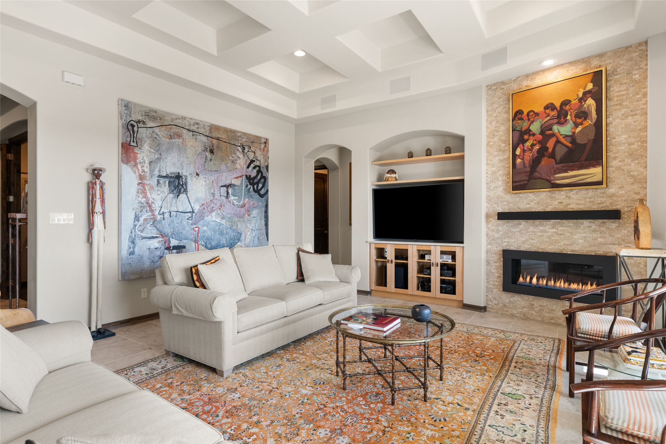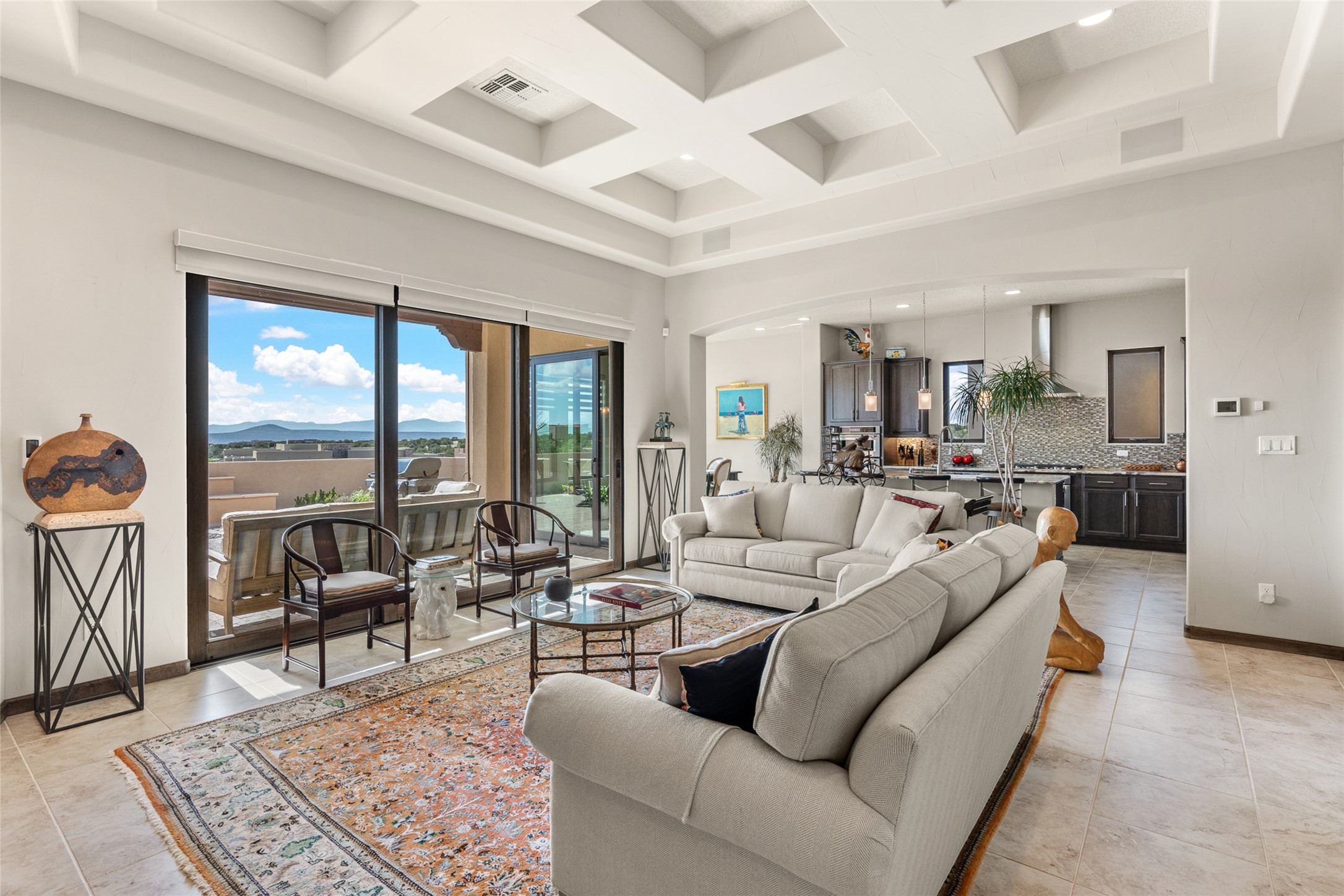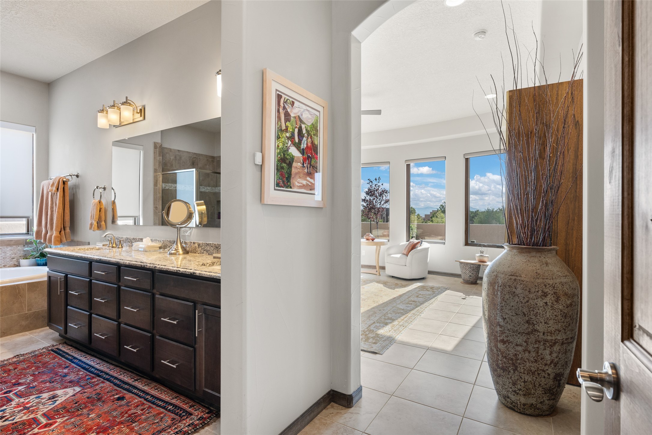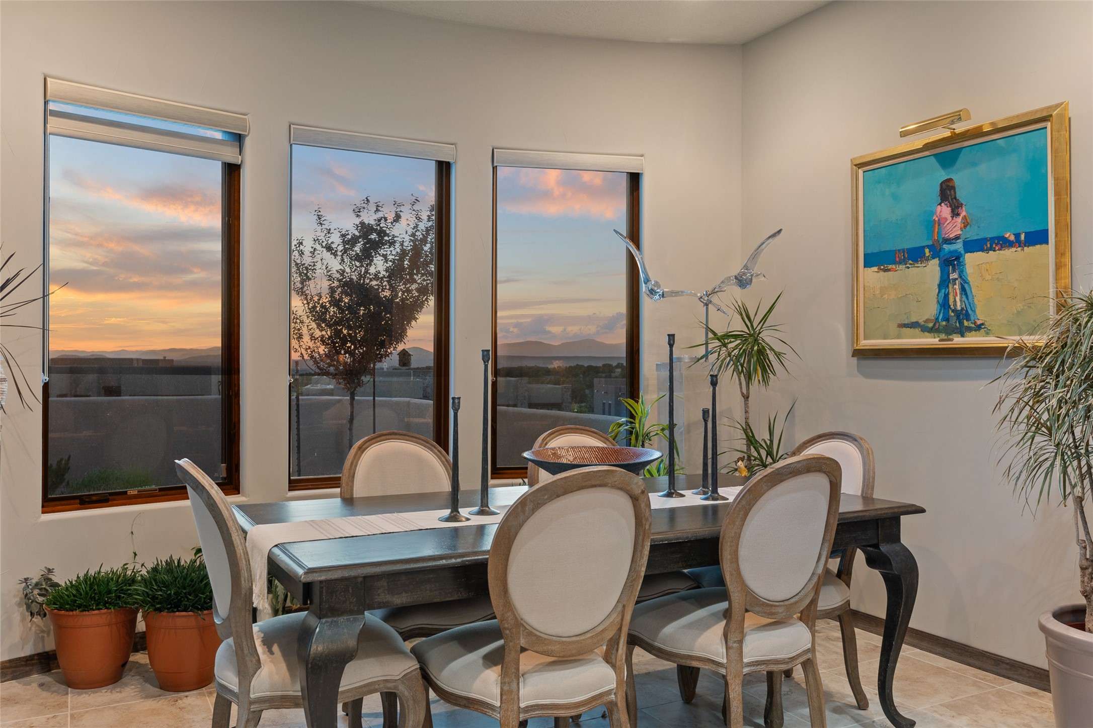Ravishing sunsets & Jemez Mountain vistas from this stunning four-bedroom Las Campanas residence in the Las Terrazas enclave. The open concept design features a spacious living room with soaring 12' ceiling and a linear gas fireplace, and a lovely separate dining area. An excellent chef's kitchen is anchored by a huge island with breakfast bar. Kitchen countertops are a rich leathered granite, and the deep walk-in pantry offers superb storage. The split floor plan provides the outstanding primary suite blissful privacy & exquisite views. A separate guest wing boasts two bedrooms - one currently used as an office - plus a divine suite with private sitting room & bath. Tall French doors open to the handsome media room/study with entertainment center accessed off the dramatic entry hallway. The enchanting walled terrace with its wood-burning fireplace and care-free landscaped gardens on drip irrigation, is ideal for al fresco dining, entertaining and quiet relaxation. Its deep living/dining portal includes a remote screen for ease of use. Other significant improvements and upgrades include custom window treatments throughout, remote living room shades, custom fitted closets, whole house on-demand hot water, and upscale wall finishes throughout. The direct entry three-car garage has a wall to enable one bay to be used as a studio, gym, etc. if desired. This impeccable home is conveniently located near the Las Campanas Clubhouse & Spa. Through the HOA, homeowners enjoy 24-hour security, (both gate and roving patrol), 24-hour paramedics, front & side yard landscape maintenance, and vacation watch when away. Purchase of Membership to The Club is required to use Las Campanas amenities, including Club restaurants, fitness center, pools, beauty treatments, tennis, pickle ball and horse facilities. Information for Club golf membership application for use of the two Jack Nicklaus Signature courses may be obtained from Isabel Chavarria, Director of Membership Development.