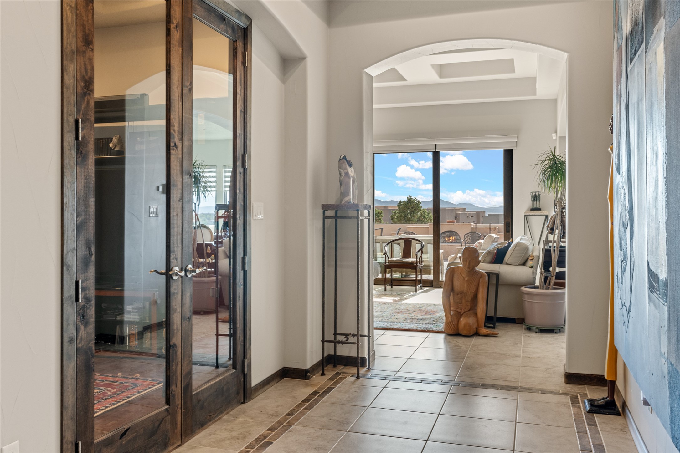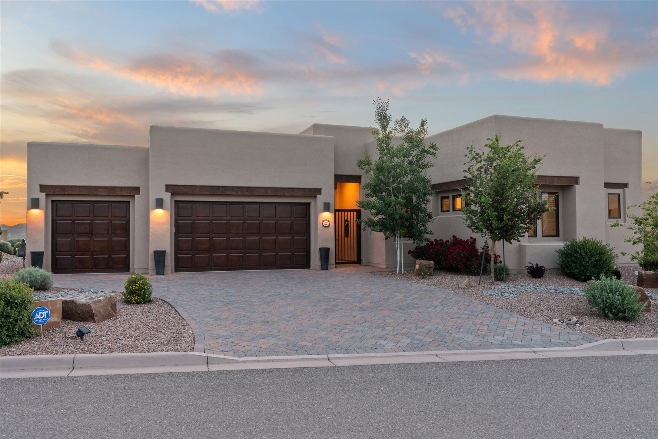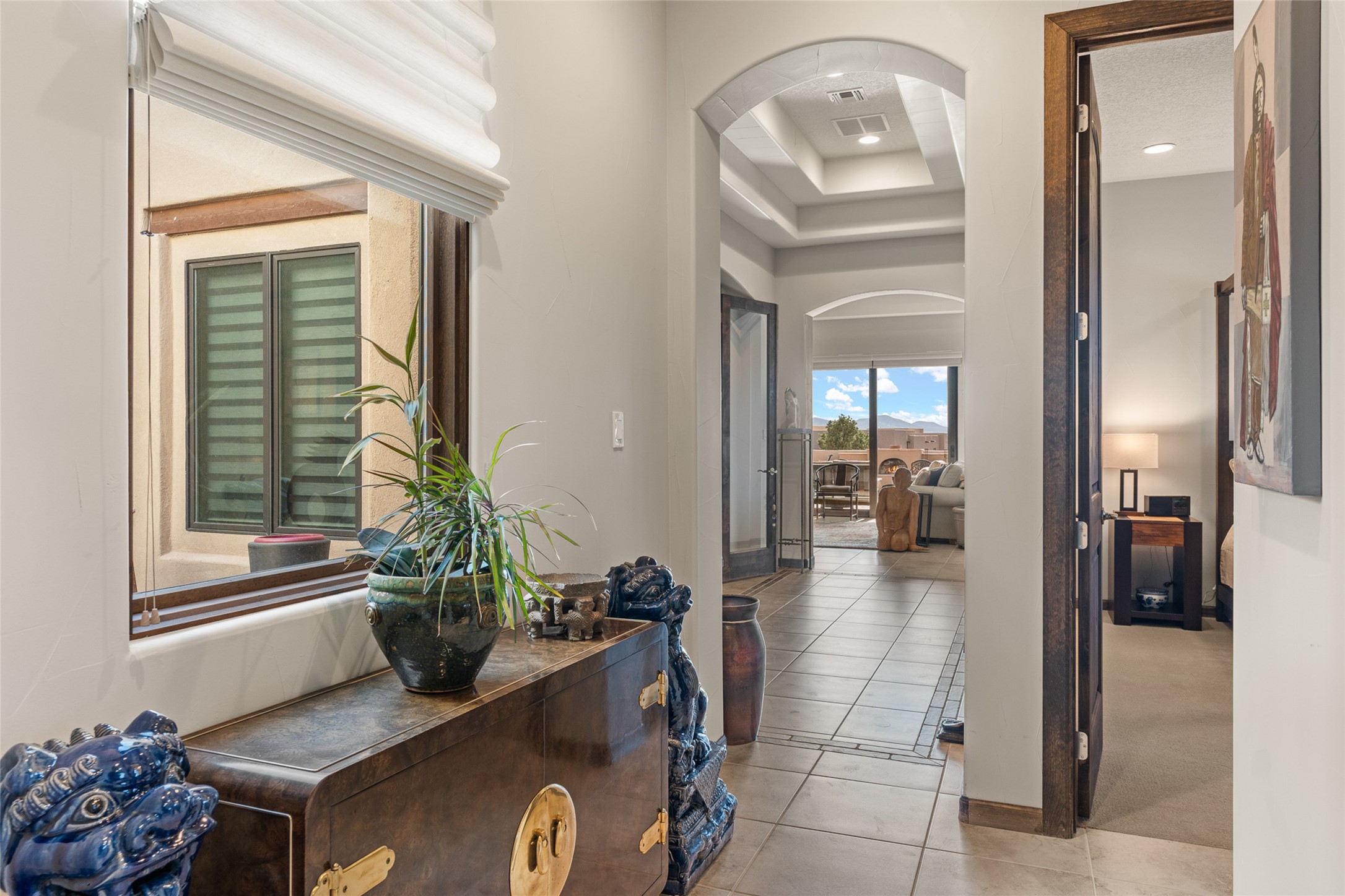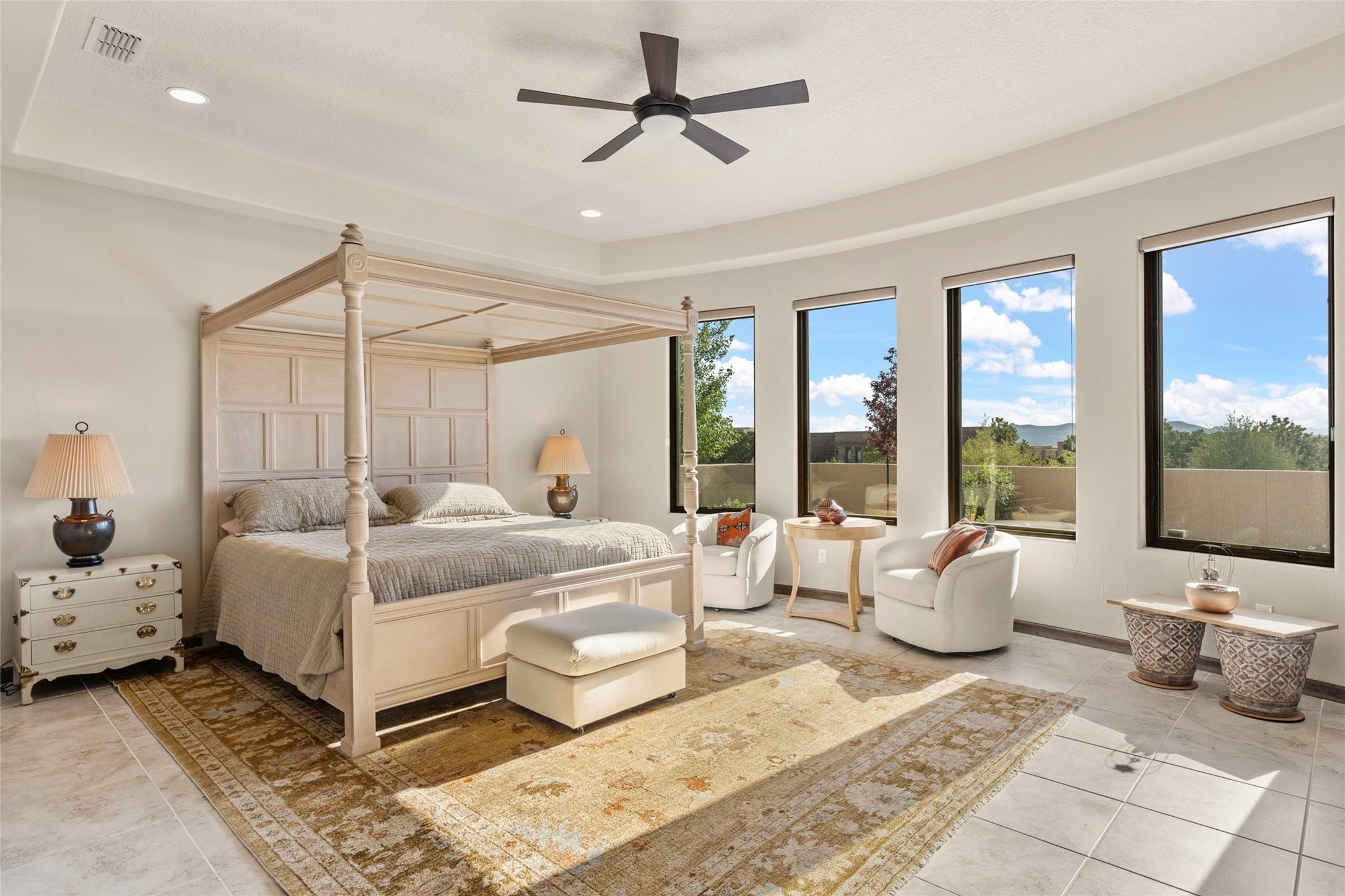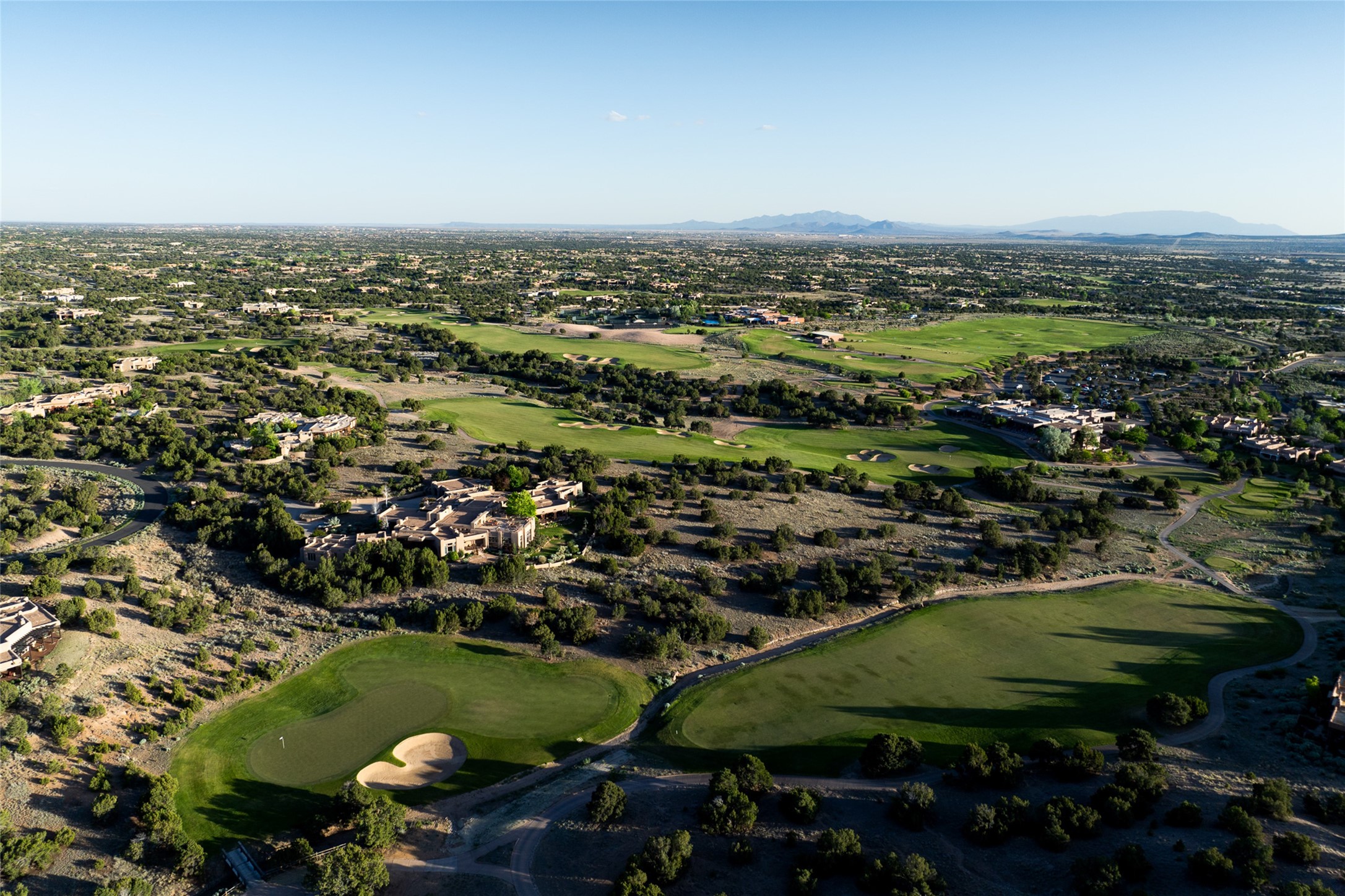 Ravishing sunsets & Jemez Mountain vistas from this stunning four-bedroom Las Campanas residence in the Las Terrazas enclave. The open concept design features a spacious living room with soaring 12' ceiling and a linear gas fireplace, and a lovely separate dining area. An excellent chef's kitchen is anchored by a huge island with breakfast bar. Kitchen countertops are a rich leathered granite, and the deep walk-in pantry offers superb storage. The split floor plan provides the outstanding primary suite blissful privacy & exquisite views. A separate guest wing boasts two bedrooms - one currently used as an office - plus a divine suite with private sitting room & bath. Tall French doors open to the handsome media room/study with entertainment center accessed off the dramatic entry hallway. The enchanting walled terrace with its wood-burning fireplace and care-free landscaped gardens on drip irrigation, is ideal for al fresco dining, entertaining and quiet relaxation. Its deep living/dining portal includes a remote screen for ease of use. Other significant improvements and upgrades include custom window treatments throughout, remote living room shades, custom fitted closets, whole house on-demand hot water, and upscale wall finishes throughout. The direct entry three-car garage has a wall to enable one bay to be used as a studio, gym, etc. if desired. This impeccable home is conveniently located near the Las Campanas Clubhouse & Spa. Through the HOA, homeowners enjoy 24-hour security, (both gate and roving patrol), 24-hour paramedics, front & side yard landscape maintenance, and vacation watch when away. Purchase of Membership to The Club is required to use Las Campanas amenities, including Club restaurants, fitness center, pools, beauty treatments, tennis, pickle ball and horse facilities. Information for Club golf membership application for use of the two Jack Nicklaus Signature courses may be obtained from Isabel Chavarria, Director of Membership Development.