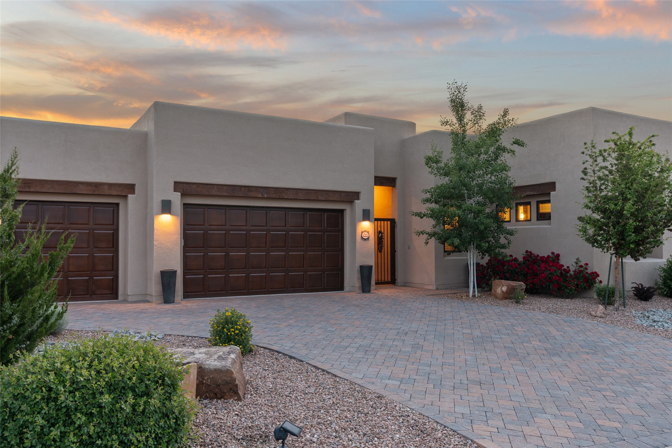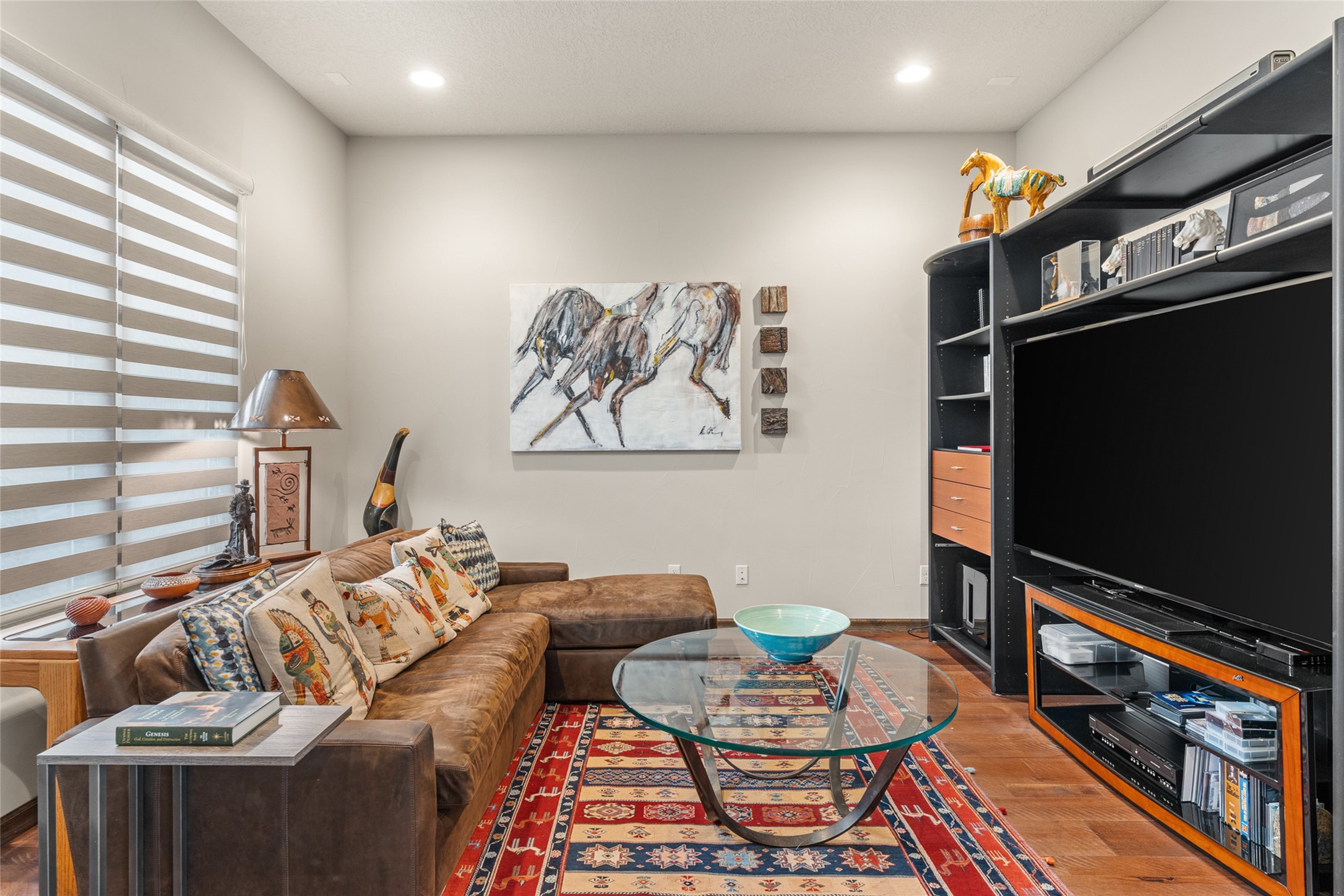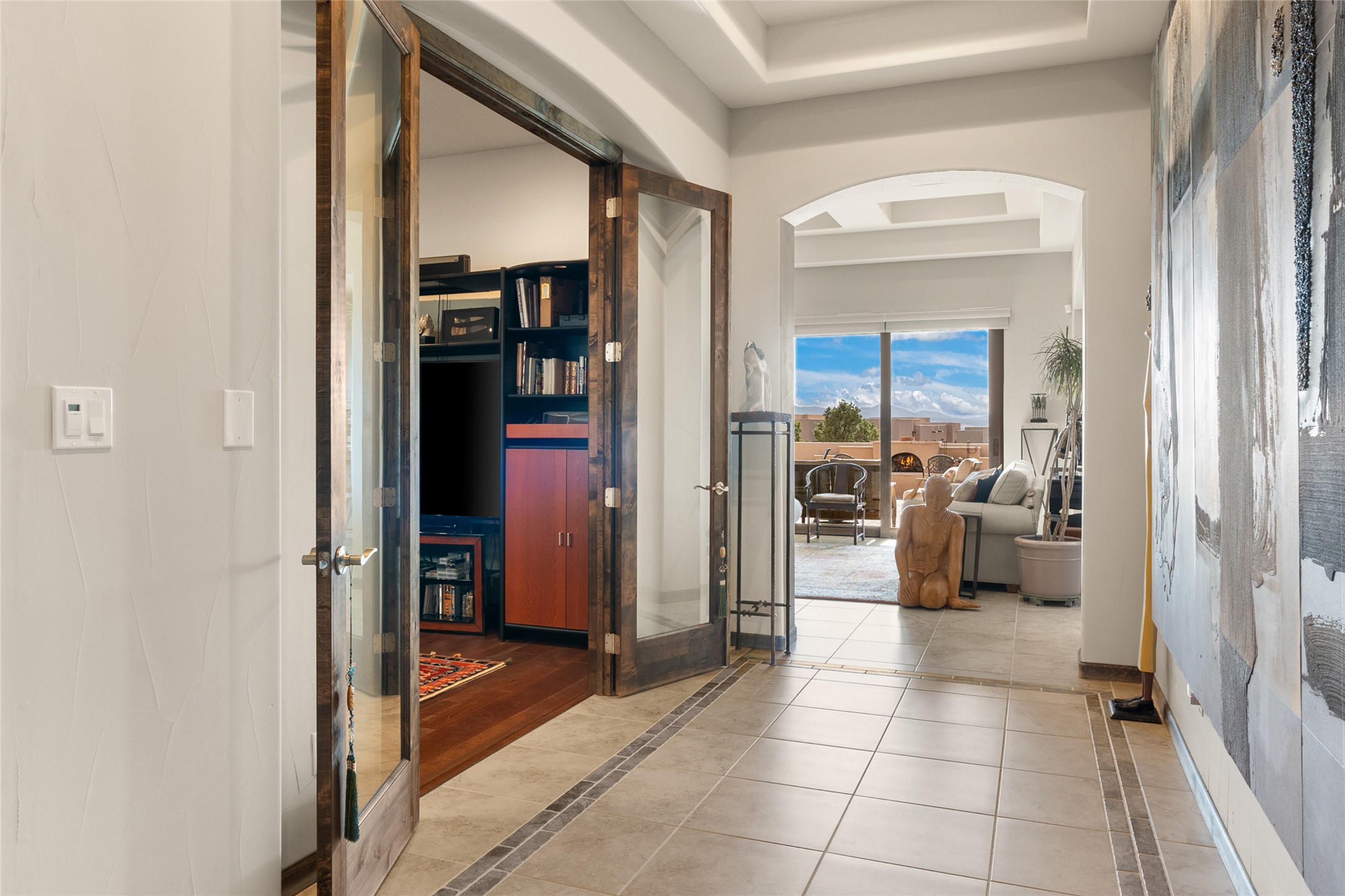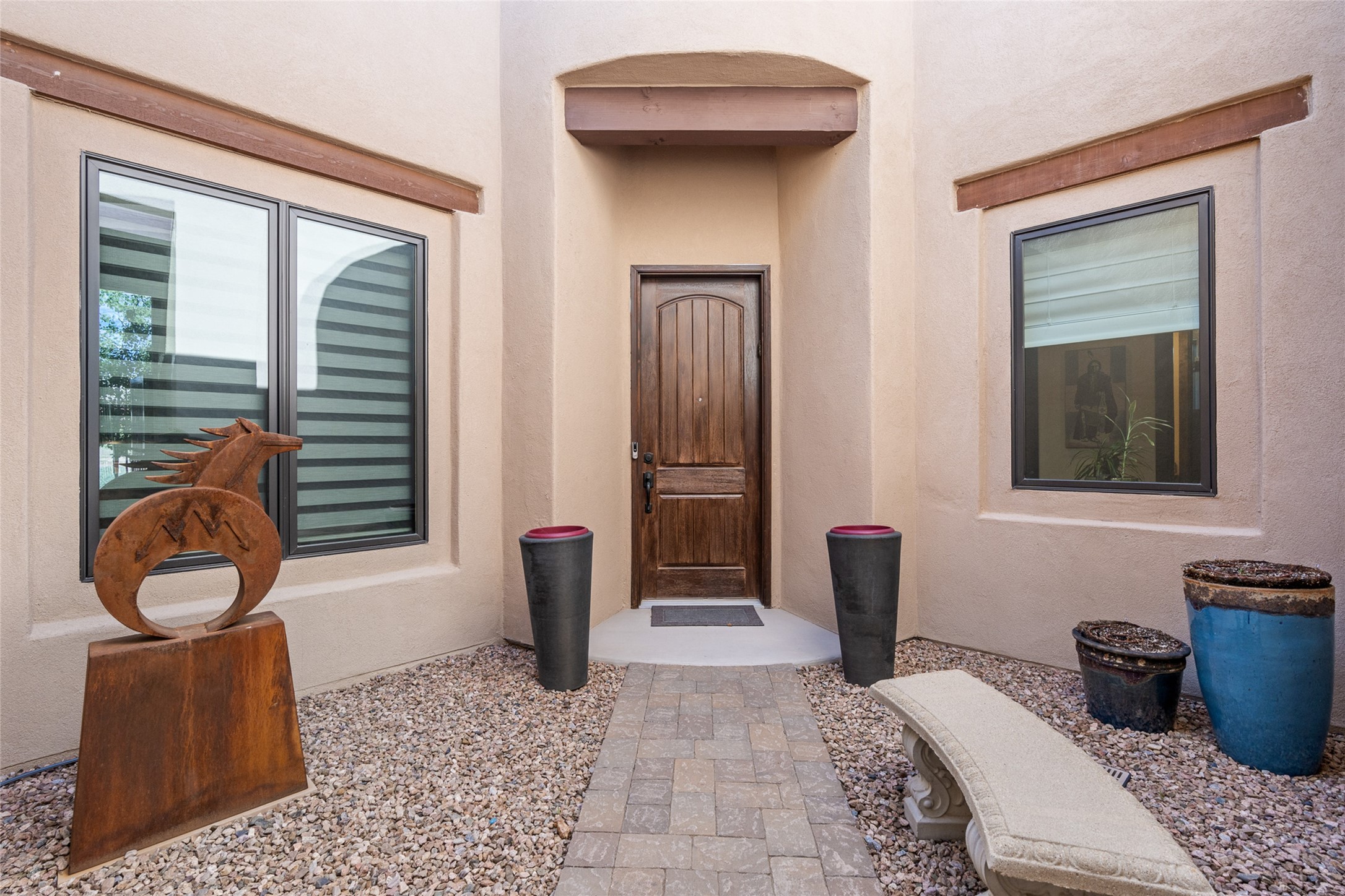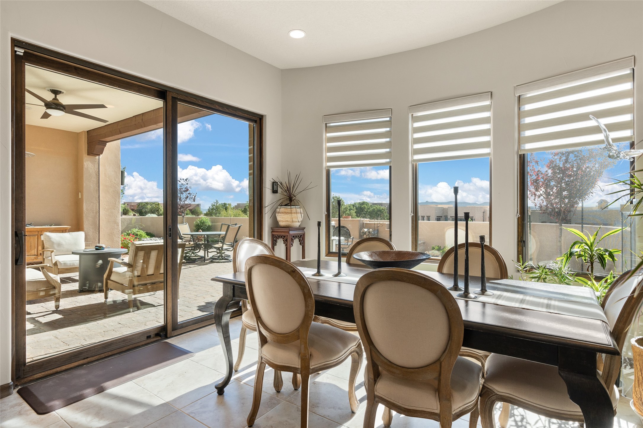 Ravishing sunsets & Jemez Mountain vistas from this stunning four-bedroom Las Campanas residence in the Las Terrazas enclave. The open concept design features a spacious living room with soaring 12' ceiling and a linear gas fireplace, and a lovely separate dining area. An excellent chef's kitchen is anchored by a huge island with breakfast bar. Kitchen countertops are a rich leathered granite, and the deep walk-in pantry offers superb storage. The split floor plan provides the outstanding primary suite blissful privacy & exquisite views. A separate guest wing boasts two bedrooms - one currently used as an office - plus a divine suite with private sitting room & bath. Tall French doors open to the handsome media room/study with entertainment center accessed off the dramatic entry hallway. The enchanting walled terrace with its wood-burning fireplace and care-free landscaped gardens on drip irrigation, is ideal for al fresco dining, entertaining and quiet relaxation. Its deep living/dining portal includes a remote screen for ease of use. Other significant improvements and upgrades include custom window treatments throughout, remote living room shades, custom fitted closets, whole house on-demand hot water, and upscale wall finishes throughout. The direct entry three-car garage has a wall to enable one bay to be used as a studio, gym, etc. if desired. This impeccable home is conveniently located near the Las Campanas Clubhouse & Spa. Through the HOA, homeowners enjoy 24-hour security, (both gate and roving patrol), 24-hour paramedics, front & side yard landscape maintenance, and vacation watch when away. Purchase of Membership to The Club is required to use Las Campanas amenities, including Club restaurants, fitness center, pools, beauty treatments, tennis, pickle ball and horse facilities. Information for Club golf membership application for use of the two Jack Nicklaus Signature courses may be obtained from Isabel Chavarria, Director of Membership Development.