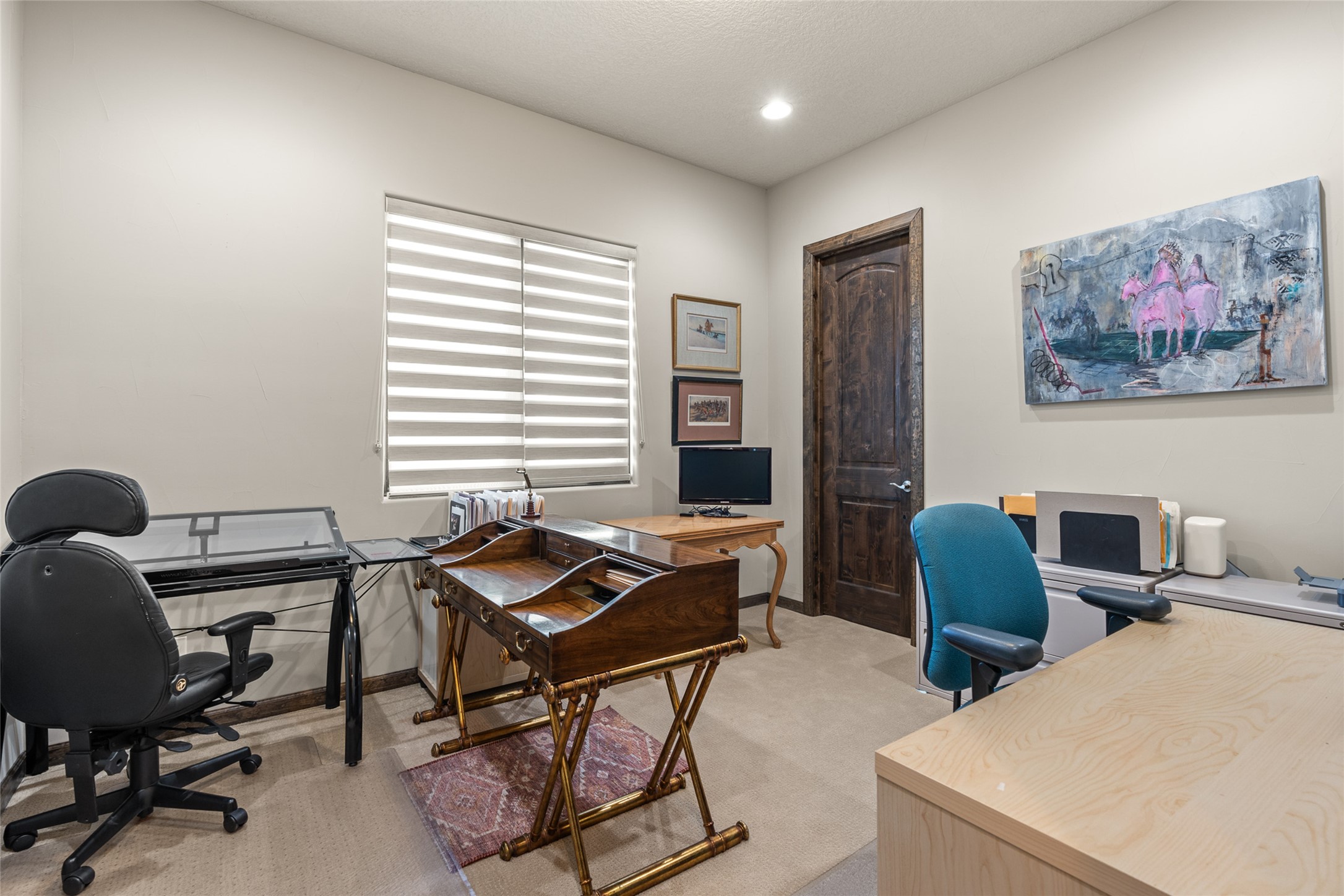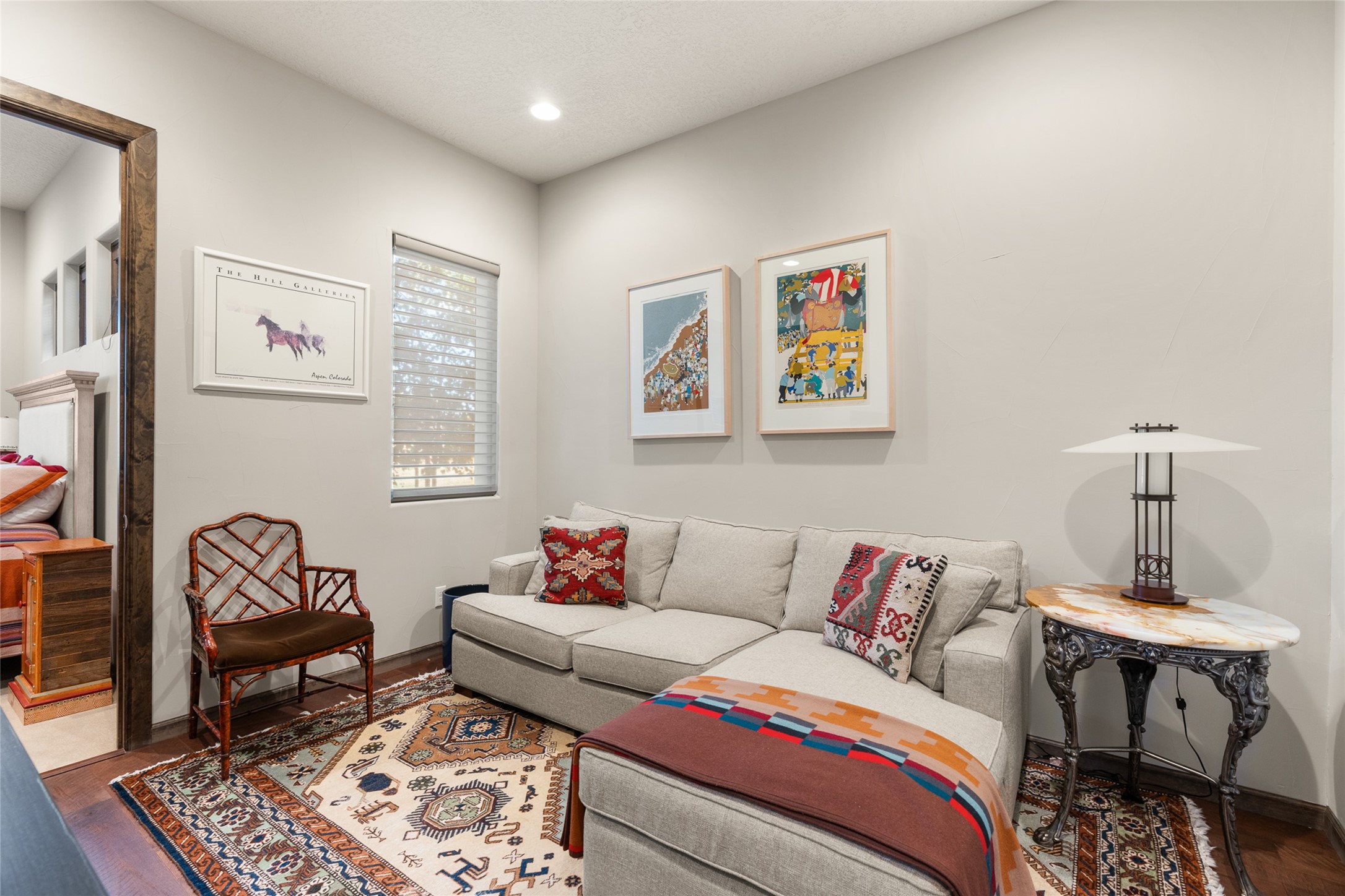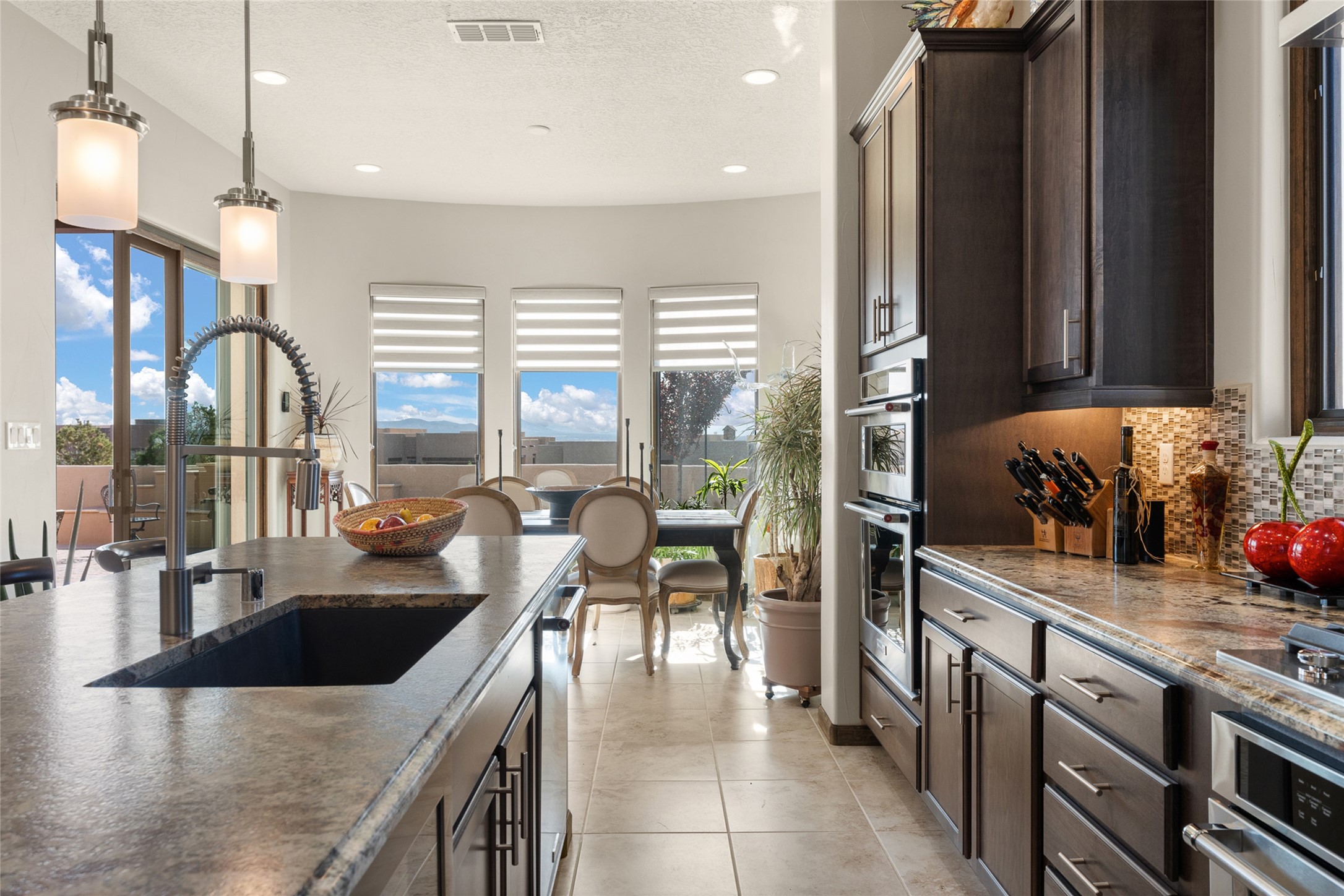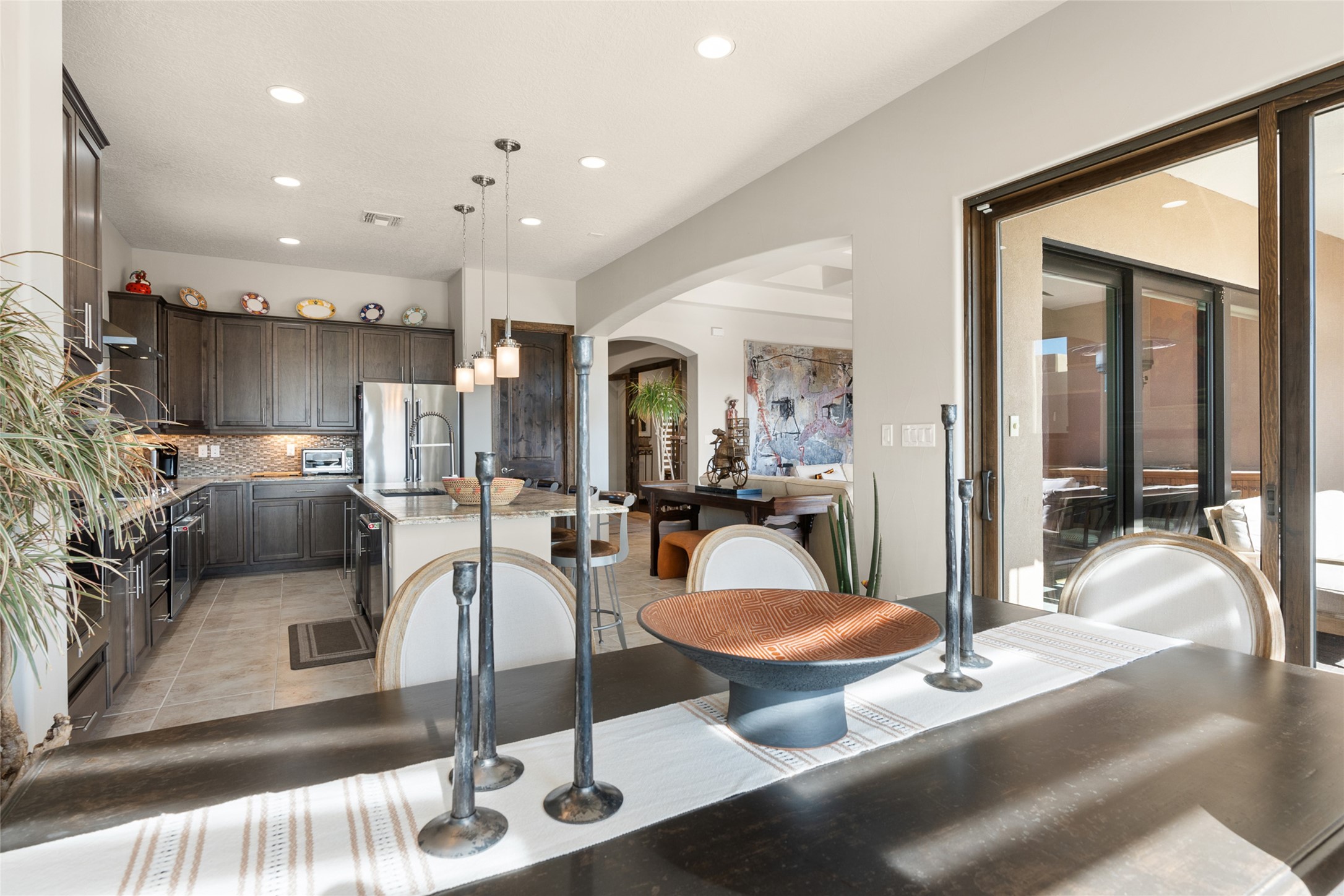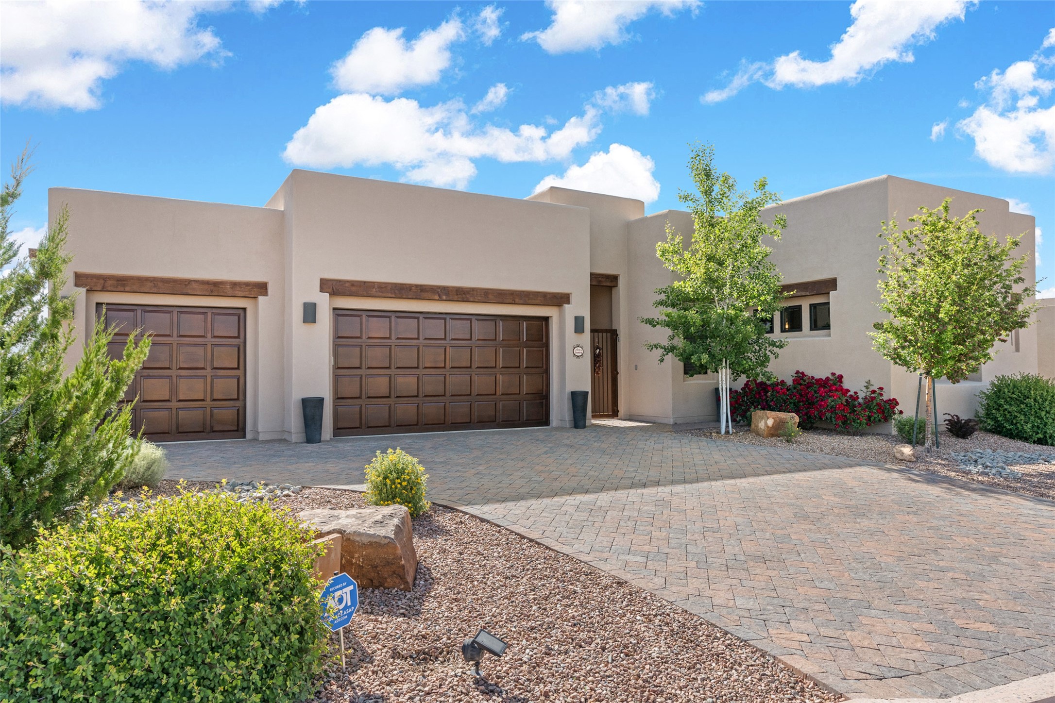 Ravishing sunsets & Jemez Mountain vistas from this stunning four-bedroom Las Campanas residence in the Las Terrazas enclave. The open concept design features a spacious living room with soaring 12' ceiling and a linear gas fireplace, and a lovely separate dining area. An excellent chef's kitchen is anchored by a huge island with breakfast bar. Kitchen countertops are a rich leathered granite, and the deep walk-in pantry offers superb storage. The split floor plan provides the outstanding primary suite blissful privacy & exquisite views. A separate guest wing boasts two bedrooms - one currently used as an office - plus a divine suite with private sitting room & bath. Tall French doors open to the handsome media room/study with entertainment center accessed off the dramatic entry hallway. The enchanting walled terrace with its wood-burning fireplace and care-free landscaped gardens on drip irrigation, is ideal for al fresco dining, entertaining and quiet relaxation. Its deep living/dining portal includes a remote screen for ease of use. Other significant improvements and upgrades include custom window treatments throughout, remote living room shades, custom fitted closets, whole house on-demand hot water, and upscale wall finishes throughout. The direct entry three-car garage has a wall to enable one bay to be used as a studio, gym, etc. if desired. This impeccable home is conveniently located near the Las Campanas Clubhouse & Spa. Through the HOA, homeowners enjoy 24-hour security, (both gate and roving patrol), 24-hour paramedics, front & side yard landscape maintenance, and vacation watch when away. Purchase of Membership to The Club is required to use Las Campanas amenities, including Club restaurants, fitness center, pools, beauty treatments, tennis, pickle ball and horse facilities. Information for Club golf membership application for use of the two Jack Nicklaus Signature courses may be obtained from Isabel Chavarria, Director of Membership Development.