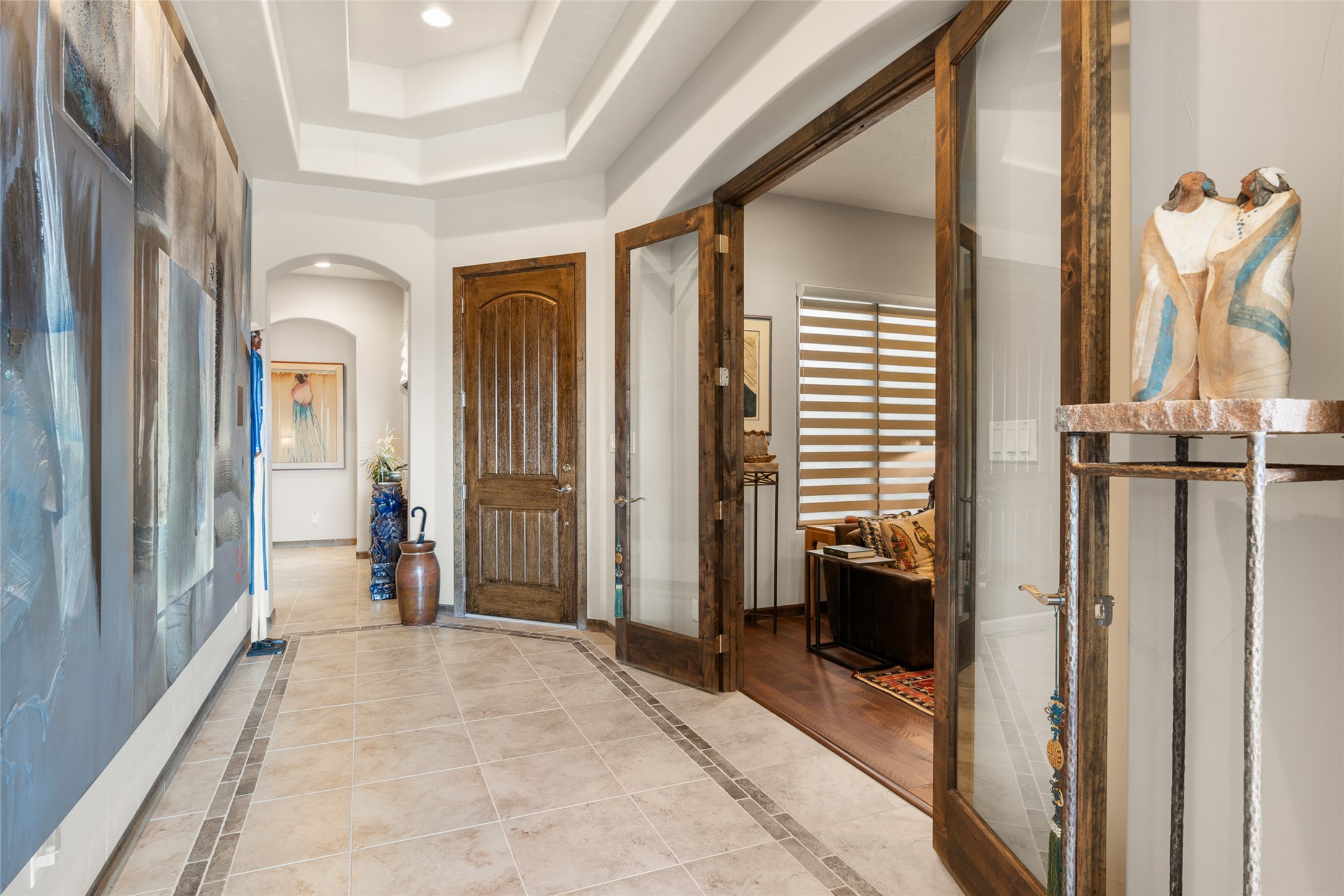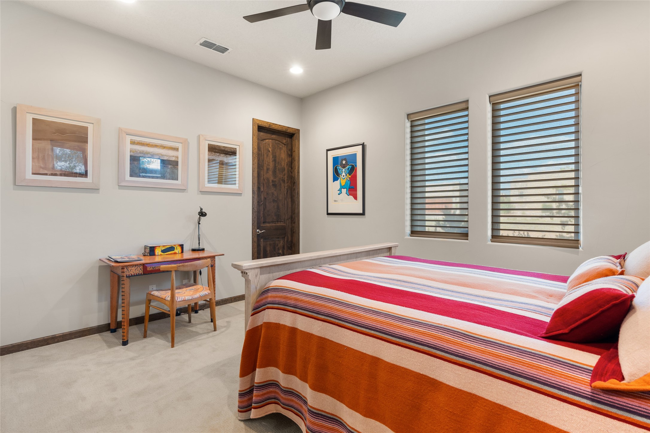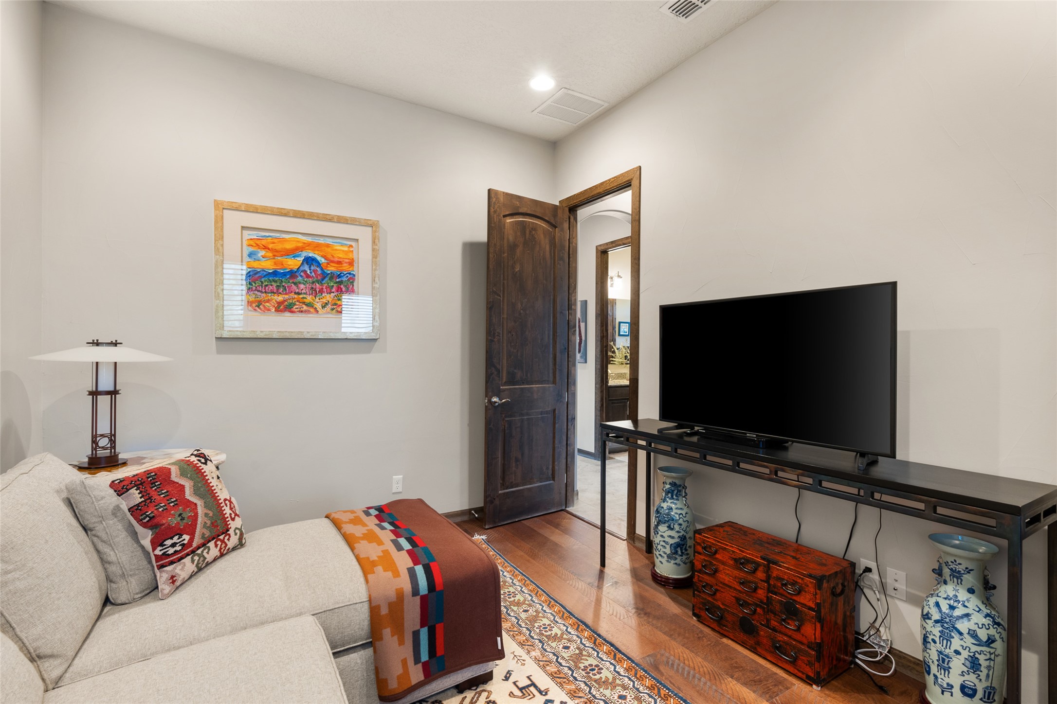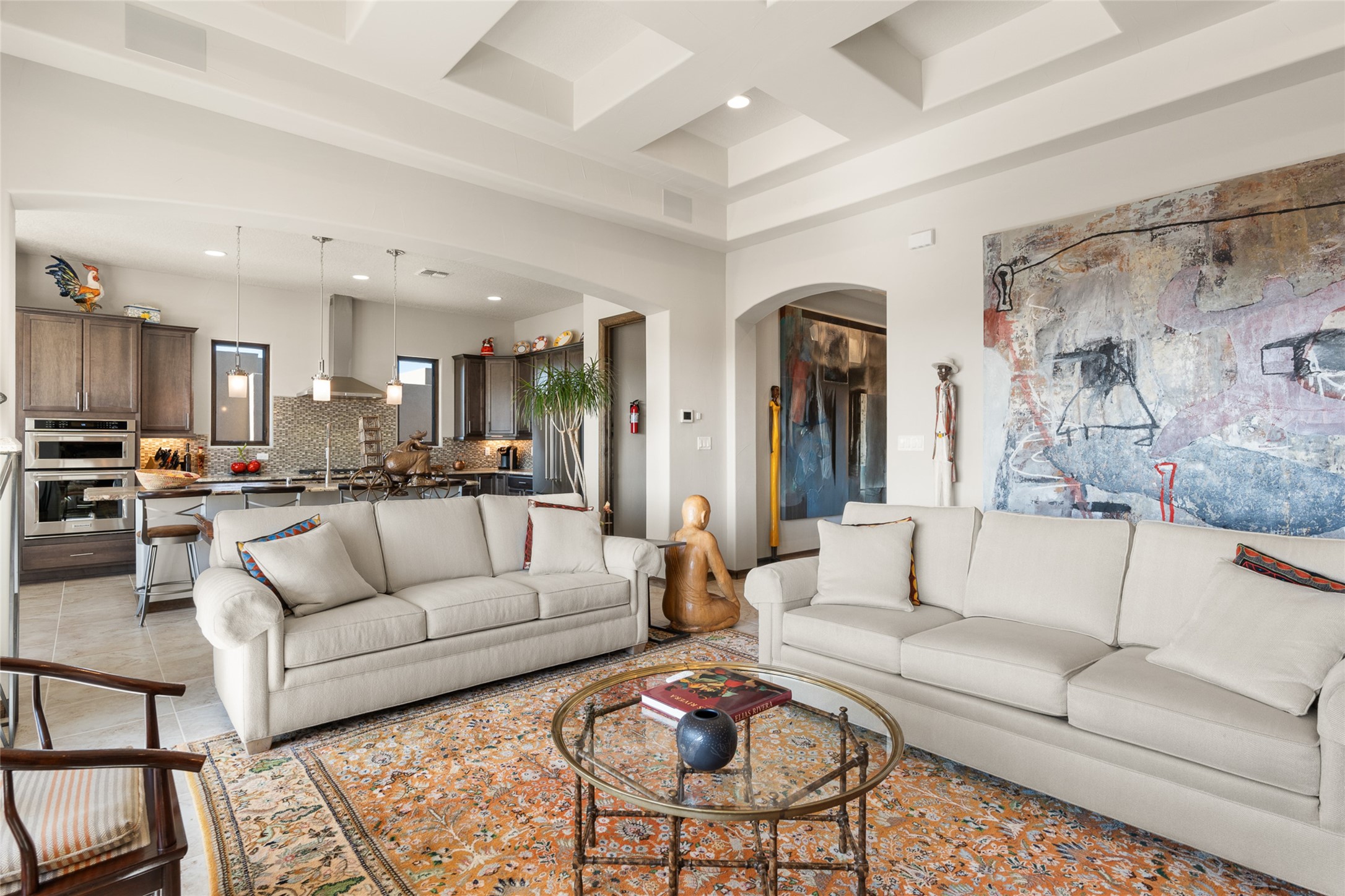 Ravishing sunsets & Jemez Mountain vistas from this stunning four-bedroom Las Campanas residence in the Las Terrazas enclave. The open concept design features a spacious living room with soaring 12' ceiling and a linear gas fireplace, and a lovely separate dining area. An excellent chef's kitchen is anchored by a huge island with breakfast bar. Kitchen countertops are a rich leathered granite, and the deep walk-in pantry offers superb storage. The split floor plan provides the outstanding primary suite blissful privacy & exquisite views. A separate guest wing boasts two bedrooms - one currently used as an office - plus a divine suite with private sitting room & bath. Tall French doors open to the handsome media room/study with entertainment center accessed off the dramatic entry hallway. The enchanting walled terrace with its wood-burning fireplace and care-free landscaped gardens on drip irrigation, is ideal for al fresco dining, entertaining and quiet relaxation. Its deep living/dining portal includes a remote screen for ease of use. Other significant improvements and upgrades include custom window treatments throughout, remote living room shades, custom fitted closets, whole house on-demand hot water, and upscale wall finishes throughout. The direct entry three-car garage has a wall to enable one bay to be used as a studio, gym, etc. if desired. This impeccable home is conveniently located near the Las Campanas Clubhouse & Spa. Through the HOA, homeowners enjoy 24-hour security, (both gate and roving patrol), 24-hour paramedics, front & side yard landscape maintenance, and vacation watch when away. Purchase of Membership to The Club is required to use Las Campanas amenities, including Club restaurants, fitness center, pools, beauty treatments, tennis, pickle ball and horse facilities. Information for Club golf membership application for use of the two Jack Nicklaus Signature courses may be obtained from Isabel Chavarria, Director of Membership Development.
