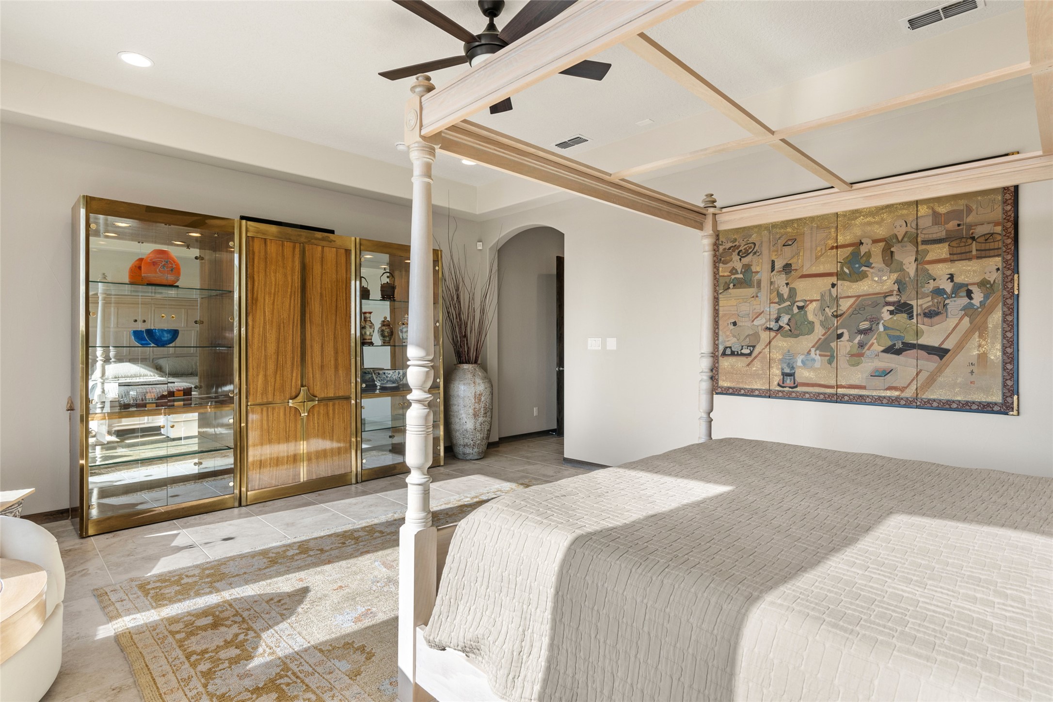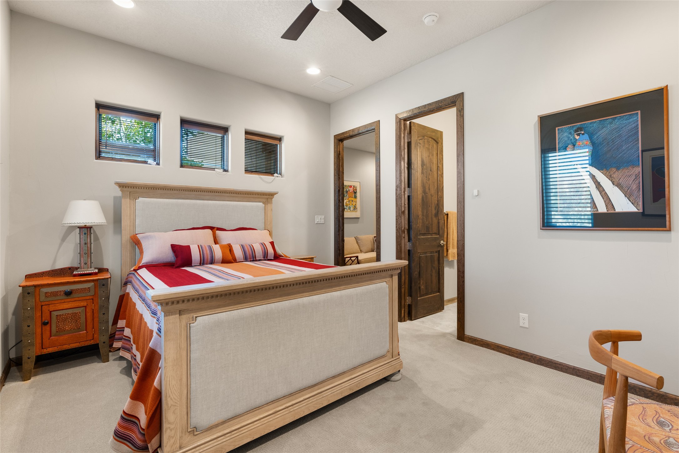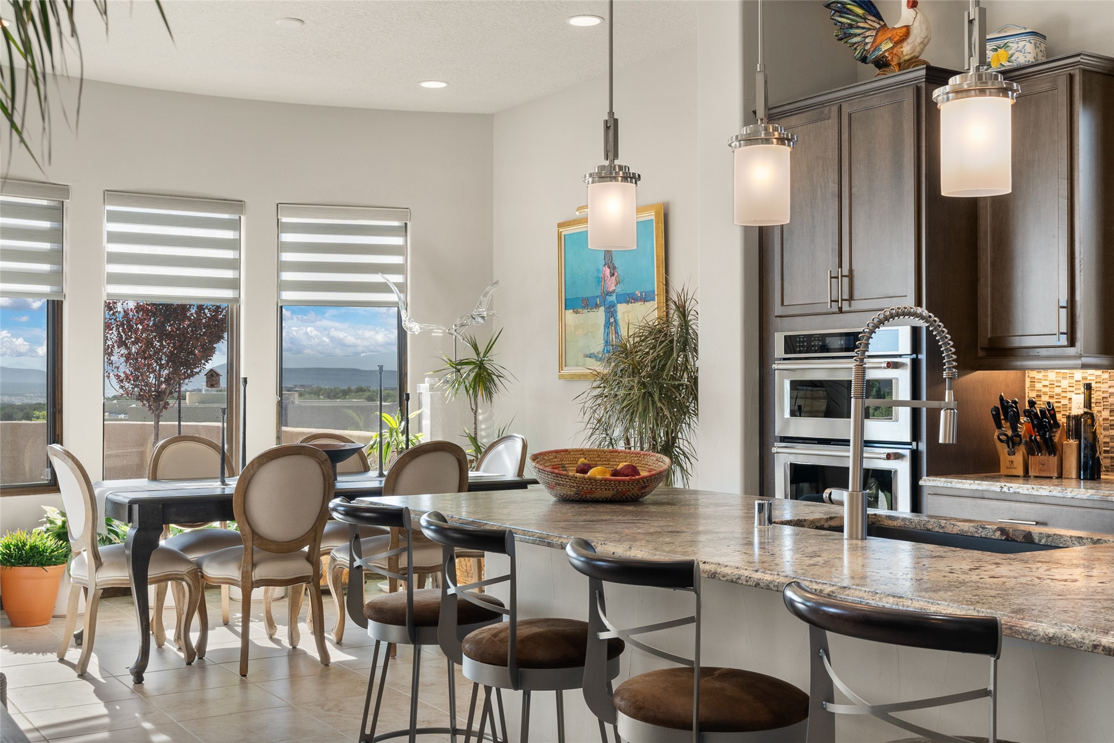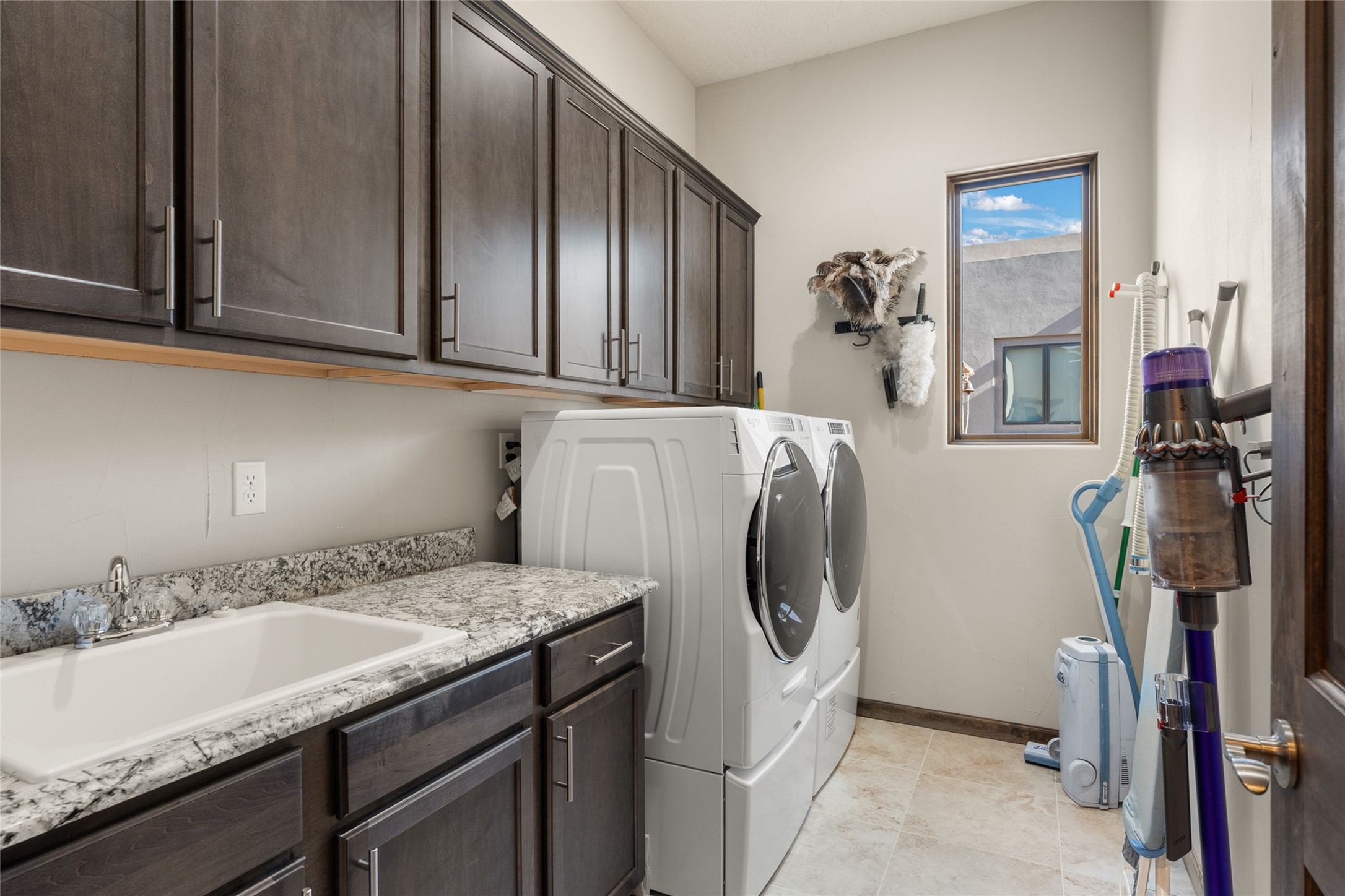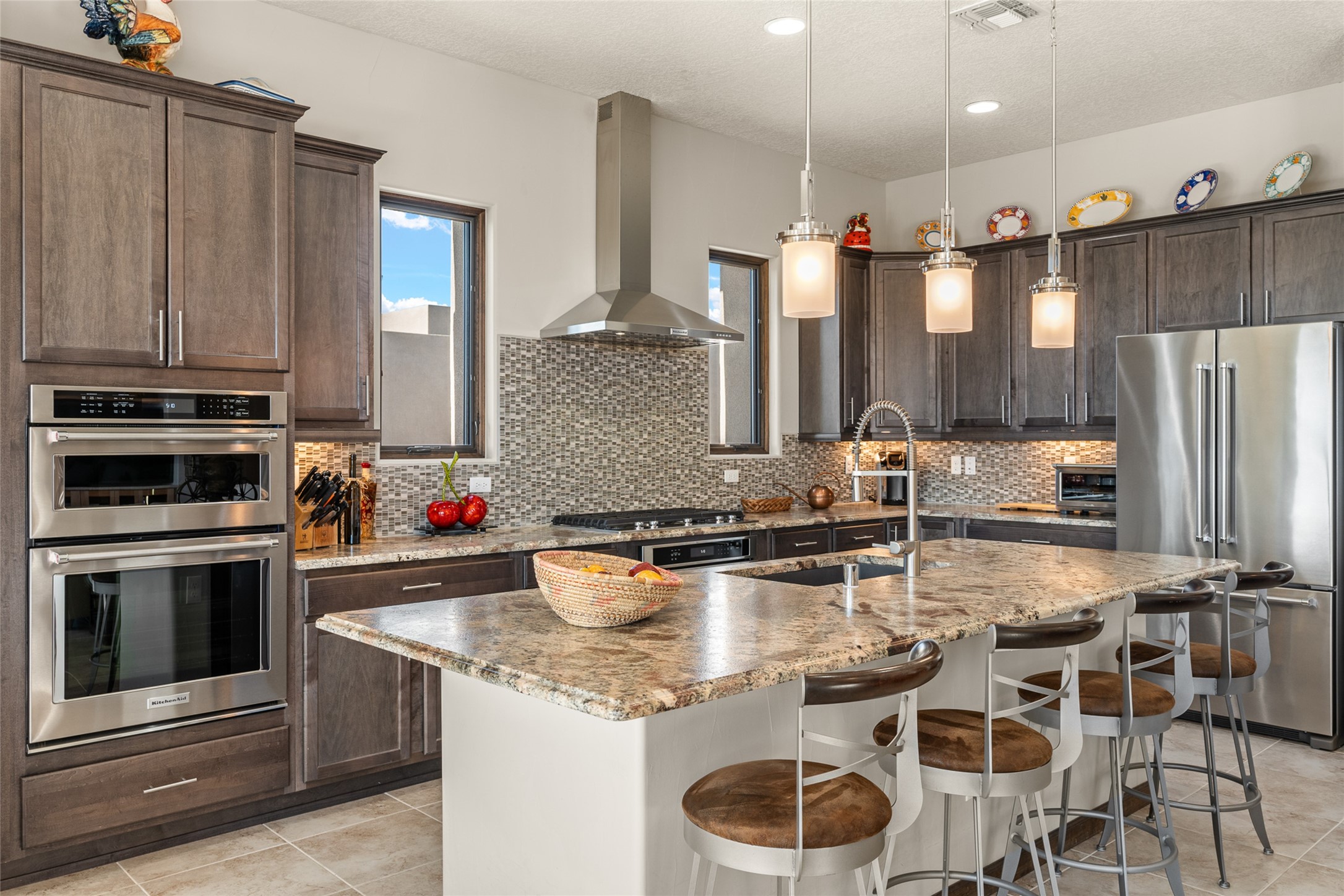 Ravishing sunsets & Jemez Mountain vistas from this stunning four-bedroom Las Campanas residence in the Las Terrazas enclave. The open concept design features a spacious living room with soaring 12' ceiling and a linear gas fireplace, and a lovely separate dining area. An excellent chef's kitchen is anchored by a huge island with breakfast bar. Kitchen countertops are a rich leathered granite, and the deep walk-in pantry offers superb storage. The split floor plan provides the outstanding primary suite blissful privacy & exquisite views. A separate guest wing boasts two bedrooms - one currently used as an office - plus a divine suite with private sitting room & bath. Tall French doors open to the handsome media room/study with entertainment center accessed off the dramatic entry hallway. The enchanting walled terrace with its wood-burning fireplace and care-free landscaped gardens on drip irrigation, is ideal for al fresco dining, entertaining and quiet relaxation. Its deep living/dining portal includes a remote screen for ease of use. Other significant improvements and upgrades include custom window treatments throughout, remote living room shades, custom fitted closets, whole house on-demand hot water, and upscale wall finishes throughout. The direct entry three-car garage has a wall to enable one bay to be used as a studio, gym, etc. if desired. This impeccable home is conveniently located near the Las Campanas Clubhouse & Spa. Through the HOA, homeowners enjoy 24-hour security, (both gate and roving patrol), 24-hour paramedics, front & side yard landscape maintenance, and vacation watch when away. Purchase of Membership to The Club is required to use Las Campanas amenities, including Club restaurants, fitness center, pools, beauty treatments, tennis, pickle ball and horse facilities. Information for Club golf membership application for use of the two Jack Nicklaus Signature courses may be obtained from Isabel Chavarria, Director of Membership Development.