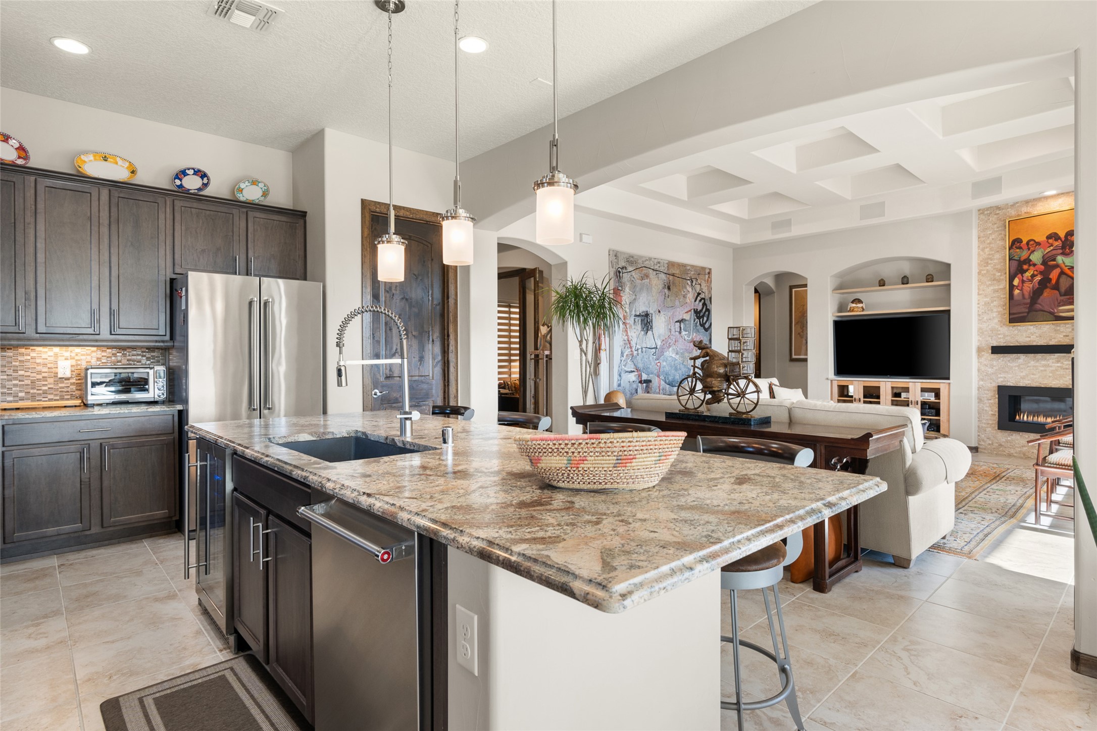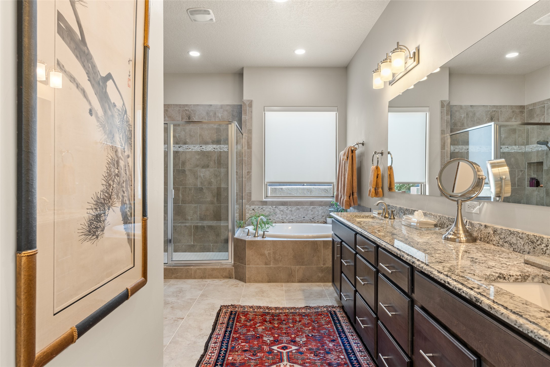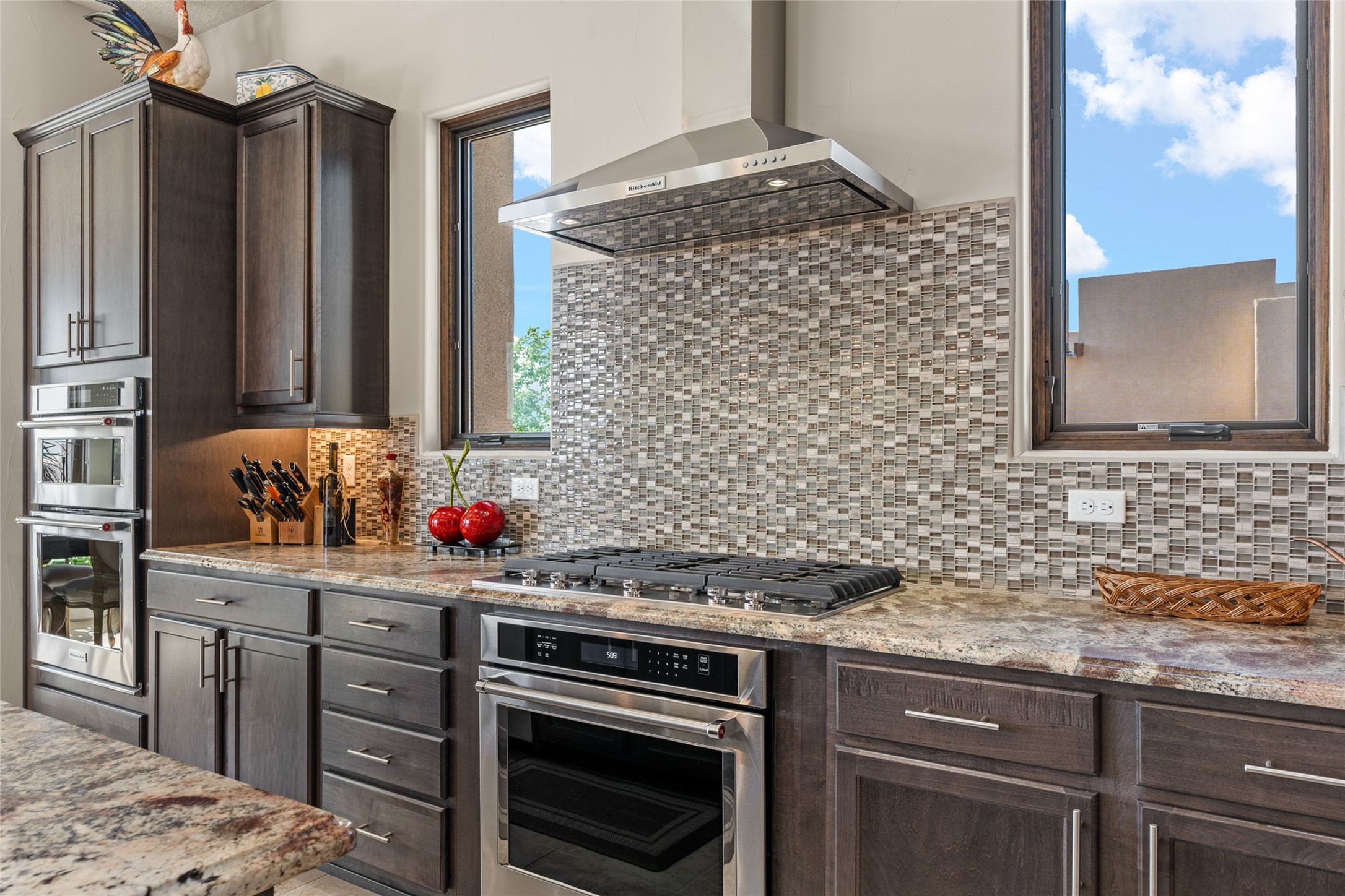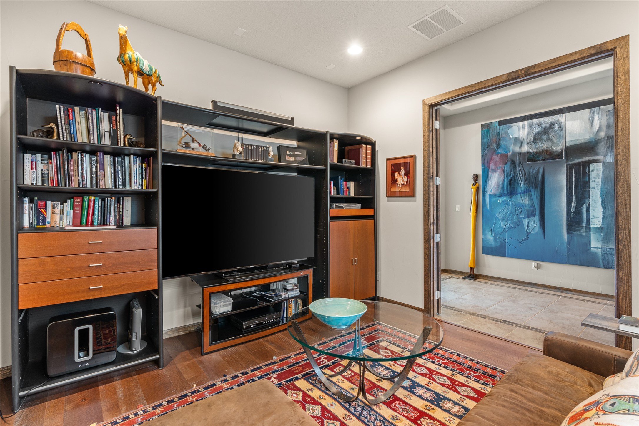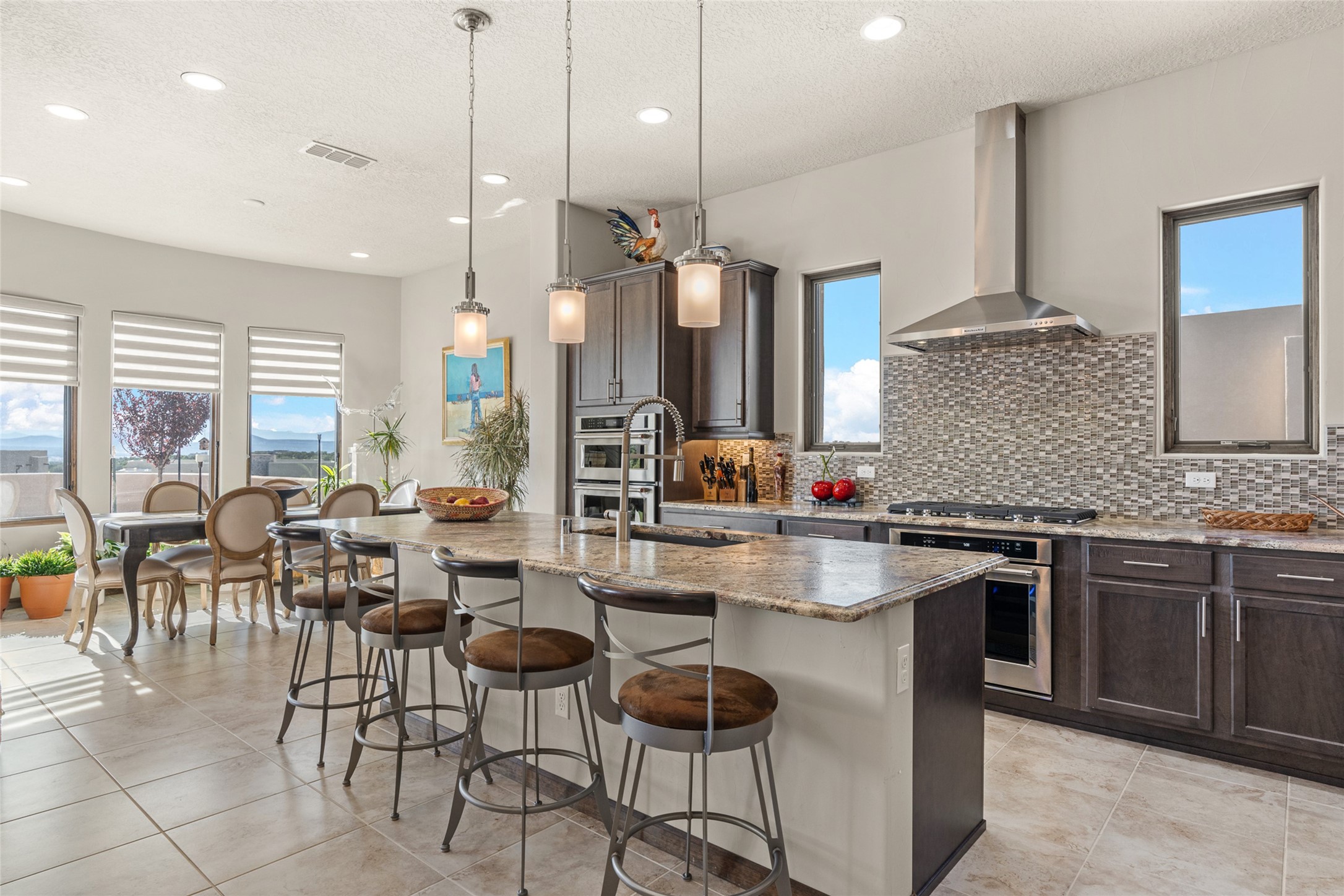 Ravishing sunsets & Jemez Mountain vistas from this stunning four-bedroom Las Campanas residence in the Las Terrazas enclave. The open concept design features a spacious living room with soaring 12' ceiling and a linear gas fireplace, and a lovely separate dining area. An excellent chef's kitchen is anchored by a huge island with breakfast bar. Kitchen countertops are a rich leathered granite, and the deep walk-in pantry offers superb storage. The split floor plan provides the outstanding primary suite blissful privacy & exquisite views. A separate guest wing boasts two bedrooms - one currently used as an office - plus a divine suite with private sitting room & bath. Tall French doors open to the handsome media room/study with entertainment center accessed off the dramatic entry hallway. The enchanting walled terrace with its wood-burning fireplace and care-free landscaped gardens on drip irrigation, is ideal for al fresco dining, entertaining and quiet relaxation. Its deep living/dining portal includes a remote screen for ease of use. Other significant improvements and upgrades include custom window treatments throughout, remote living room shades, custom fitted closets, whole house on-demand hot water, and upscale wall finishes throughout. The direct entry three-car garage has a wall to enable one bay to be used as a studio, gym, etc. if desired. This impeccable home is conveniently located near the Las Campanas Clubhouse & Spa. Through the HOA, homeowners enjoy 24-hour security, (both gate and roving patrol), 24-hour paramedics, front & side yard landscape maintenance, and vacation watch when away. Purchase of Membership to The Club is required to use Las Campanas amenities, including Club restaurants, fitness center, pools, beauty treatments, tennis, pickle ball and horse facilities. Information for Club golf membership application for use of the two Jack Nicklaus Signature courses may be obtained from Isabel Chavarria, Director of Membership Development.