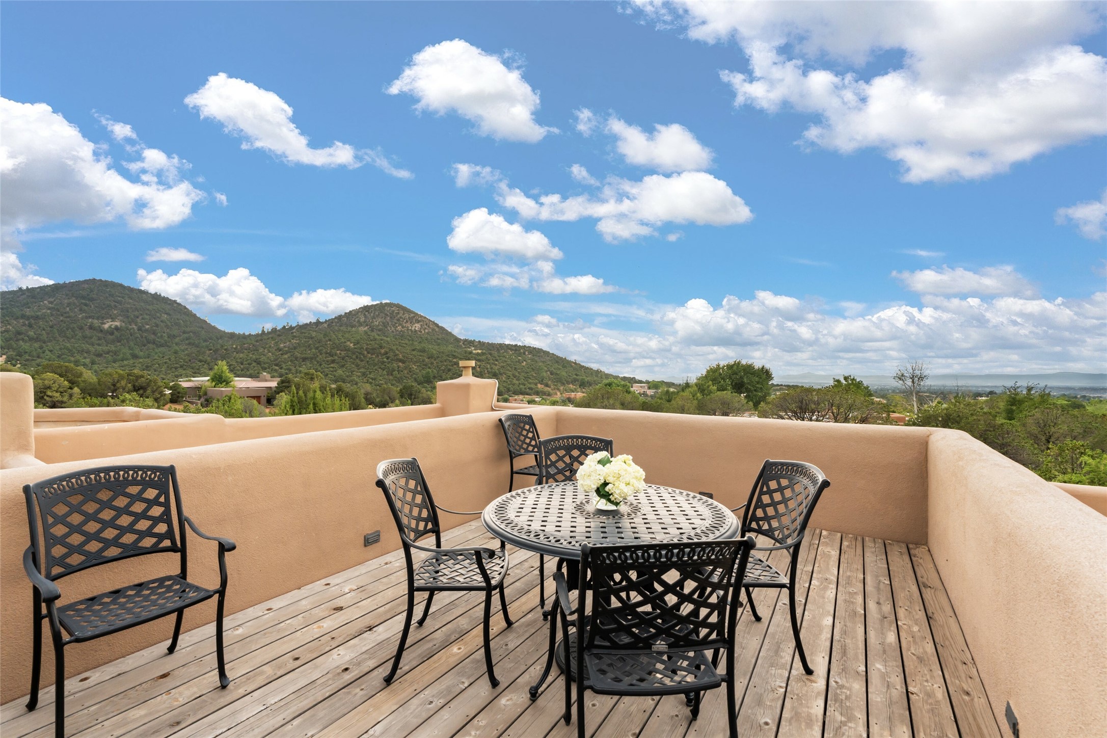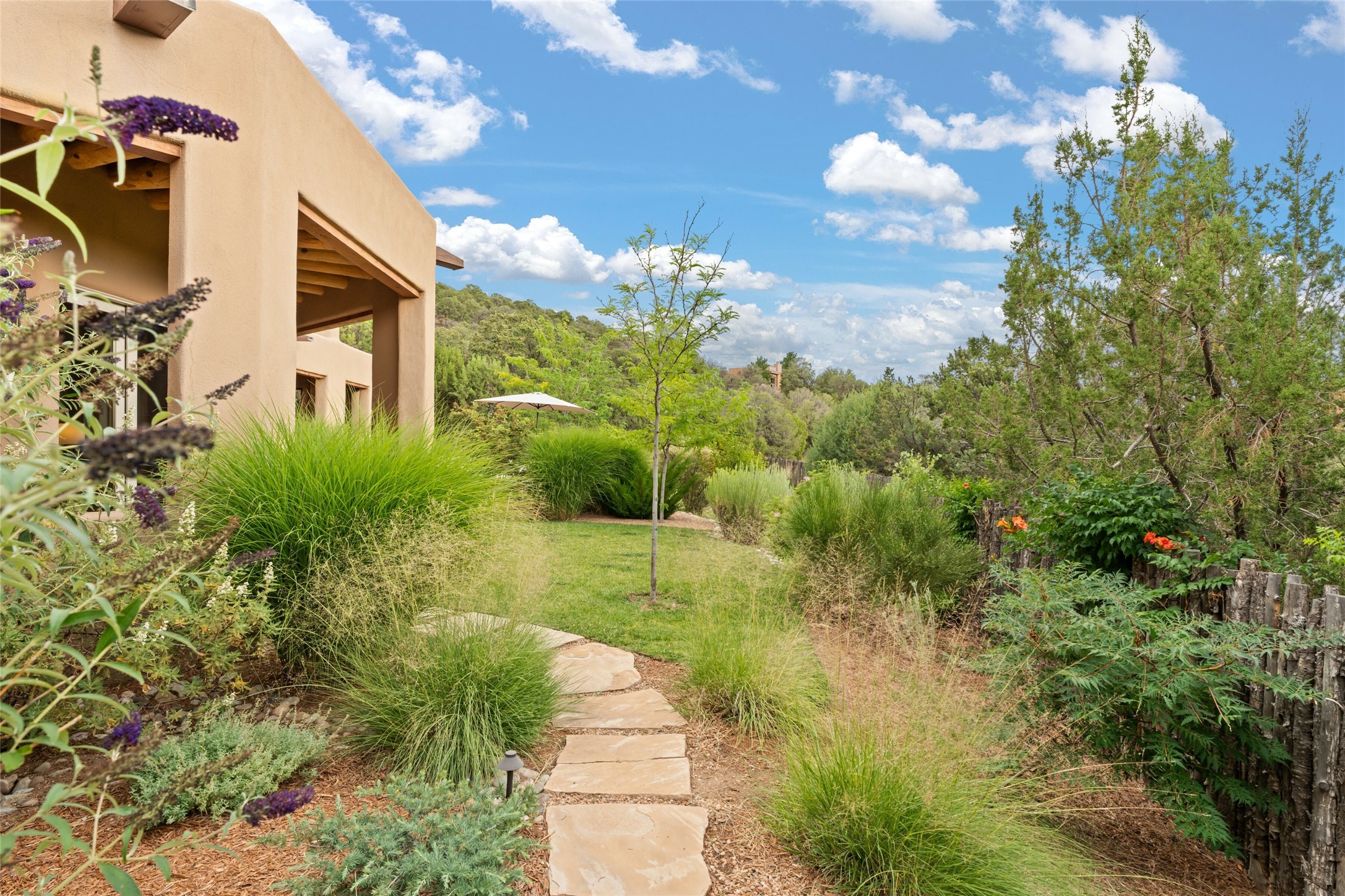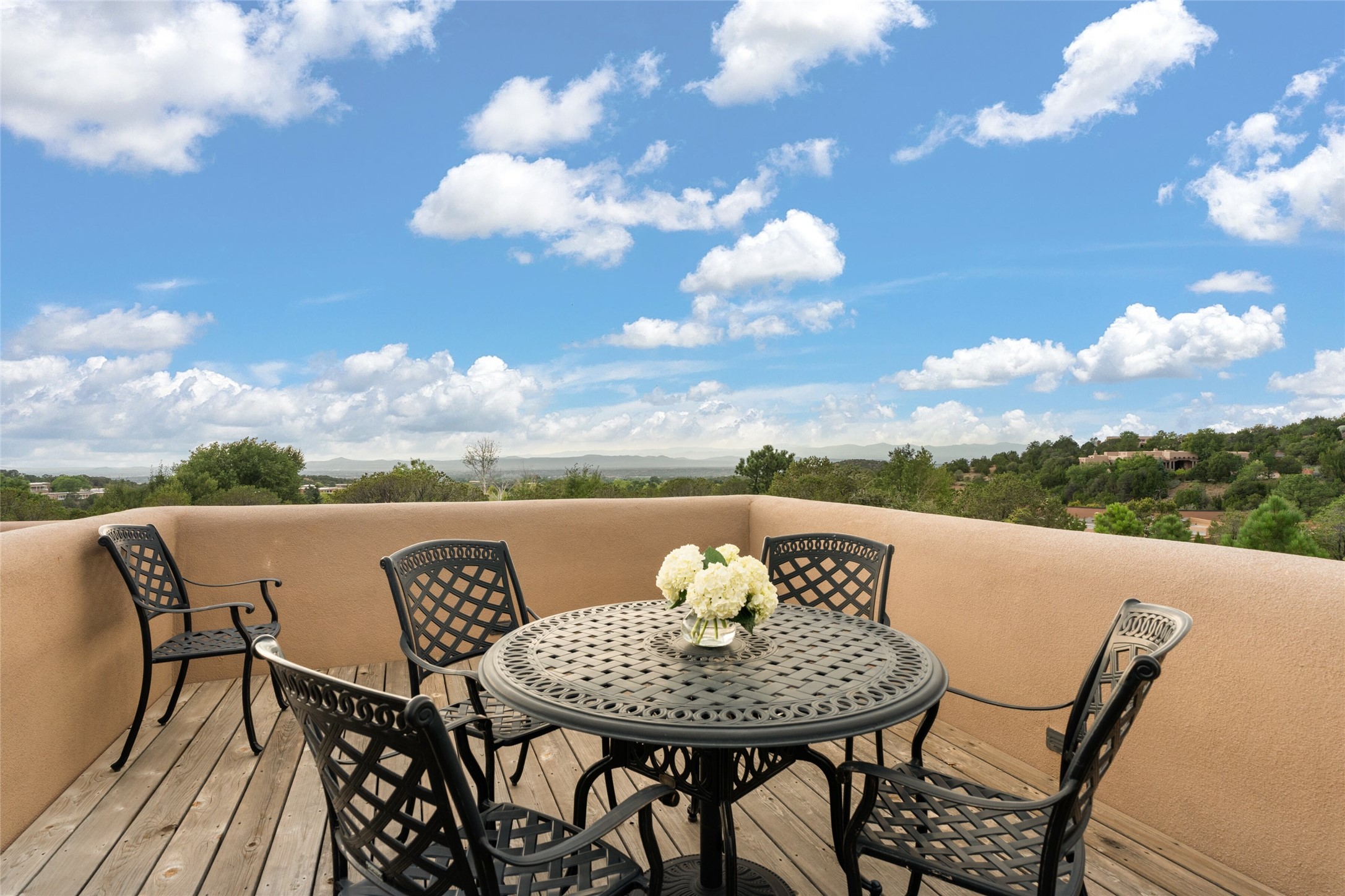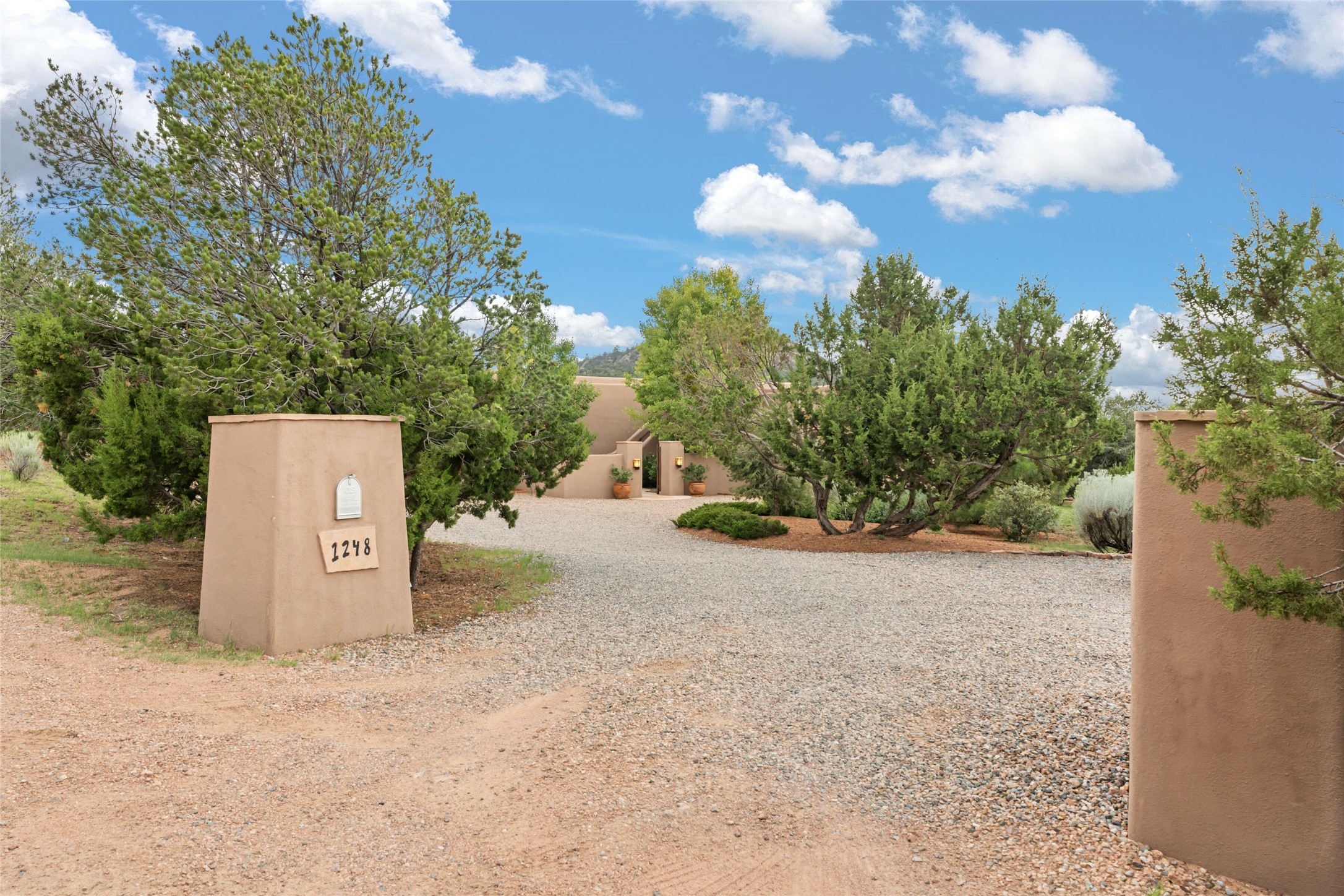 This gorgeous 4-bedroom home in the coveted St. Johns' neighborhood offers views, spacious living, and direct access to trails. The modern pueblo architecture blends harmoniously with the surrounding landscape. Single level living at its best, the home has in-floor radiant heat, AC, a large family room off the kitchen and luxurious outdoor livings spaces including a Kiva fireplace patio and a rooftop Sunset Deck. With direct access to a private patio, the generous primary suite also has a large walk-in closet, Jacuzzi tub and a steam shower. Ideal for a family, the guest wing has a shared sitting / play room and 2 guest bedrooms with ample closet space. There is an additional guest suite near the kitchen with an on-suite bath as well a large closet with a built-in safe. Work from home? The flex room is just the ticket for a home office, work-out room or artist's studio and even has a utility sink! If 4700 SF isn't enough, the 1.5 acre lot allows for room to grow or add a casita. This fabulous property has it all: style, ease of living, room for the whole family or artist and is set in one of the most desirable locations in town.