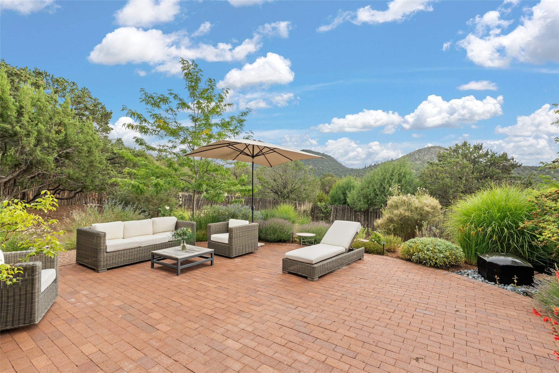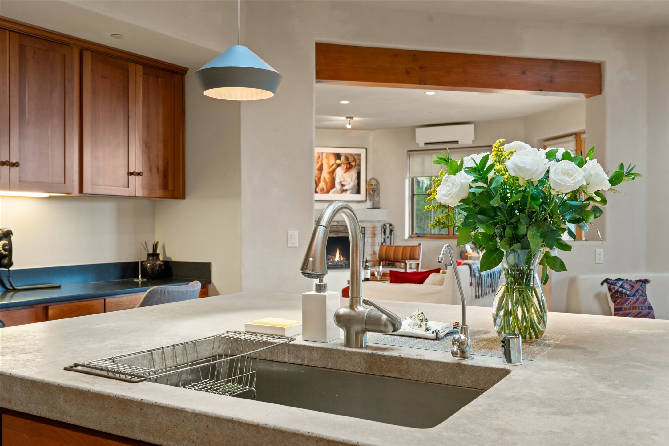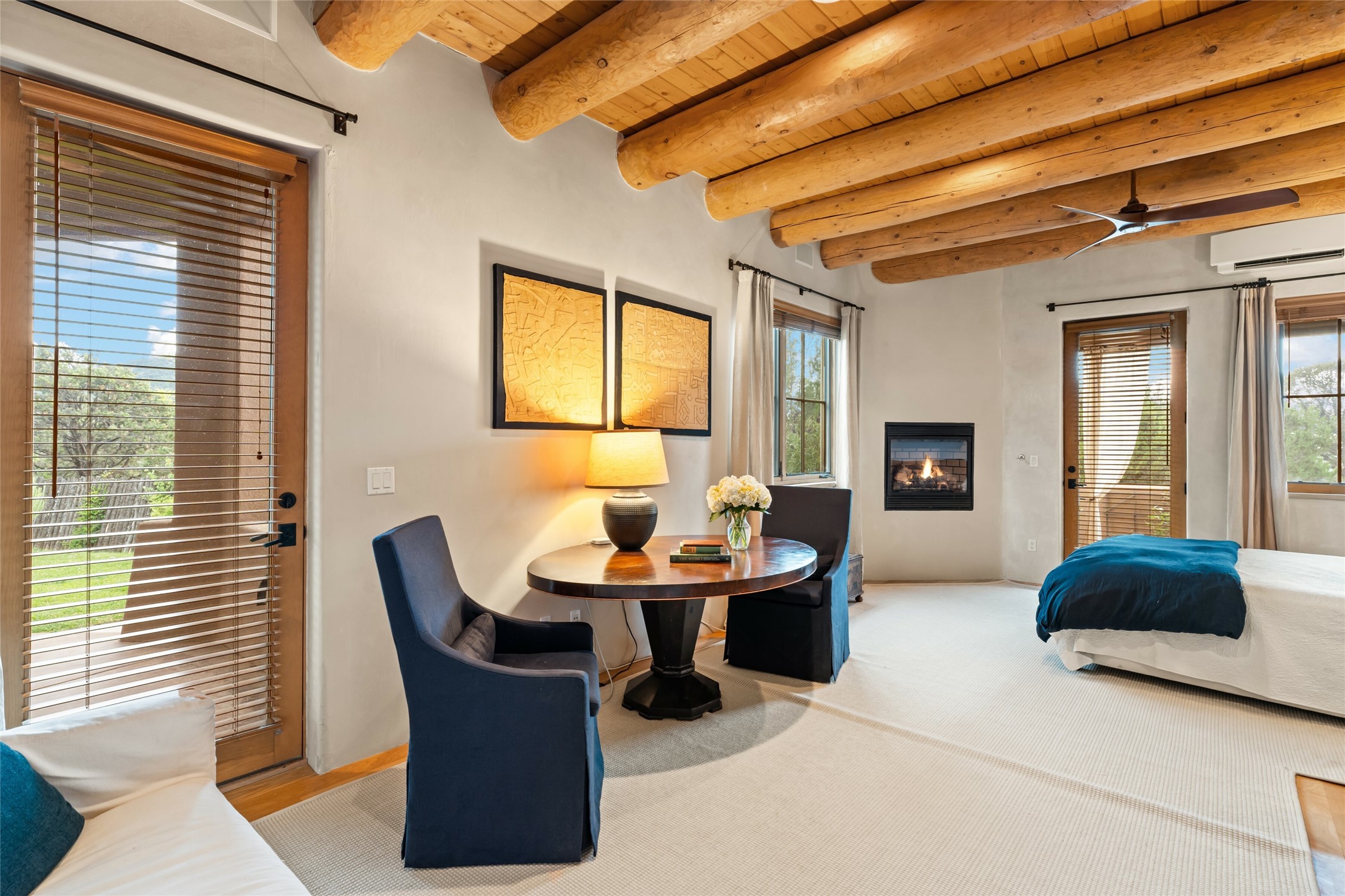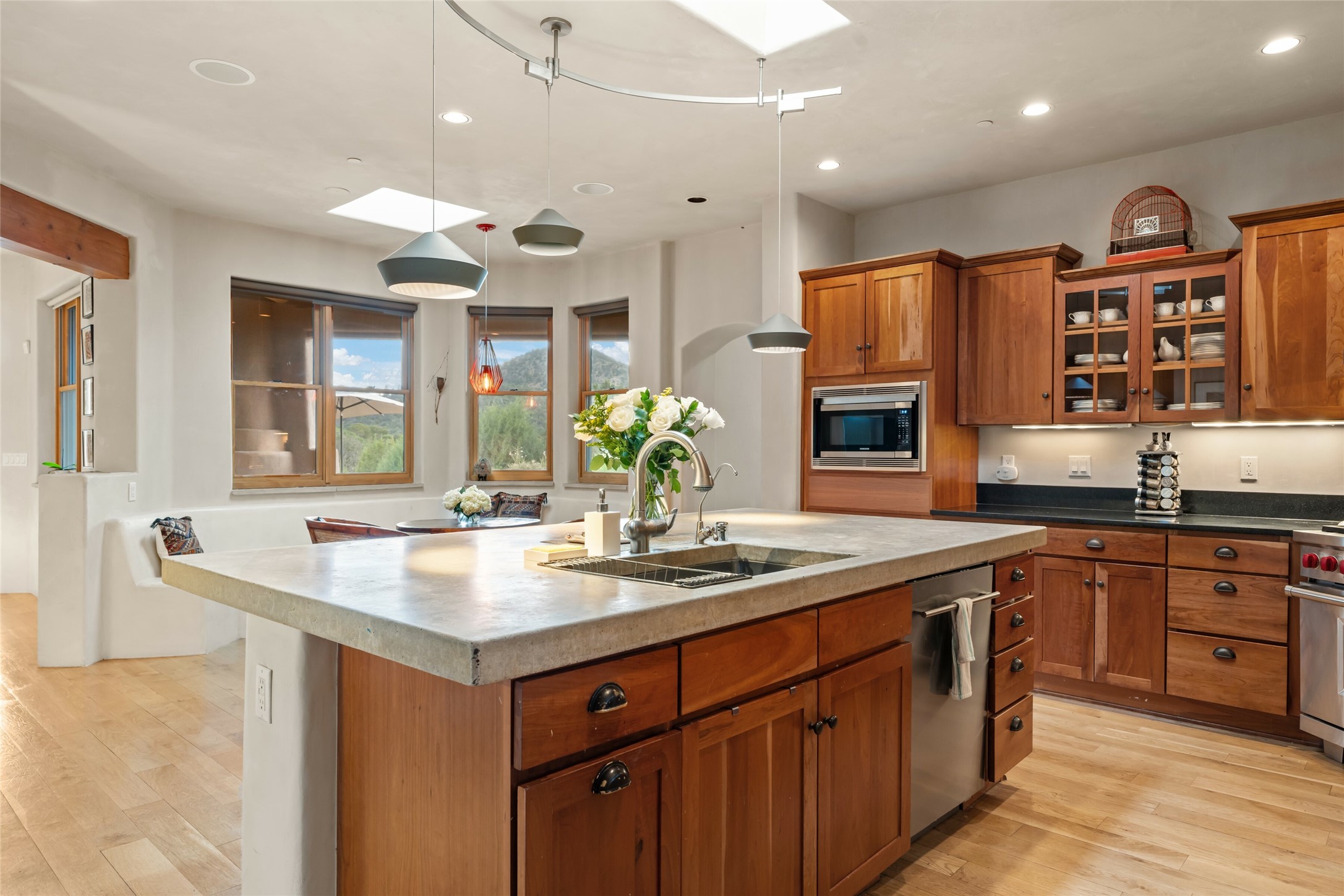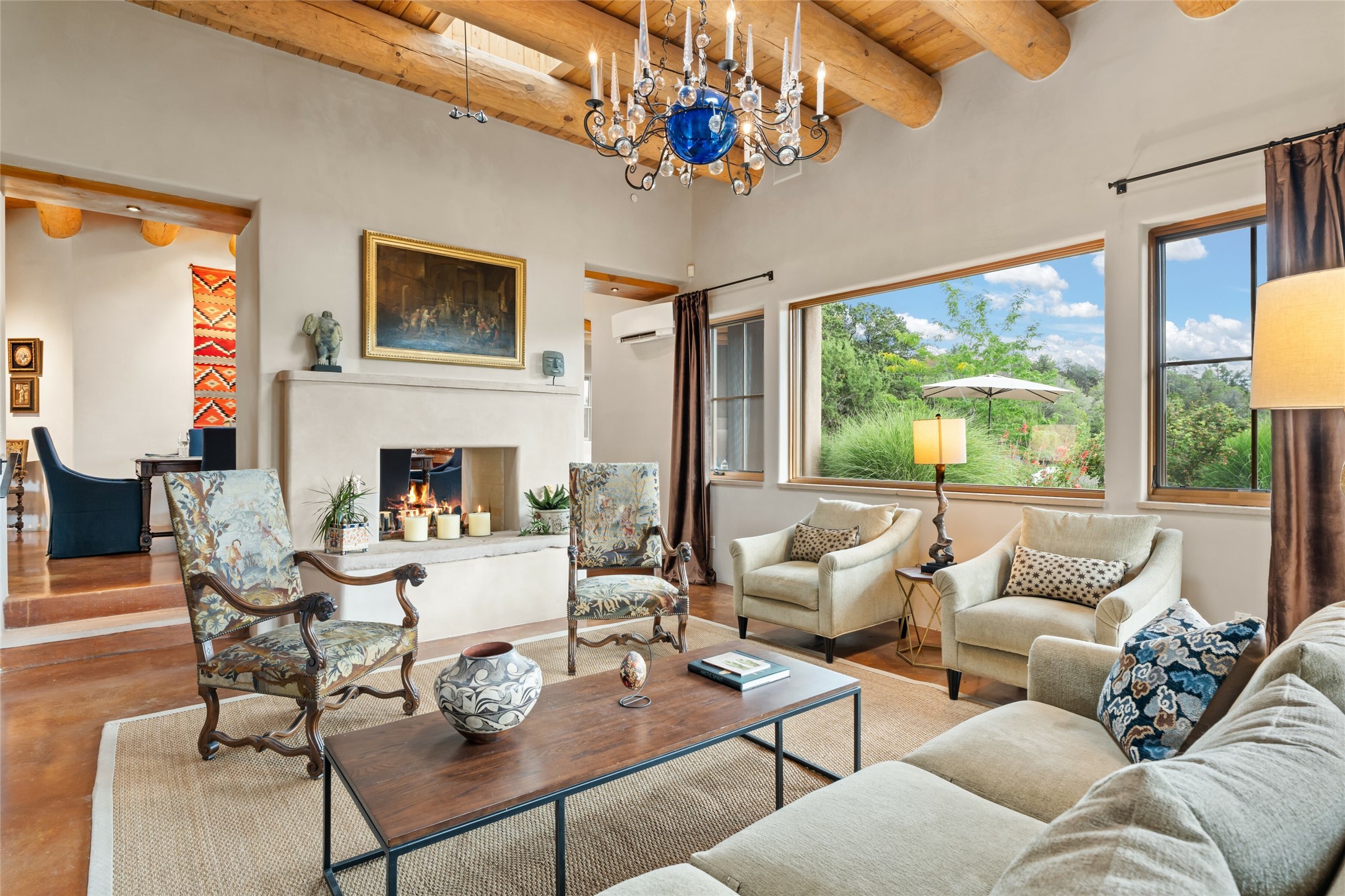 This gorgeous 4-bedroom home in the coveted St. Johns' neighborhood offers views, spacious living, and direct access to trails. The modern pueblo architecture blends harmoniously with the surrounding landscape. Single level living at its best, the home has in-floor radiant heat, AC, a large family room off the kitchen and luxurious outdoor livings spaces including a Kiva fireplace patio and a rooftop Sunset Deck. With direct access to a private patio, the generous primary suite also has a large walk-in closet, Jacuzzi tub and a steam shower. Ideal for a family, the guest wing has a shared sitting / play room and 2 guest bedrooms with ample closet space. There is an additional guest suite near the kitchen with an on-suite bath as well a large closet with a built-in safe. Work from home? The flex room is just the ticket for a home office, work-out room or artist's studio and even has a utility sink! If 4700 SF isn't enough, the 1.5 acre lot allows for room to grow or add a casita. This fabulous property has it all: style, ease of living, room for the whole family or artist and is set in one of the most desirable locations in town.