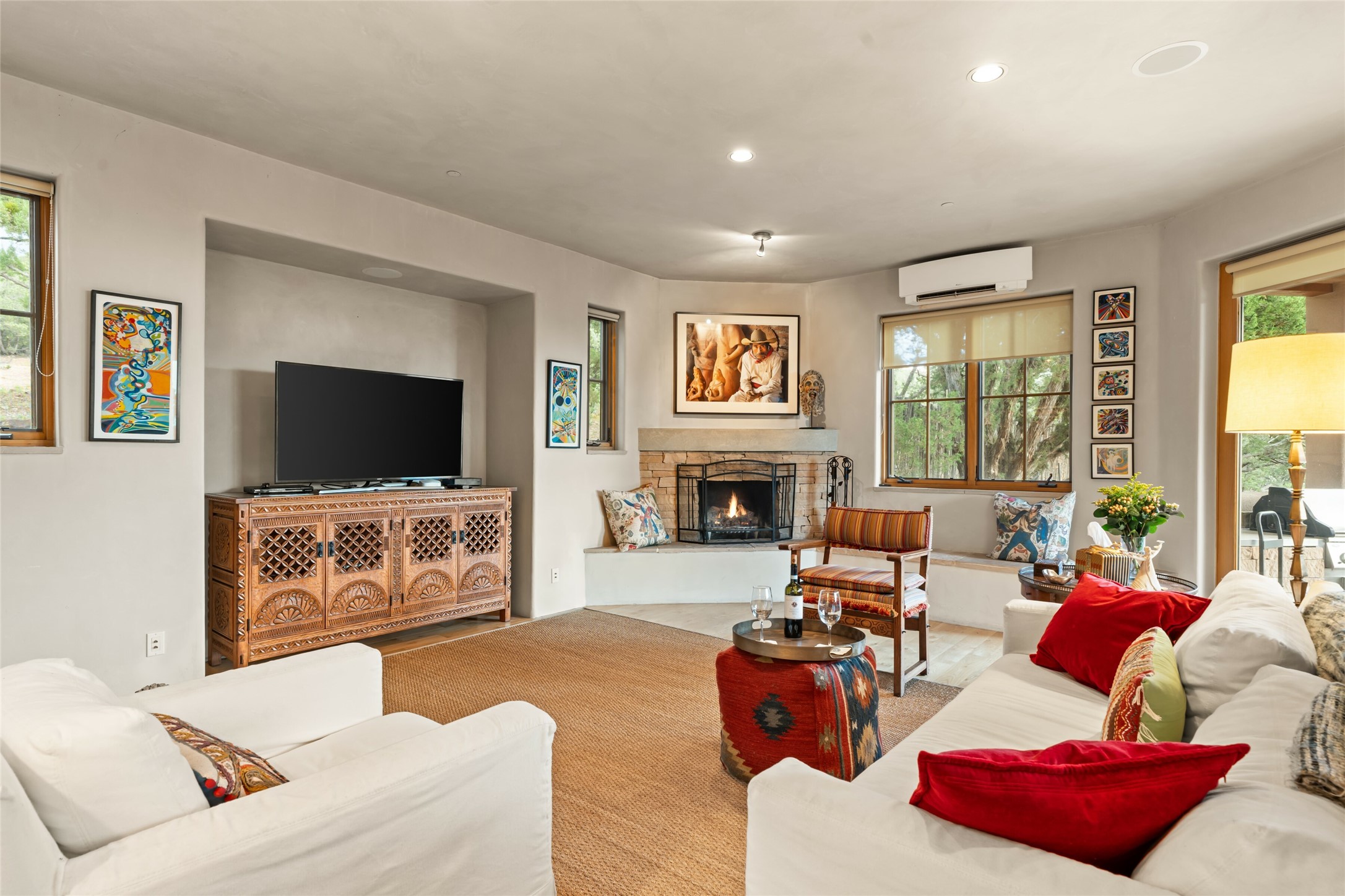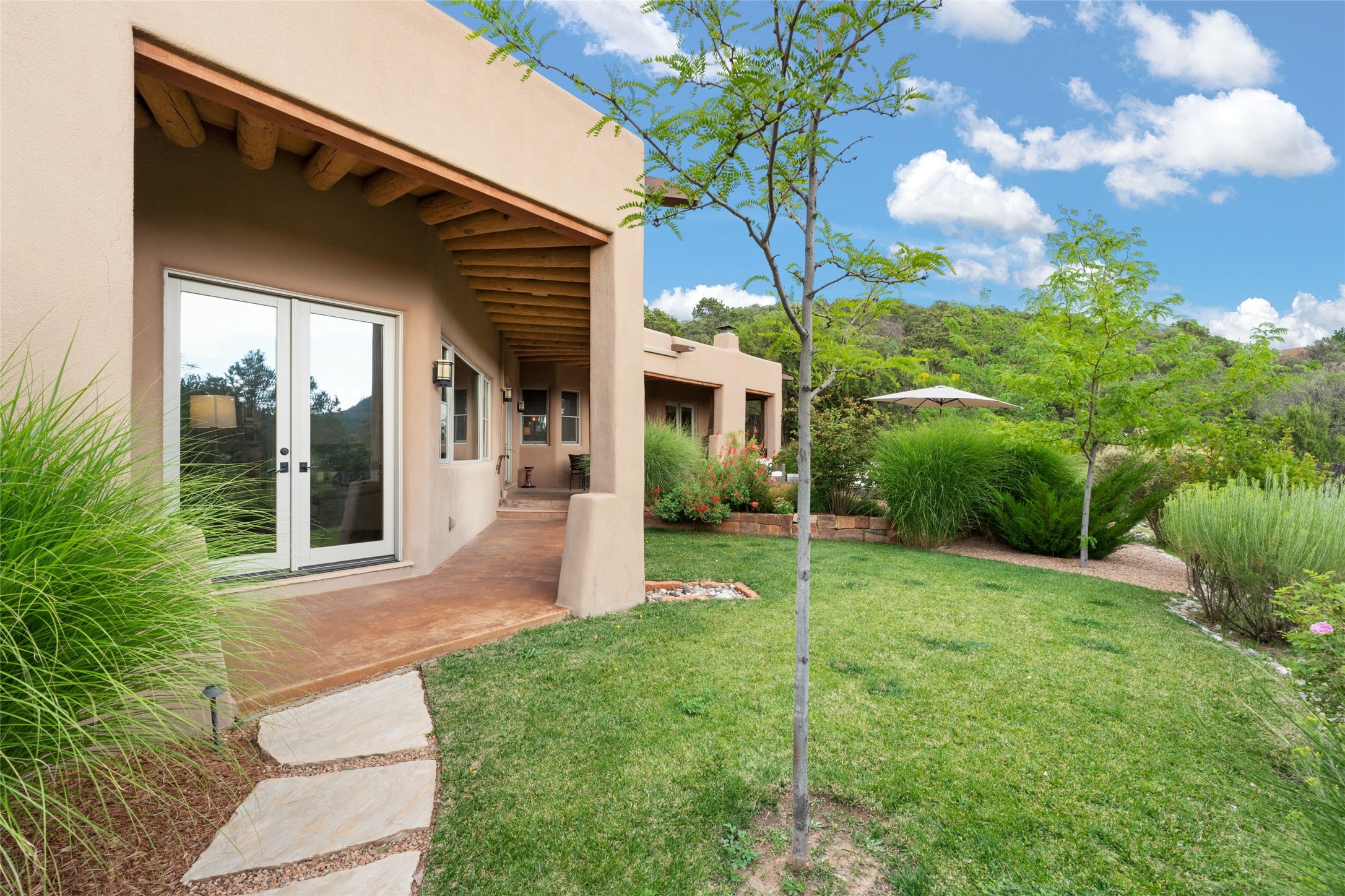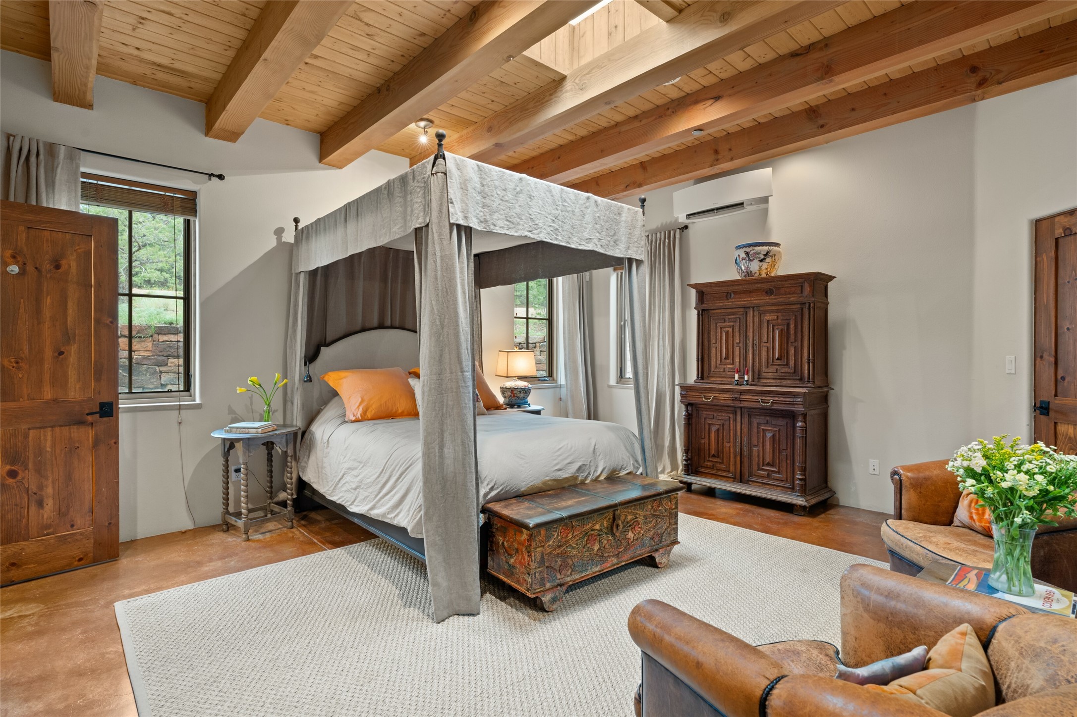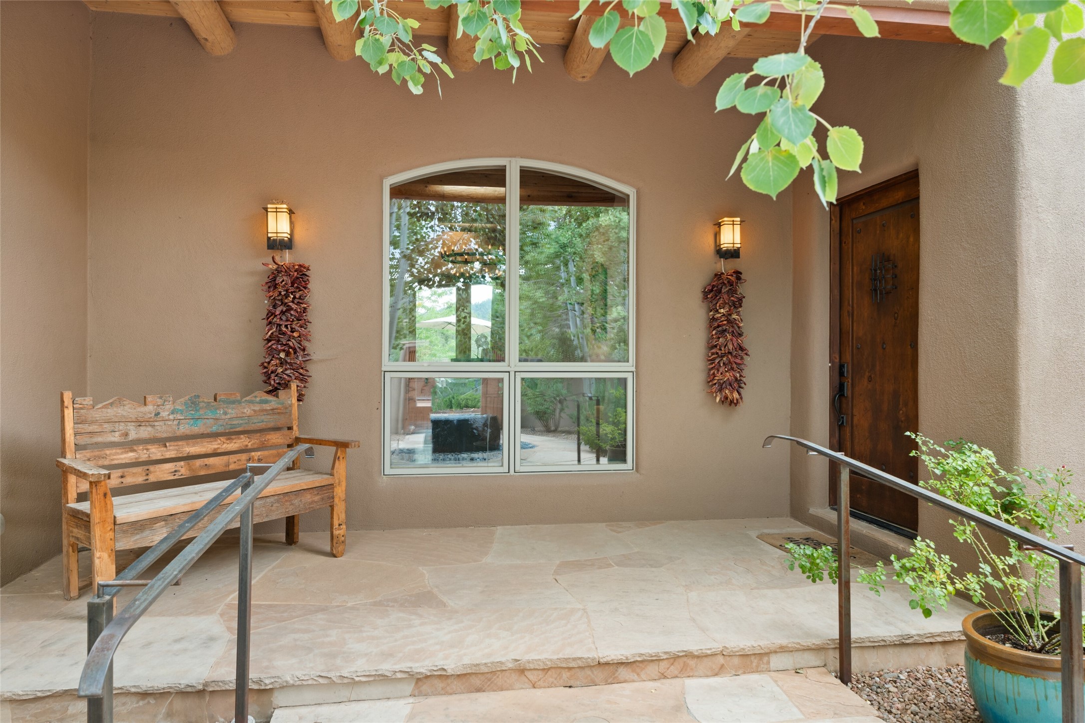 This gorgeous 4-bedroom home in the coveted St. Johns' neighborhood offers views, spacious living, and direct access to trails. The modern pueblo architecture blends harmoniously with the surrounding landscape. Single level living at its best, the home has in-floor radiant heat, AC, a large family room off the kitchen and luxurious outdoor livings spaces including a Kiva fireplace patio and a rooftop Sunset Deck. With direct access to a private patio, the generous primary suite also has a large walk-in closet, Jacuzzi tub and a steam shower. Ideal for a family, the guest wing has a shared sitting / play room and 2 guest bedrooms with ample closet space. There is an additional guest suite near the kitchen with an on-suite bath as well a large closet with a built-in safe. Work from home? The flex room is just the ticket for a home office, work-out room or artist's studio and even has a utility sink! If 4700 SF isn't enough, the 1.5 acre lot allows for room to grow or add a casita. This fabulous property has it all: style, ease of living, room for the whole family or artist and is set in one of the most desirable locations in town.
