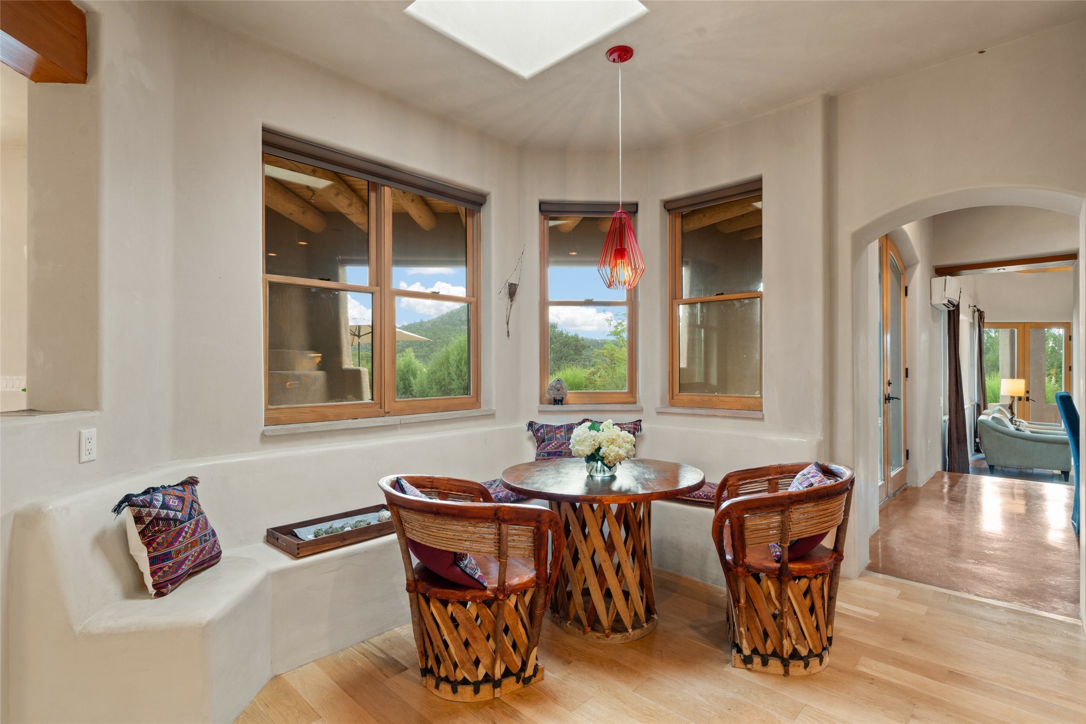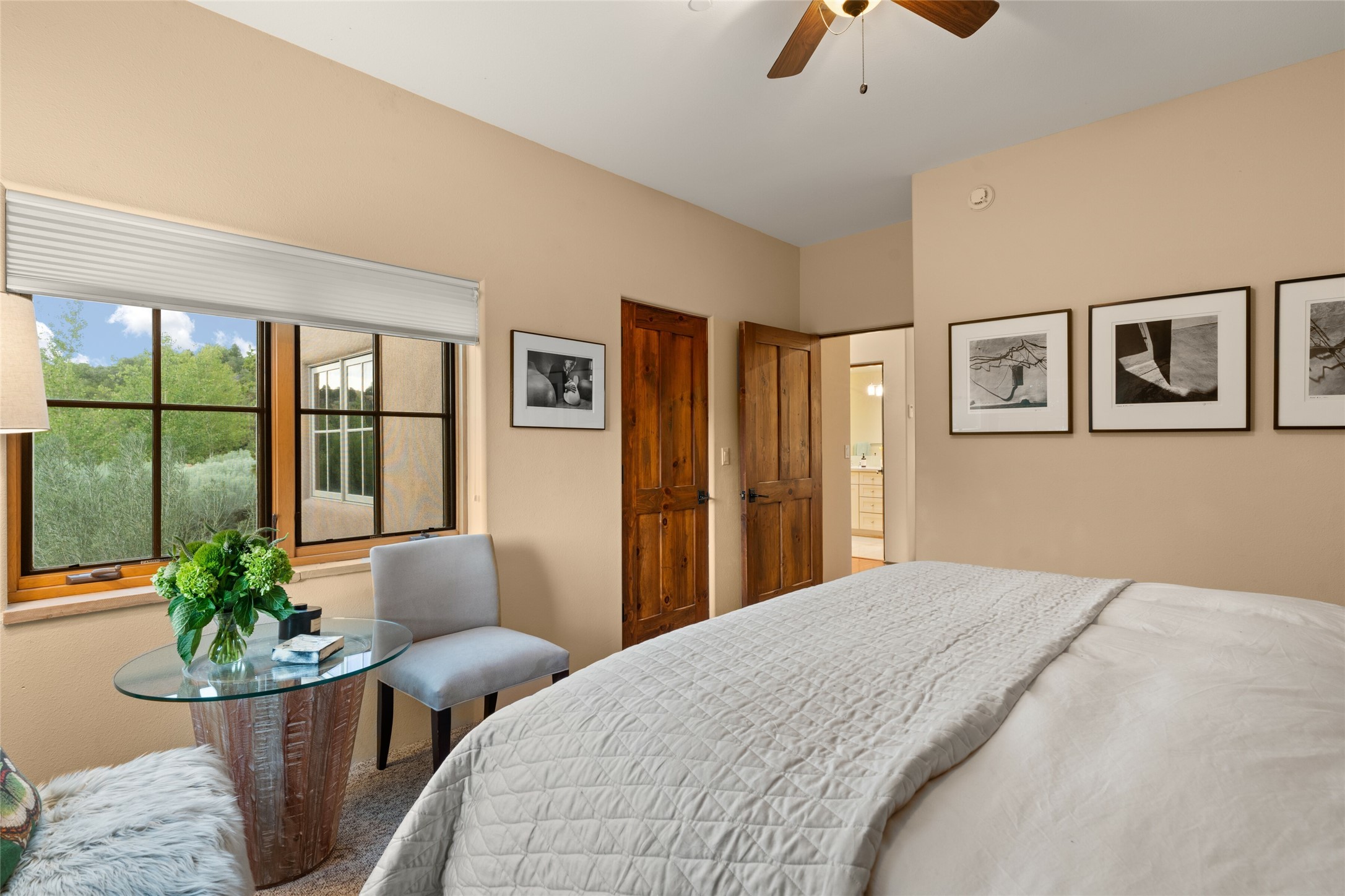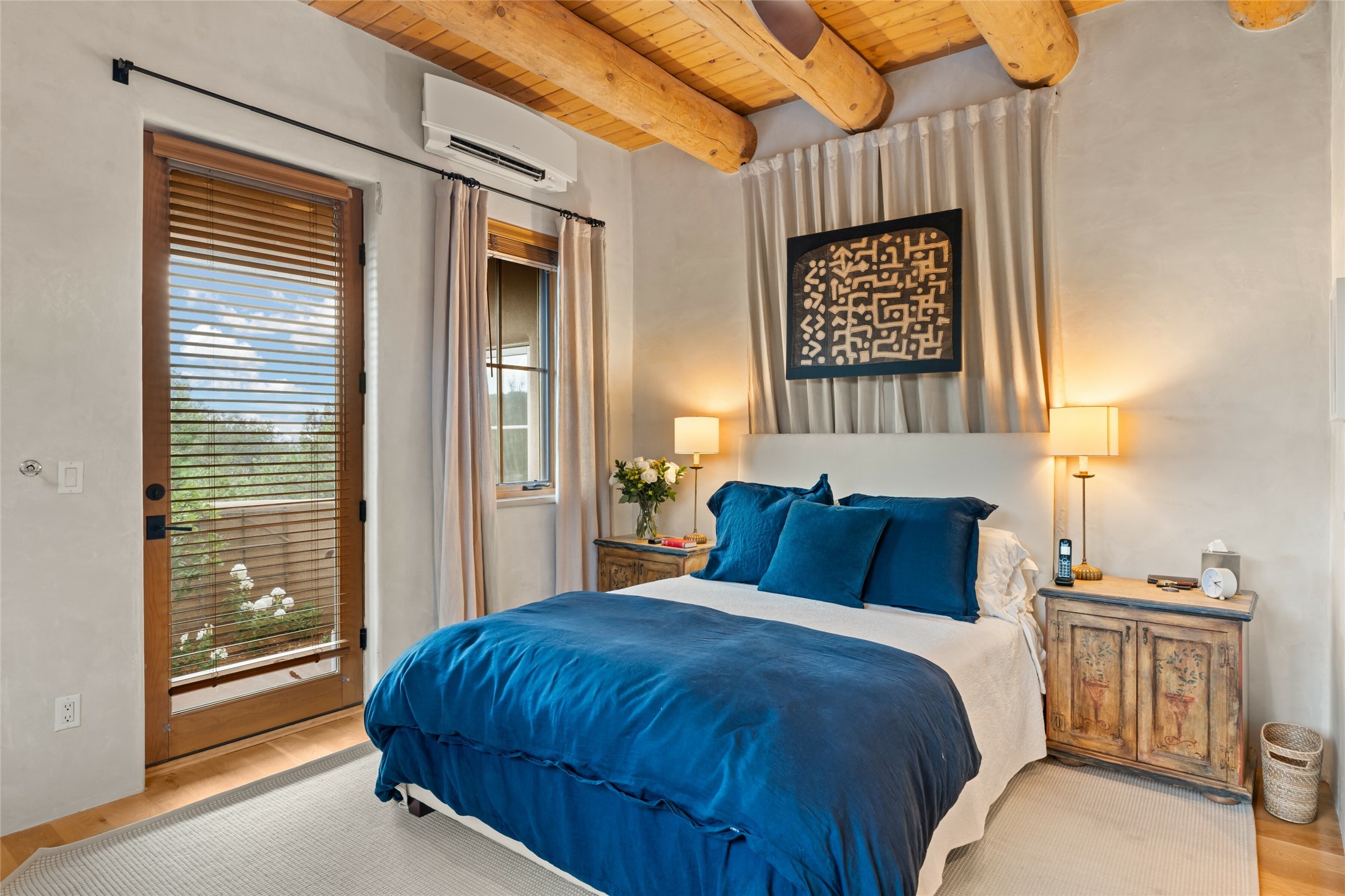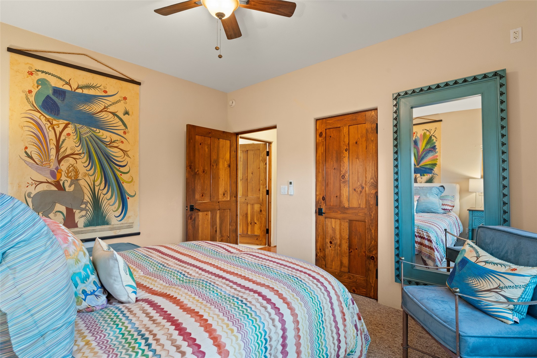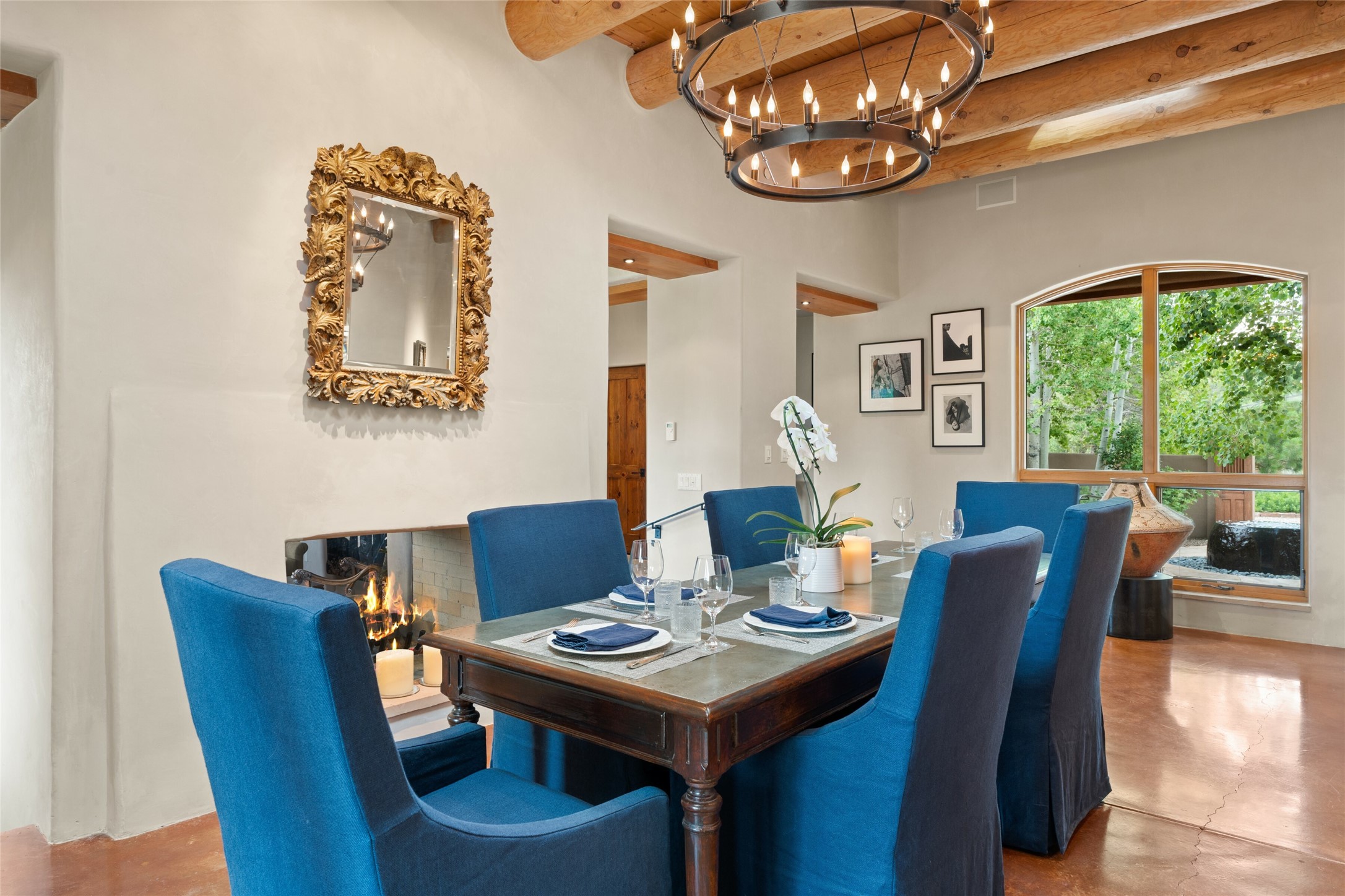 This gorgeous 4-bedroom home in the coveted St. Johns' neighborhood offers views, spacious living, and direct access to trails. The modern pueblo architecture blends harmoniously with the surrounding landscape. Single level living at its best, the home has in-floor radiant heat, AC, a large family room off the kitchen and luxurious outdoor livings spaces including a Kiva fireplace patio and a rooftop Sunset Deck. With direct access to a private patio, the generous primary suite also has a large walk-in closet, Jacuzzi tub and a steam shower. Ideal for a family, the guest wing has a shared sitting / play room and 2 guest bedrooms with ample closet space. There is an additional guest suite near the kitchen with an on-suite bath as well a large closet with a built-in safe. Work from home? The flex room is just the ticket for a home office, work-out room or artist's studio and even has a utility sink! If 4700 SF isn't enough, the 1.5 acre lot allows for room to grow or add a casita. This fabulous property has it all: style, ease of living, room for the whole family or artist and is set in one of the most desirable locations in town.