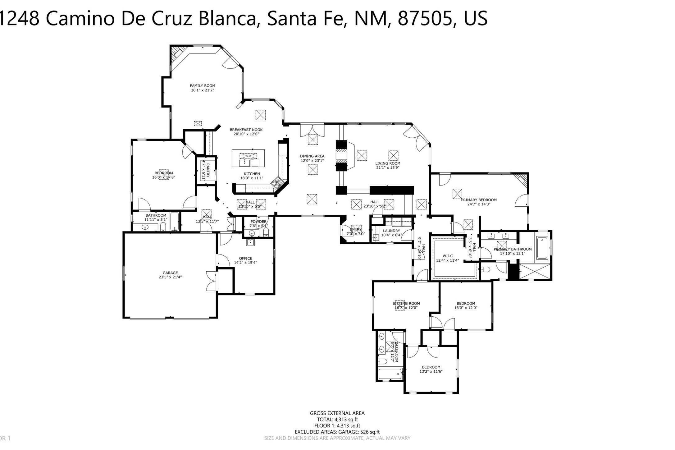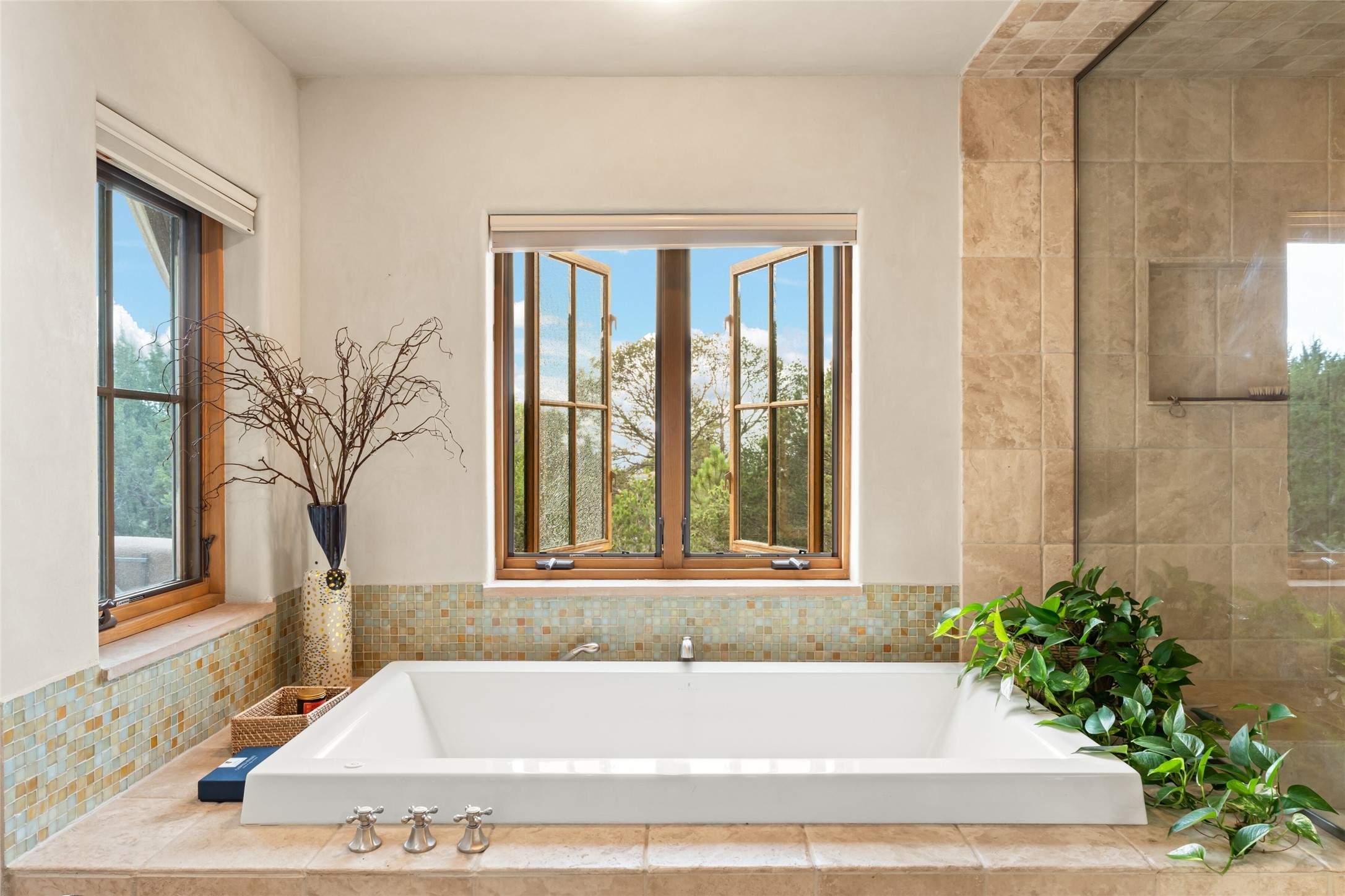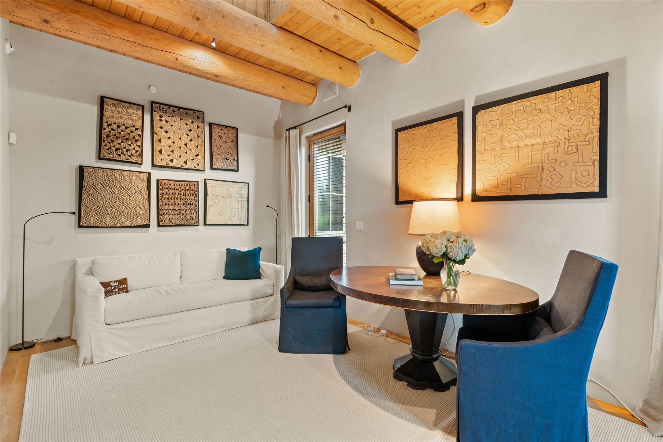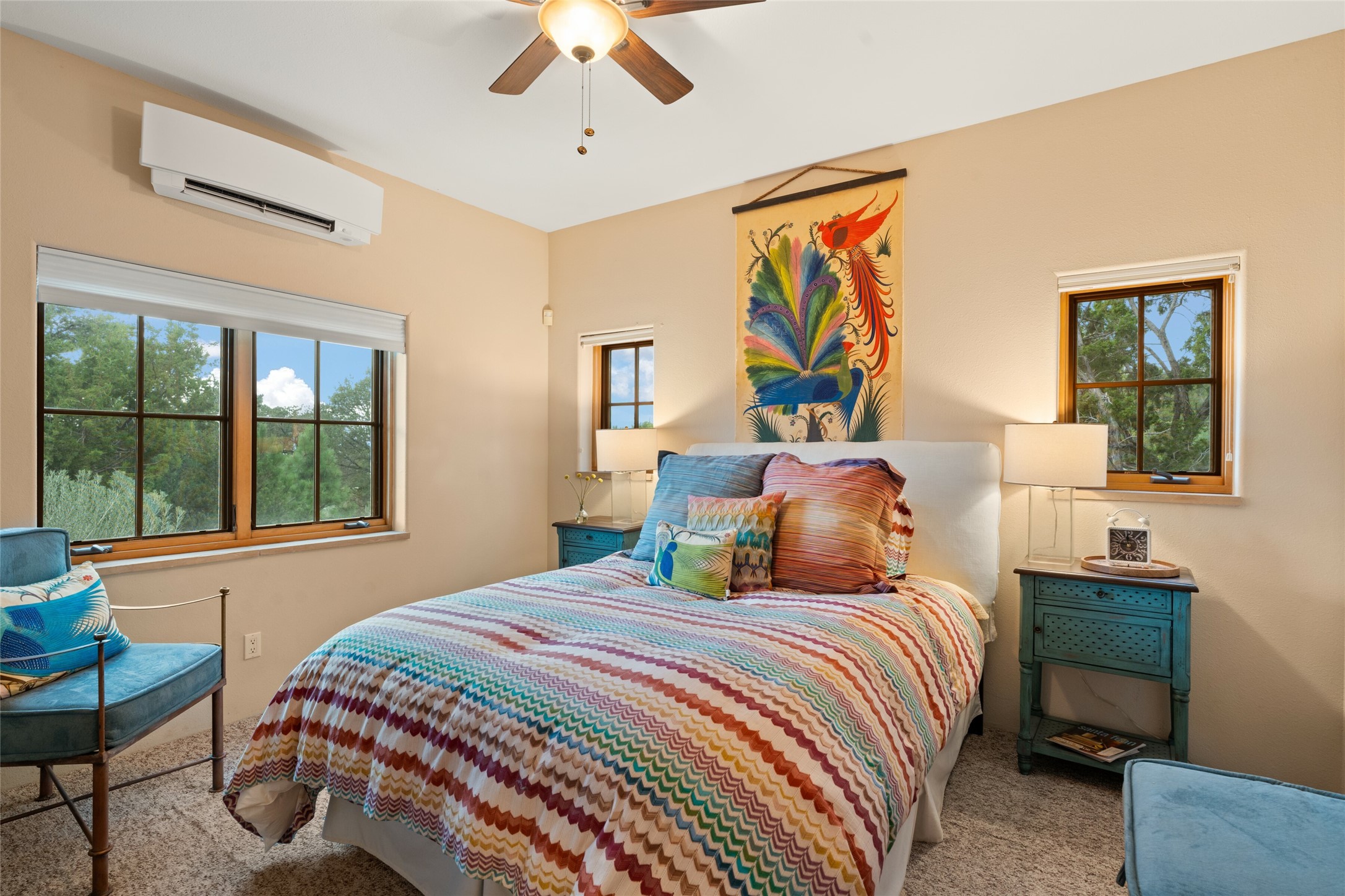 This gorgeous 4-bedroom home in the coveted St. Johns' neighborhood offers views, spacious living, and direct access to trails. The modern pueblo architecture blends harmoniously with the surrounding landscape. Single level living at its best, the home has in-floor radiant heat, AC, a large family room off the kitchen and luxurious outdoor livings spaces including a Kiva fireplace patio and a rooftop Sunset Deck. With direct access to a private patio, the generous primary suite also has a large walk-in closet, Jacuzzi tub and a steam shower. Ideal for a family, the guest wing has a shared sitting / play room and 2 guest bedrooms with ample closet space. There is an additional guest suite near the kitchen with an on-suite bath as well a large closet with a built-in safe. Work from home? The flex room is just the ticket for a home office, work-out room or artist's studio and even has a utility sink! If 4700 SF isn't enough, the 1.5 acre lot allows for room to grow or add a casita. This fabulous property has it all: style, ease of living, room for the whole family or artist and is set in one of the most desirable locations in town.