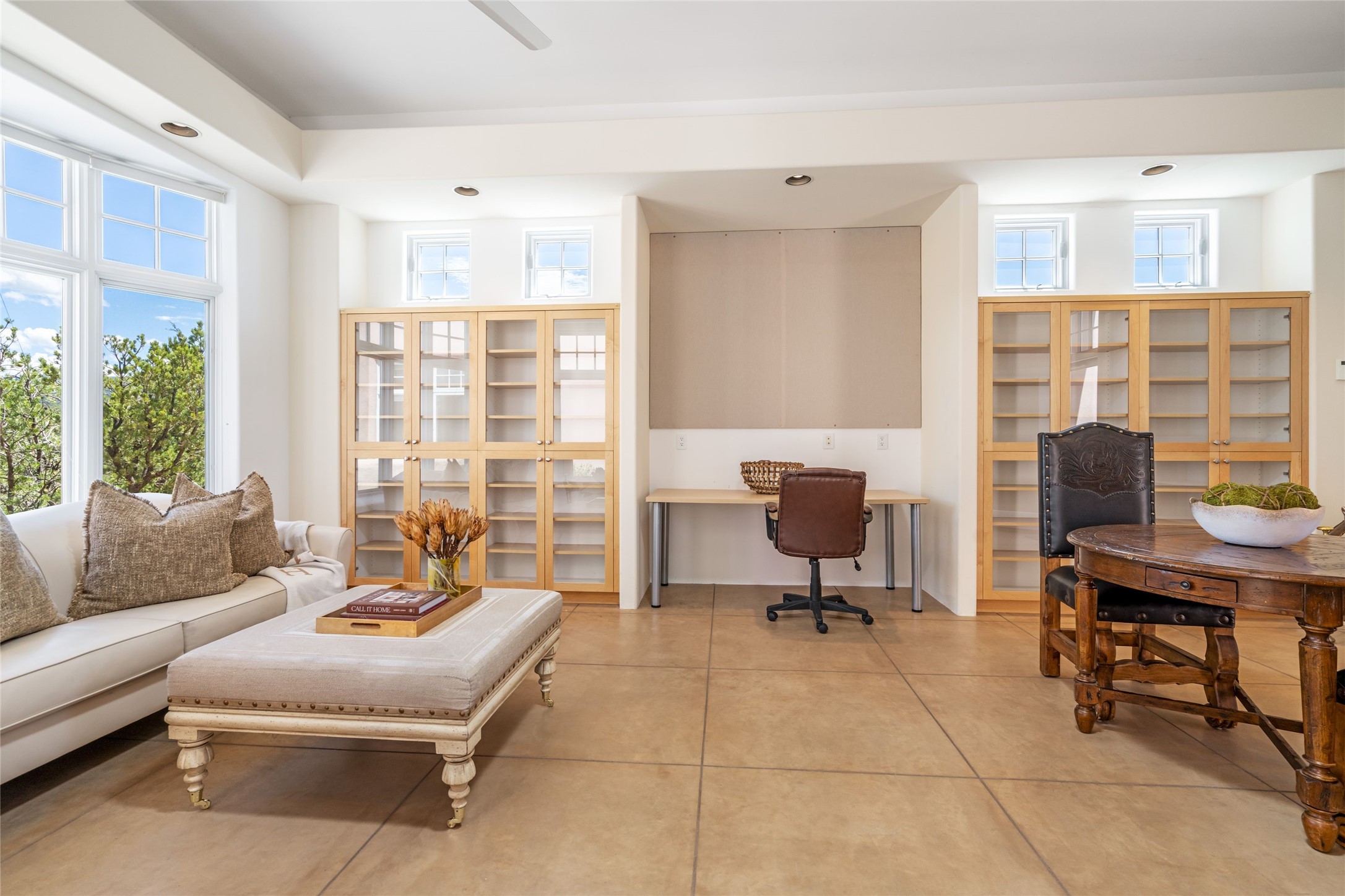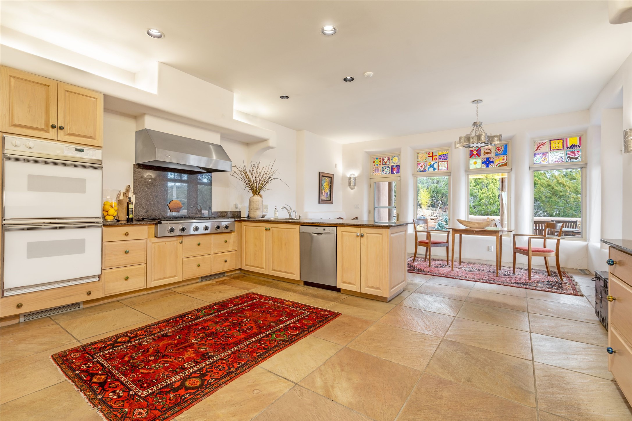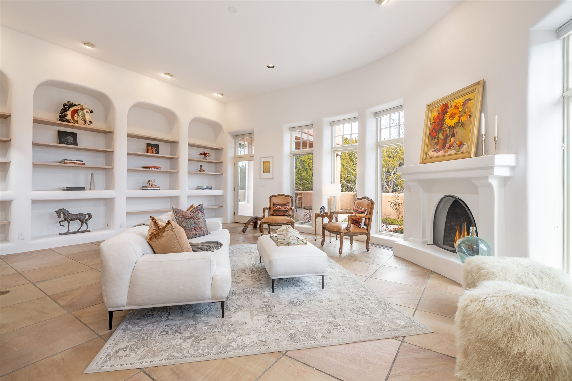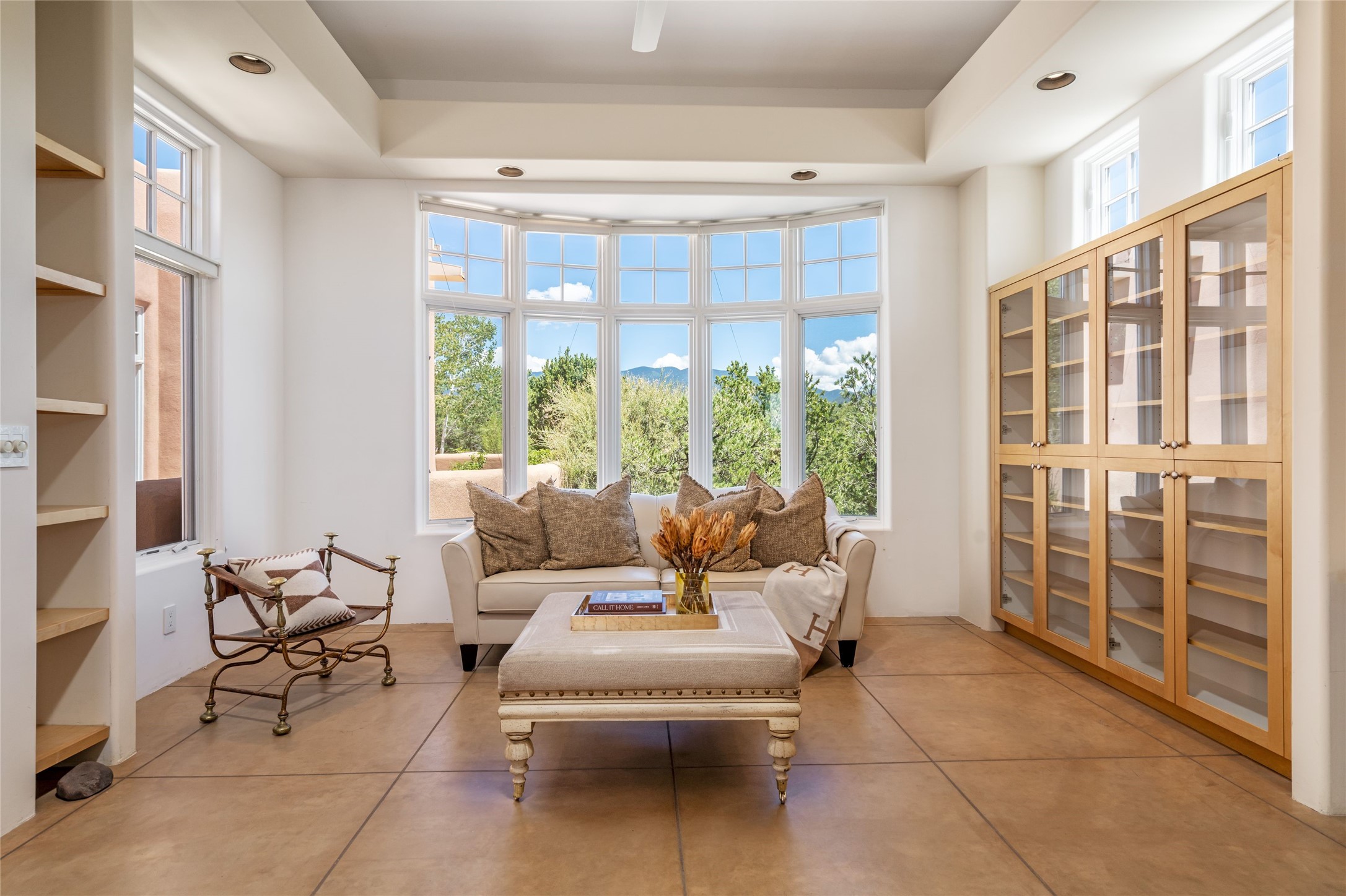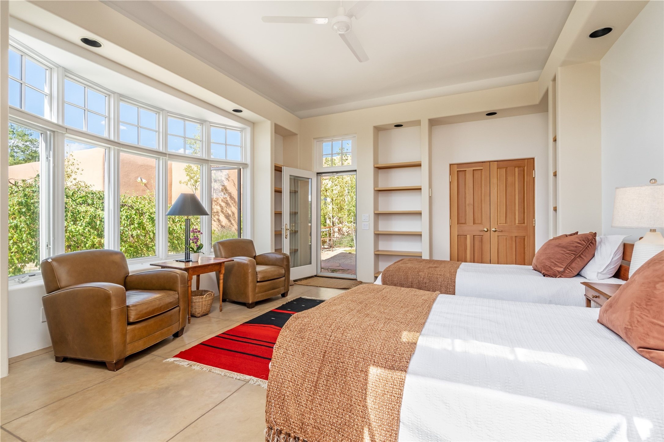 An exceptional single-level residence located on a peaceful 4.26 acres within the city limits. Nestled within the trees, this generous 4,431 sq ft, the main house has a spacious, open feel, with high ceilings and clerestory windows letting in an abundance of light. The living space has an elegant wood-burning fireplace and adjoins an expansive eat-in kitchen, featuring a professional gas stove and double door Sub-Zero refrigerator/ freezer. Both spaces open to the wraparoundpatio and covered outdoor dining area, perfect for entertaining or enjoying a quiet evening. The main home has warm sandstone tile floors, refrigerated air conditioning, forced air heating and four wood burning fireplaces. The 3-car garage also has three additional storage areas. Across from the main is an additional 1,033 sq ft- guest house/studio, separated by a lovely architectural and manicured entry courtyard. This guesthouse is one-bedroom suite with in-floor radiantheat, a full bath, and a fully equipped kitchen and gorgeous sunset views- an ideal space for guests or an art studio/ private retreat. This exquisite property at 396 Circle Drive offers a rare combination of privacy and convenience. The property is now priced to allow the new owner the opportunity for upgrades. A true gem on one of the most sought-after streets in Santa Fe.