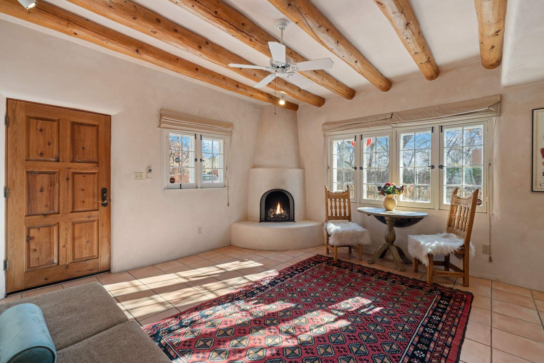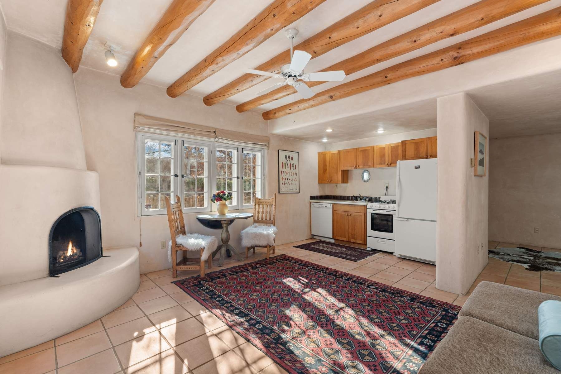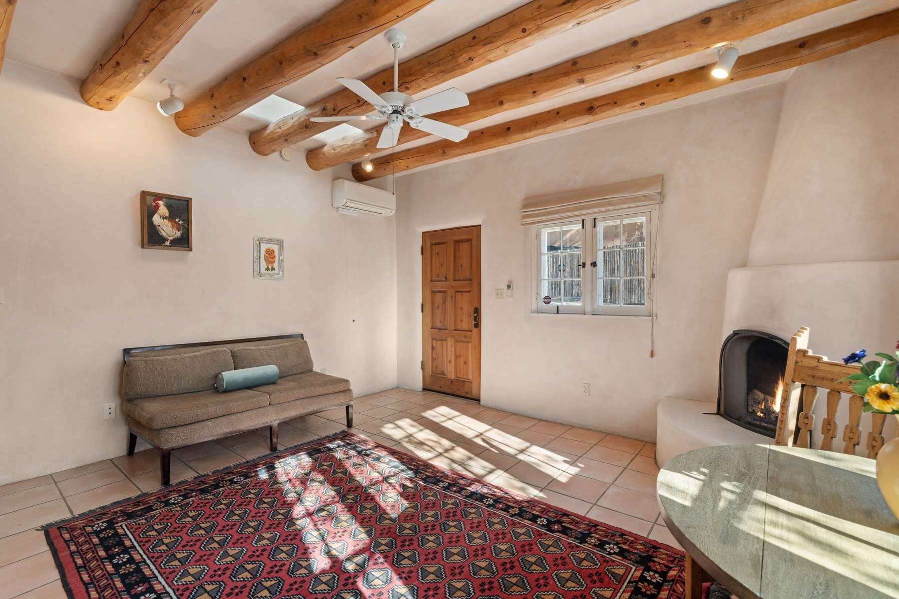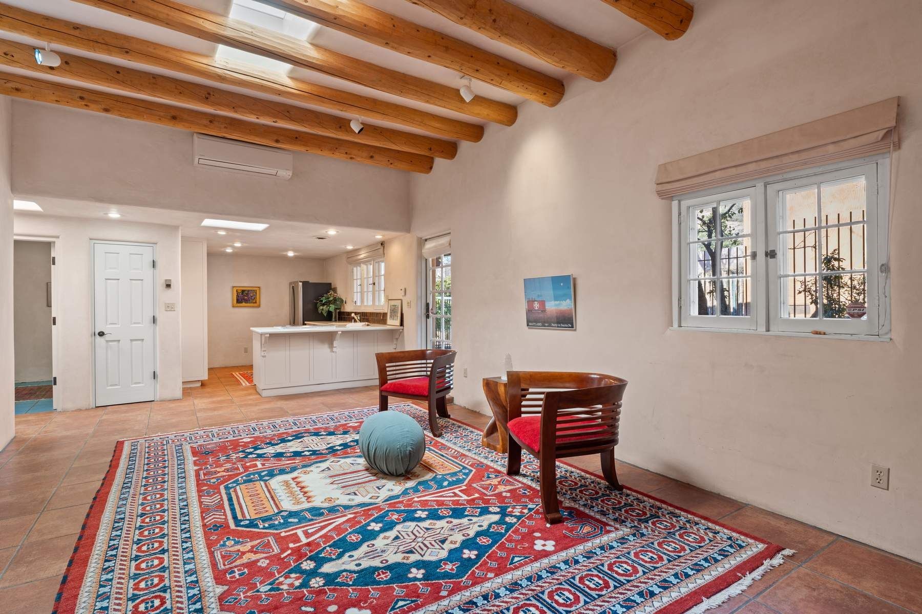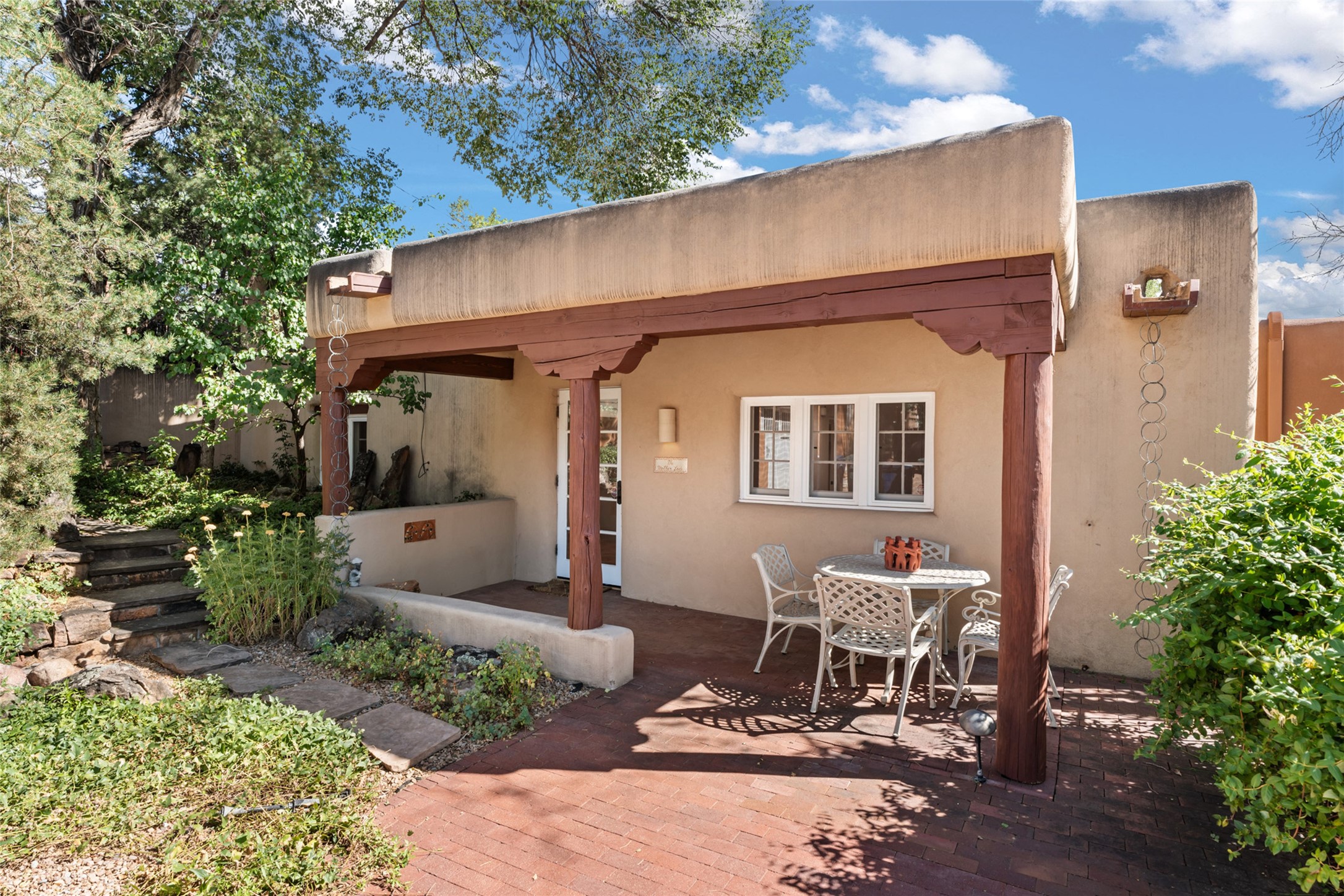 Located just down the street from the Thomas Macaione Park, the Cross of the Martyrs and the numerous shops and galleries on Marcy Street, this timeless and authentic Santa Fe home and attached guesthouse is situated down a quiet lane with an attractive floor plan in place. The entire structure consists of a 1928 sq.ft. (1405 sq.ft main house/523 sq.ft guesthouse) single-story frame and stucco home exuding a classic yet updated Santa Fe style. The 0.07 acre property boasts a private, walled, and gated outdoor environment with a large portal located off the north side of the property. Each space consists of a living/dining area, full kitchen, bedroom and full bathroom. A wood burning kiva fireplace is situated in each of the living areas. A shared laundry room/mechanical room separates the spaces with privacy doors in place. Ceramic tile and wood floors, smooth plaster walls, refrigerated mini-split cooling and several skylights throughout the homes add to not only the functional, but the esthetic feel of the home. Completely updated and perfectly maintained, this is a property not to be missed in an idyllic Santa Fe location.