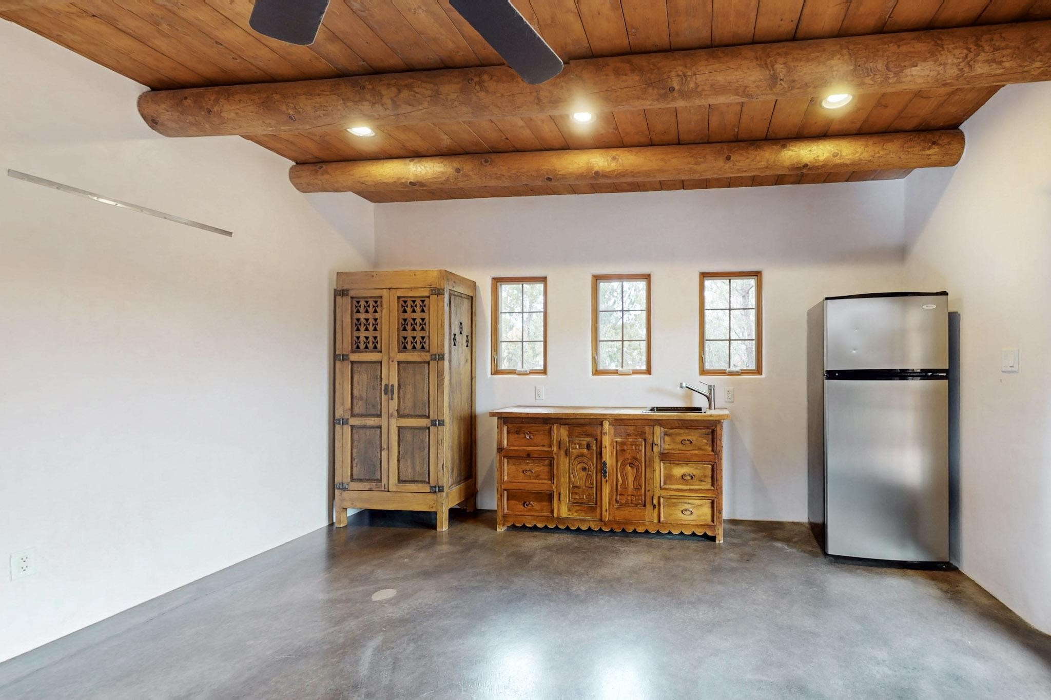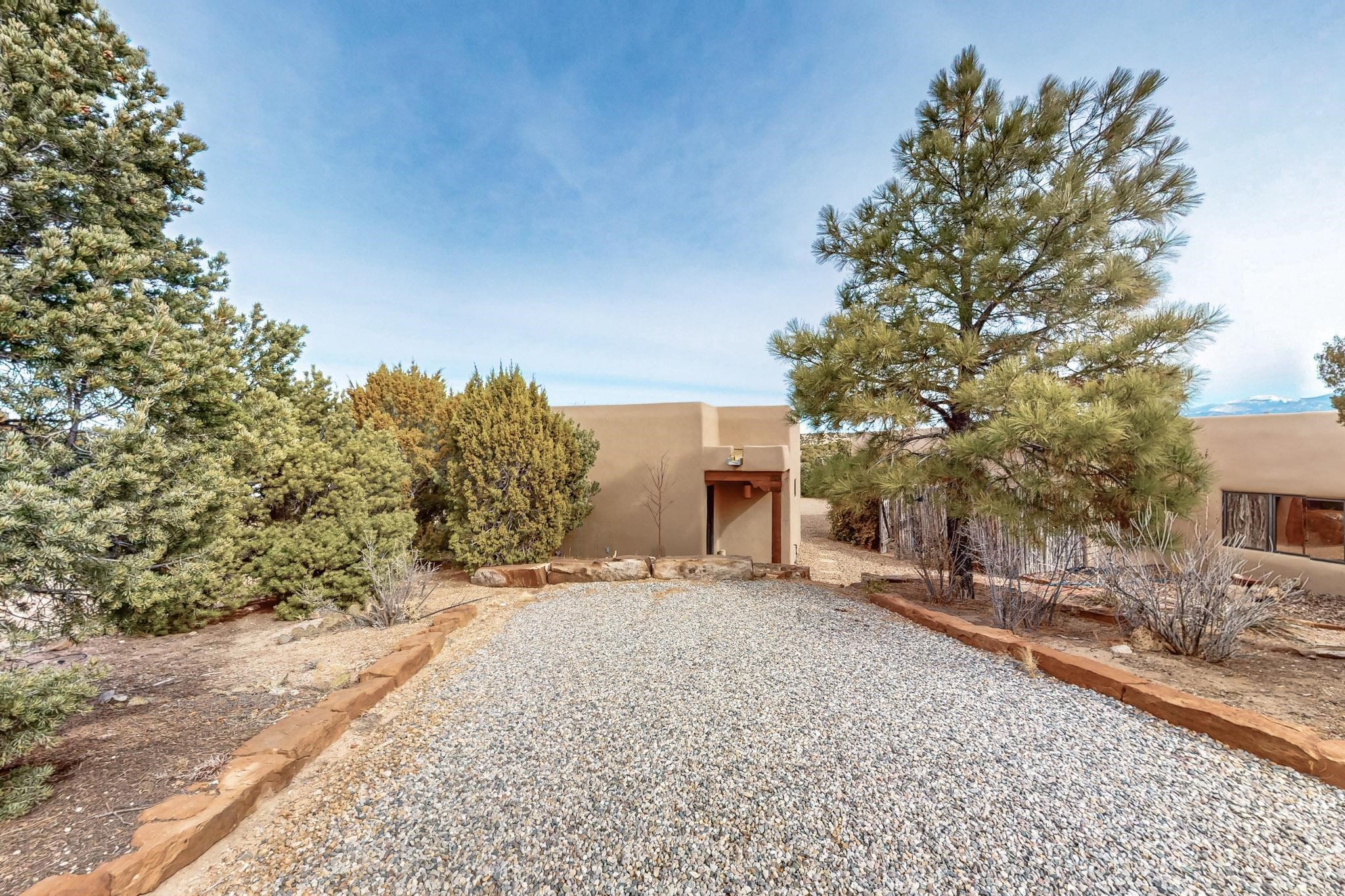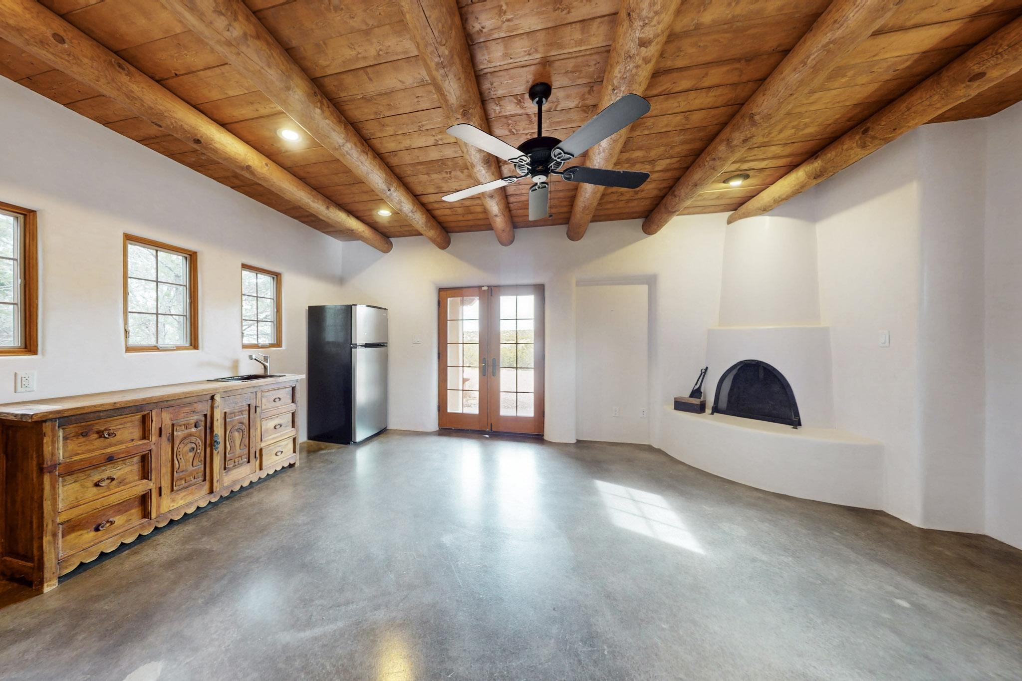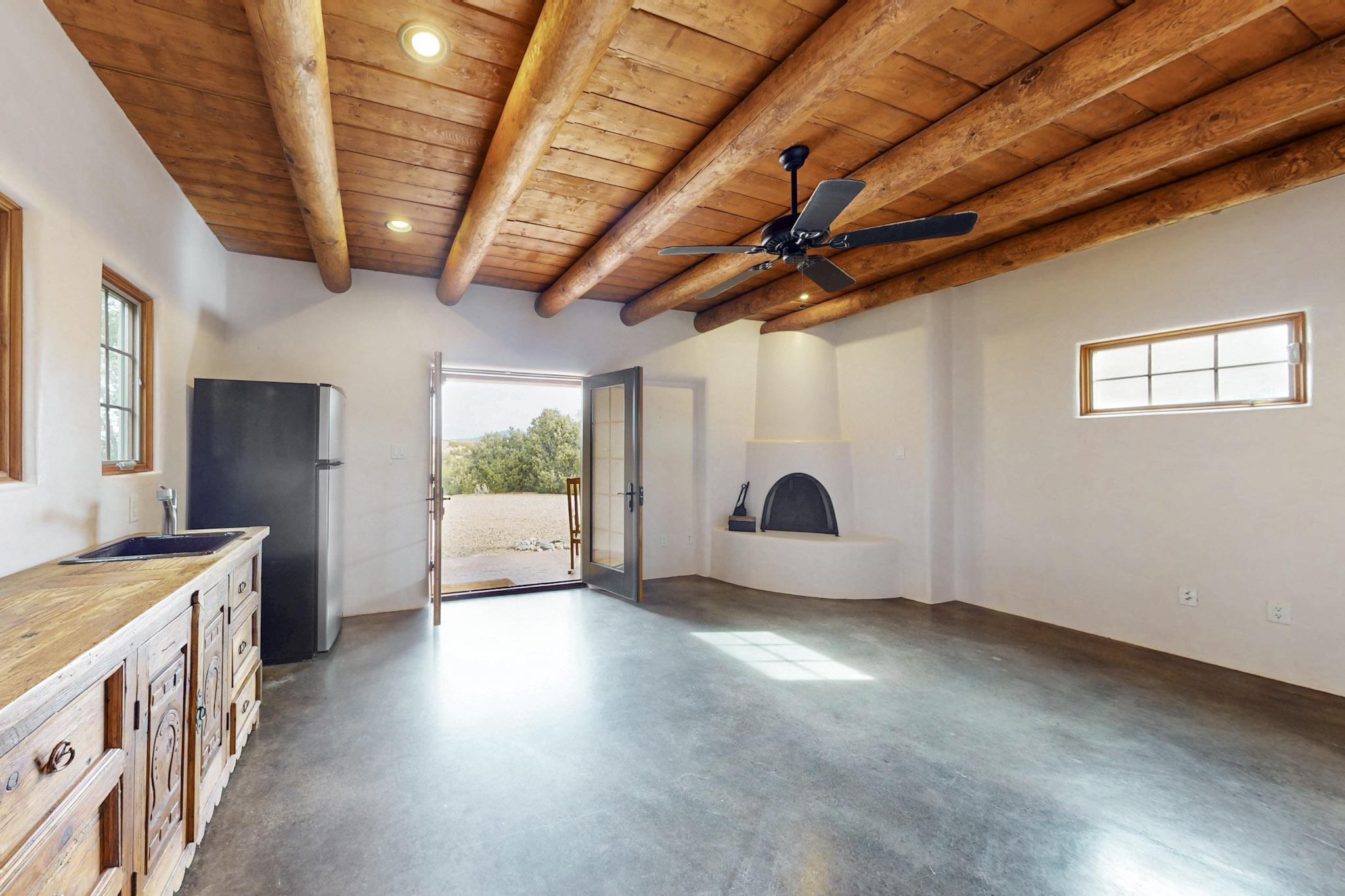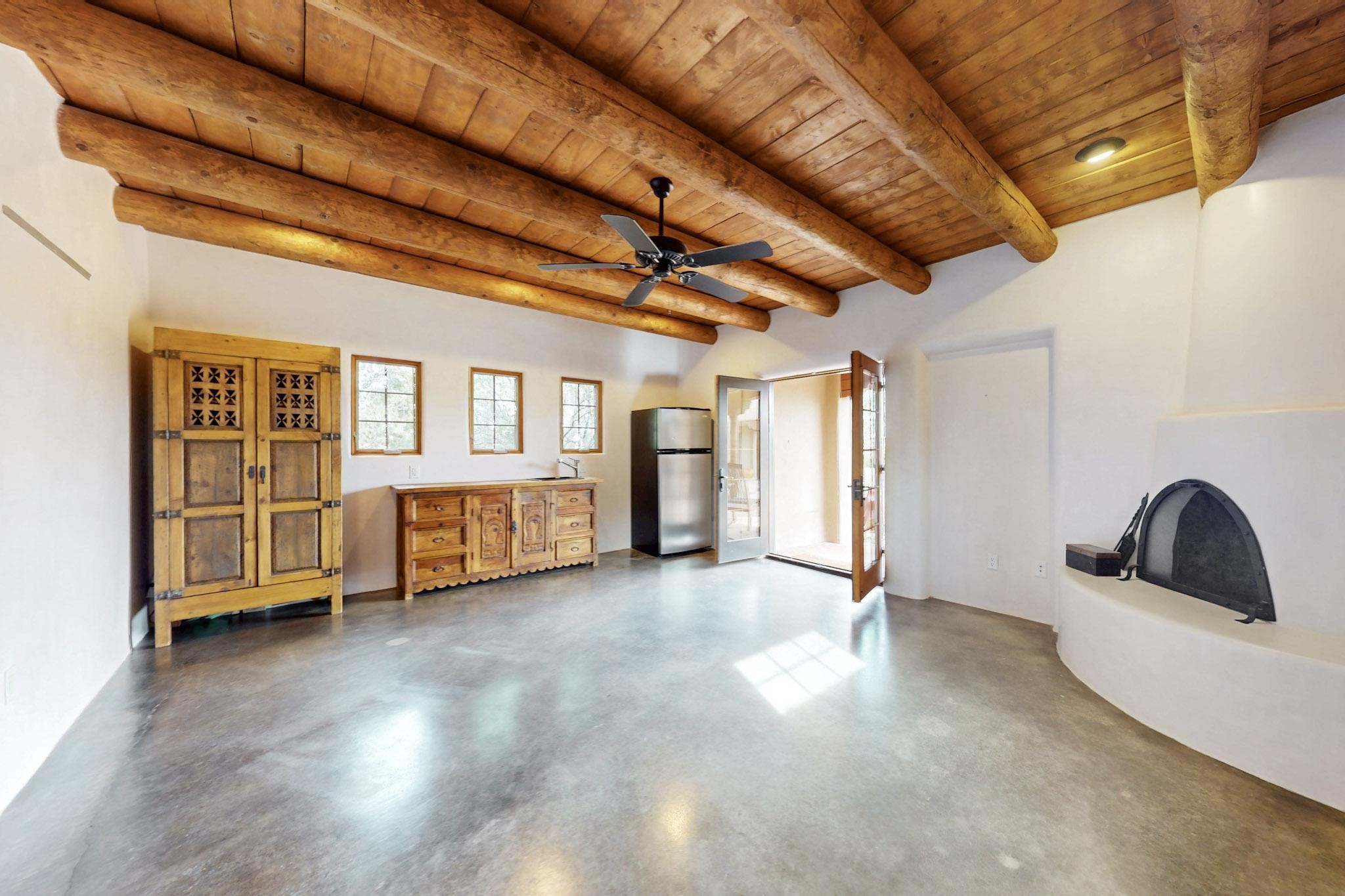 This Pueblo Revival style home features three bedrooms in the main house along with a detached, one-bedroom studio/casita. Situated in the beautiful La Tierra area, this adobe home is set on over two acres of land and is conveniently located just 15 minutes from downtown. The main home, spanning just over 2,000 sq ft, offers a private retreat with an open concept layout, high ceilings, vigas, wood decked ceilings, plastered walls, and two kiva fireplaces. You'll find panoramic views of the Sangre de Cristo Mountains from the large portal off the dining area, which creates a perfect setting for entertaining. The kitchen is well-appointed with a Wolf range, stainless steel appliances, colorful tile, Alder cabinets, and plenty of storage. The property also includes a heated garage for your convenience. The one-bedroom casita features similar finishes and a kiva fireplace, offering flexible options for use.