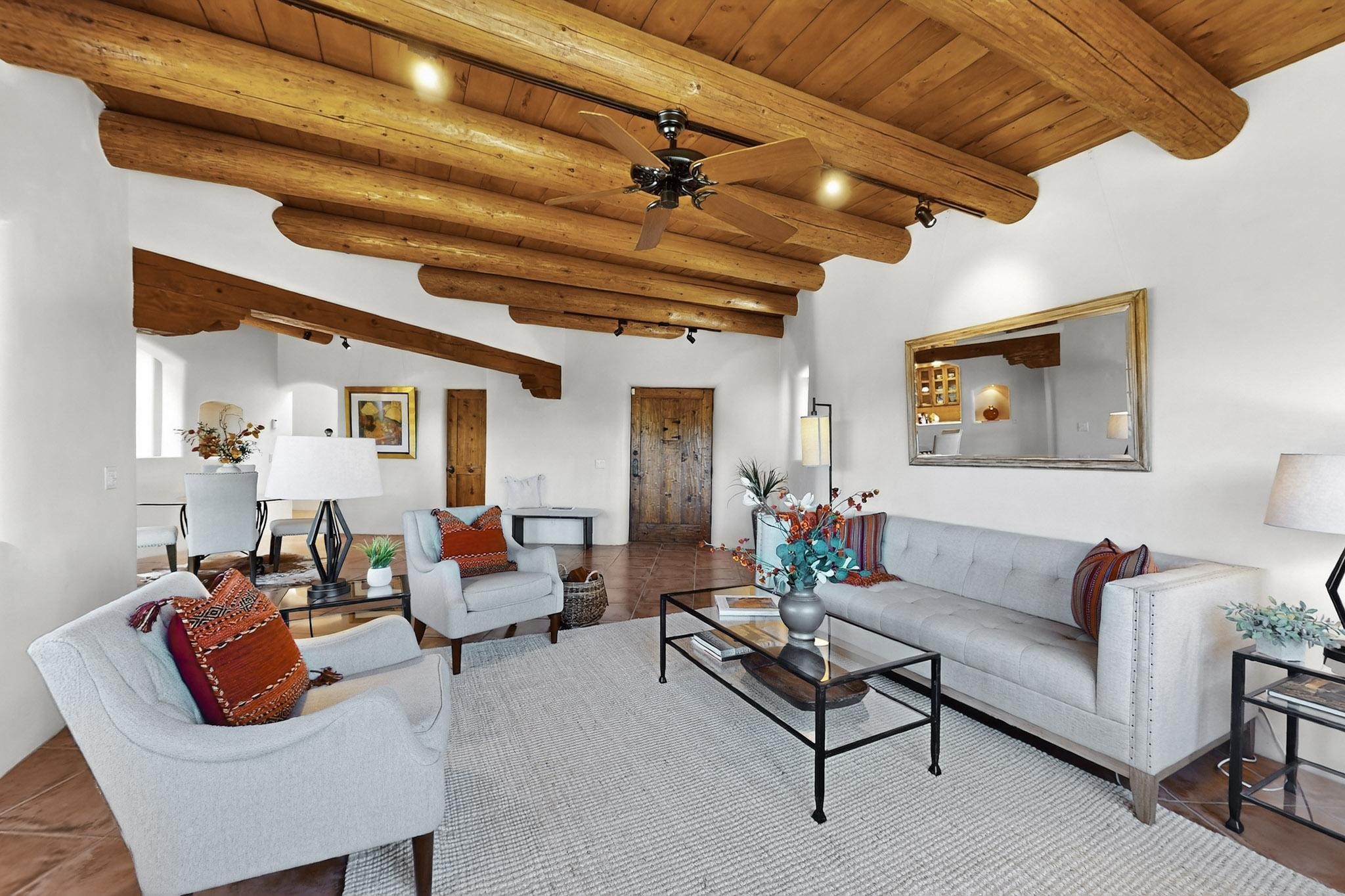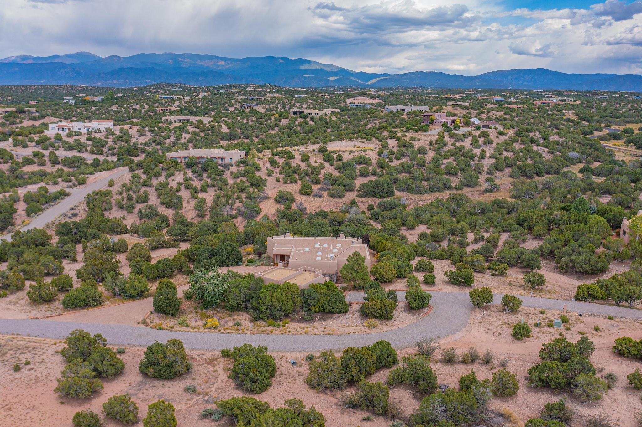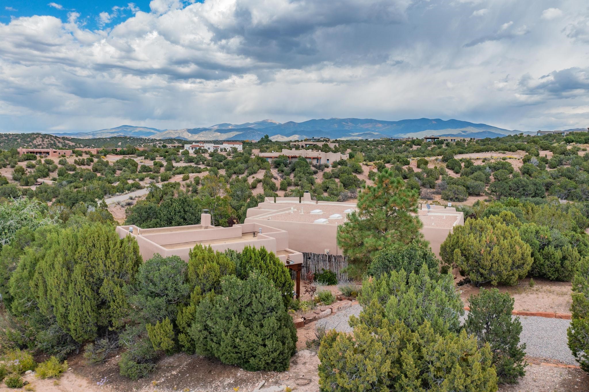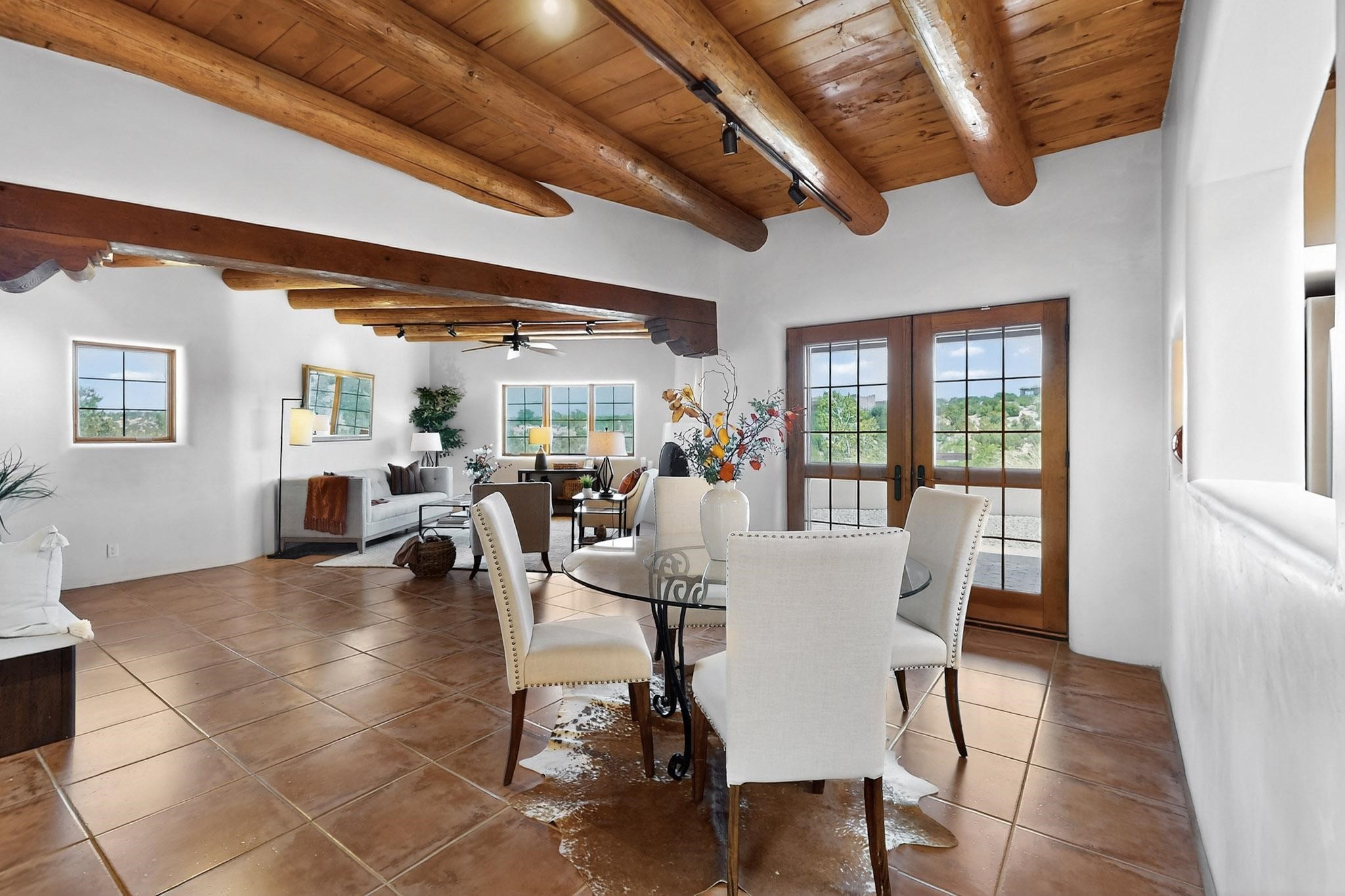 This Pueblo Revival style home features three bedrooms in the main house along with a detached, one-bedroom studio/casita. Situated in the beautiful La Tierra area, this adobe home is set on over two acres of land and is conveniently located just 15 minutes from downtown. The main home, spanning just over 2,000 sq ft, offers a private retreat with an open concept layout, high ceilings, vigas, wood decked ceilings, plastered walls, and two kiva fireplaces. You'll find panoramic views of the Sangre de Cristo Mountains from the large portal off the dining area, which creates a perfect setting for entertaining. The kitchen is well-appointed with a Wolf range, stainless steel appliances, colorful tile, Alder cabinets, and plenty of storage. The property also includes a heated garage for your convenience. The one-bedroom casita features similar finishes and a kiva fireplace, offering flexible options for use.
