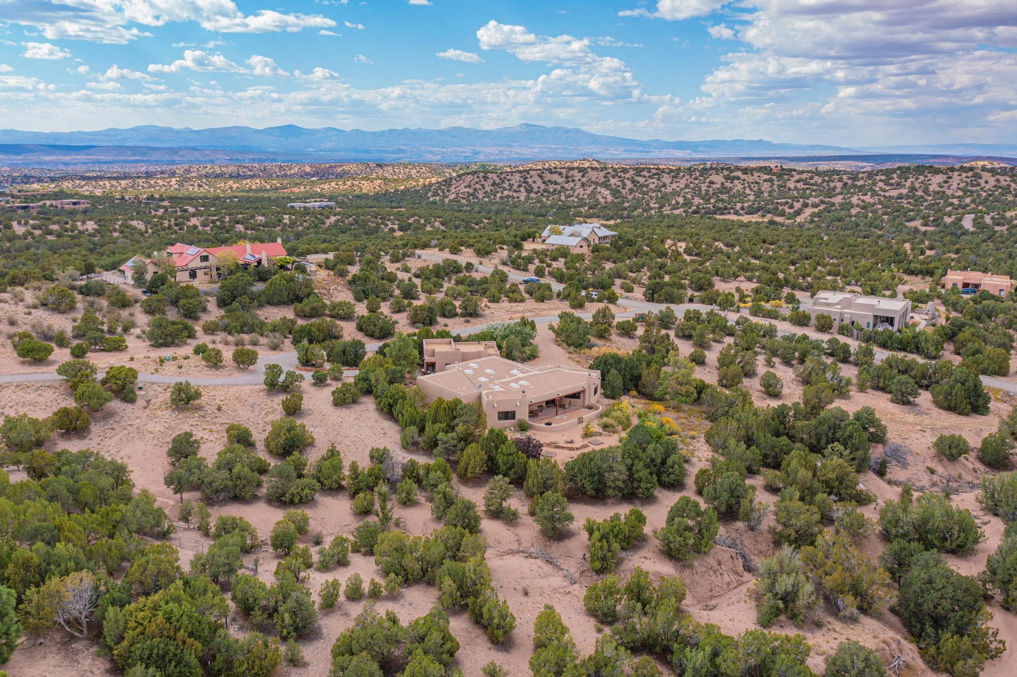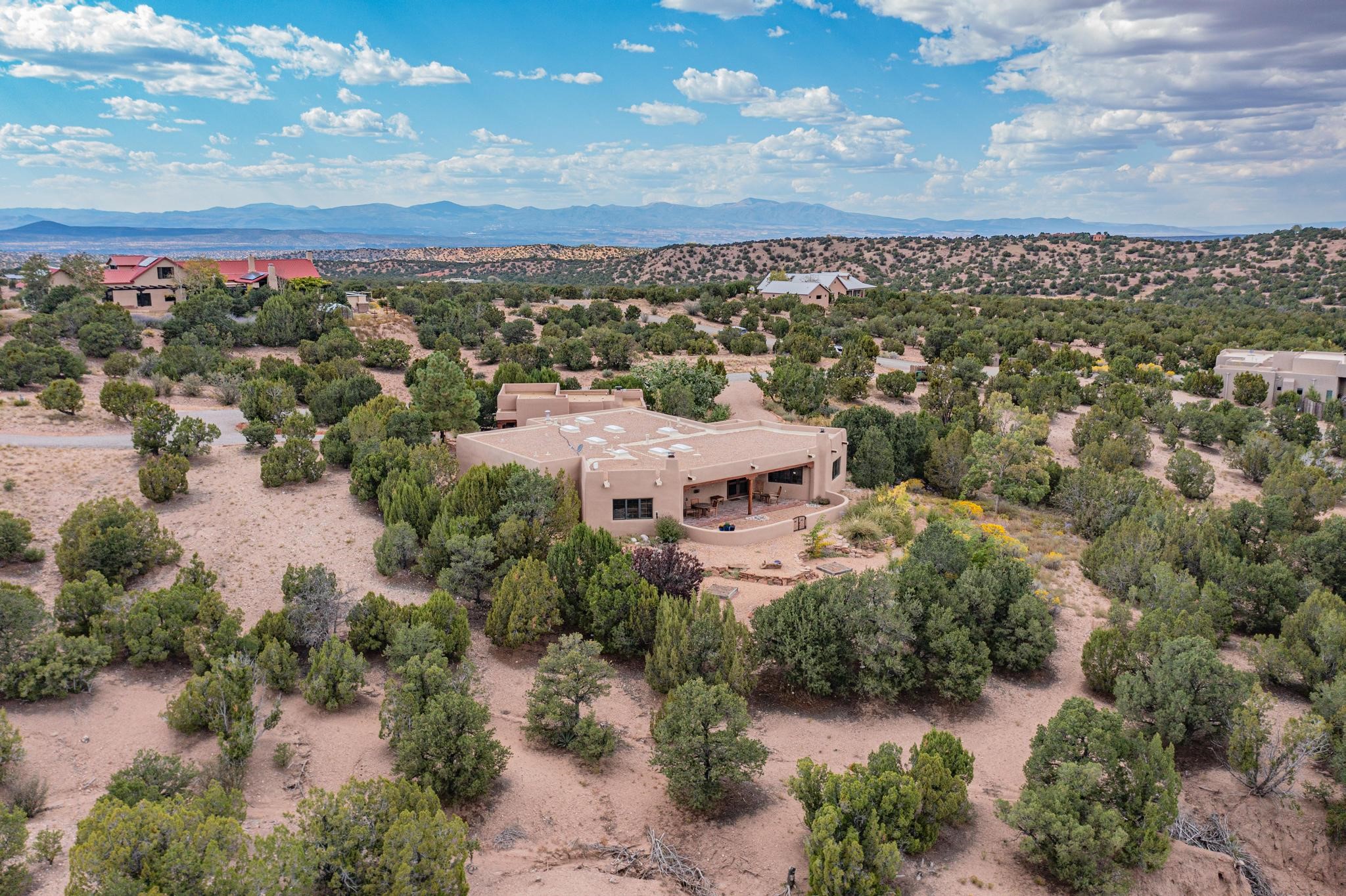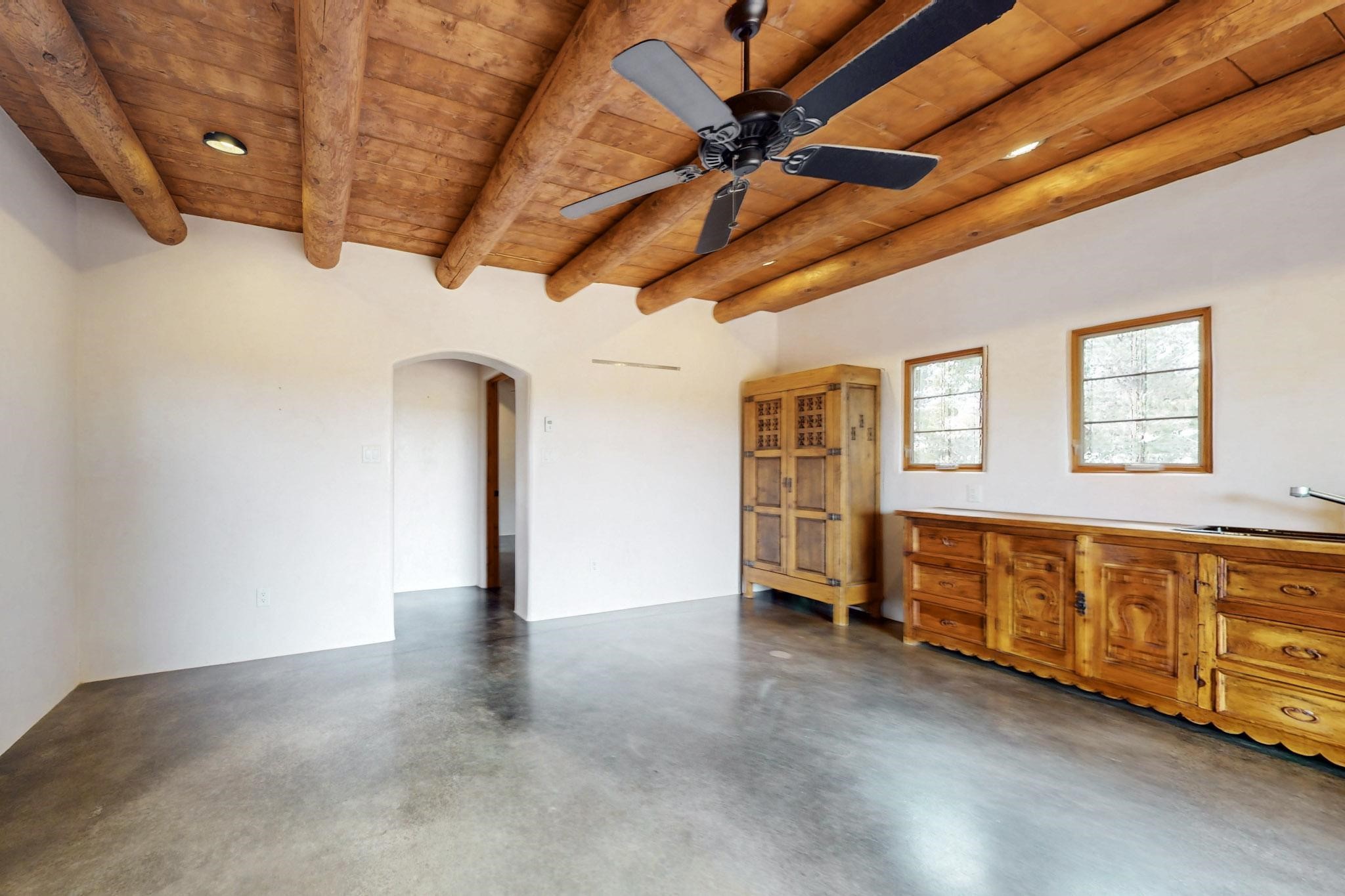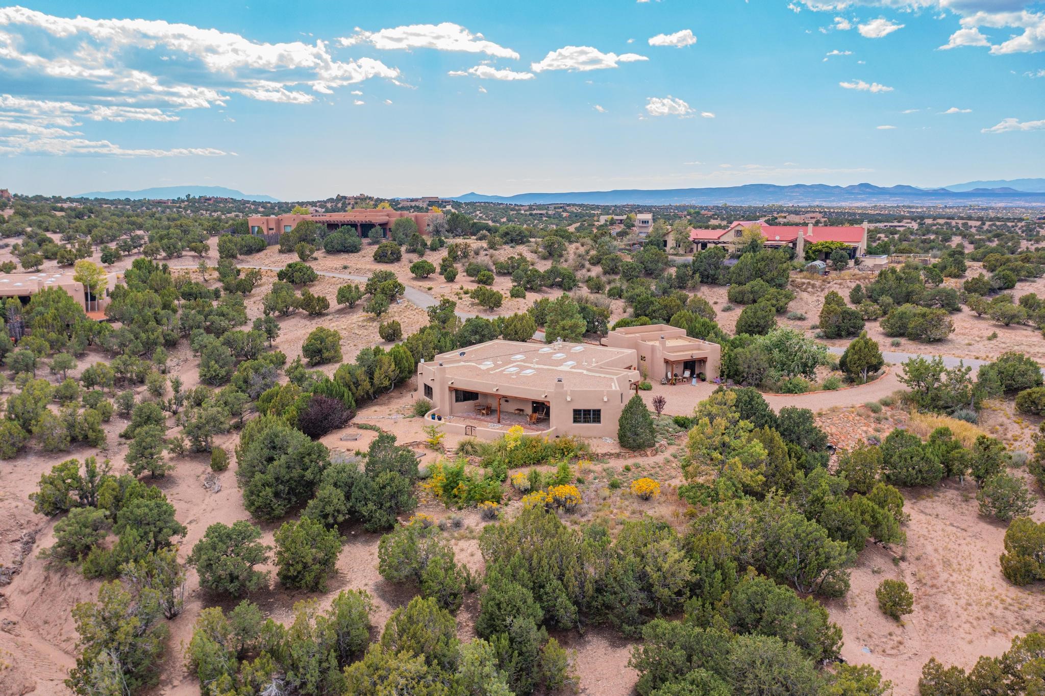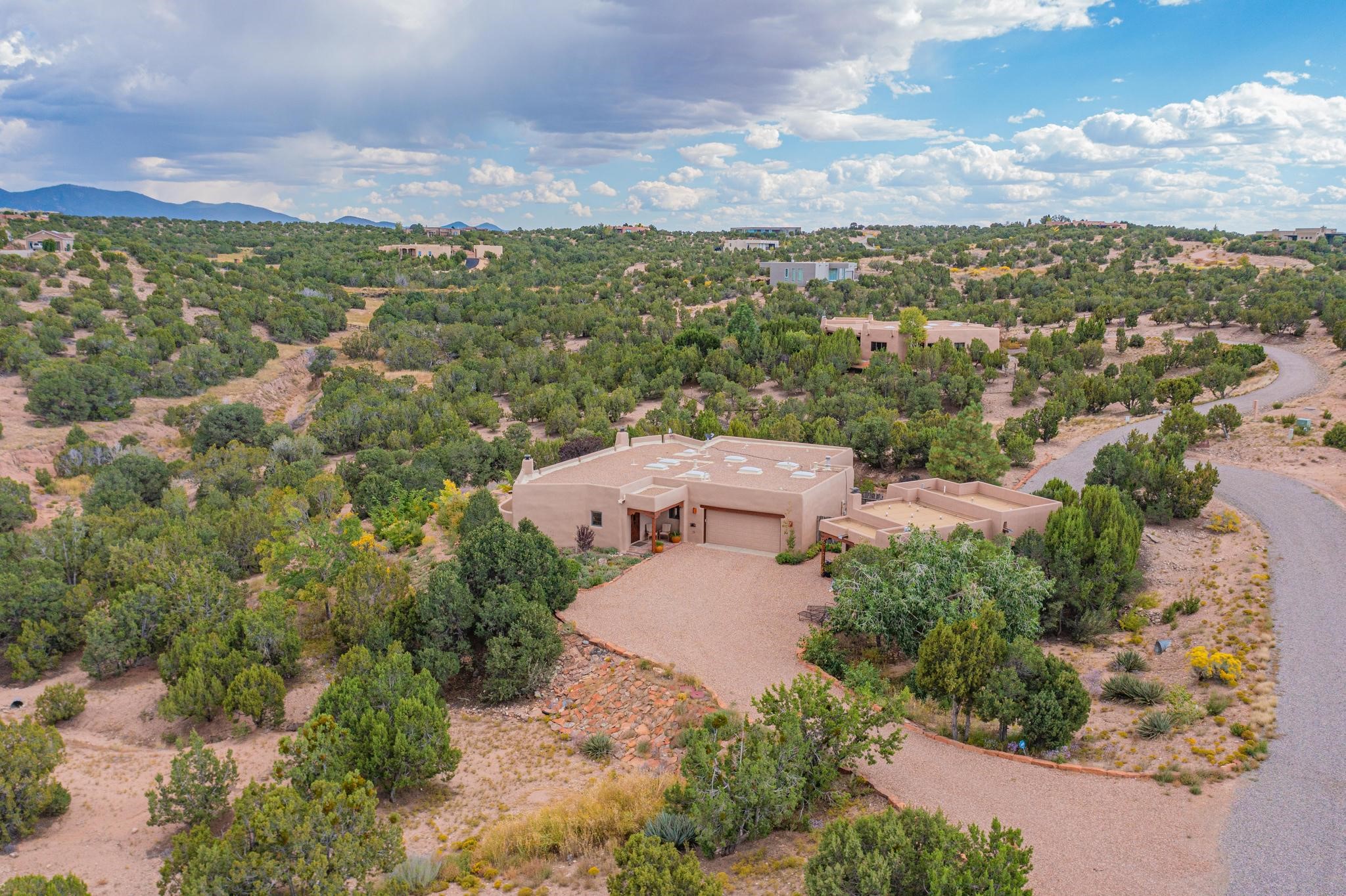 This Pueblo Revival style home features three bedrooms in the main house along with a detached, one-bedroom studio/casita. Situated in the beautiful La Tierra area, this adobe home is set on over two acres of land and is conveniently located just 15 minutes from downtown. The main home, spanning just over 2,000 sq ft, offers a private retreat with an open concept layout, high ceilings, vigas, wood decked ceilings, plastered walls, and two kiva fireplaces. You'll find panoramic views of the Sangre de Cristo Mountains from the large portal off the dining area, which creates a perfect setting for entertaining. The kitchen is well-appointed with a Wolf range, stainless steel appliances, colorful tile, Alder cabinets, and plenty of storage. The property also includes a heated garage for your convenience. The one-bedroom casita features similar finishes and a kiva fireplace, offering flexible options for use.