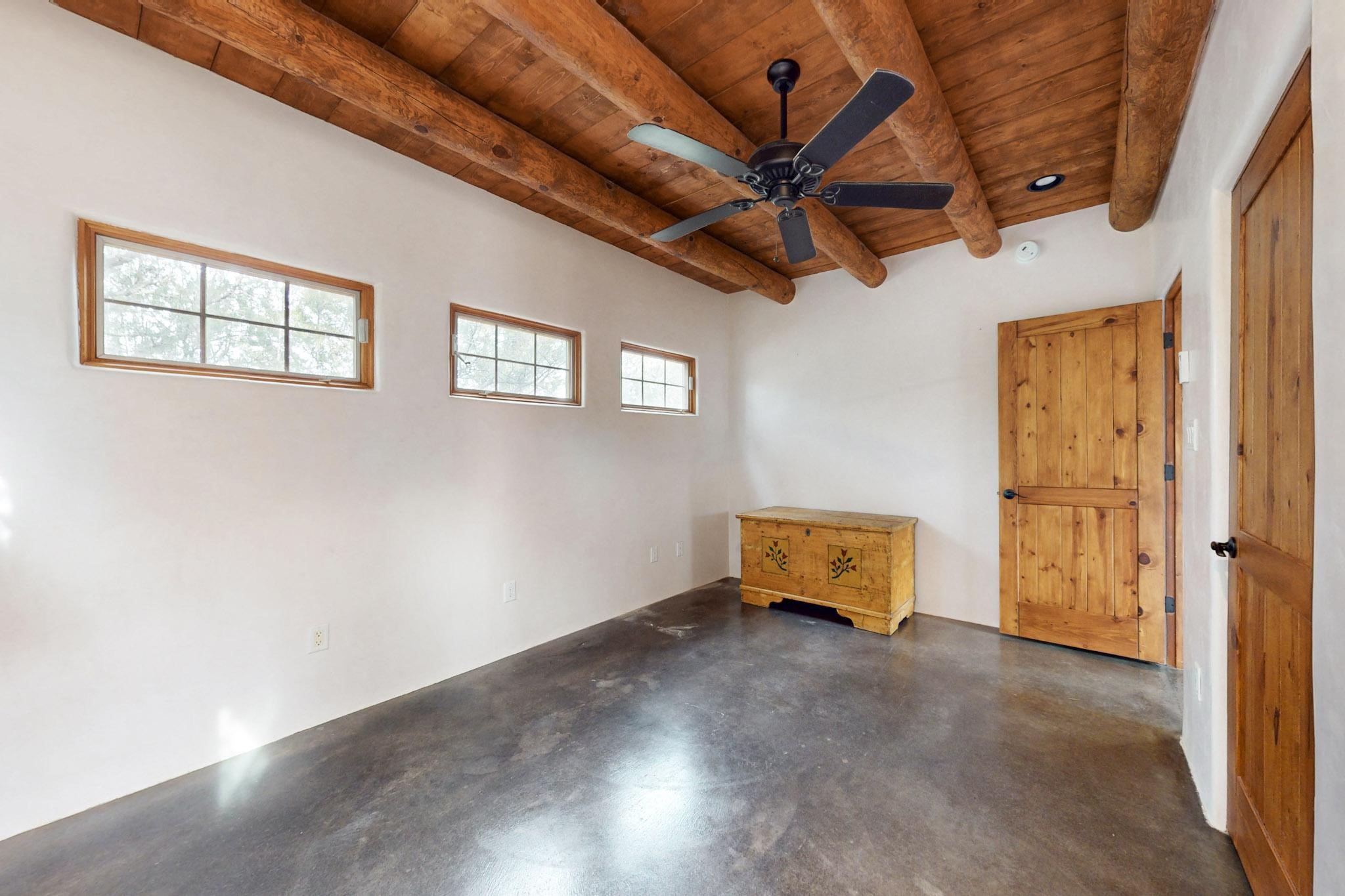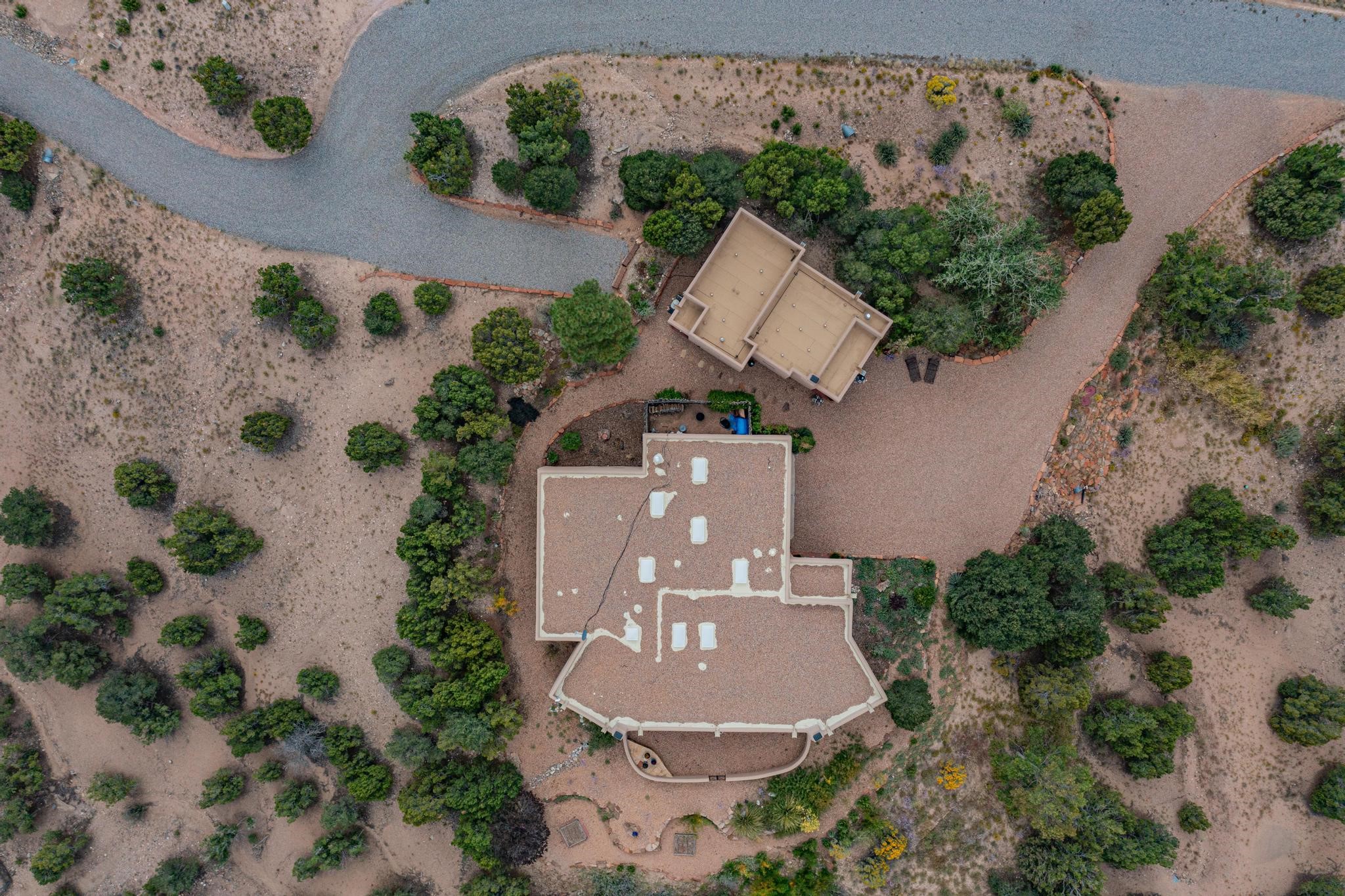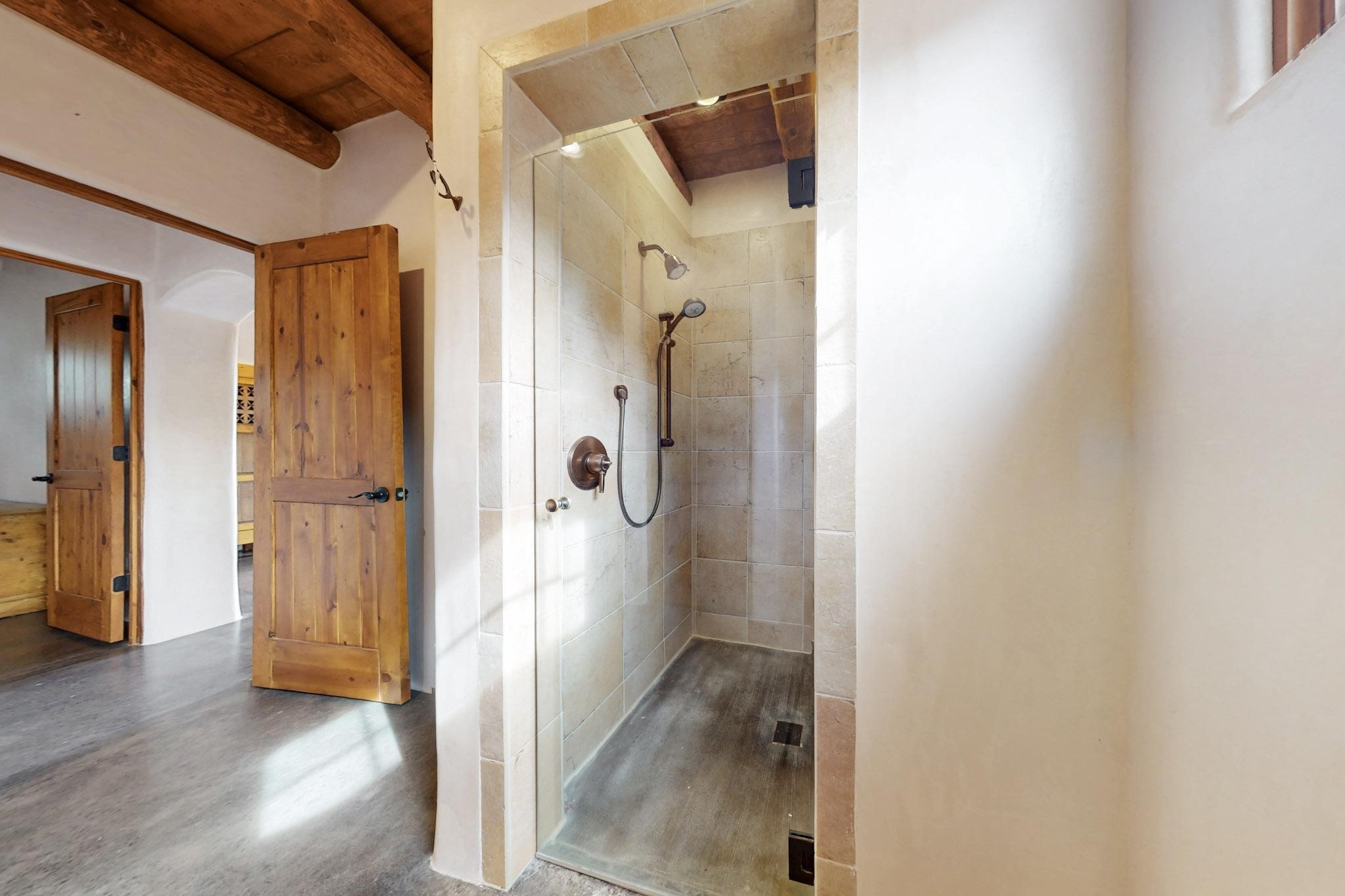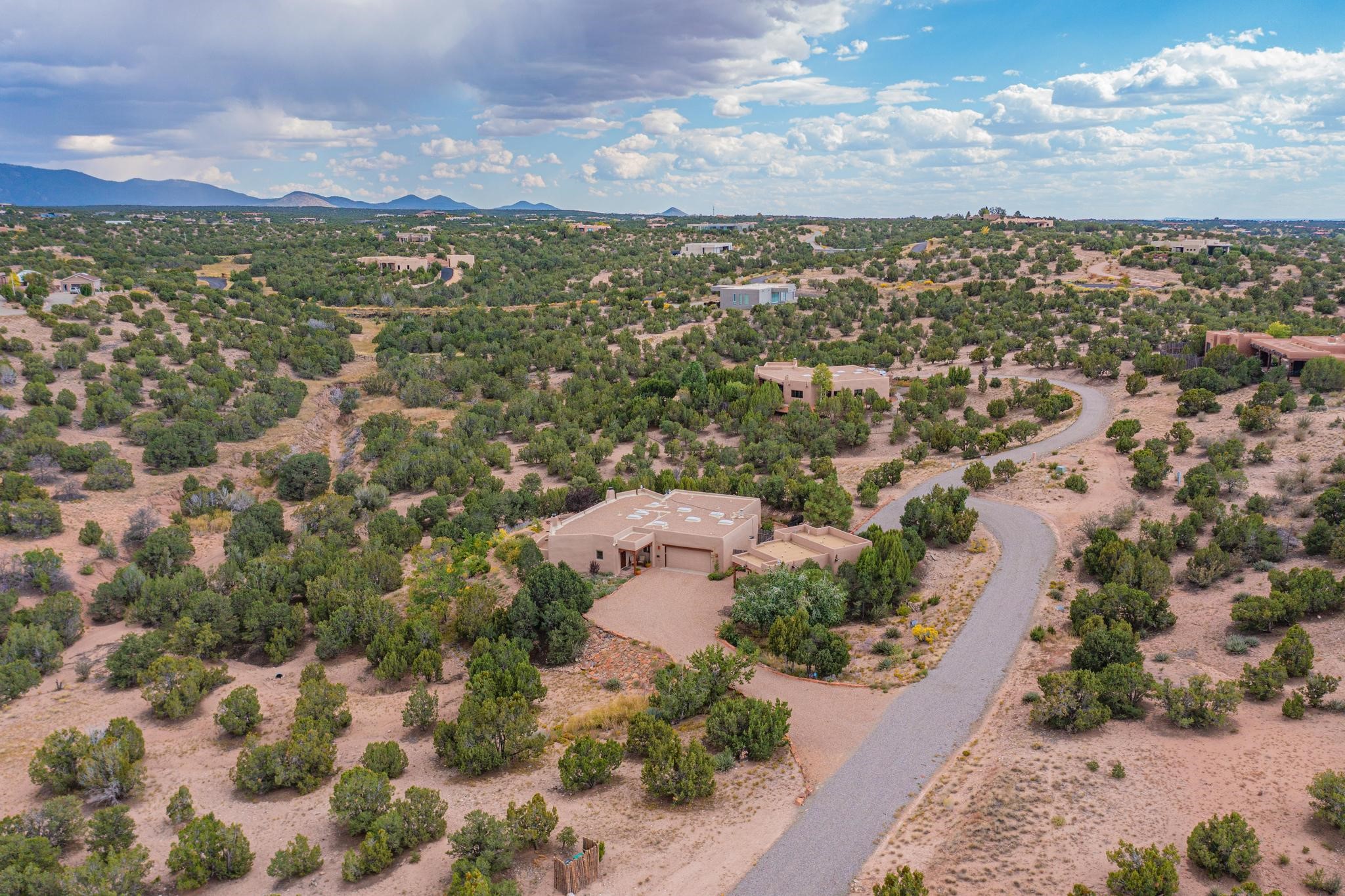 This Pueblo Revival style home features three bedrooms in the main house along with a detached, one-bedroom studio/casita. Situated in the beautiful La Tierra area, this adobe home is set on over two acres of land and is conveniently located just 15 minutes from downtown. The main home, spanning just over 2,000 sq ft, offers a private retreat with an open concept layout, high ceilings, vigas, wood decked ceilings, plastered walls, and two kiva fireplaces. You'll find panoramic views of the Sangre de Cristo Mountains from the large portal off the dining area, which creates a perfect setting for entertaining. The kitchen is well-appointed with a Wolf range, stainless steel appliances, colorful tile, Alder cabinets, and plenty of storage. The property also includes a heated garage for your convenience. The one-bedroom casita features similar finishes and a kiva fireplace, offering flexible options for use.