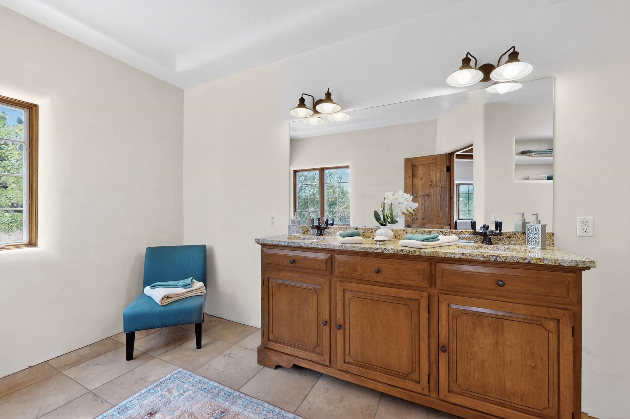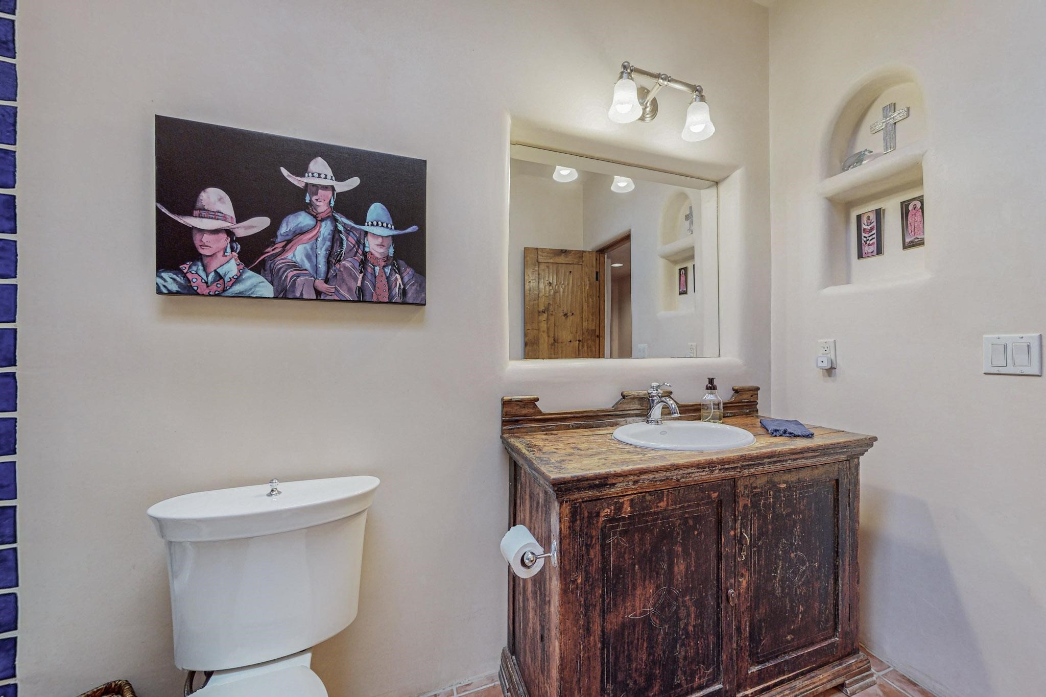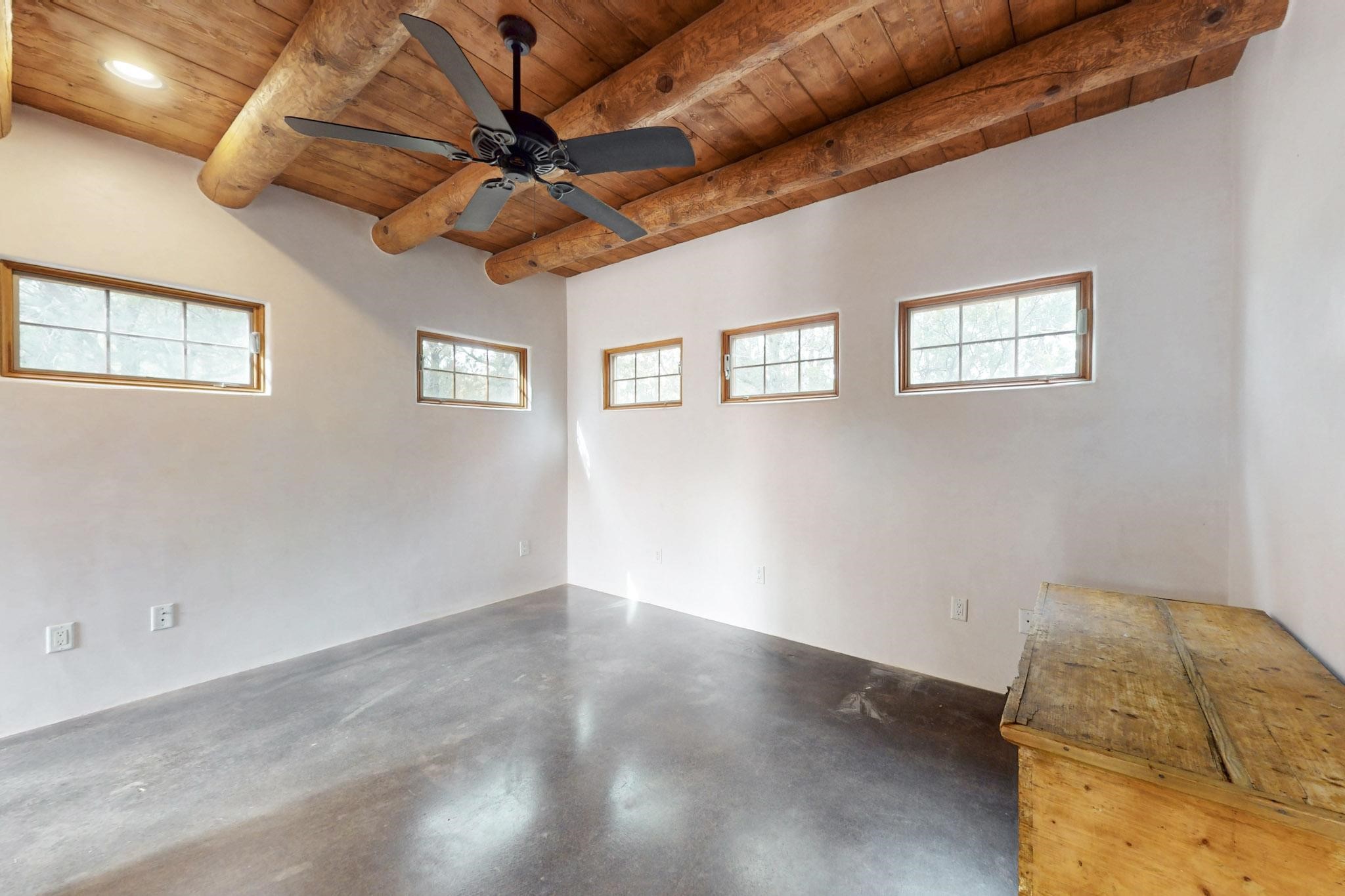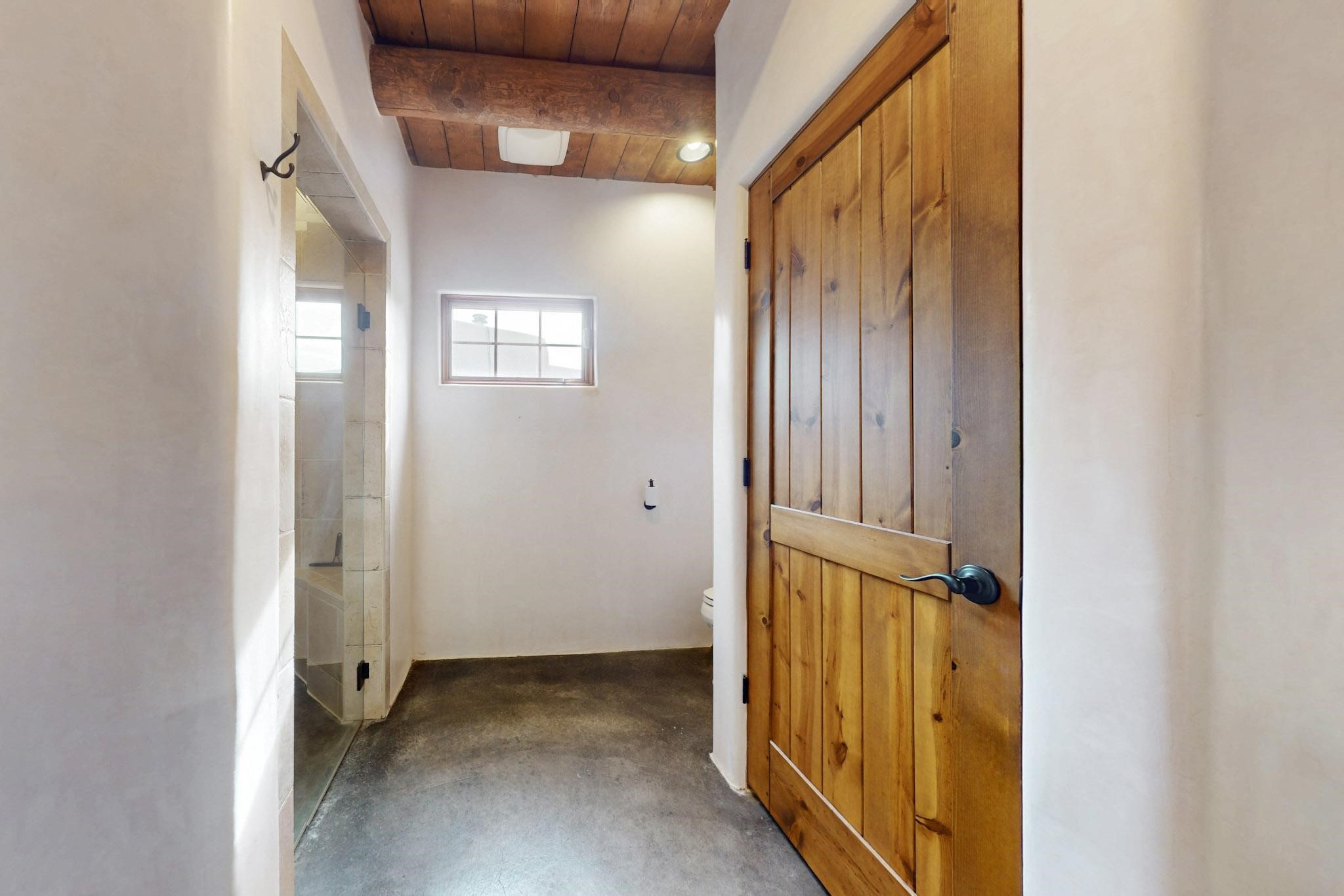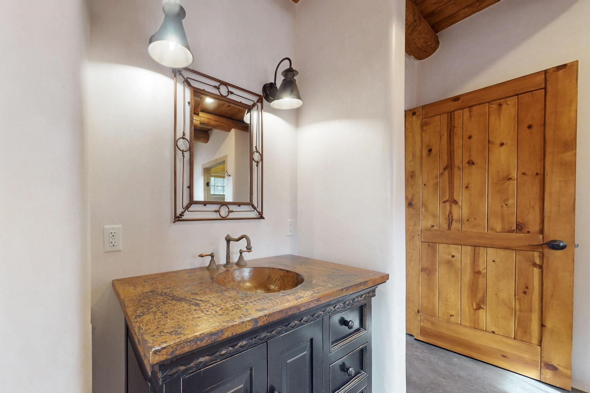This Pueblo Revival style home features three bedrooms in the main house along with a detached, one-bedroom studio/casita. Situated in the beautiful La Tierra area, this adobe home is set on over two acres of land and is conveniently located just 15 minutes from downtown. The main home, spanning just over 2,000 sq ft, offers a private retreat with an open concept layout, high ceilings, vigas, wood decked ceilings, plastered walls, and two kiva fireplaces. You'll find panoramic views of the Sangre de Cristo Mountains from the large portal off the dining area, which creates a perfect setting for entertaining. The kitchen is well-appointed with a Wolf range, stainless steel appliances, colorful tile, Alder cabinets, and plenty of storage. The property also includes a heated garage for your convenience. The one-bedroom casita features similar finishes and a kiva fireplace, offering flexible options for use.