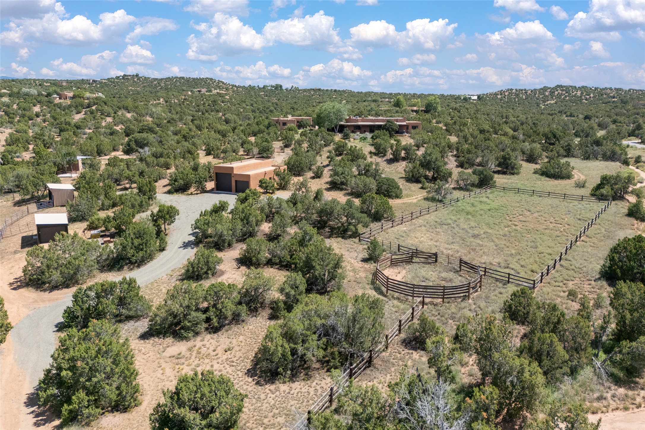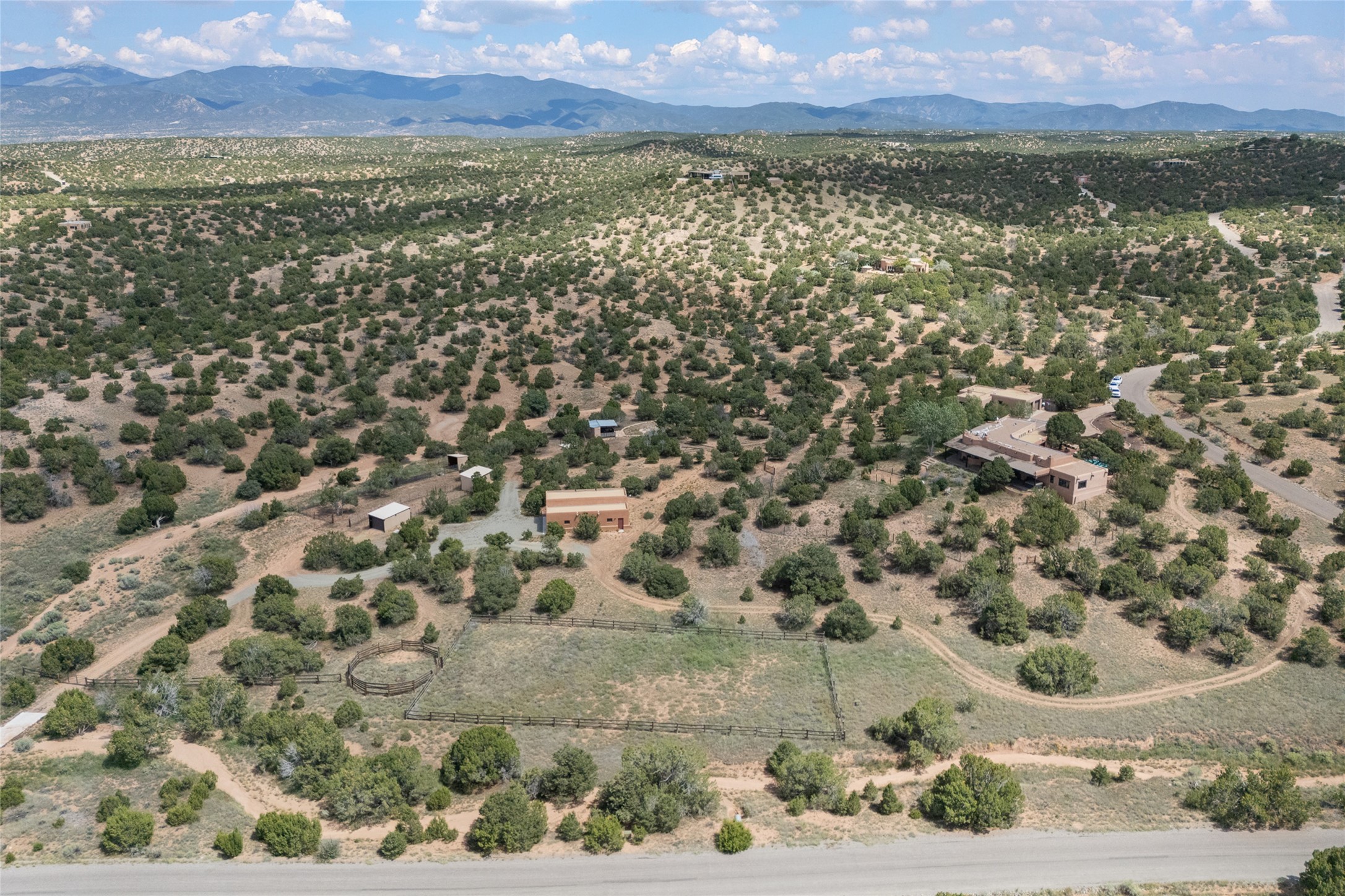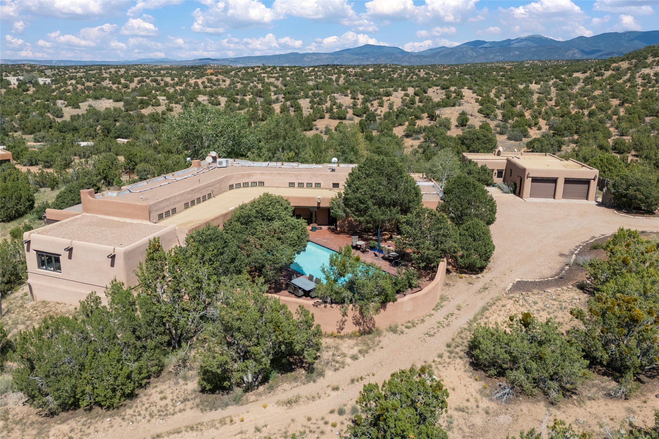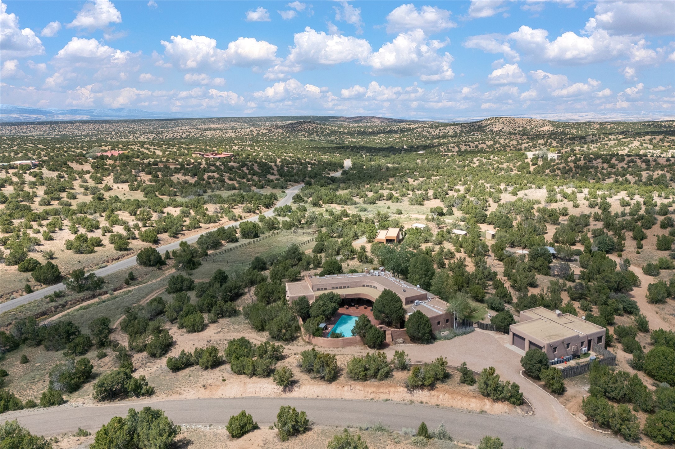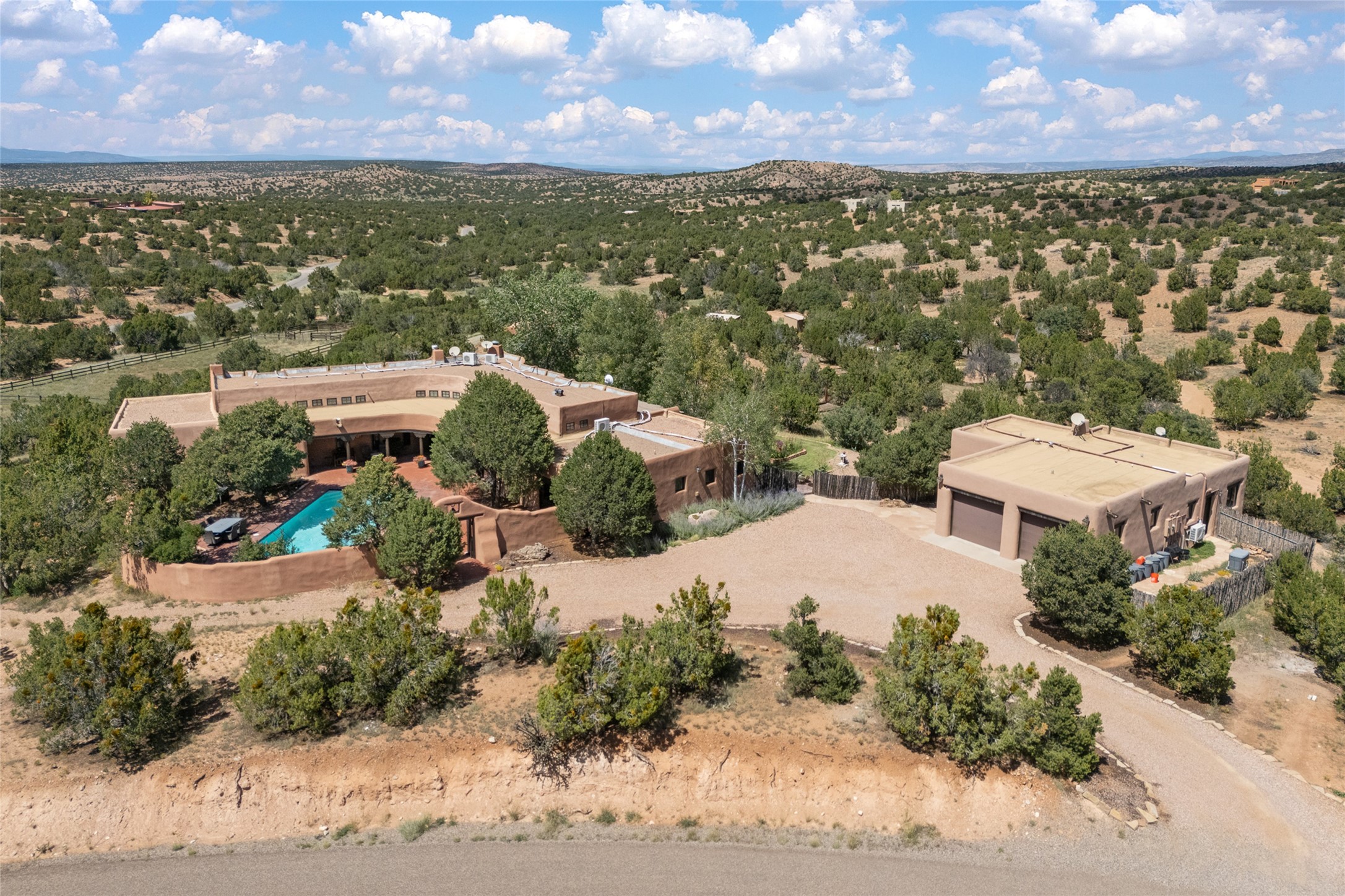 La Querencia is truly a masterful work of art! Built in 1980 with double adobe construction, hand adzed mesquite doors and windows throughout, high coved ceilings with wonderful old vigas, fabulous wrought iron chandeliers, hand cut tin sconces and chandeliers, nichos, curved walls and lovely slate stone tile flooring. It sits on 11.5 horse friendly acres, with an acre of fenced paddock space and tac room as well as proximity to BLM land and huge views to both the Sangre and Jemez mountain ranges. The 4,203 sq ft main house has radiant heat as well as mini splits in all the main rooms for both cooling and heat. Passing through the arched front gate and by the sparkling pool, one enters through magnificent French doors into a large entry/dining room with a fireplace, vigas and latilla ceiling, and views to both sunrise and sunset. Off the entry through incredible tall curved mesquite doors lies the living room with floor to ceiling bookcases, kiva fireplace and 3 sets of French doors opening to the wrap around covered portal for indoor/outdoor living. Down a curved hallway is the primary bedroom suite with an office or sitting space, tall kiva fireplace and large en suite bath with a Japanese soaking tub, spacious shower and his and hers walk in closets. The French doors from the main bedroom open again to the covered portal for nighttime soaking and stargazing from the new Hotspring spa. Down another curved hallway off the entry/dining is a chef's kitchen newly redone with quartz countertops, new cabinets with the same classic cut tin decorative fronts, new sinks, Miele dishwasher, Sub Zero full fridge and freezer. There are also 2 ovens and a 6 burner plus griddle cooktop. The cut tin chandeliers complete the scene and French doors to the covered portal make for easy outdoor grilling and dining. Following the hallway down the other side of the house is the laundry, family/media room and 3 guest bedrooms each with their own bath. The house is oriented around the South facing swimming pool and enclosed courtyard for enjoying protected outdoor seating and swimming. The swimming pool has new pumps, controller and filter, heat pump and sub panel. And the main house has a new boiler, tankless hot water heater and toilets, sinks and faucets have been replaced.The 1297 sq ft 2 bedroom 2 bath casita is pumice poured construction and is nicely separated from the main house for privacy for guests or caretaker, while close to the main 2 car garage. The living space in the guesthouse has great views, kiva fireplace and a new induction cooktop. The two bedrooms each have their own en suite baths, large walk in closets and the second bedroom has outdoor access for privacy for both bedrooms. There is also a new boiler for the radiant heat, tankless hot water heater and mini splits for heat and cooling in all the rooms. A studio/workshop/RV garage was built in 2020 and an extra garage done in 2023 - both close to the horse area. There was also a separate permitted drive added for both RV and horse trailer access. The studio/workshop/ RV garage has Anderson windows and also a mini split for heat and cooling, so could make a very cool artist's studio. The land is beautiful with flower gardens, aspens, fruit trees and a little grassy space all enjoyed off the covered wrap around portal. Don't worry about watering! There is a private well with a new well pit, pressure and pump tank and a whole house generator in case the power goes out, the water won't! This is an incredible estate - spectacular views, profound quiet, friendly neighbors and all about 20 minutes to town!