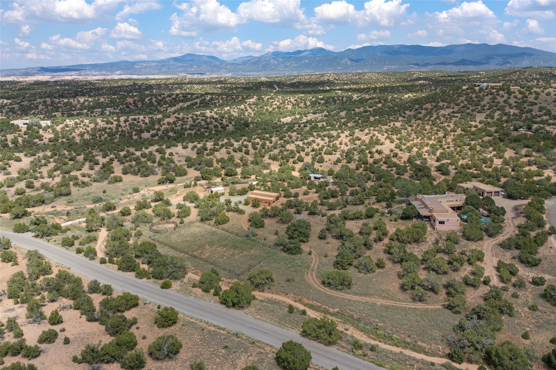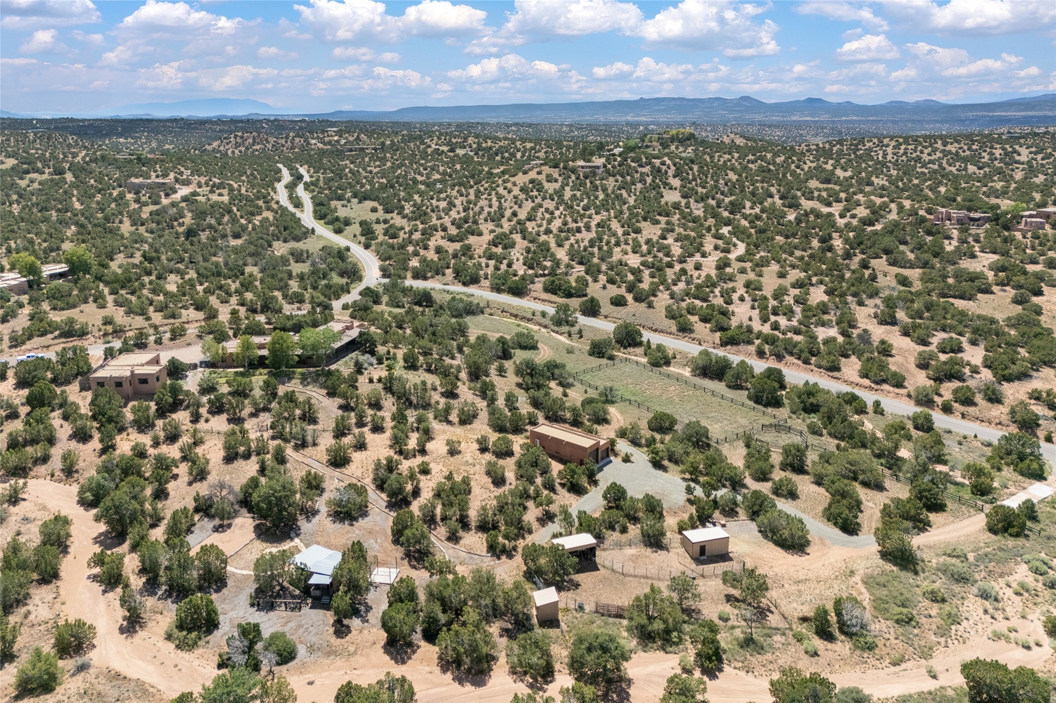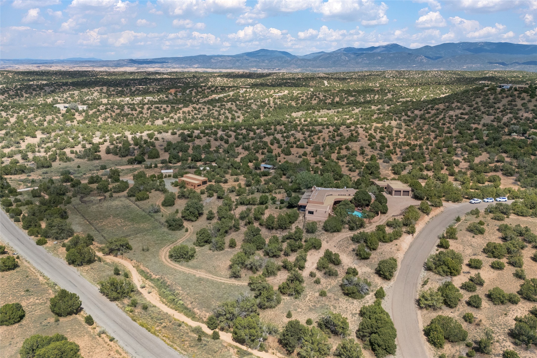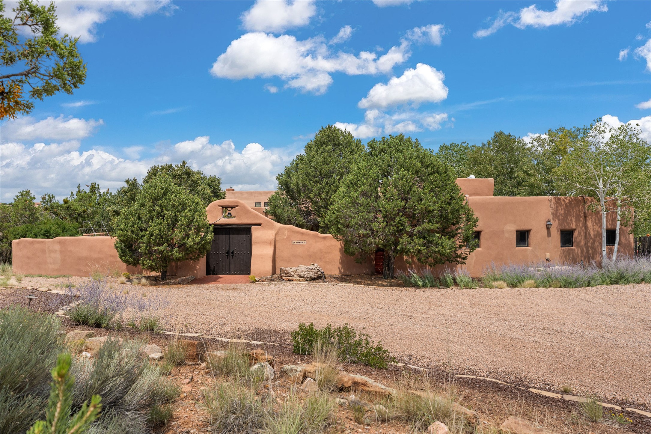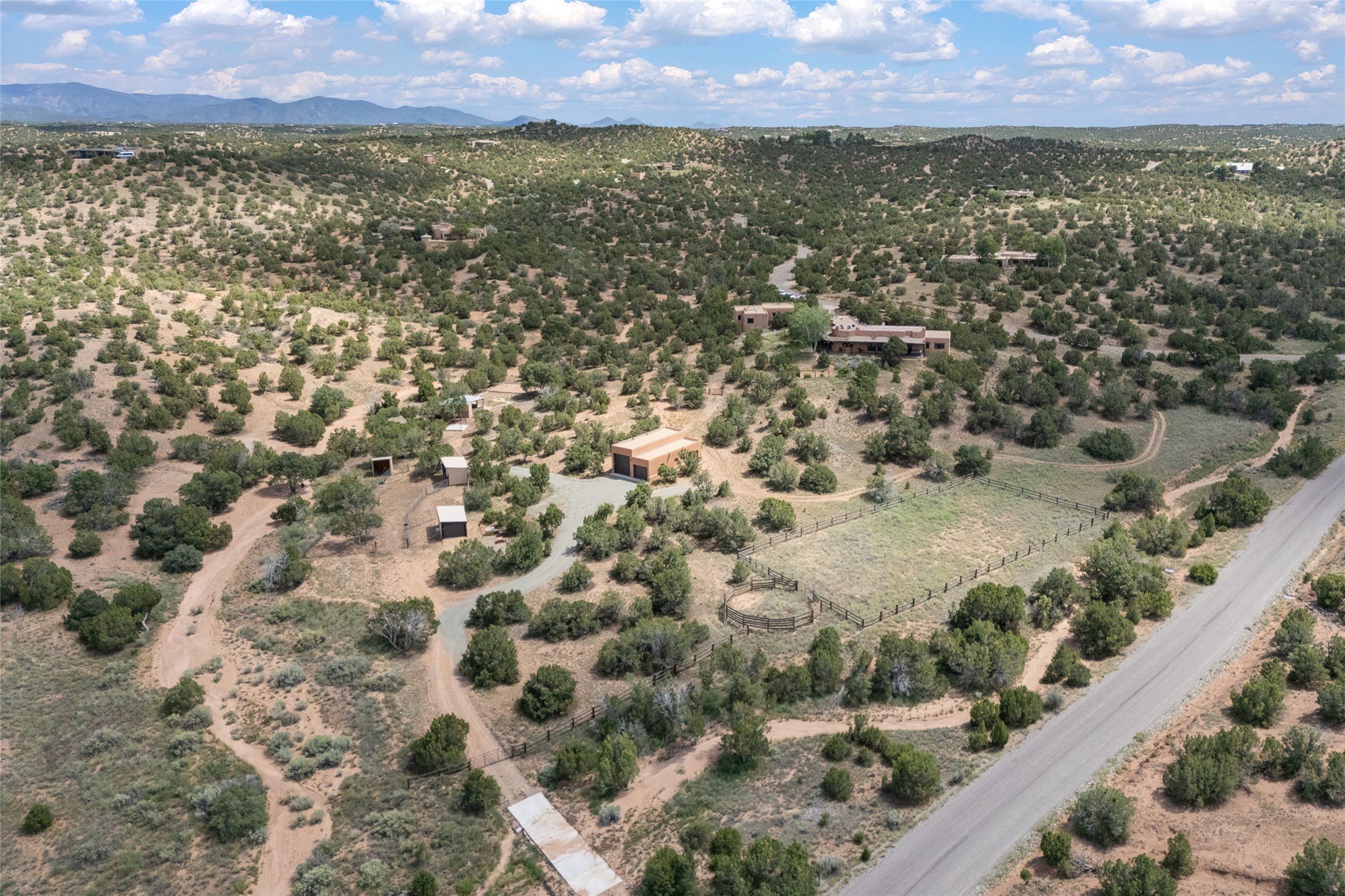 La Querencia is truly a masterful work of art! Built in 1980 with double adobe construction, hand adzed mesquite doors and windows throughout, high coved ceilings with wonderful old vigas, fabulous wrought iron chandeliers, hand cut tin sconces and chandeliers, nichos, curved walls and lovely slate stone tile flooring. It sits on 11.5 horse friendly acres, with an acre of fenced paddock space and tac room as well as proximity to BLM land and huge views to both the Sangre and Jemez mountain ranges. The 4,203 sq ft main house has radiant heat as well as mini splits in all the main rooms for both cooling and heat. Passing through the arched front gate and by the sparkling pool, one enters through magnificent French doors into a large entry/dining room with a fireplace, vigas and latilla ceiling, and views to both sunrise and sunset. Off the entry through incredible tall curved mesquite doors lies the living room with floor to ceiling bookcases, kiva fireplace and 3 sets of French doors opening to the wrap around covered portal for indoor/outdoor living. Down a curved hallway is the primary bedroom suite with an office or sitting space, tall kiva fireplace and large en suite bath with a Japanese soaking tub, spacious shower and his and hers walk in closets. The French doors from the main bedroom open again to the covered portal for nighttime soaking and stargazing from the new Hotspring spa. Down another curved hallway off the entry/dining is a chef's kitchen newly redone with quartz countertops, new cabinets with the same classic cut tin decorative fronts, new sinks, Miele dishwasher, Sub Zero full fridge and freezer. There are also 2 ovens and a 6 burner plus griddle cooktop. The cut tin chandeliers complete the scene and French doors to the covered portal make for easy outdoor grilling and dining. Following the hallway down the other side of the house is the laundry, family/media room and 3 guest bedrooms each with their own bath. The house is oriented around the South facing swimming pool and enclosed courtyard for enjoying protected outdoor seating and swimming. The swimming pool has new pumps, controller and filter, heat pump and sub panel. And the main house has a new boiler, tankless hot water heater and toilets, sinks and faucets have been replaced.The 1297 sq ft 2 bedroom 2 bath casita is pumice poured construction and is nicely separated from the main house for privacy for guests or caretaker, while close to the main 2 car garage. The living space in the guesthouse has great views, kiva fireplace and a new induction cooktop. The two bedrooms each have their own en suite baths, large walk in closets and the second bedroom has outdoor access for privacy for both bedrooms. There is also a new boiler for the radiant heat, tankless hot water heater and mini splits for heat and cooling in all the rooms. A studio/workshop/RV garage was built in 2020 and an extra garage done in 2023 - both close to the horse area. There was also a separate permitted drive added for both RV and horse trailer access. The studio/workshop/ RV garage has Anderson windows and also a mini split for heat and cooling, so could make a very cool artist's studio. The land is beautiful with flower gardens, aspens, fruit trees and a little grassy space all enjoyed off the covered wrap around portal. Don't worry about watering! There is a private well with a new well pit, pressure and pump tank and a whole house generator in case the power goes out, the water won't! This is an incredible estate - spectacular views, profound quiet, friendly neighbors and all about 20 minutes to town!