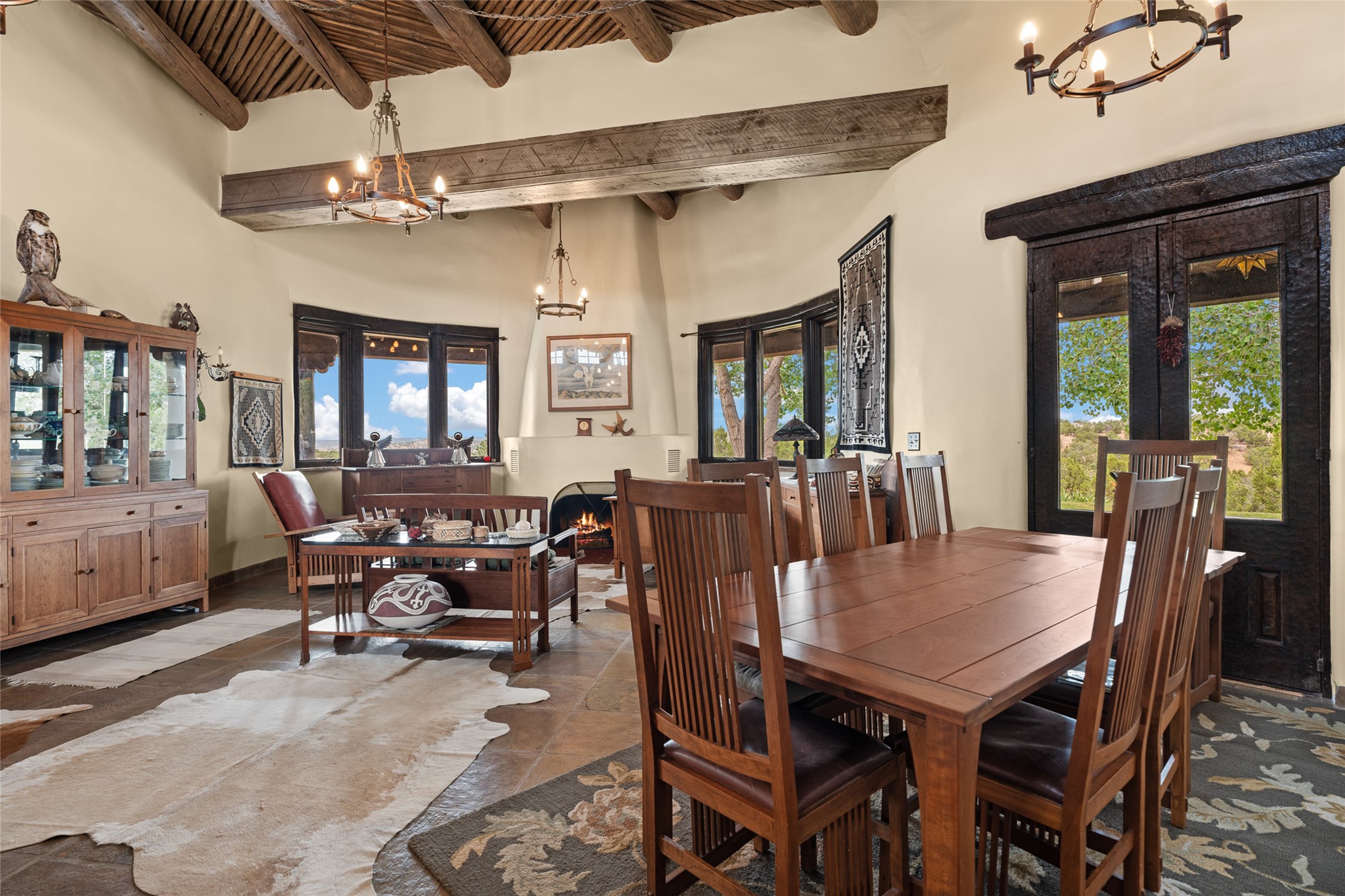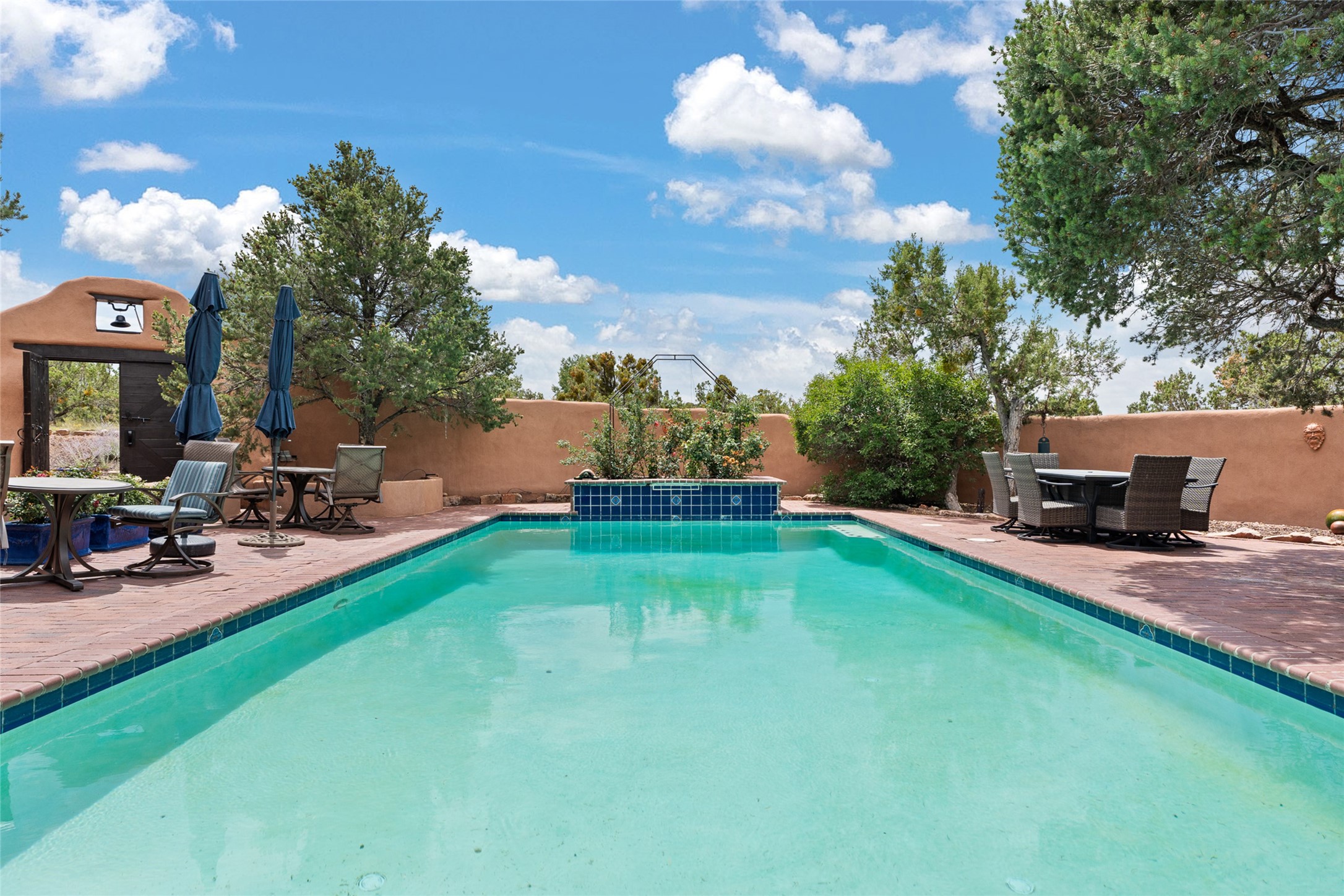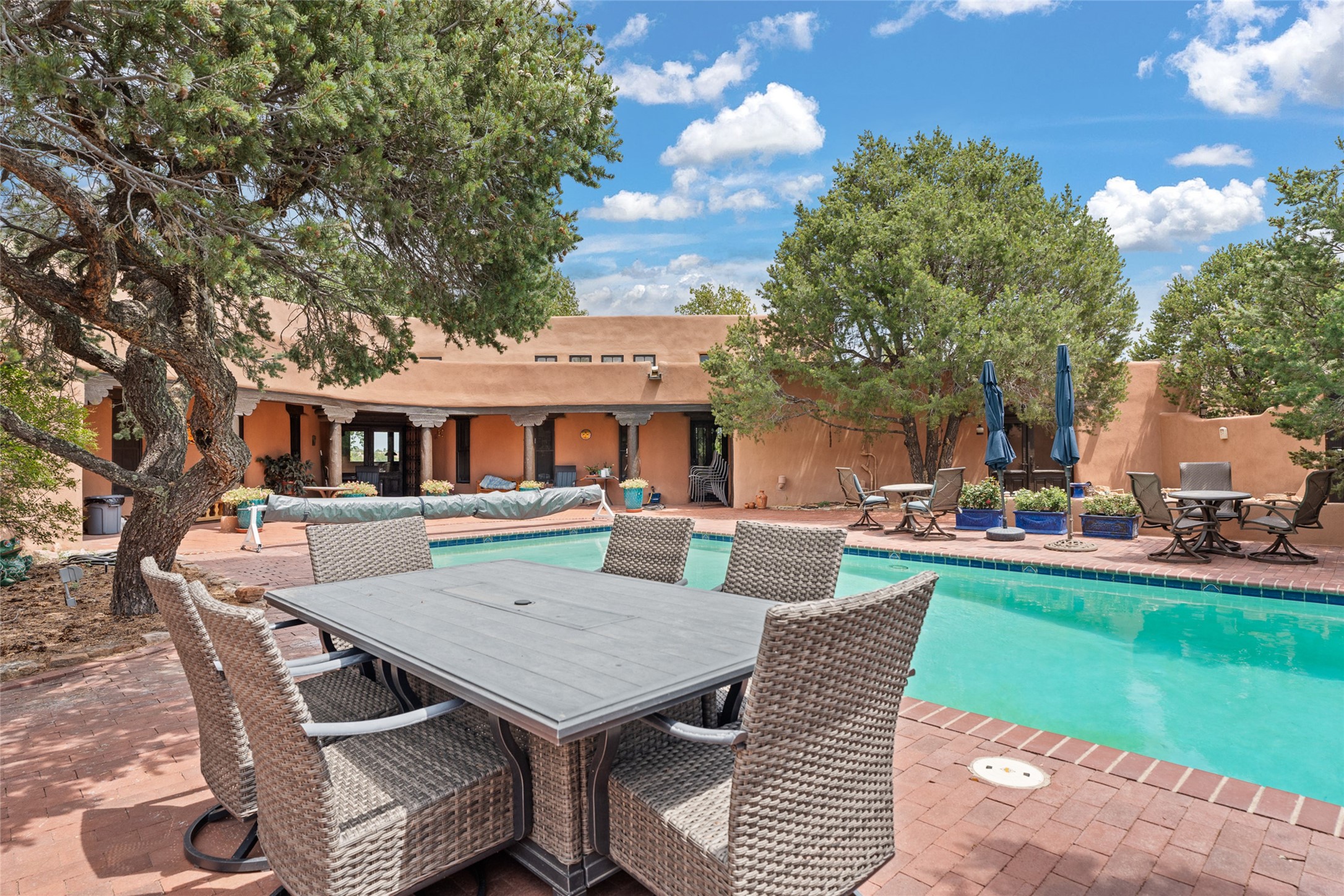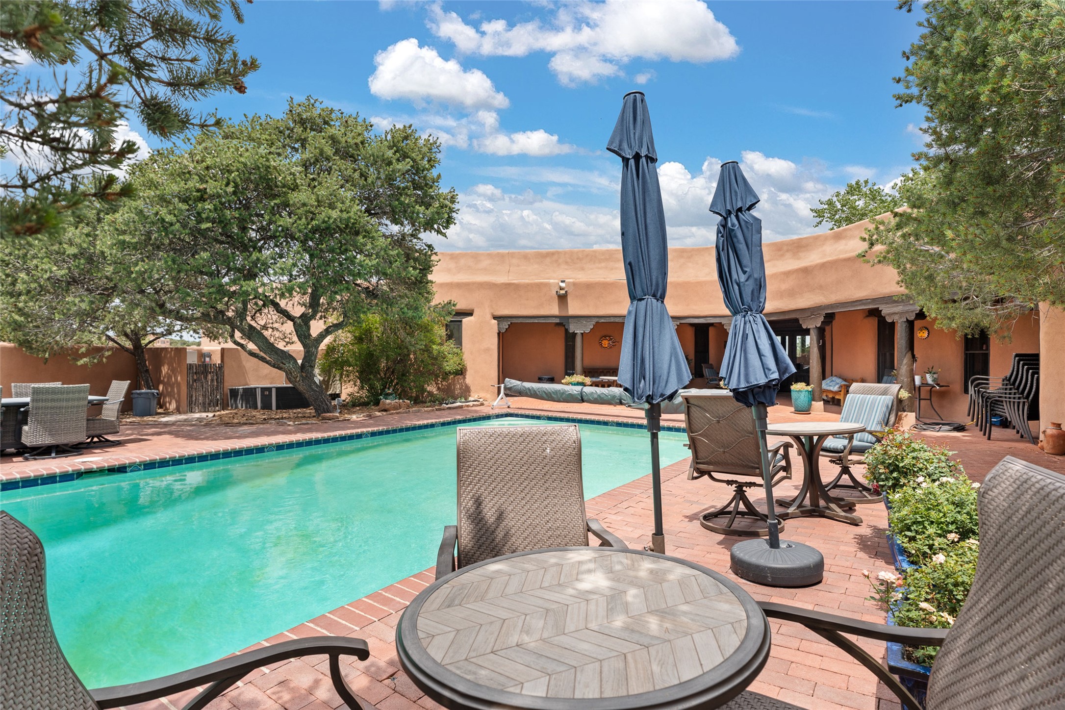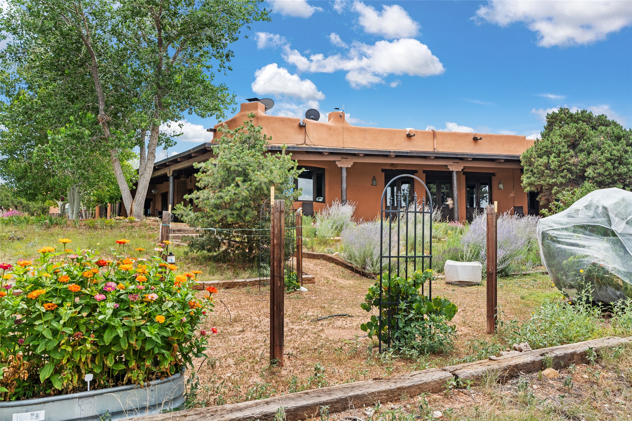 La Querencia is truly a masterful work of art! Built in 1980 with double adobe construction, hand adzed mesquite doors and windows throughout, high coved ceilings with wonderful old vigas, fabulous wrought iron chandeliers, hand cut tin sconces and chandeliers, nichos, curved walls and lovely slate stone tile flooring. It sits on 11.5 horse friendly acres, with an acre of fenced paddock space and tac room as well as proximity to BLM land and huge views to both the Sangre and Jemez mountain ranges. The 4,203 sq ft main house has radiant heat as well as mini splits in all the main rooms for both cooling and heat. Passing through the arched front gate and by the sparkling pool, one enters through magnificent French doors into a large entry/dining room with a fireplace, vigas and latilla ceiling, and views to both sunrise and sunset. Off the entry through incredible tall curved mesquite doors lies the living room with floor to ceiling bookcases, kiva fireplace and 3 sets of French doors opening to the wrap around covered portal for indoor/outdoor living. Down a curved hallway is the primary bedroom suite with an office or sitting space, tall kiva fireplace and large en suite bath with a Japanese soaking tub, spacious shower and his and hers walk in closets. The French doors from the main bedroom open again to the covered portal for nighttime soaking and stargazing from the new Hotspring spa. Down another curved hallway off the entry/dining is a chef's kitchen newly redone with quartz countertops, new cabinets with the same classic cut tin decorative fronts, new sinks, Miele dishwasher, Sub Zero full fridge and freezer. There are also 2 ovens and a 6 burner plus griddle cooktop. The cut tin chandeliers complete the scene and French doors to the covered portal make for easy outdoor grilling and dining. Following the hallway down the other side of the house is the laundry, family/media room and 3 guest bedrooms each with their own bath. The house is oriented around the South facing swimming pool and enclosed courtyard for enjoying protected outdoor seating and swimming. The swimming pool has new pumps, controller and filter, heat pump and sub panel. And the main house has a new boiler, tankless hot water heater and toilets, sinks and faucets have been replaced.The 1297 sq ft 2 bedroom 2 bath casita is pumice poured construction and is nicely separated from the main house for privacy for guests or caretaker, while close to the main 2 car garage. The living space in the guesthouse has great views, kiva fireplace and a new induction cooktop. The two bedrooms each have their own en suite baths, large walk in closets and the second bedroom has outdoor access for privacy for both bedrooms. There is also a new boiler for the radiant heat, tankless hot water heater and mini splits for heat and cooling in all the rooms. A studio/workshop/RV garage was built in 2020 and an extra garage done in 2023 - both close to the horse area. There was also a separate permitted drive added for both RV and horse trailer access. The studio/workshop/ RV garage has Anderson windows and also a mini split for heat and cooling, so could make a very cool artist's studio. The land is beautiful with flower gardens, aspens, fruit trees and a little grassy space all enjoyed off the covered wrap around portal. Don't worry about watering! There is a private well with a new well pit, pressure and pump tank and a whole house generator in case the power goes out, the water won't! This is an incredible estate - spectacular views, profound quiet, friendly neighbors and all about 20 minutes to town!