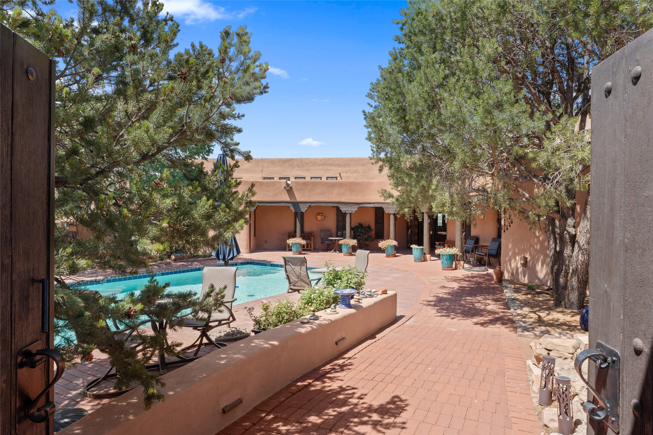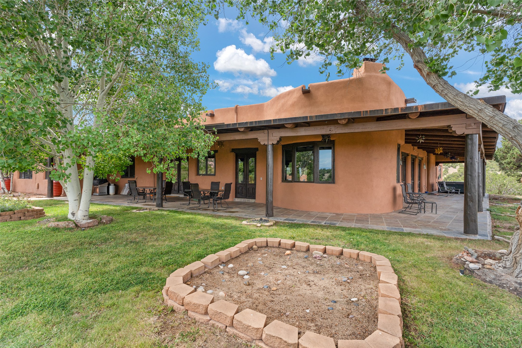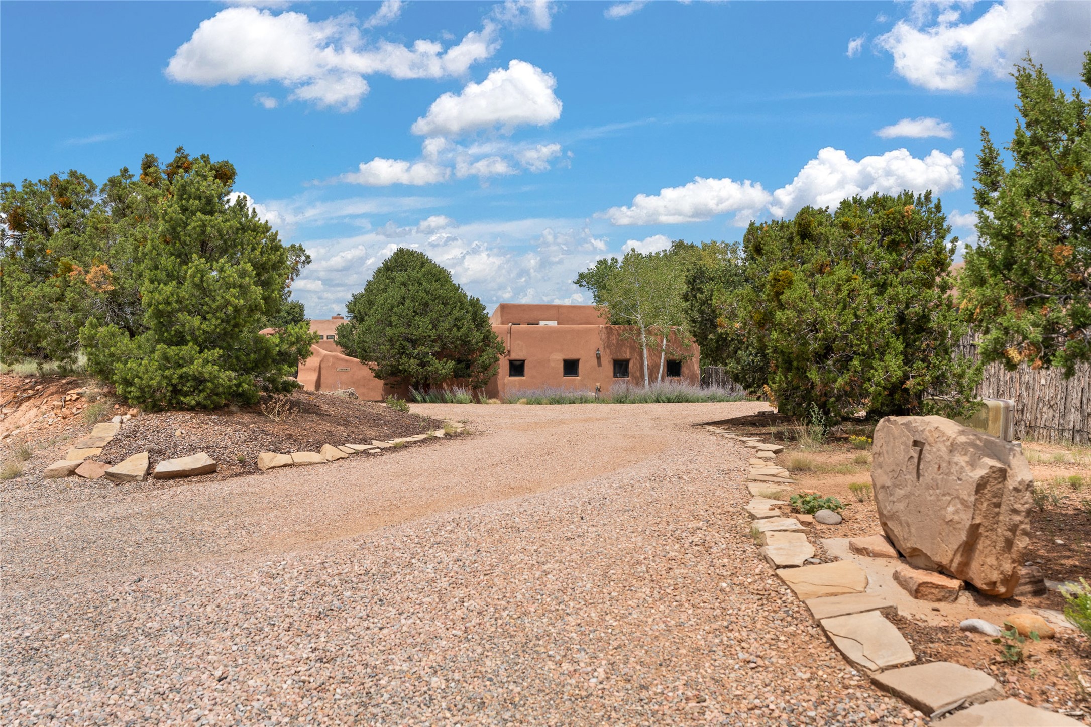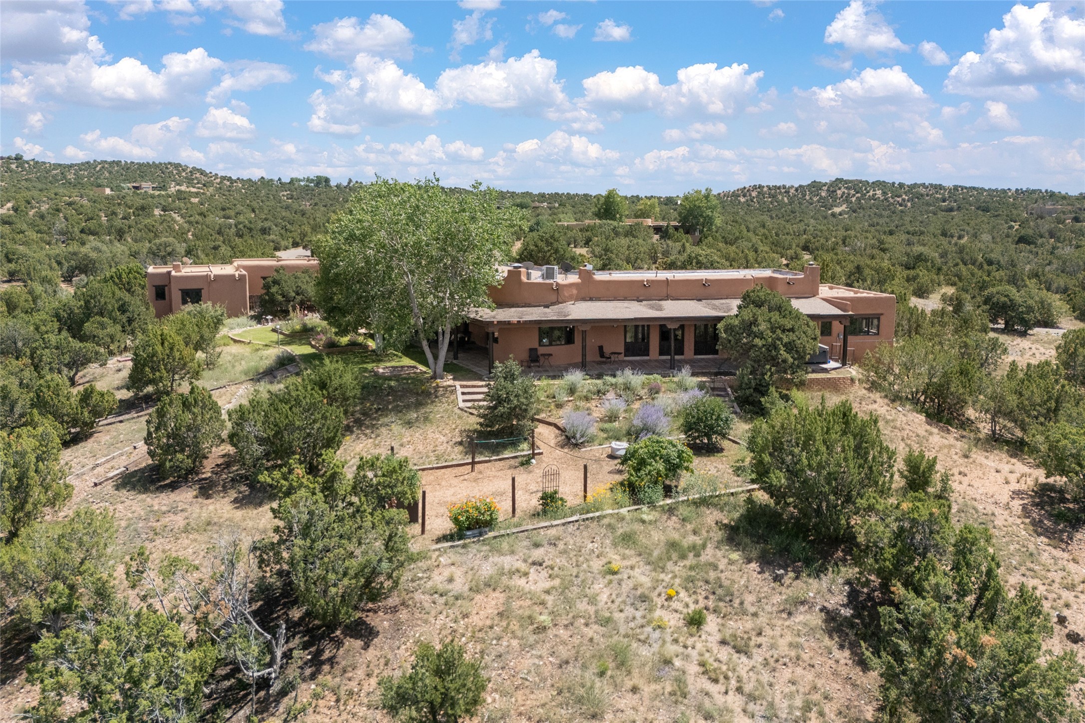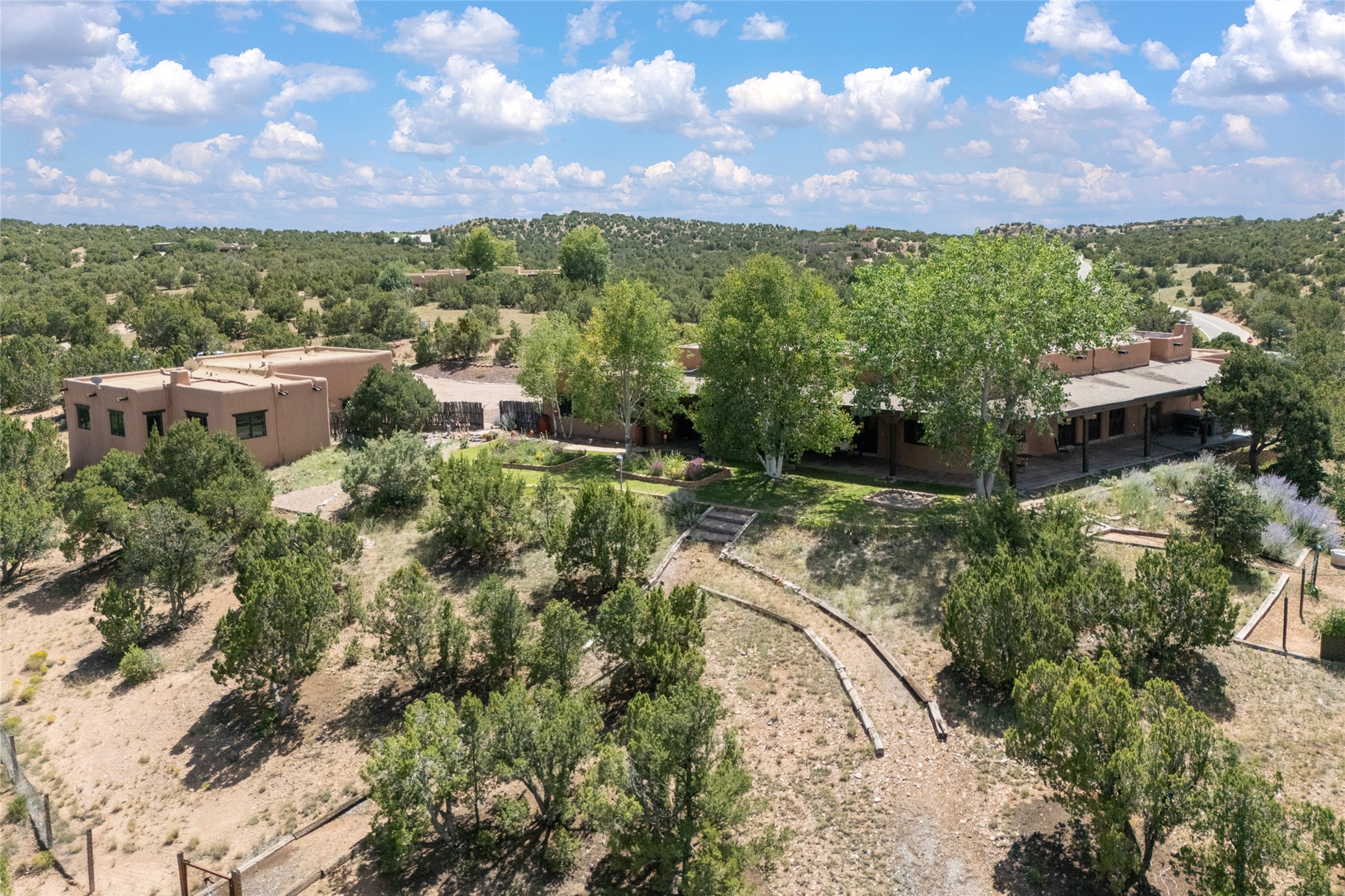 La Querencia is truly a masterful work of art! Built in 1980 with double adobe construction, hand adzed mesquite doors and windows throughout, high coved ceilings with wonderful old vigas, fabulous wrought iron chandeliers, hand cut tin sconces and chandeliers, nichos, curved walls and lovely slate stone tile flooring. It sits on 11.5 horse friendly acres, with an acre of fenced paddock space and tac room as well as proximity to BLM land and huge views to both the Sangre and Jemez mountain ranges. The 4,203 sq ft main house has radiant heat as well as mini splits in all the main rooms for both cooling and heat. Passing through the arched front gate and by the sparkling pool, one enters through magnificent French doors into a large entry/dining room with a fireplace, vigas and latilla ceiling, and views to both sunrise and sunset. Off the entry through incredible tall curved mesquite doors lies the living room with floor to ceiling bookcases, kiva fireplace and 3 sets of French doors opening to the wrap around covered portal for indoor/outdoor living. Down a curved hallway is the primary bedroom suite with an office or sitting space, tall kiva fireplace and large en suite bath with a Japanese soaking tub, spacious shower and his and hers walk in closets. The French doors from the main bedroom open again to the covered portal for nighttime soaking and stargazing from the new Hotspring spa. Down another curved hallway off the entry/dining is a chef's kitchen newly redone with quartz countertops, new cabinets with the same classic cut tin decorative fronts, new sinks, Miele dishwasher, Sub Zero full fridge and freezer. There are also 2 ovens and a 6 burner plus griddle cooktop. The cut tin chandeliers complete the scene and French doors to the covered portal make for easy outdoor grilling and dining. Following the hallway down the other side of the house is the laundry, family/media room and 3 guest bedrooms each with their own bath. The house is oriented around the South facing swimming pool and enclosed courtyard for enjoying protected outdoor seating and swimming. The swimming pool has new pumps, controller and filter, heat pump and sub panel. And the main house has a new boiler, tankless hot water heater and toilets, sinks and faucets have been replaced.The 1297 sq ft 2 bedroom 2 bath casita is pumice poured construction and is nicely separated from the main house for privacy for guests or caretaker, while close to the main 2 car garage. The living space in the guesthouse has great views, kiva fireplace and a new induction cooktop. The two bedrooms each have their own en suite baths, large walk in closets and the second bedroom has outdoor access for privacy for both bedrooms. There is also a new boiler for the radiant heat, tankless hot water heater and mini splits for heat and cooling in all the rooms. A studio/workshop/RV garage was built in 2020 and an extra garage done in 2023 - both close to the horse area. There was also a separate permitted drive added for both RV and horse trailer access. The studio/workshop/ RV garage has Anderson windows and also a mini split for heat and cooling, so could make a very cool artist's studio. The land is beautiful with flower gardens, aspens, fruit trees and a little grassy space all enjoyed off the covered wrap around portal. Don't worry about watering! There is a private well with a new well pit, pressure and pump tank and a whole house generator in case the power goes out, the water won't! This is an incredible estate - spectacular views, profound quiet, friendly neighbors and all about 20 minutes to town!