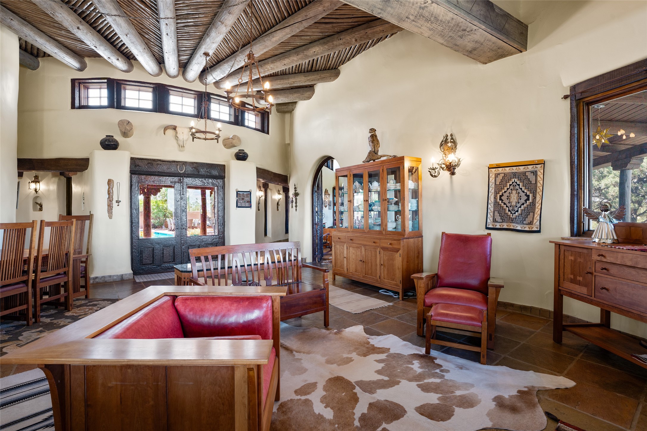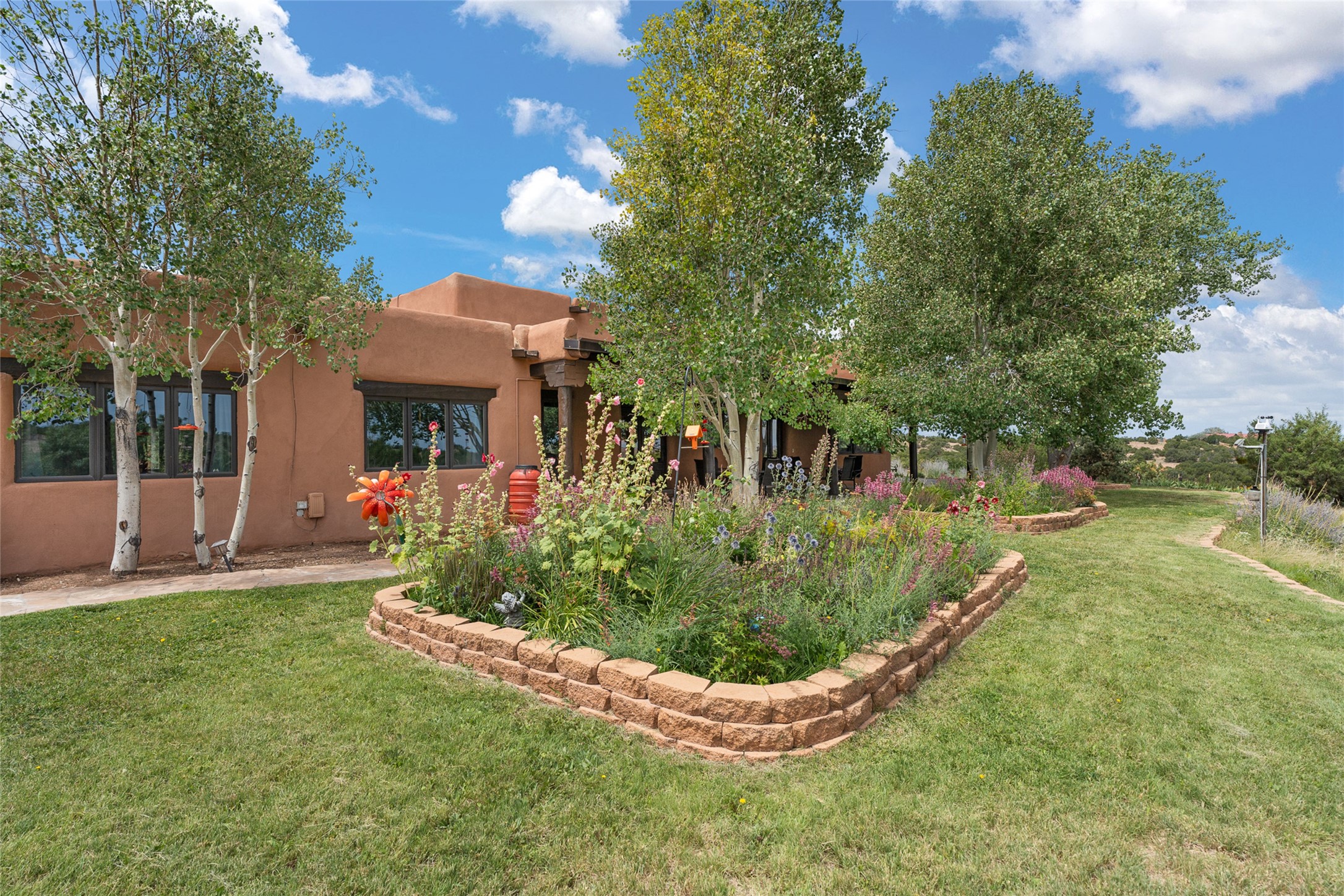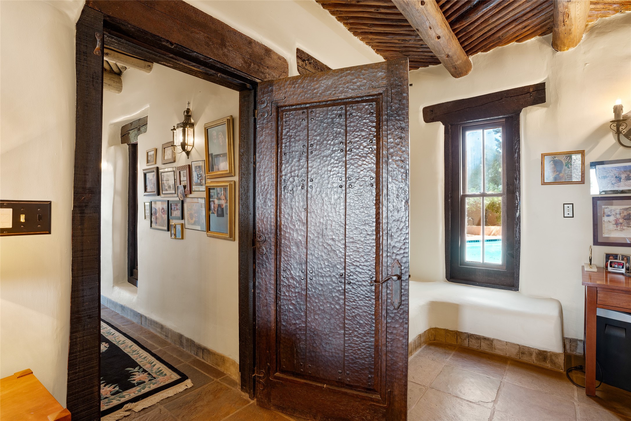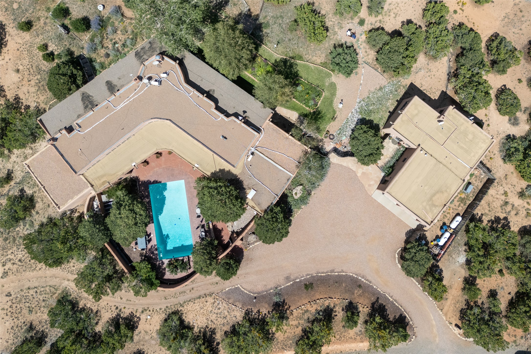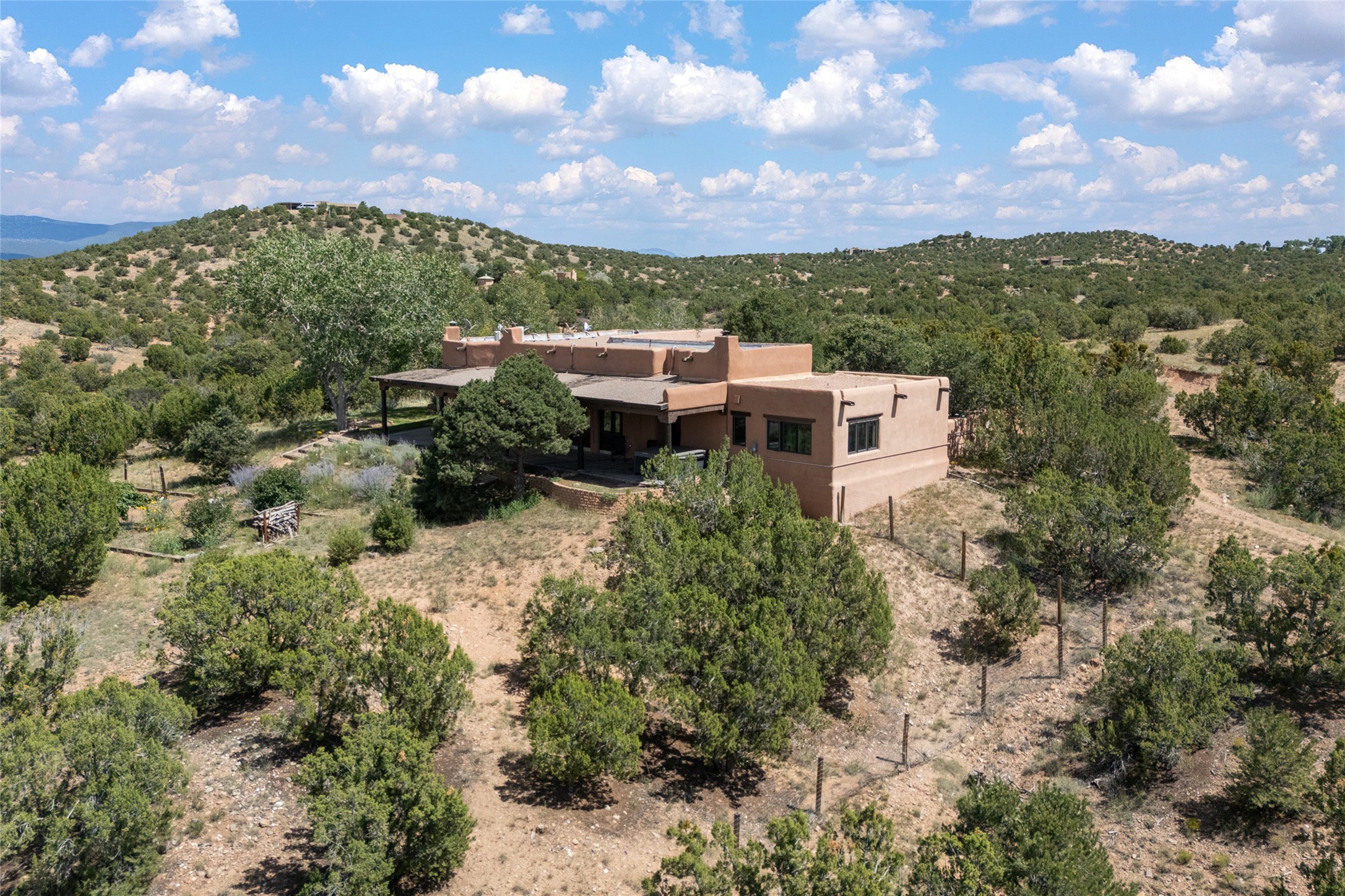 La Querencia is truly a masterful work of art! Built in 1980 with double adobe construction, hand adzed mesquite doors and windows throughout, high coved ceilings with wonderful old vigas, fabulous wrought iron chandeliers, hand cut tin sconces and chandeliers, nichos, curved walls and lovely slate stone tile flooring. It sits on 11.5 horse friendly acres, with an acre of fenced paddock space and tac room as well as proximity to BLM land and huge views to both the Sangre and Jemez mountain ranges. The 4,203 sq ft main house has radiant heat as well as mini splits in all the main rooms for both cooling and heat. Passing through the arched front gate and by the sparkling pool, one enters through magnificent French doors into a large entry/dining room with a fireplace, vigas and latilla ceiling, and views to both sunrise and sunset. Off the entry through incredible tall curved mesquite doors lies the living room with floor to ceiling bookcases, kiva fireplace and 3 sets of French doors opening to the wrap around covered portal for indoor/outdoor living. Down a curved hallway is the primary bedroom suite with an office or sitting space, tall kiva fireplace and large en suite bath with a Japanese soaking tub, spacious shower and his and hers walk in closets. The French doors from the main bedroom open again to the covered portal for nighttime soaking and stargazing from the new Hotspring spa. Down another curved hallway off the entry/dining is a chef's kitchen newly redone with quartz countertops, new cabinets with the same classic cut tin decorative fronts, new sinks, Miele dishwasher, Sub Zero full fridge and freezer. There are also 2 ovens and a 6 burner plus griddle cooktop. The cut tin chandeliers complete the scene and French doors to the covered portal make for easy outdoor grilling and dining. Following the hallway down the other side of the house is the laundry, family/media room and 3 guest bedrooms each with their own bath. The house is oriented around the South facing swimming pool and enclosed courtyard for enjoying protected outdoor seating and swimming. The swimming pool has new pumps, controller and filter, heat pump and sub panel. And the main house has a new boiler, tankless hot water heater and toilets, sinks and faucets have been replaced.The 1297 sq ft 2 bedroom 2 bath casita is pumice poured construction and is nicely separated from the main house for privacy for guests or caretaker, while close to the main 2 car garage. The living space in the guesthouse has great views, kiva fireplace and a new induction cooktop. The two bedrooms each have their own en suite baths, large walk in closets and the second bedroom has outdoor access for privacy for both bedrooms. There is also a new boiler for the radiant heat, tankless hot water heater and mini splits for heat and cooling in all the rooms. A studio/workshop/RV garage was built in 2020 and an extra garage done in 2023 - both close to the horse area. There was also a separate permitted drive added for both RV and horse trailer access. The studio/workshop/ RV garage has Anderson windows and also a mini split for heat and cooling, so could make a very cool artist's studio. The land is beautiful with flower gardens, aspens, fruit trees and a little grassy space all enjoyed off the covered wrap around portal. Don't worry about watering! There is a private well with a new well pit, pressure and pump tank and a whole house generator in case the power goes out, the water won't! This is an incredible estate - spectacular views, profound quiet, friendly neighbors and all about 20 minutes to town!