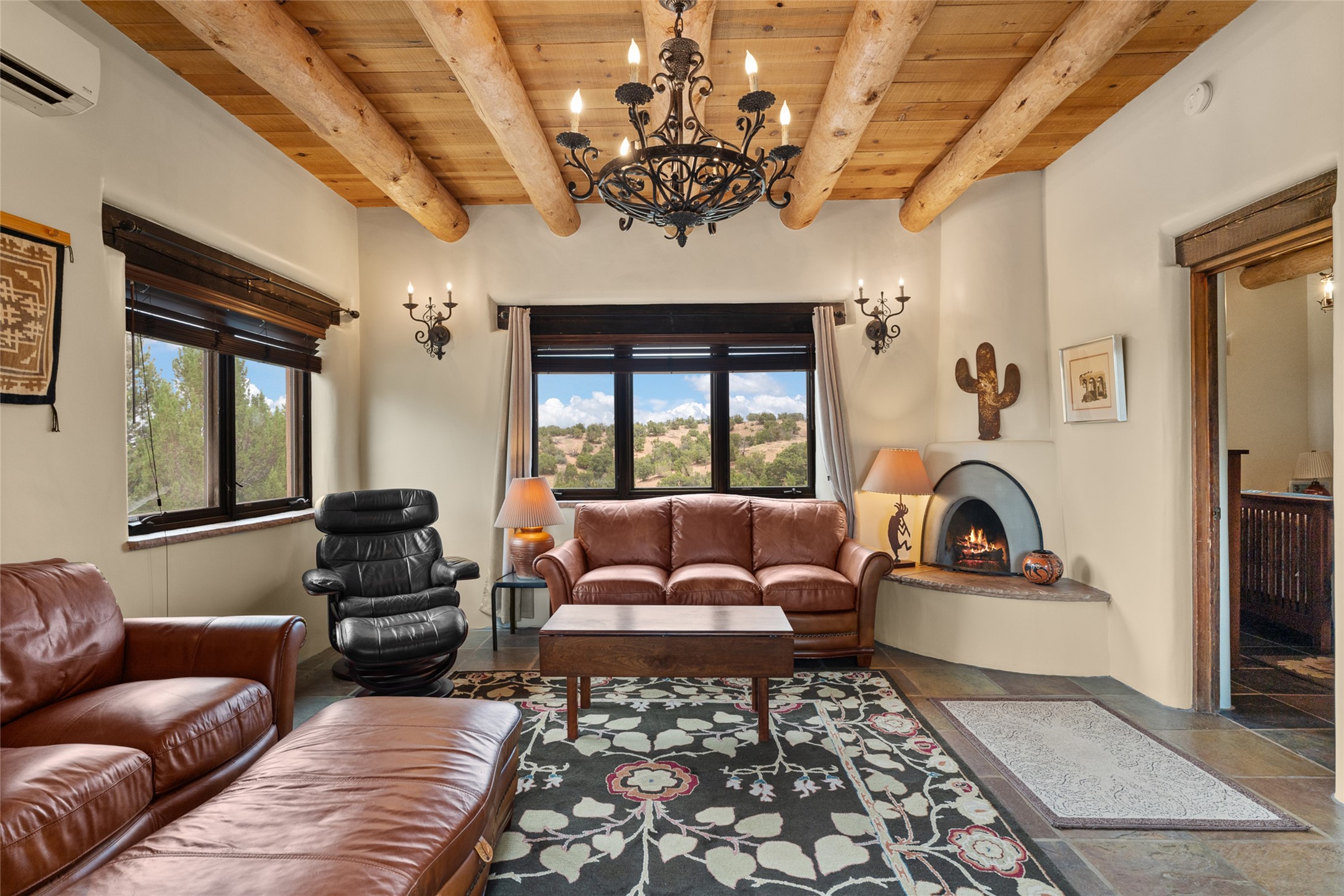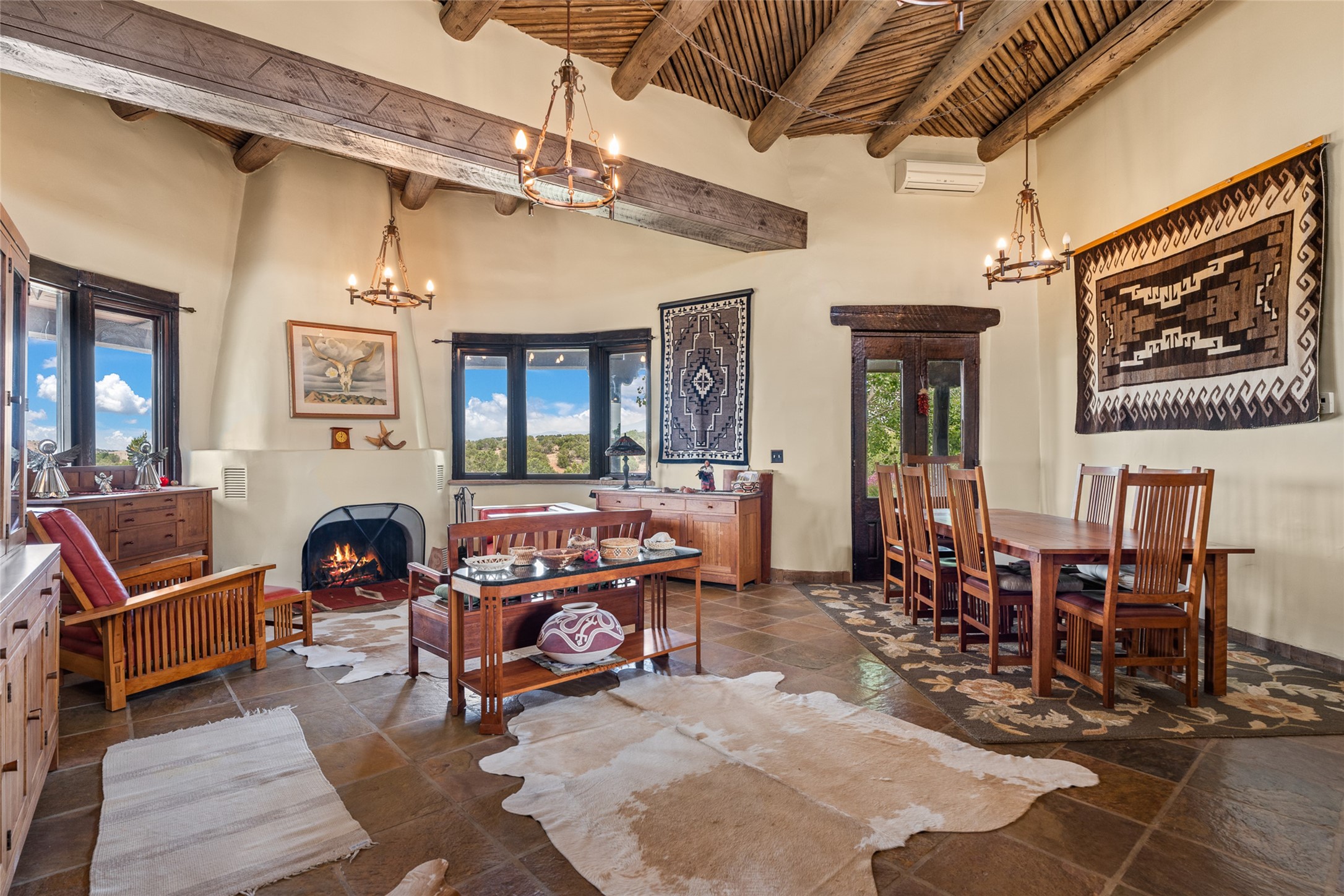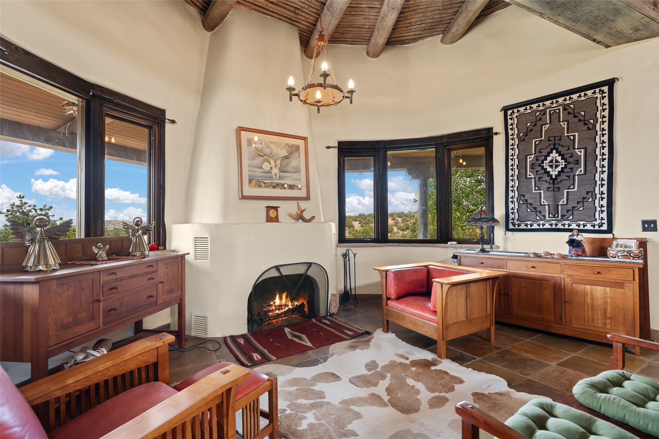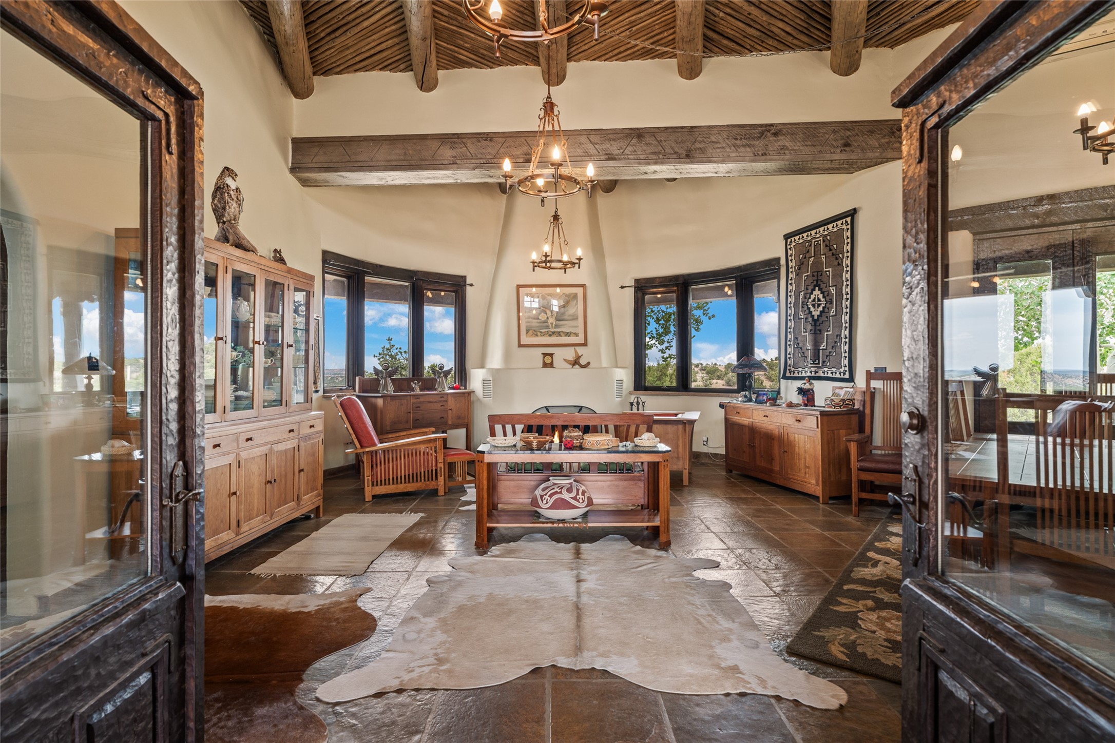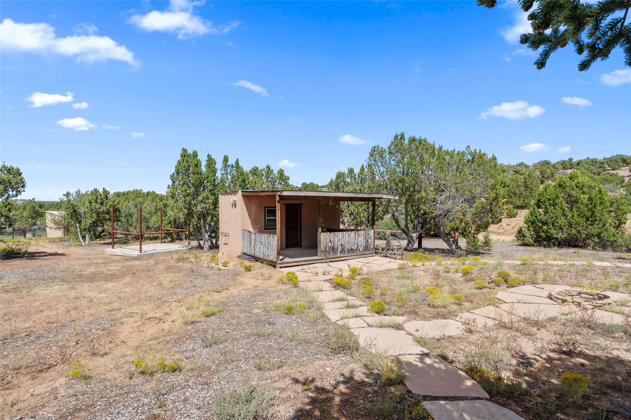 La Querencia is truly a masterful work of art! Built in 1980 with double adobe construction, hand adzed mesquite doors and windows throughout, high coved ceilings with wonderful old vigas, fabulous wrought iron chandeliers, hand cut tin sconces and chandeliers, nichos, curved walls and lovely slate stone tile flooring. It sits on 11.5 horse friendly acres, with an acre of fenced paddock space and tac room as well as proximity to BLM land and huge views to both the Sangre and Jemez mountain ranges. The 4,203 sq ft main house has radiant heat as well as mini splits in all the main rooms for both cooling and heat. Passing through the arched front gate and by the sparkling pool, one enters through magnificent French doors into a large entry/dining room with a fireplace, vigas and latilla ceiling, and views to both sunrise and sunset. Off the entry through incredible tall curved mesquite doors lies the living room with floor to ceiling bookcases, kiva fireplace and 3 sets of French doors opening to the wrap around covered portal for indoor/outdoor living. Down a curved hallway is the primary bedroom suite with an office or sitting space, tall kiva fireplace and large en suite bath with a Japanese soaking tub, spacious shower and his and hers walk in closets. The French doors from the main bedroom open again to the covered portal for nighttime soaking and stargazing from the new Hotspring spa. Down another curved hallway off the entry/dining is a chef's kitchen newly redone with quartz countertops, new cabinets with the same classic cut tin decorative fronts, new sinks, Miele dishwasher, Sub Zero full fridge and freezer. There are also 2 ovens and a 6 burner plus griddle cooktop. The cut tin chandeliers complete the scene and French doors to the covered portal make for easy outdoor grilling and dining. Following the hallway down the other side of the house is the laundry, family/media room and 3 guest bedrooms each with their own bath. The house is oriented around the South facing swimming pool and enclosed courtyard for enjoying protected outdoor seating and swimming. The swimming pool has new pumps, controller and filter, heat pump and sub panel. And the main house has a new boiler, tankless hot water heater and toilets, sinks and faucets have been replaced.The 1297 sq ft 2 bedroom 2 bath casita is pumice poured construction and is nicely separated from the main house for privacy for guests or caretaker, while close to the main 2 car garage. The living space in the guesthouse has great views, kiva fireplace and a new induction cooktop. The two bedrooms each have their own en suite baths, large walk in closets and the second bedroom has outdoor access for privacy for both bedrooms. There is also a new boiler for the radiant heat, tankless hot water heater and mini splits for heat and cooling in all the rooms. A studio/workshop/RV garage was built in 2020 and an extra garage done in 2023 - both close to the horse area. There was also a separate permitted drive added for both RV and horse trailer access. The studio/workshop/ RV garage has Anderson windows and also a mini split for heat and cooling, so could make a very cool artist's studio. The land is beautiful with flower gardens, aspens, fruit trees and a little grassy space all enjoyed off the covered wrap around portal. Don't worry about watering! There is a private well with a new well pit, pressure and pump tank and a whole house generator in case the power goes out, the water won't! This is an incredible estate - spectacular views, profound quiet, friendly neighbors and all about 20 minutes to town!