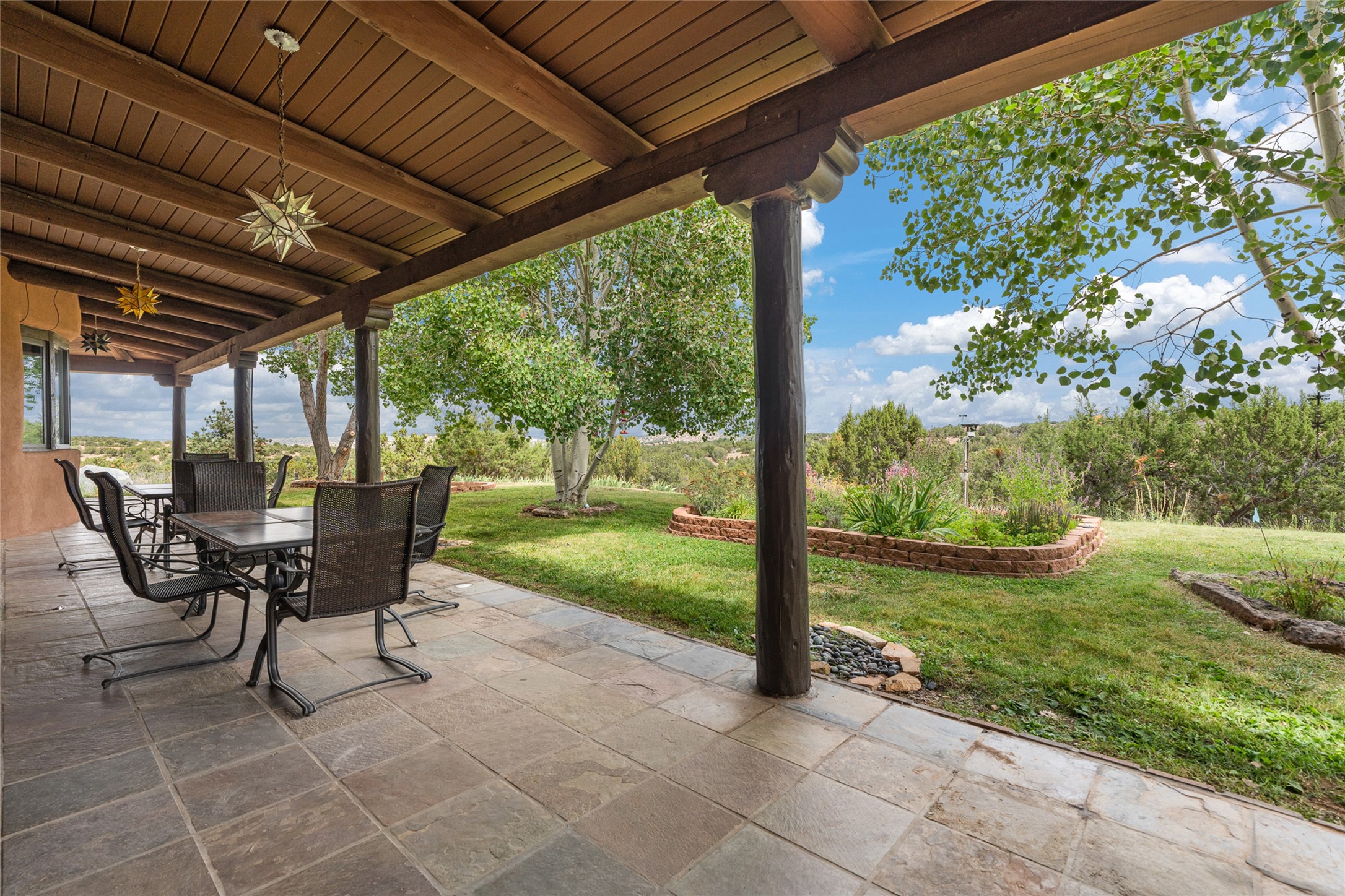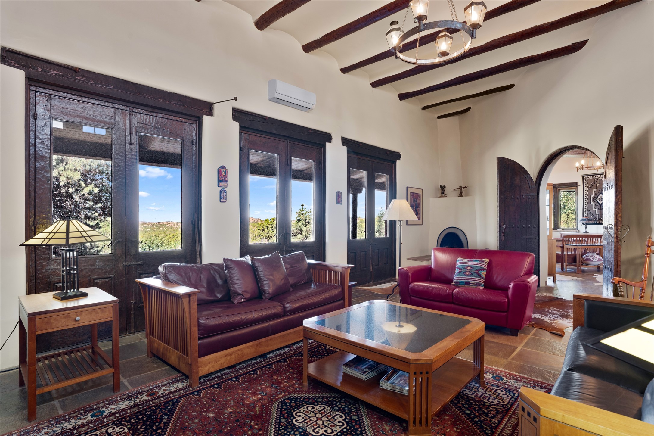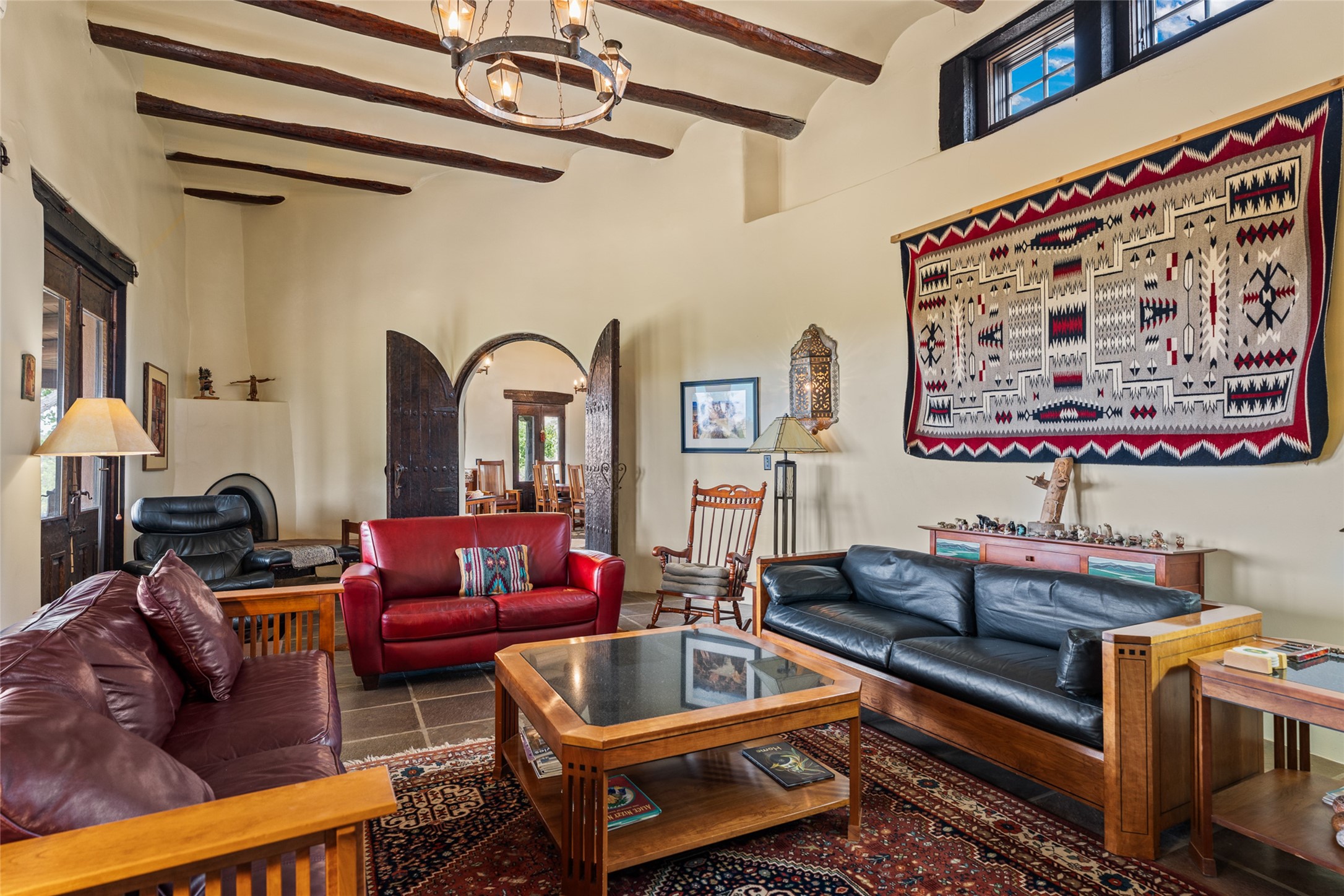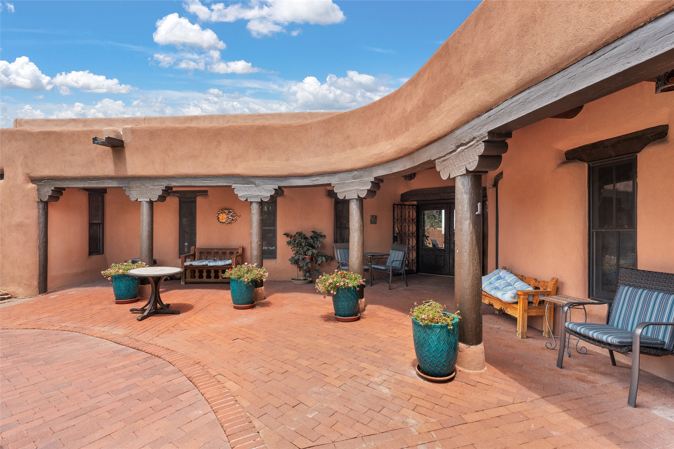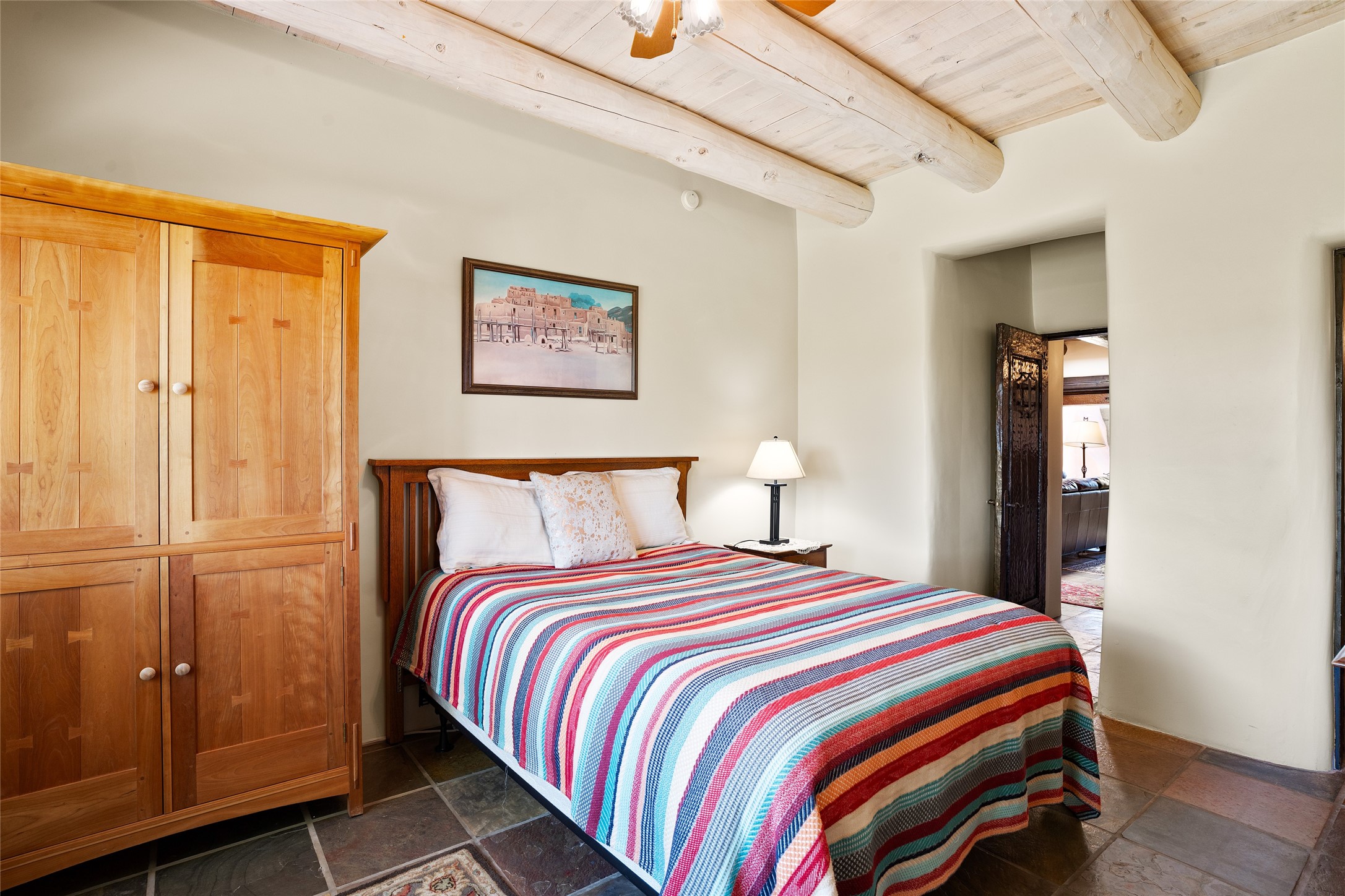 La Querencia is truly a masterful work of art! Built in 1980 with double adobe construction, hand adzed mesquite doors and windows throughout, high coved ceilings with wonderful old vigas, fabulous wrought iron chandeliers, hand cut tin sconces and chandeliers, nichos, curved walls and lovely slate stone tile flooring. It sits on 11.5 horse friendly acres, with an acre of fenced paddock space and tac room as well as proximity to BLM land and huge views to both the Sangre and Jemez mountain ranges. The 4,203 sq ft main house has radiant heat as well as mini splits in all the main rooms for both cooling and heat. Passing through the arched front gate and by the sparkling pool, one enters through magnificent French doors into a large entry/dining room with a fireplace, vigas and latilla ceiling, and views to both sunrise and sunset. Off the entry through incredible tall curved mesquite doors lies the living room with floor to ceiling bookcases, kiva fireplace and 3 sets of French doors opening to the wrap around covered portal for indoor/outdoor living. Down a curved hallway is the primary bedroom suite with an office or sitting space, tall kiva fireplace and large en suite bath with a Japanese soaking tub, spacious shower and his and hers walk in closets. The French doors from the main bedroom open again to the covered portal for nighttime soaking and stargazing from the new Hotspring spa. Down another curved hallway off the entry/dining is a chef's kitchen newly redone with quartz countertops, new cabinets with the same classic cut tin decorative fronts, new sinks, Miele dishwasher, Sub Zero full fridge and freezer. There are also 2 ovens and a 6 burner plus griddle cooktop. The cut tin chandeliers complete the scene and French doors to the covered portal make for easy outdoor grilling and dining. Following the hallway down the other side of the house is the laundry, family/media room and 3 guest bedrooms each with their own bath. The house is oriented around the South facing swimming pool and enclosed courtyard for enjoying protected outdoor seating and swimming. The swimming pool has new pumps, controller and filter, heat pump and sub panel. And the main house has a new boiler, tankless hot water heater and toilets, sinks and faucets have been replaced.The 1297 sq ft 2 bedroom 2 bath casita is pumice poured construction and is nicely separated from the main house for privacy for guests or caretaker, while close to the main 2 car garage. The living space in the guesthouse has great views, kiva fireplace and a new induction cooktop. The two bedrooms each have their own en suite baths, large walk in closets and the second bedroom has outdoor access for privacy for both bedrooms. There is also a new boiler for the radiant heat, tankless hot water heater and mini splits for heat and cooling in all the rooms. A studio/workshop/RV garage was built in 2020 and an extra garage done in 2023 - both close to the horse area. There was also a separate permitted drive added for both RV and horse trailer access. The studio/workshop/ RV garage has Anderson windows and also a mini split for heat and cooling, so could make a very cool artist's studio. The land is beautiful with flower gardens, aspens, fruit trees and a little grassy space all enjoyed off the covered wrap around portal. Don't worry about watering! There is a private well with a new well pit, pressure and pump tank and a whole house generator in case the power goes out, the water won't! This is an incredible estate - spectacular views, profound quiet, friendly neighbors and all about 20 minutes to town!