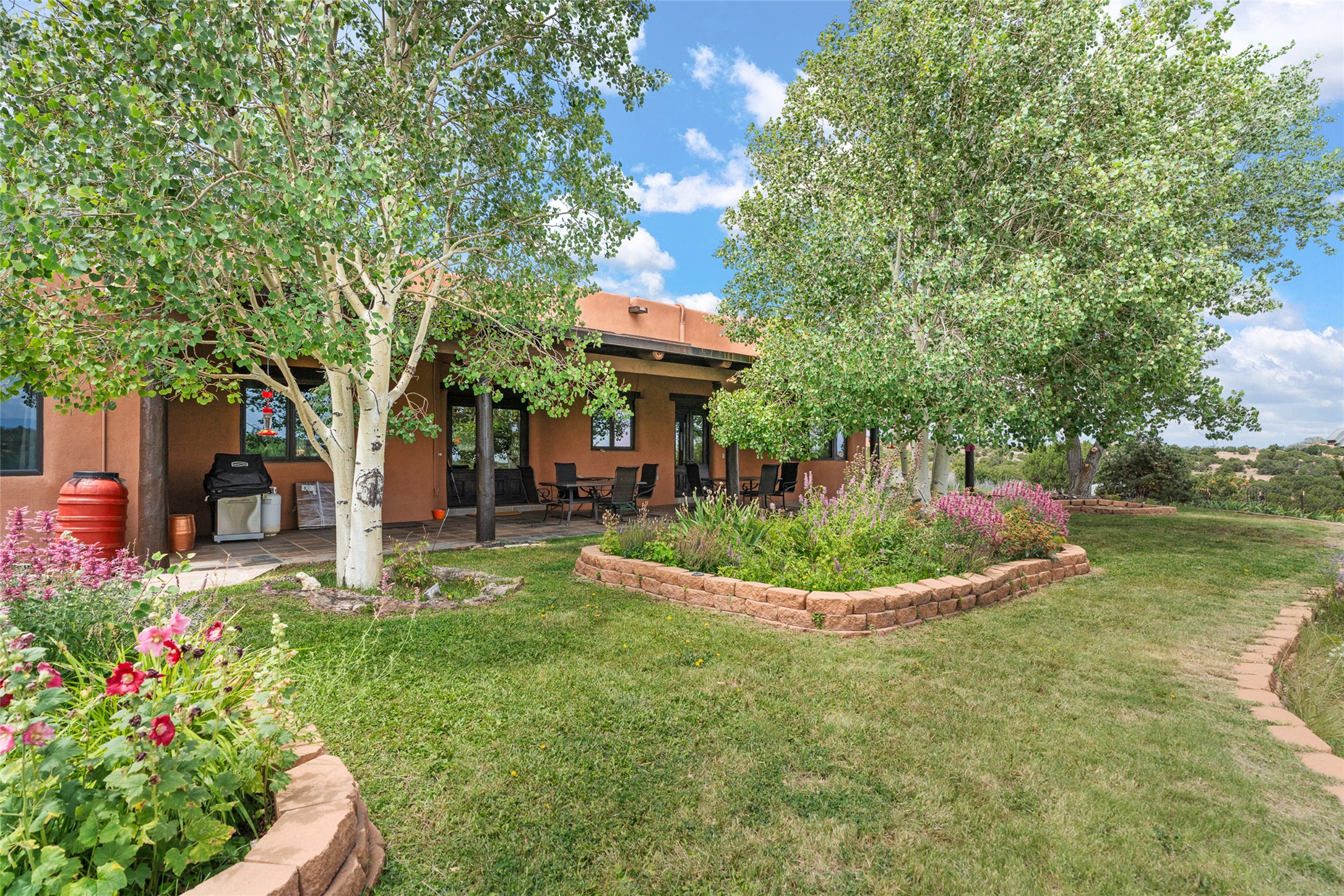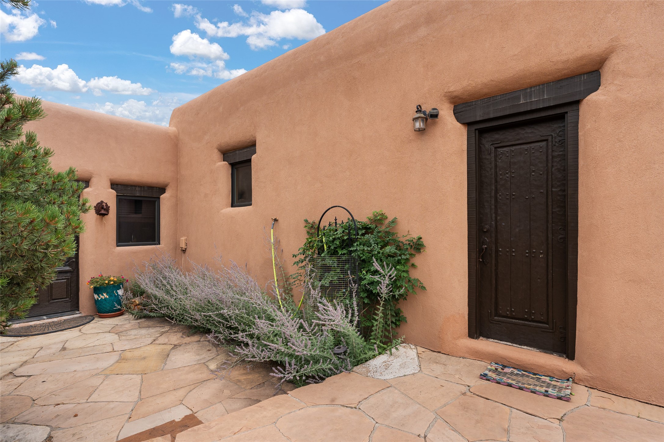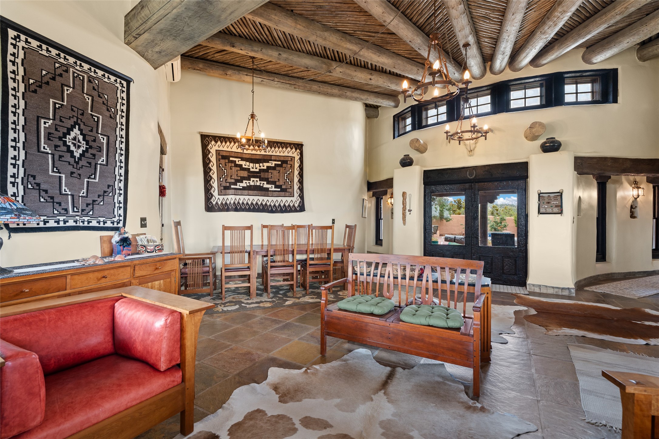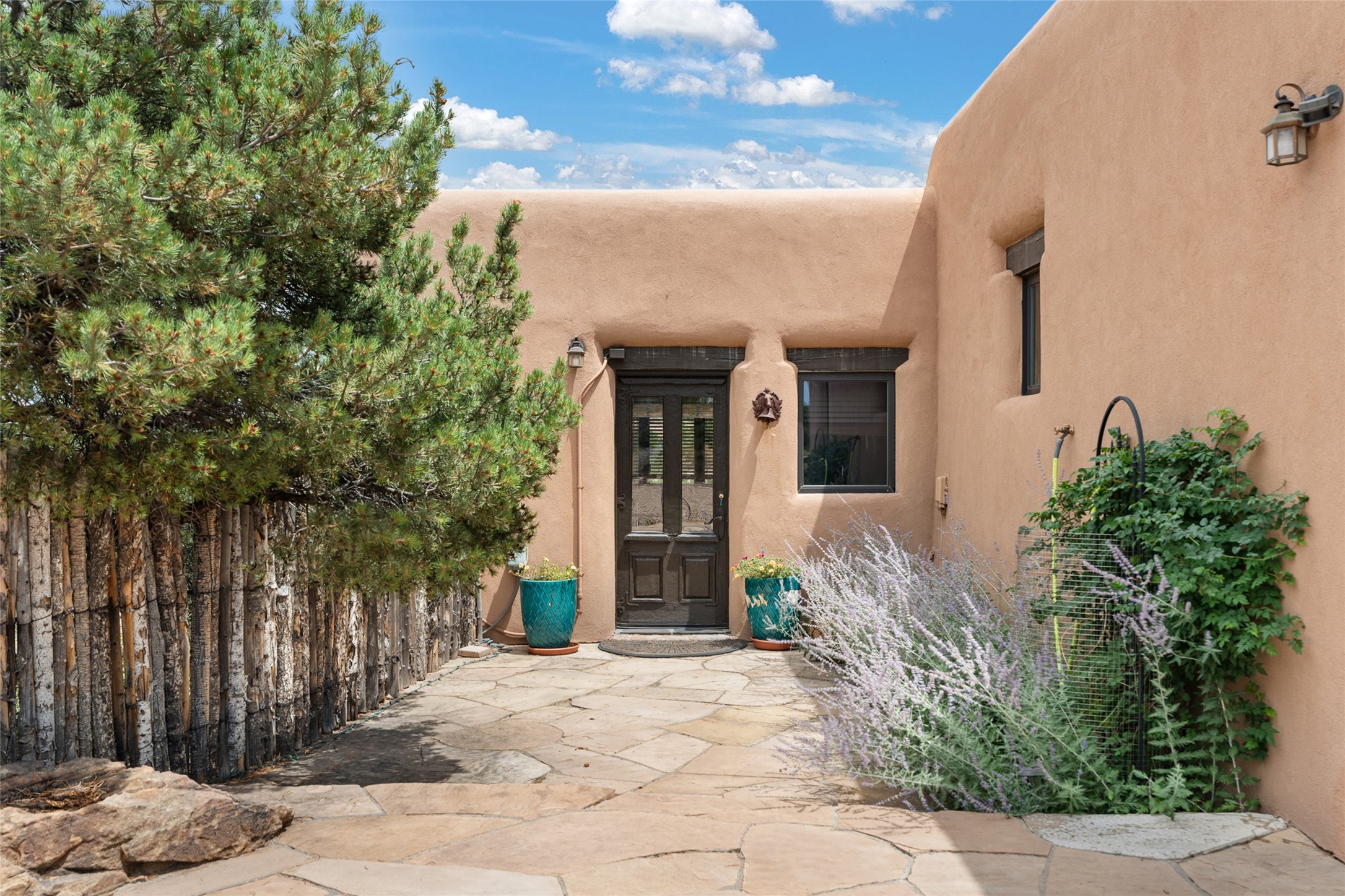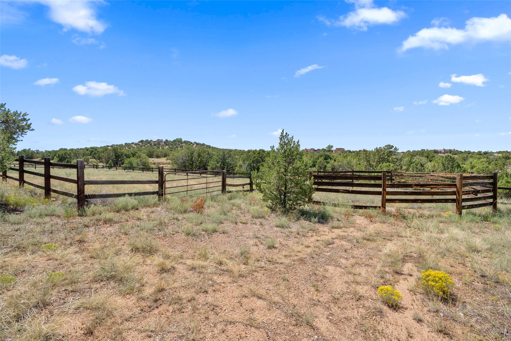 La Querencia is truly a masterful work of art! Built in 1980 with double adobe construction, hand adzed mesquite doors and windows throughout, high coved ceilings with wonderful old vigas, fabulous wrought iron chandeliers, hand cut tin sconces and chandeliers, nichos, curved walls and lovely slate stone tile flooring. It sits on 11.5 horse friendly acres, with an acre of fenced paddock space and tac room as well as proximity to BLM land and huge views to both the Sangre and Jemez mountain ranges. The 4,203 sq ft main house has radiant heat as well as mini splits in all the main rooms for both cooling and heat. Passing through the arched front gate and by the sparkling pool, one enters through magnificent French doors into a large entry/dining room with a fireplace, vigas and latilla ceiling, and views to both sunrise and sunset. Off the entry through incredible tall curved mesquite doors lies the living room with floor to ceiling bookcases, kiva fireplace and 3 sets of French doors opening to the wrap around covered portal for indoor/outdoor living. Down a curved hallway is the primary bedroom suite with an office or sitting space, tall kiva fireplace and large en suite bath with a Japanese soaking tub, spacious shower and his and hers walk in closets. The French doors from the main bedroom open again to the covered portal for nighttime soaking and stargazing from the new Hotspring spa. Down another curved hallway off the entry/dining is a chef's kitchen newly redone with quartz countertops, new cabinets with the same classic cut tin decorative fronts, new sinks, Miele dishwasher, Sub Zero full fridge and freezer. There are also 2 ovens and a 6 burner plus griddle cooktop. The cut tin chandeliers complete the scene and French doors to the covered portal make for easy outdoor grilling and dining. Following the hallway down the other side of the house is the laundry, family/media room and 3 guest bedrooms each with their own bath. The house is oriented around the South facing swimming pool and enclosed courtyard for enjoying protected outdoor seating and swimming. The swimming pool has new pumps, controller and filter, heat pump and sub panel. And the main house has a new boiler, tankless hot water heater and toilets, sinks and faucets have been replaced.The 1297 sq ft 2 bedroom 2 bath casita is pumice poured construction and is nicely separated from the main house for privacy for guests or caretaker, while close to the main 2 car garage. The living space in the guesthouse has great views, kiva fireplace and a new induction cooktop. The two bedrooms each have their own en suite baths, large walk in closets and the second bedroom has outdoor access for privacy for both bedrooms. There is also a new boiler for the radiant heat, tankless hot water heater and mini splits for heat and cooling in all the rooms. A studio/workshop/RV garage was built in 2020 and an extra garage done in 2023 - both close to the horse area. There was also a separate permitted drive added for both RV and horse trailer access. The studio/workshop/ RV garage has Anderson windows and also a mini split for heat and cooling, so could make a very cool artist's studio. The land is beautiful with flower gardens, aspens, fruit trees and a little grassy space all enjoyed off the covered wrap around portal. Don't worry about watering! There is a private well with a new well pit, pressure and pump tank and a whole house generator in case the power goes out, the water won't! This is an incredible estate - spectacular views, profound quiet, friendly neighbors and all about 20 minutes to town!