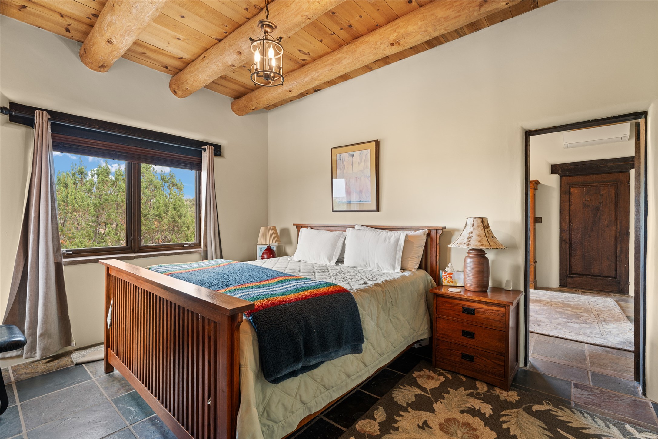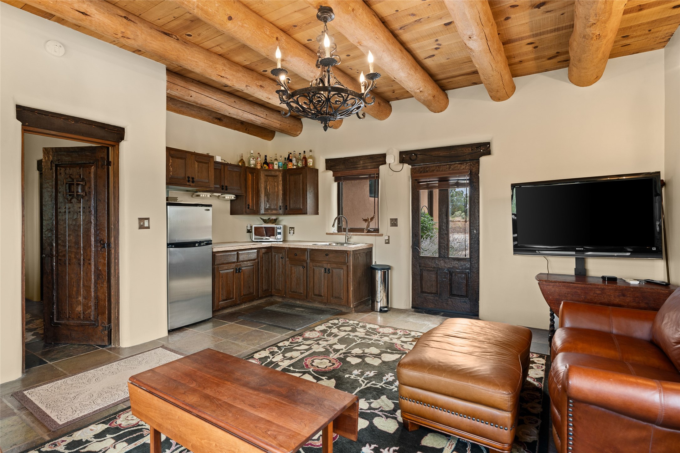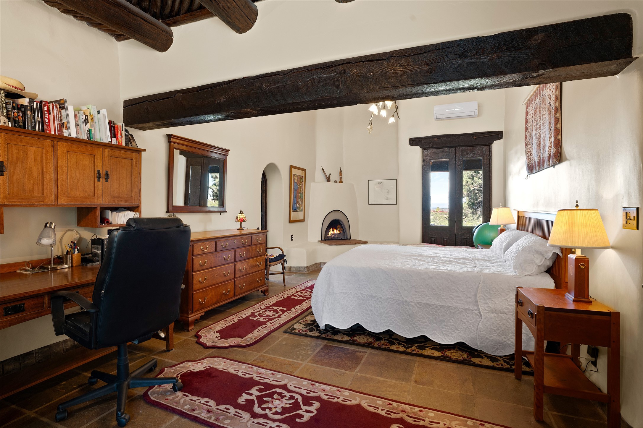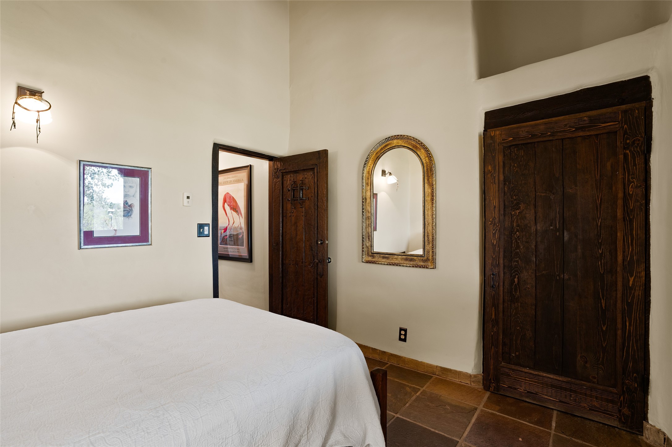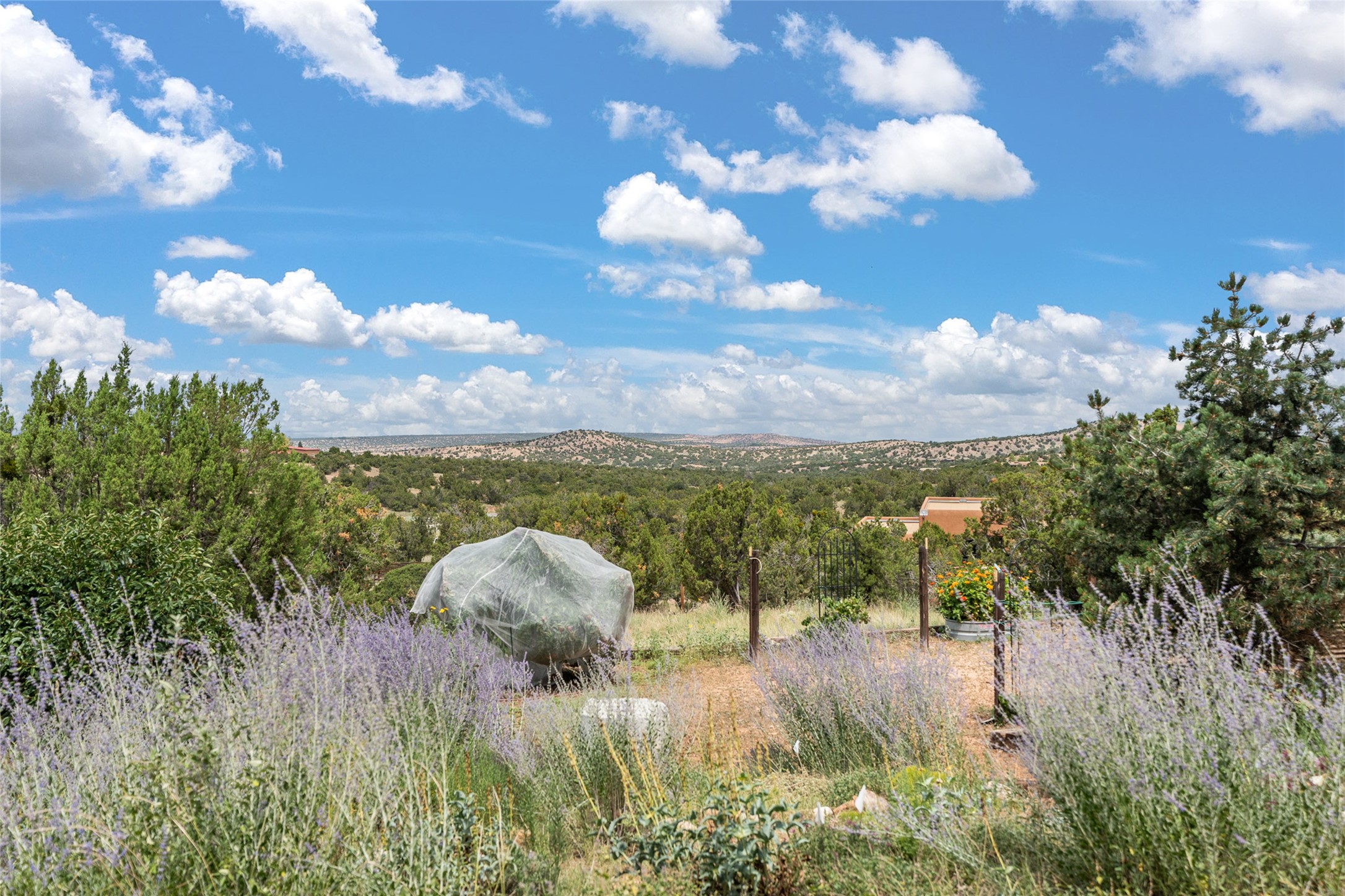 La Querencia is truly a masterful work of art! Built in 1980 with double adobe construction, hand adzed mesquite doors and windows throughout, high coved ceilings with wonderful old vigas, fabulous wrought iron chandeliers, hand cut tin sconces and chandeliers, nichos, curved walls and lovely slate stone tile flooring. It sits on 11.5 horse friendly acres, with an acre of fenced paddock space and tac room as well as proximity to BLM land and huge views to both the Sangre and Jemez mountain ranges. The 4,203 sq ft main house has radiant heat as well as mini splits in all the main rooms for both cooling and heat. Passing through the arched front gate and by the sparkling pool, one enters through magnificent French doors into a large entry/dining room with a fireplace, vigas and latilla ceiling, and views to both sunrise and sunset. Off the entry through incredible tall curved mesquite doors lies the living room with floor to ceiling bookcases, kiva fireplace and 3 sets of French doors opening to the wrap around covered portal for indoor/outdoor living. Down a curved hallway is the primary bedroom suite with an office or sitting space, tall kiva fireplace and large en suite bath with a Japanese soaking tub, spacious shower and his and hers walk in closets. The French doors from the main bedroom open again to the covered portal for nighttime soaking and stargazing from the new Hotspring spa. Down another curved hallway off the entry/dining is a chef's kitchen newly redone with quartz countertops, new cabinets with the same classic cut tin decorative fronts, new sinks, Miele dishwasher, Sub Zero full fridge and freezer. There are also 2 ovens and a 6 burner plus griddle cooktop. The cut tin chandeliers complete the scene and French doors to the covered portal make for easy outdoor grilling and dining. Following the hallway down the other side of the house is the laundry, family/media room and 3 guest bedrooms each with their own bath. The house is oriented around the South facing swimming pool and enclosed courtyard for enjoying protected outdoor seating and swimming. The swimming pool has new pumps, controller and filter, heat pump and sub panel. And the main house has a new boiler, tankless hot water heater and toilets, sinks and faucets have been replaced.The 1297 sq ft 2 bedroom 2 bath casita is pumice poured construction and is nicely separated from the main house for privacy for guests or caretaker, while close to the main 2 car garage. The living space in the guesthouse has great views, kiva fireplace and a new induction cooktop. The two bedrooms each have their own en suite baths, large walk in closets and the second bedroom has outdoor access for privacy for both bedrooms. There is also a new boiler for the radiant heat, tankless hot water heater and mini splits for heat and cooling in all the rooms. A studio/workshop/RV garage was built in 2020 and an extra garage done in 2023 - both close to the horse area. There was also a separate permitted drive added for both RV and horse trailer access. The studio/workshop/ RV garage has Anderson windows and also a mini split for heat and cooling, so could make a very cool artist's studio. The land is beautiful with flower gardens, aspens, fruit trees and a little grassy space all enjoyed off the covered wrap around portal. Don't worry about watering! There is a private well with a new well pit, pressure and pump tank and a whole house generator in case the power goes out, the water won't! This is an incredible estate - spectacular views, profound quiet, friendly neighbors and all about 20 minutes to town!