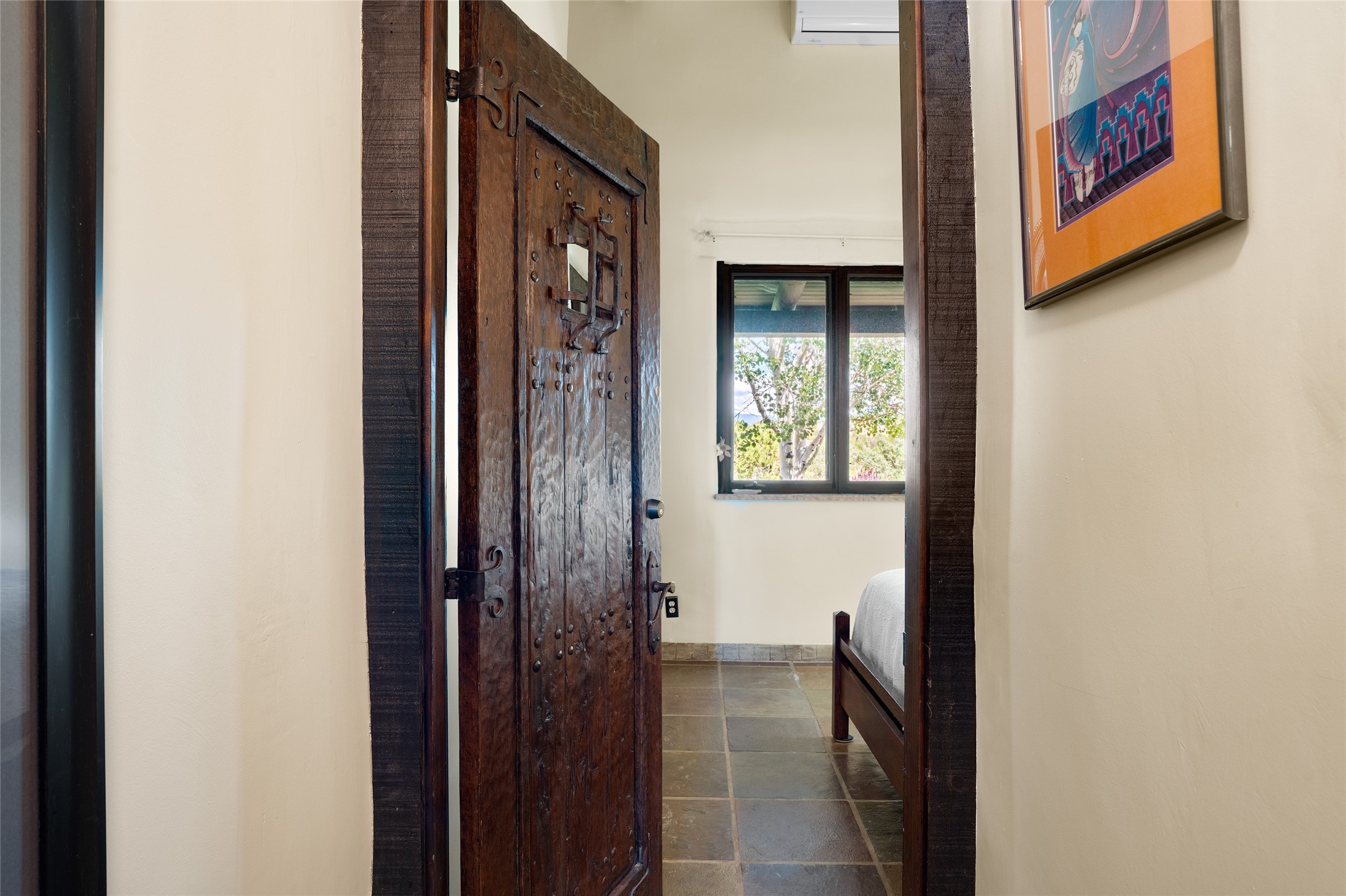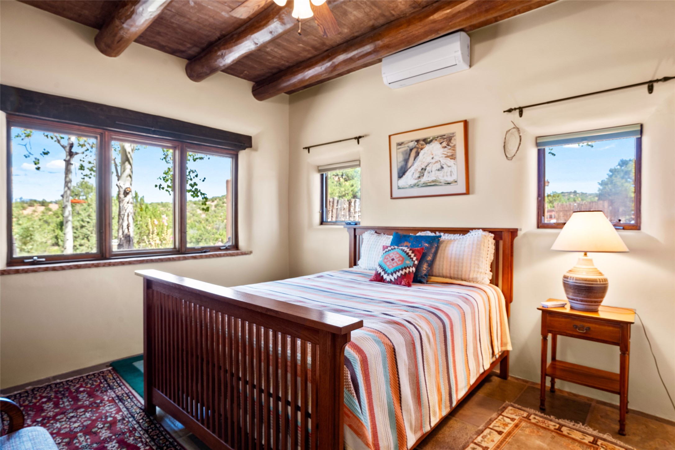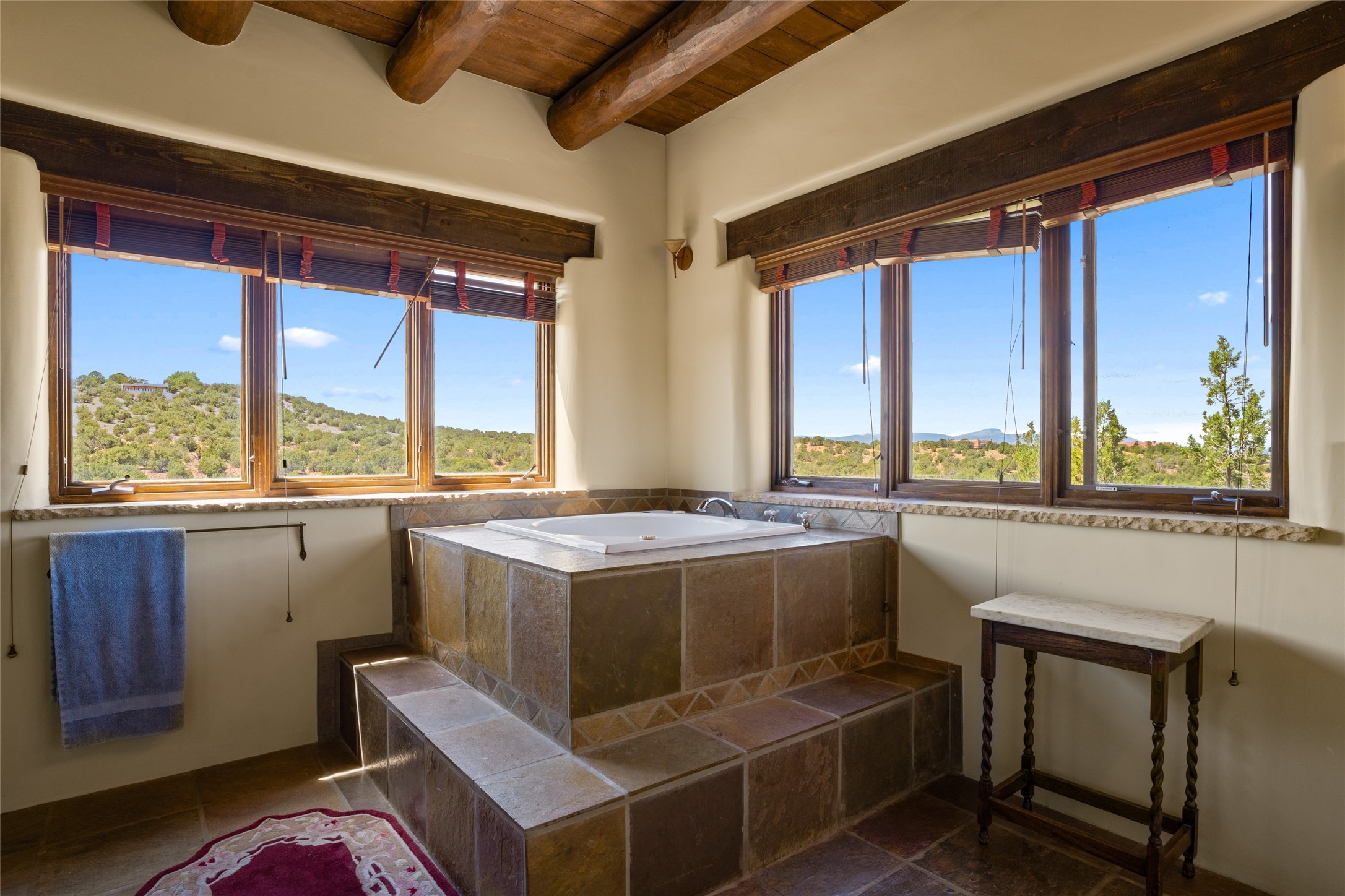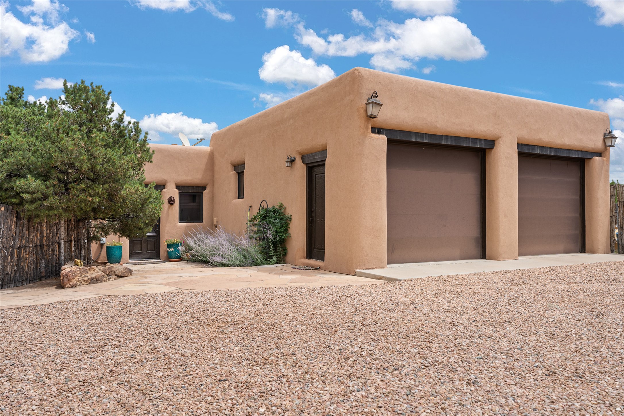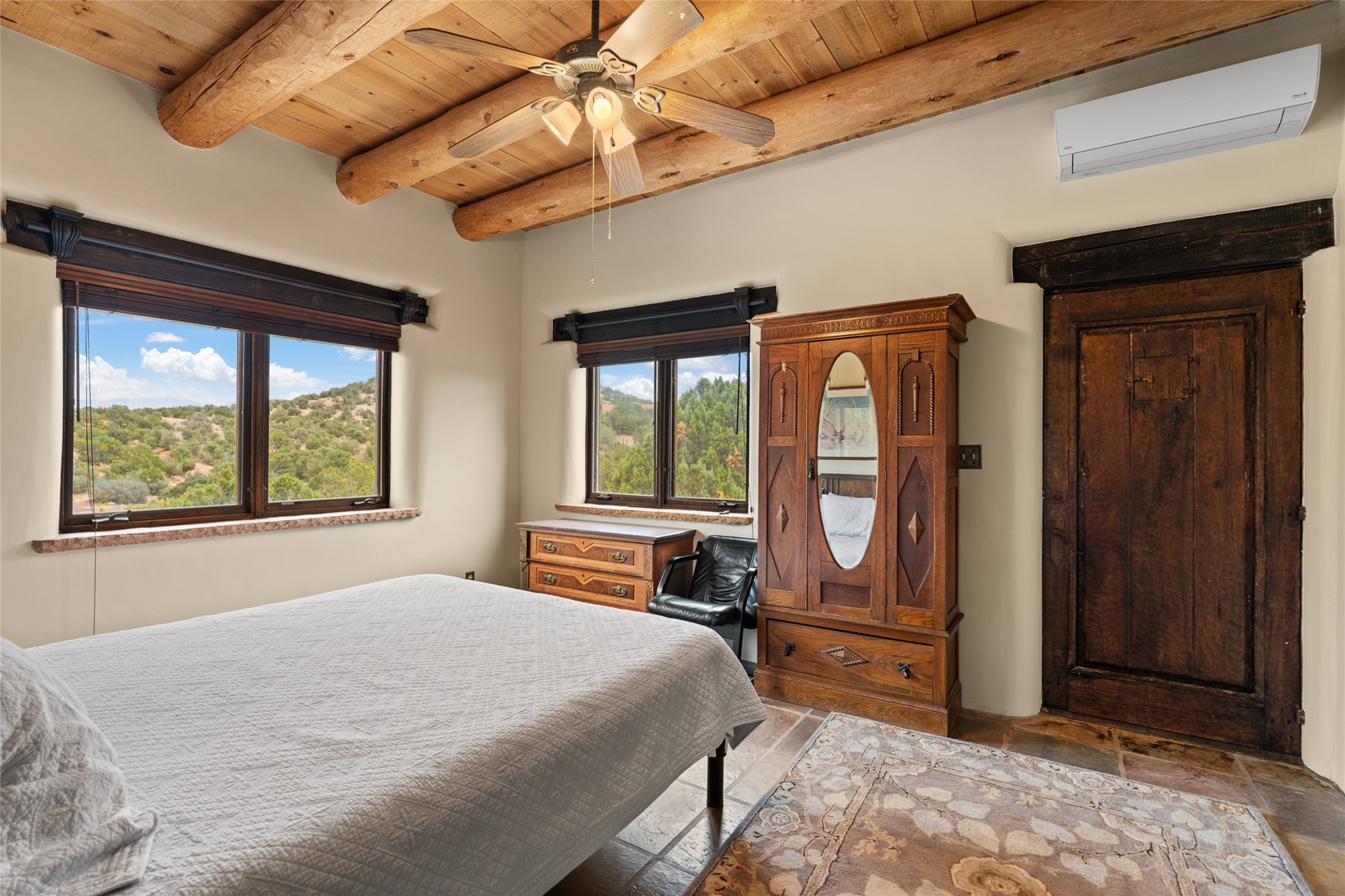 La Querencia is truly a masterful work of art! Built in 1980 with double adobe construction, hand adzed mesquite doors and windows throughout, high coved ceilings with wonderful old vigas, fabulous wrought iron chandeliers, hand cut tin sconces and chandeliers, nichos, curved walls and lovely slate stone tile flooring. It sits on 11.5 horse friendly acres, with an acre of fenced paddock space and tac room as well as proximity to BLM land and huge views to both the Sangre and Jemez mountain ranges. The 4,203 sq ft main house has radiant heat as well as mini splits in all the main rooms for both cooling and heat. Passing through the arched front gate and by the sparkling pool, one enters through magnificent French doors into a large entry/dining room with a fireplace, vigas and latilla ceiling, and views to both sunrise and sunset. Off the entry through incredible tall curved mesquite doors lies the living room with floor to ceiling bookcases, kiva fireplace and 3 sets of French doors opening to the wrap around covered portal for indoor/outdoor living. Down a curved hallway is the primary bedroom suite with an office or sitting space, tall kiva fireplace and large en suite bath with a Japanese soaking tub, spacious shower and his and hers walk in closets. The French doors from the main bedroom open again to the covered portal for nighttime soaking and stargazing from the new Hotspring spa. Down another curved hallway off the entry/dining is a chef's kitchen newly redone with quartz countertops, new cabinets with the same classic cut tin decorative fronts, new sinks, Miele dishwasher, Sub Zero full fridge and freezer. There are also 2 ovens and a 6 burner plus griddle cooktop. The cut tin chandeliers complete the scene and French doors to the covered portal make for easy outdoor grilling and dining. Following the hallway down the other side of the house is the laundry, family/media room and 3 guest bedrooms each with their own bath. The house is oriented around the South facing swimming pool and enclosed courtyard for enjoying protected outdoor seating and swimming. The swimming pool has new pumps, controller and filter, heat pump and sub panel. And the main house has a new boiler, tankless hot water heater and toilets, sinks and faucets have been replaced.The 1297 sq ft 2 bedroom 2 bath casita is pumice poured construction and is nicely separated from the main house for privacy for guests or caretaker, while close to the main 2 car garage. The living space in the guesthouse has great views, kiva fireplace and a new induction cooktop. The two bedrooms each have their own en suite baths, large walk in closets and the second bedroom has outdoor access for privacy for both bedrooms. There is also a new boiler for the radiant heat, tankless hot water heater and mini splits for heat and cooling in all the rooms. A studio/workshop/RV garage was built in 2020 and an extra garage done in 2023 - both close to the horse area. There was also a separate permitted drive added for both RV and horse trailer access. The studio/workshop/ RV garage has Anderson windows and also a mini split for heat and cooling, so could make a very cool artist's studio. The land is beautiful with flower gardens, aspens, fruit trees and a little grassy space all enjoyed off the covered wrap around portal. Don't worry about watering! There is a private well with a new well pit, pressure and pump tank and a whole house generator in case the power goes out, the water won't! This is an incredible estate - spectacular views, profound quiet, friendly neighbors and all about 20 minutes to town!