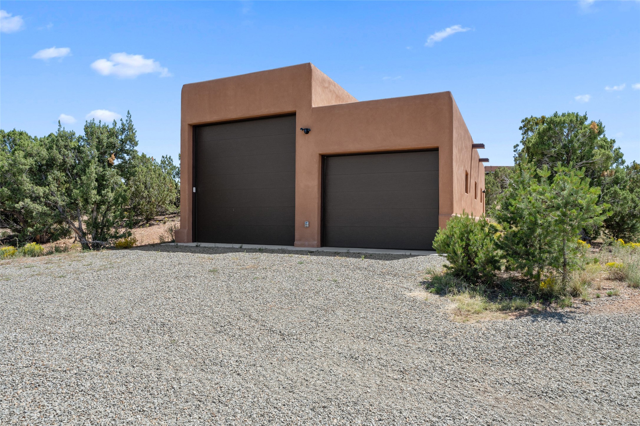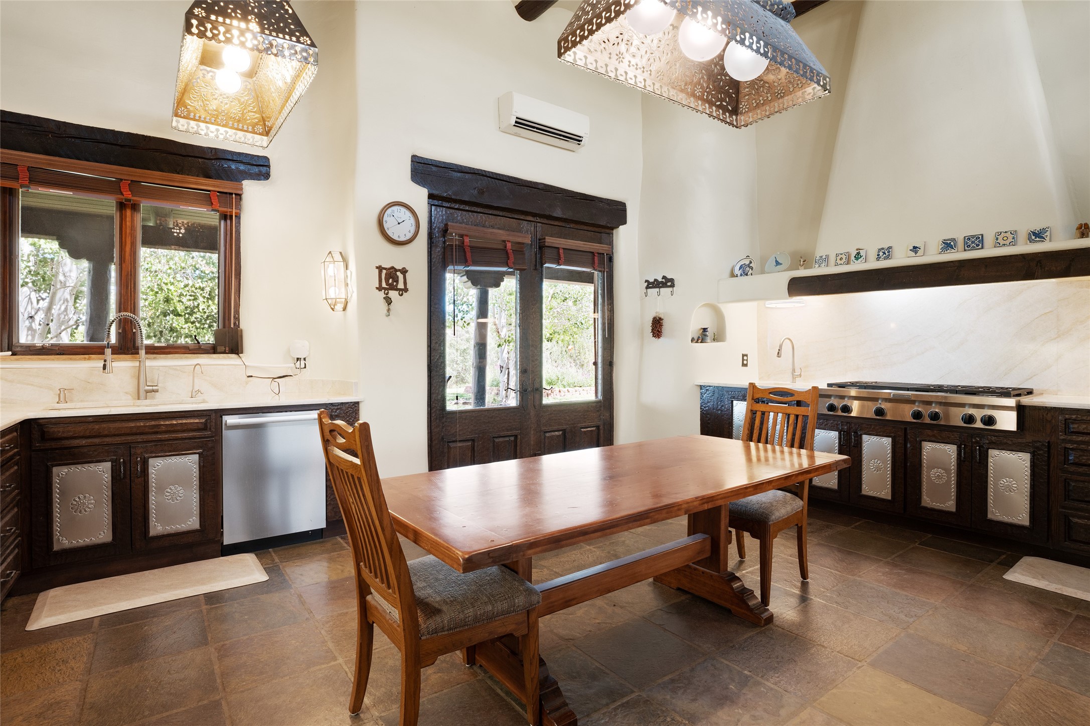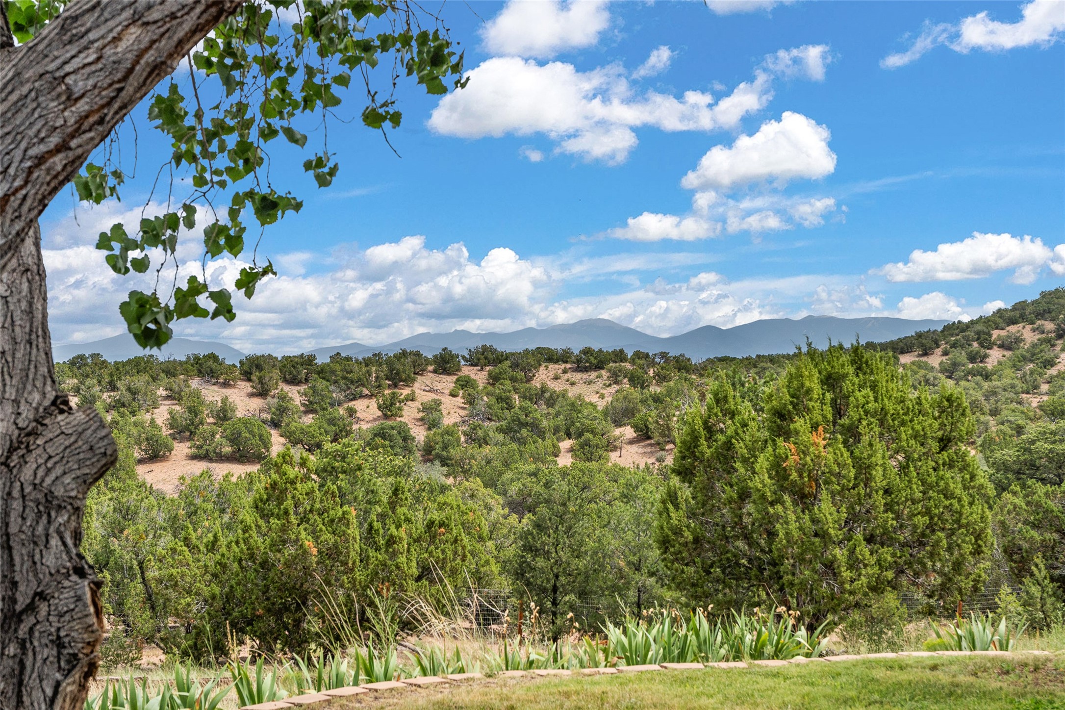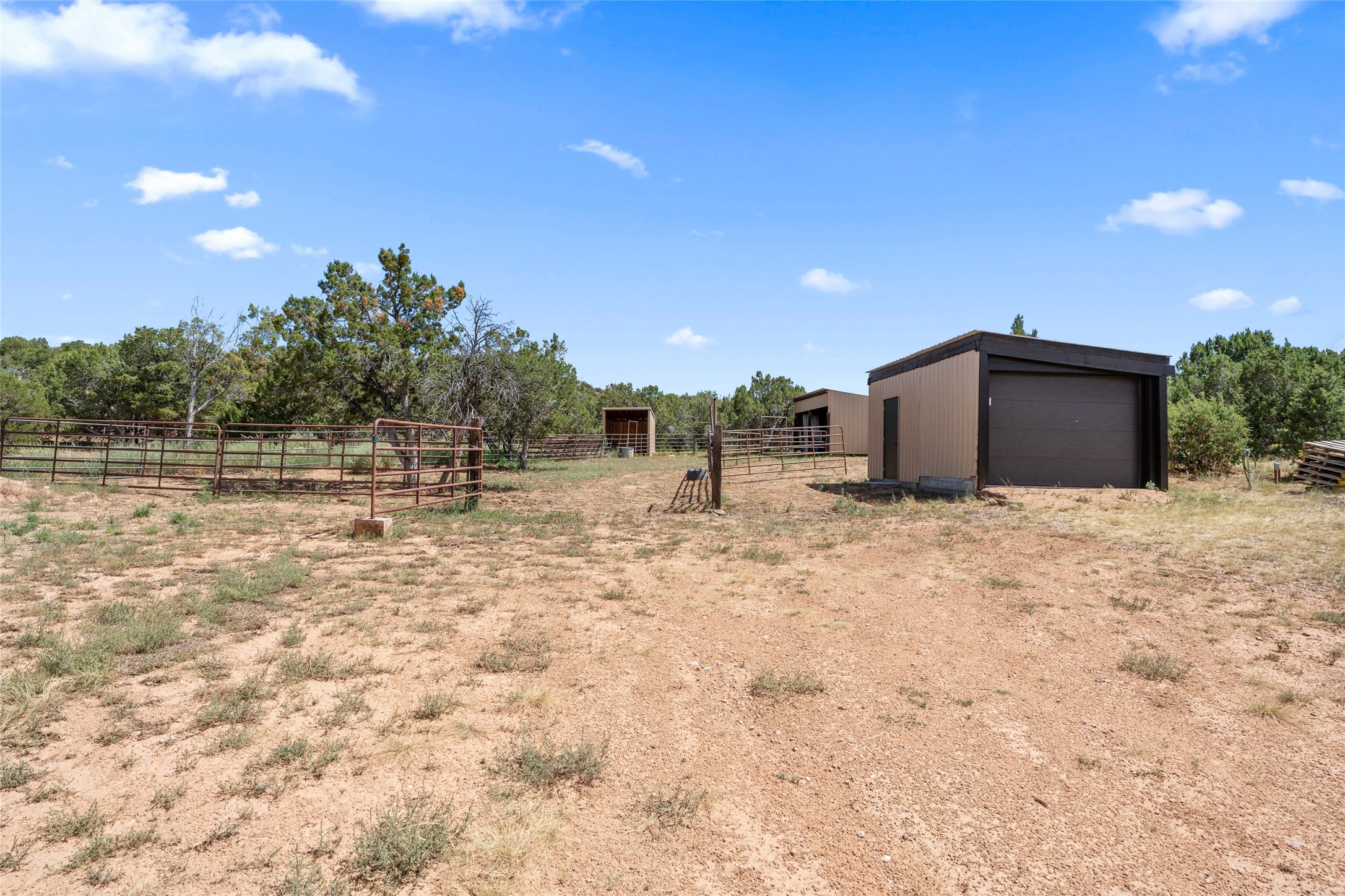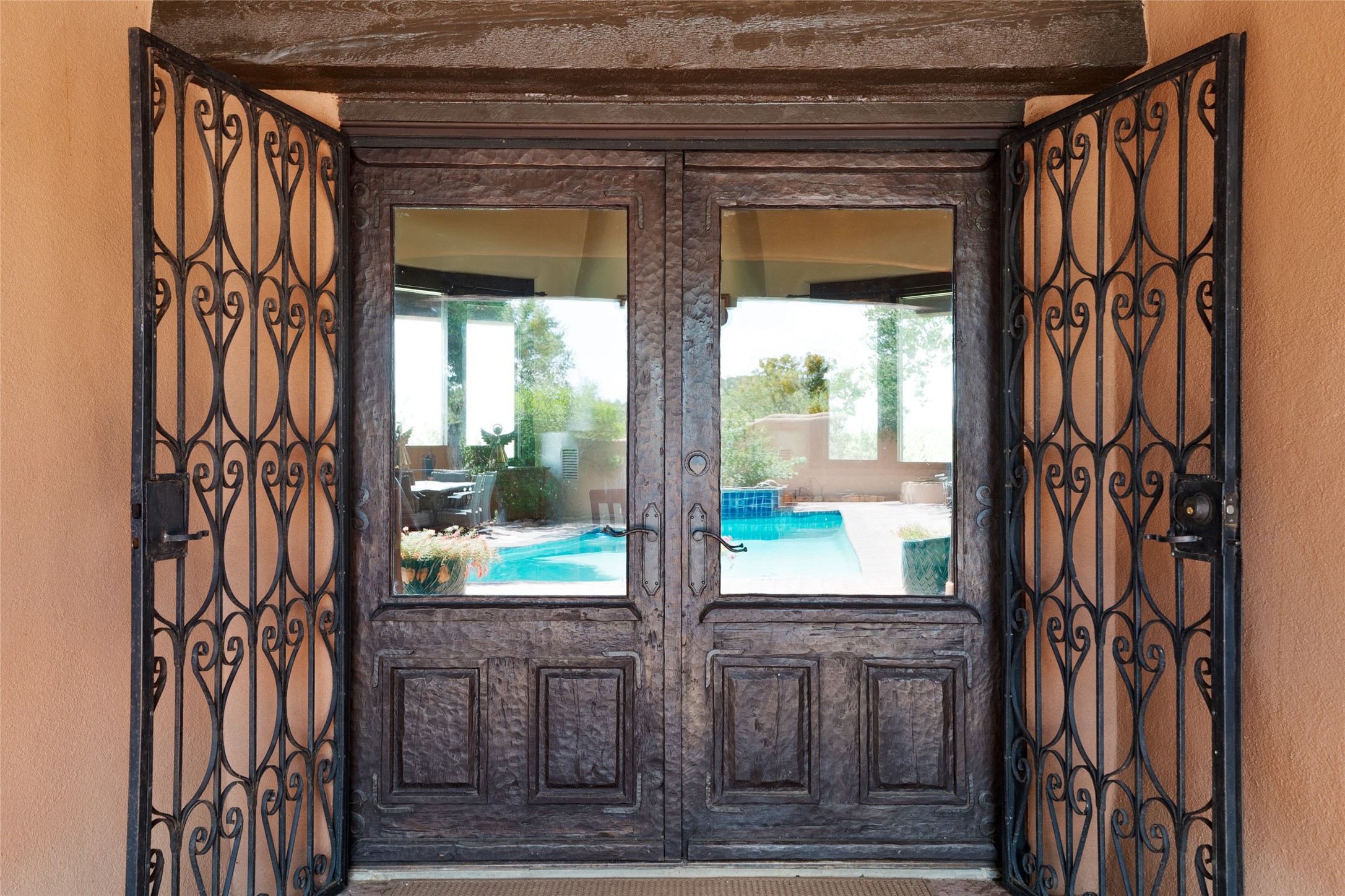 La Querencia is truly a masterful work of art! Built in 1980 with double adobe construction, hand adzed mesquite doors and windows throughout, high coved ceilings with wonderful old vigas, fabulous wrought iron chandeliers, hand cut tin sconces and chandeliers, nichos, curved walls and lovely slate stone tile flooring. It sits on 11.5 horse friendly acres, with an acre of fenced paddock space and tac room as well as proximity to BLM land and huge views to both the Sangre and Jemez mountain ranges. The 4,203 sq ft main house has radiant heat as well as mini splits in all the main rooms for both cooling and heat. Passing through the arched front gate and by the sparkling pool, one enters through magnificent French doors into a large entry/dining room with a fireplace, vigas and latilla ceiling, and views to both sunrise and sunset. Off the entry through incredible tall curved mesquite doors lies the living room with floor to ceiling bookcases, kiva fireplace and 3 sets of French doors opening to the wrap around covered portal for indoor/outdoor living. Down a curved hallway is the primary bedroom suite with an office or sitting space, tall kiva fireplace and large en suite bath with a Japanese soaking tub, spacious shower and his and hers walk in closets. The French doors from the main bedroom open again to the covered portal for nighttime soaking and stargazing from the new Hotspring spa. Down another curved hallway off the entry/dining is a chef's kitchen newly redone with quartz countertops, new cabinets with the same classic cut tin decorative fronts, new sinks, Miele dishwasher, Sub Zero full fridge and freezer. There are also 2 ovens and a 6 burner plus griddle cooktop. The cut tin chandeliers complete the scene and French doors to the covered portal make for easy outdoor grilling and dining. Following the hallway down the other side of the house is the laundry, family/media room and 3 guest bedrooms each with their own bath. The house is oriented around the South facing swimming pool and enclosed courtyard for enjoying protected outdoor seating and swimming. The swimming pool has new pumps, controller and filter, heat pump and sub panel. And the main house has a new boiler, tankless hot water heater and toilets, sinks and faucets have been replaced.The 1297 sq ft 2 bedroom 2 bath casita is pumice poured construction and is nicely separated from the main house for privacy for guests or caretaker, while close to the main 2 car garage. The living space in the guesthouse has great views, kiva fireplace and a new induction cooktop. The two bedrooms each have their own en suite baths, large walk in closets and the second bedroom has outdoor access for privacy for both bedrooms. There is also a new boiler for the radiant heat, tankless hot water heater and mini splits for heat and cooling in all the rooms. A studio/workshop/RV garage was built in 2020 and an extra garage done in 2023 - both close to the horse area. There was also a separate permitted drive added for both RV and horse trailer access. The studio/workshop/ RV garage has Anderson windows and also a mini split for heat and cooling, so could make a very cool artist's studio. The land is beautiful with flower gardens, aspens, fruit trees and a little grassy space all enjoyed off the covered wrap around portal. Don't worry about watering! There is a private well with a new well pit, pressure and pump tank and a whole house generator in case the power goes out, the water won't! This is an incredible estate - spectacular views, profound quiet, friendly neighbors and all about 20 minutes to town!