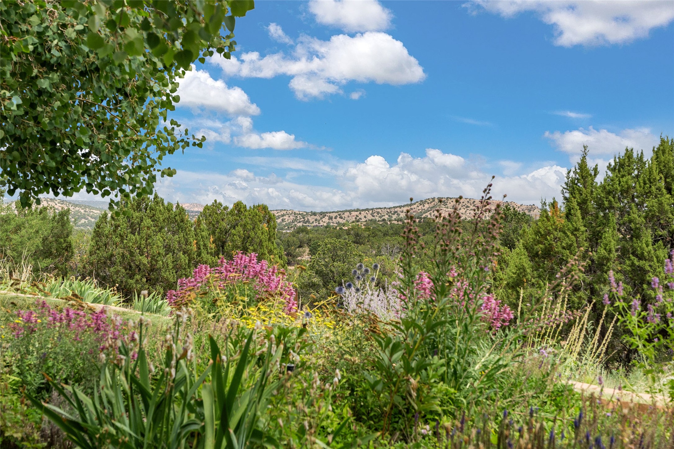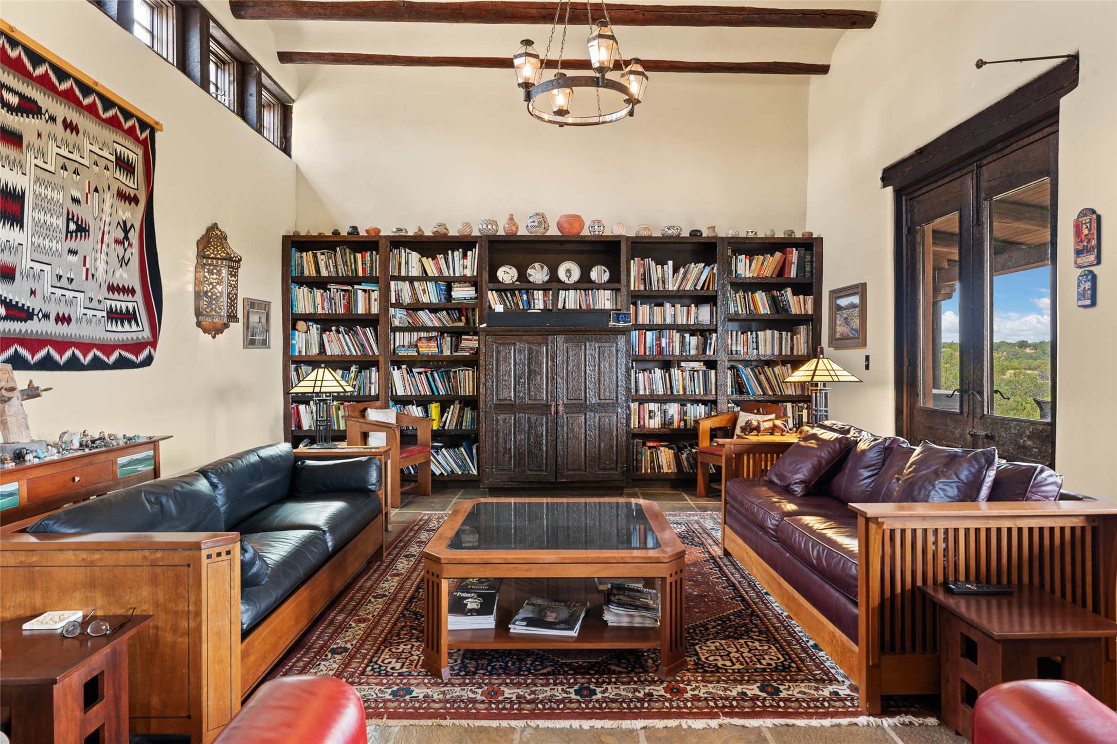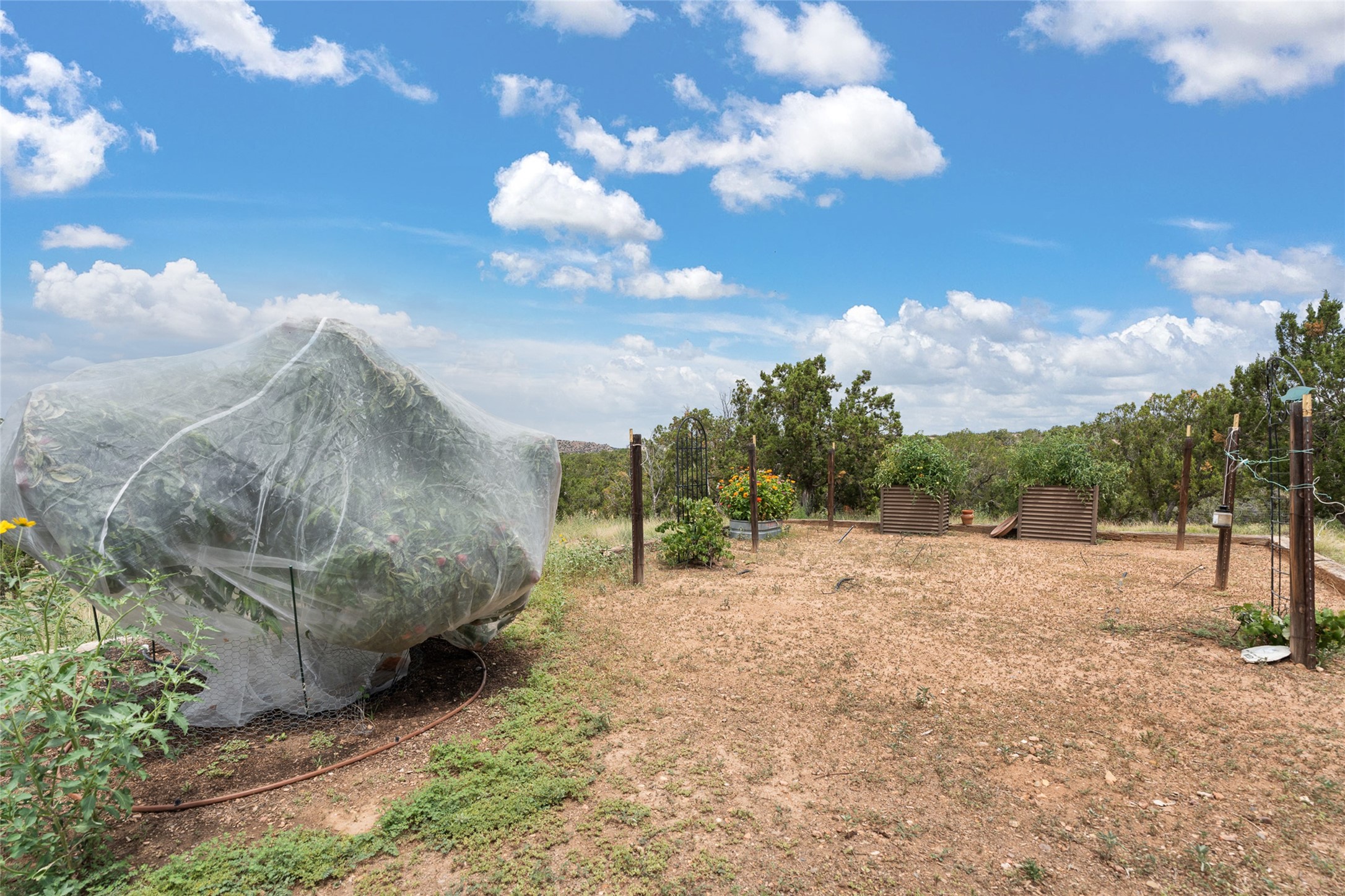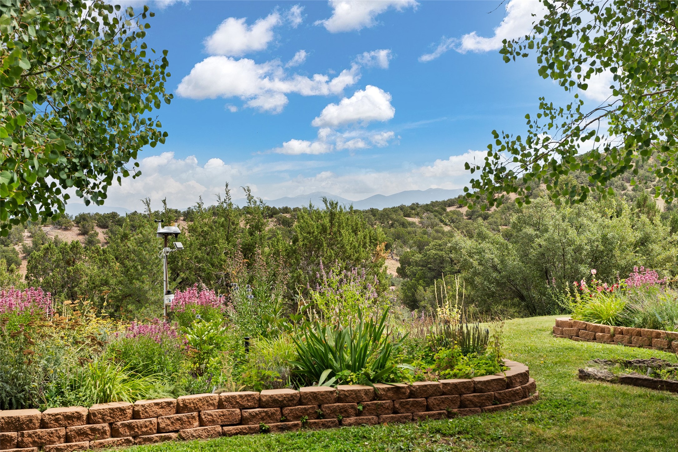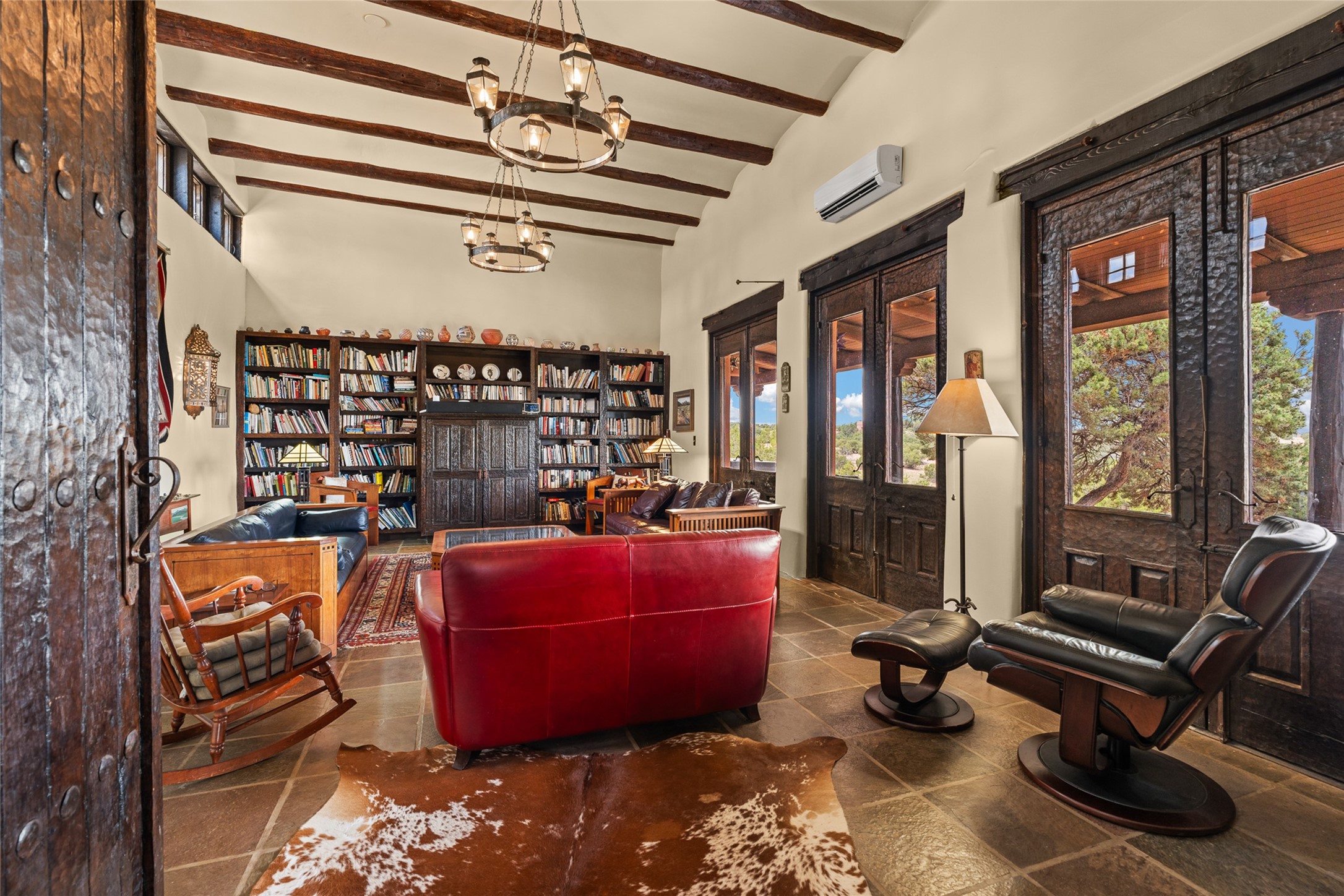 La Querencia is truly a masterful work of art! Built in 1980 with double adobe construction, hand adzed mesquite doors and windows throughout, high coved ceilings with wonderful old vigas, fabulous wrought iron chandeliers, hand cut tin sconces and chandeliers, nichos, curved walls and lovely slate stone tile flooring. It sits on 11.5 horse friendly acres, with an acre of fenced paddock space and tac room as well as proximity to BLM land and huge views to both the Sangre and Jemez mountain ranges. The 4,203 sq ft main house has radiant heat as well as mini splits in all the main rooms for both cooling and heat. Passing through the arched front gate and by the sparkling pool, one enters through magnificent French doors into a large entry/dining room with a fireplace, vigas and latilla ceiling, and views to both sunrise and sunset. Off the entry through incredible tall curved mesquite doors lies the living room with floor to ceiling bookcases, kiva fireplace and 3 sets of French doors opening to the wrap around covered portal for indoor/outdoor living. Down a curved hallway is the primary bedroom suite with an office or sitting space, tall kiva fireplace and large en suite bath with a Japanese soaking tub, spacious shower and his and hers walk in closets. The French doors from the main bedroom open again to the covered portal for nighttime soaking and stargazing from the new Hotspring spa. Down another curved hallway off the entry/dining is a chef's kitchen newly redone with quartz countertops, new cabinets with the same classic cut tin decorative fronts, new sinks, Miele dishwasher, Sub Zero full fridge and freezer. There are also 2 ovens and a 6 burner plus griddle cooktop. The cut tin chandeliers complete the scene and French doors to the covered portal make for easy outdoor grilling and dining. Following the hallway down the other side of the house is the laundry, family/media room and 3 guest bedrooms each with their own bath. The house is oriented around the South facing swimming pool and enclosed courtyard for enjoying protected outdoor seating and swimming. The swimming pool has new pumps, controller and filter, heat pump and sub panel. And the main house has a new boiler, tankless hot water heater and toilets, sinks and faucets have been replaced.The 1297 sq ft 2 bedroom 2 bath casita is pumice poured construction and is nicely separated from the main house for privacy for guests or caretaker, while close to the main 2 car garage. The living space in the guesthouse has great views, kiva fireplace and a new induction cooktop. The two bedrooms each have their own en suite baths, large walk in closets and the second bedroom has outdoor access for privacy for both bedrooms. There is also a new boiler for the radiant heat, tankless hot water heater and mini splits for heat and cooling in all the rooms. A studio/workshop/RV garage was built in 2020 and an extra garage done in 2023 - both close to the horse area. There was also a separate permitted drive added for both RV and horse trailer access. The studio/workshop/ RV garage has Anderson windows and also a mini split for heat and cooling, so could make a very cool artist's studio. The land is beautiful with flower gardens, aspens, fruit trees and a little grassy space all enjoyed off the covered wrap around portal. Don't worry about watering! There is a private well with a new well pit, pressure and pump tank and a whole house generator in case the power goes out, the water won't! This is an incredible estate - spectacular views, profound quiet, friendly neighbors and all about 20 minutes to town!