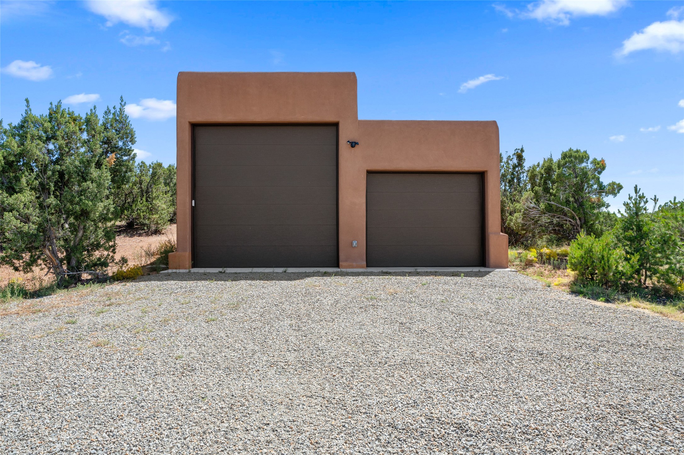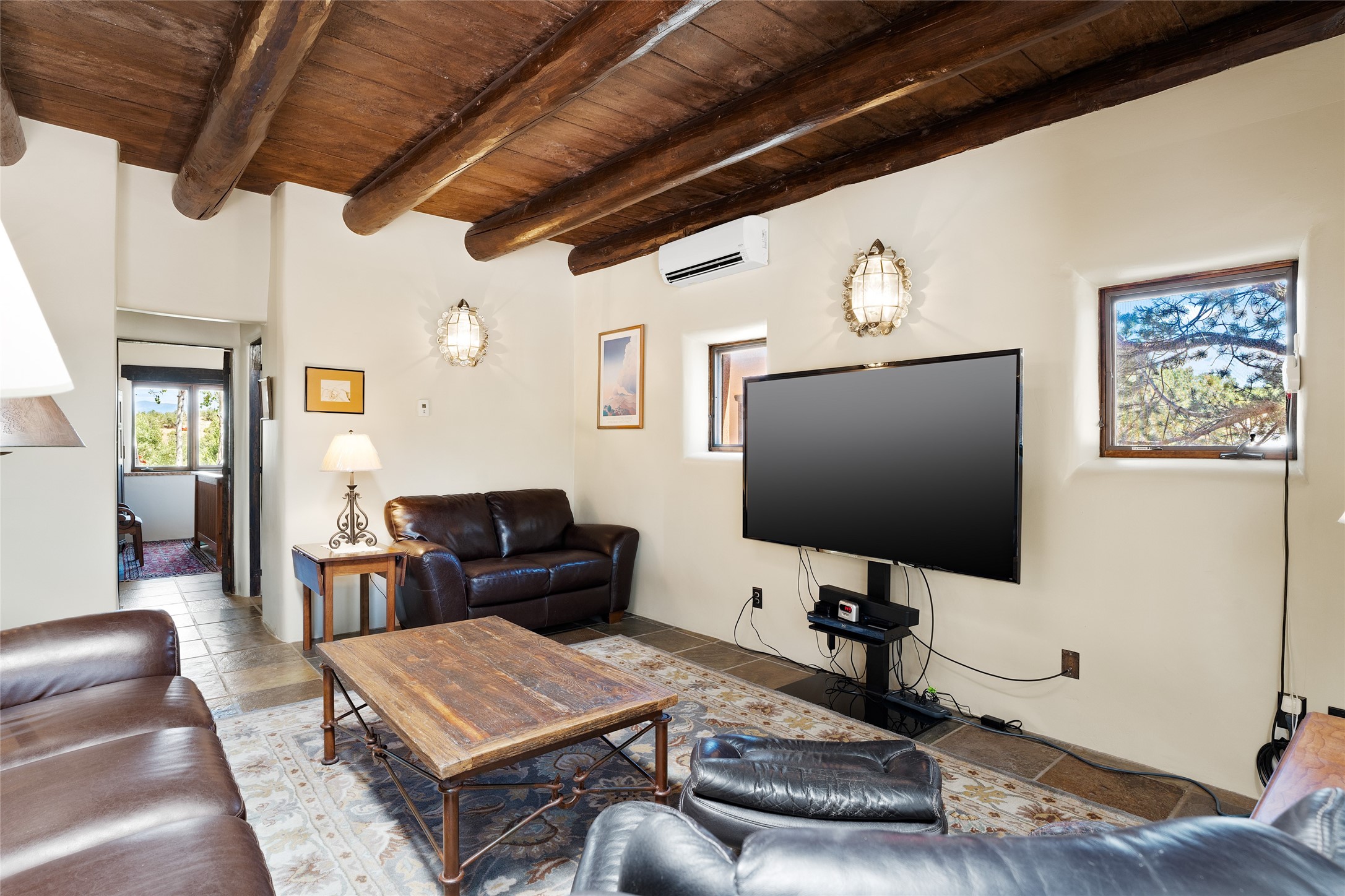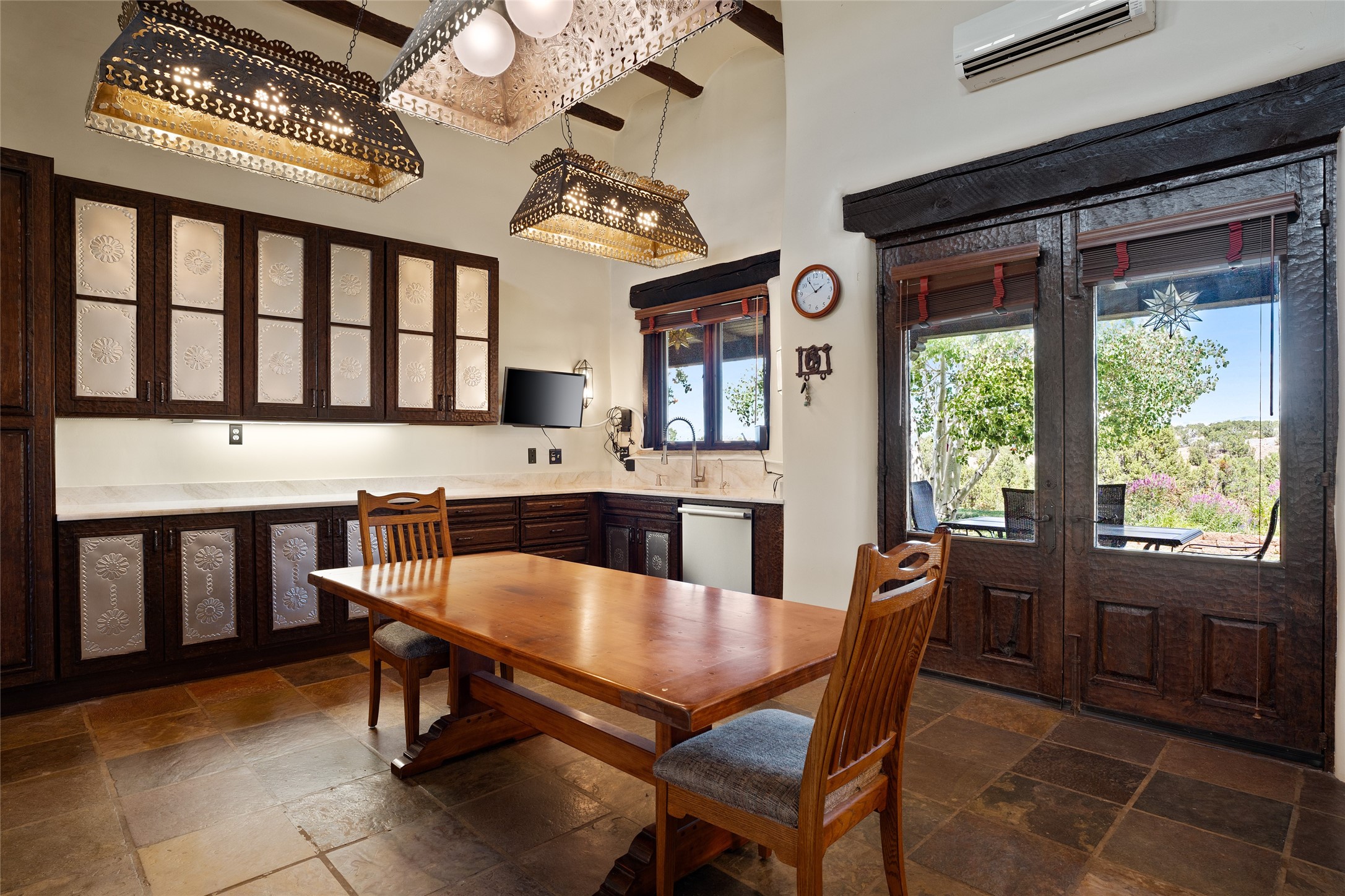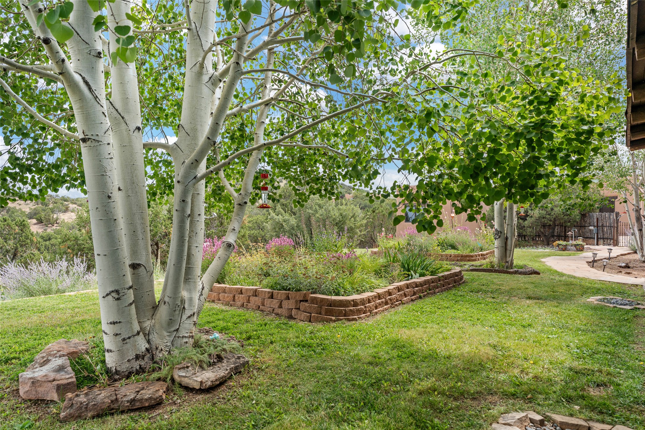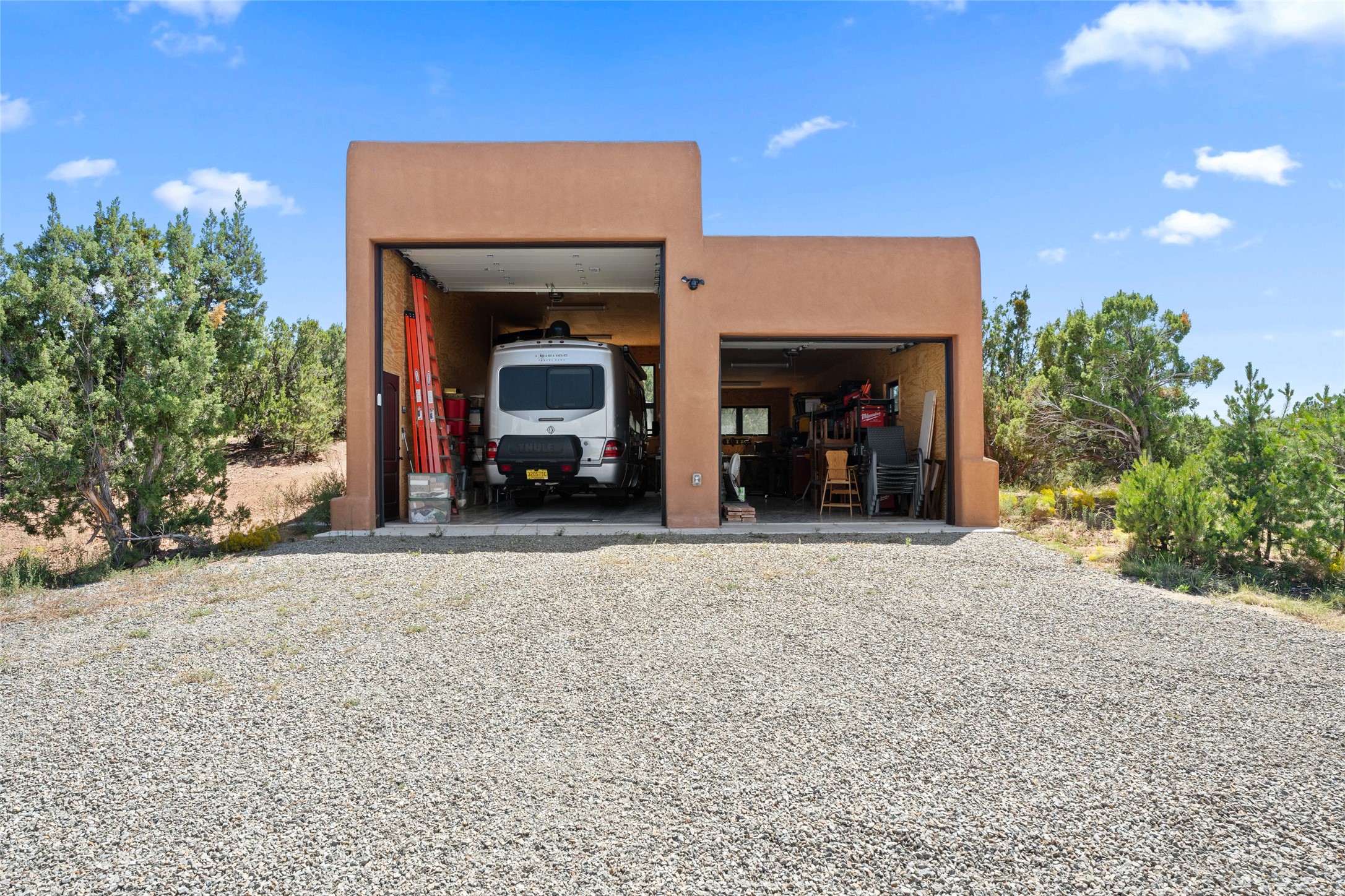 La Querencia is truly a masterful work of art! Built in 1980 with double adobe construction, hand adzed mesquite doors and windows throughout, high coved ceilings with wonderful old vigas, fabulous wrought iron chandeliers, hand cut tin sconces and chandeliers, nichos, curved walls and lovely slate stone tile flooring. It sits on 11.5 horse friendly acres, with an acre of fenced paddock space and tac room as well as proximity to BLM land and huge views to both the Sangre and Jemez mountain ranges. The 4,203 sq ft main house has radiant heat as well as mini splits in all the main rooms for both cooling and heat. Passing through the arched front gate and by the sparkling pool, one enters through magnificent French doors into a large entry/dining room with a fireplace, vigas and latilla ceiling, and views to both sunrise and sunset. Off the entry through incredible tall curved mesquite doors lies the living room with floor to ceiling bookcases, kiva fireplace and 3 sets of French doors opening to the wrap around covered portal for indoor/outdoor living. Down a curved hallway is the primary bedroom suite with an office or sitting space, tall kiva fireplace and large en suite bath with a Japanese soaking tub, spacious shower and his and hers walk in closets. The French doors from the main bedroom open again to the covered portal for nighttime soaking and stargazing from the new Hotspring spa. Down another curved hallway off the entry/dining is a chef's kitchen newly redone with quartz countertops, new cabinets with the same classic cut tin decorative fronts, new sinks, Miele dishwasher, Sub Zero full fridge and freezer. There are also 2 ovens and a 6 burner plus griddle cooktop. The cut tin chandeliers complete the scene and French doors to the covered portal make for easy outdoor grilling and dining. Following the hallway down the other side of the house is the laundry, family/media room and 3 guest bedrooms each with their own bath. The house is oriented around the South facing swimming pool and enclosed courtyard for enjoying protected outdoor seating and swimming. The swimming pool has new pumps, controller and filter, heat pump and sub panel. And the main house has a new boiler, tankless hot water heater and toilets, sinks and faucets have been replaced.The 1297 sq ft 2 bedroom 2 bath casita is pumice poured construction and is nicely separated from the main house for privacy for guests or caretaker, while close to the main 2 car garage. The living space in the guesthouse has great views, kiva fireplace and a new induction cooktop. The two bedrooms each have their own en suite baths, large walk in closets and the second bedroom has outdoor access for privacy for both bedrooms. There is also a new boiler for the radiant heat, tankless hot water heater and mini splits for heat and cooling in all the rooms. A studio/workshop/RV garage was built in 2020 and an extra garage done in 2023 - both close to the horse area. There was also a separate permitted drive added for both RV and horse trailer access. The studio/workshop/ RV garage has Anderson windows and also a mini split for heat and cooling, so could make a very cool artist's studio. The land is beautiful with flower gardens, aspens, fruit trees and a little grassy space all enjoyed off the covered wrap around portal. Don't worry about watering! There is a private well with a new well pit, pressure and pump tank and a whole house generator in case the power goes out, the water won't! This is an incredible estate - spectacular views, profound quiet, friendly neighbors and all about 20 minutes to town!