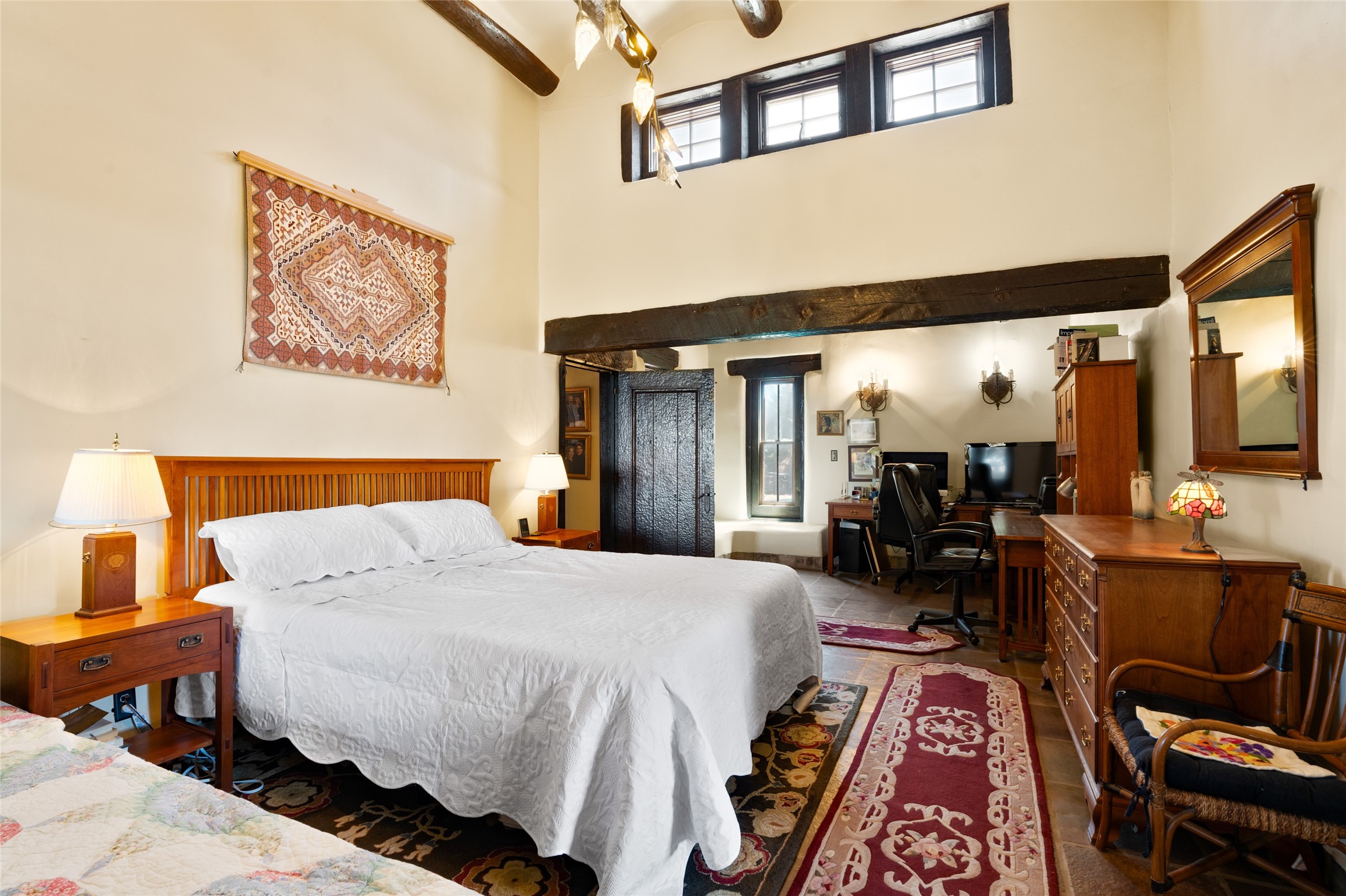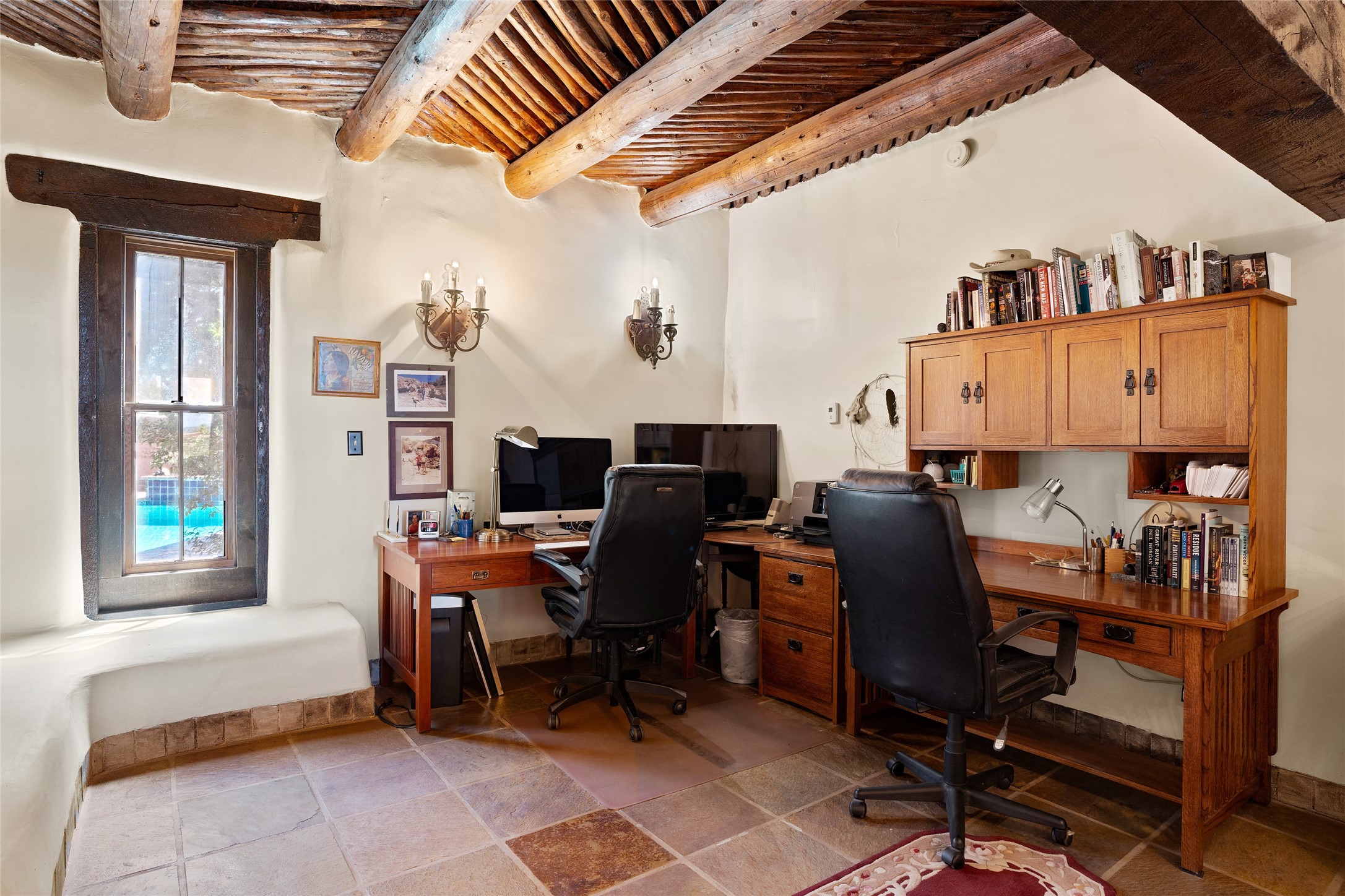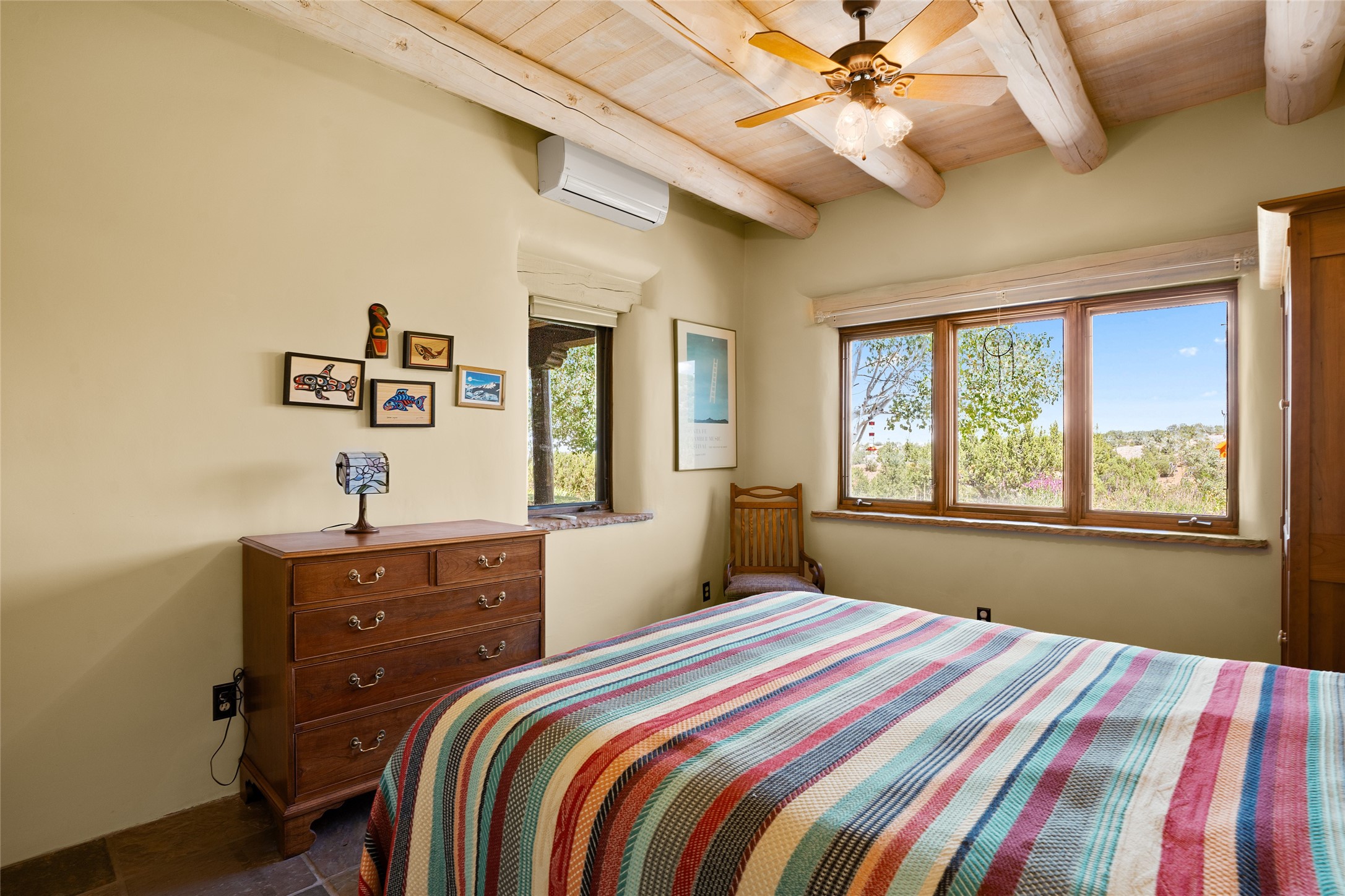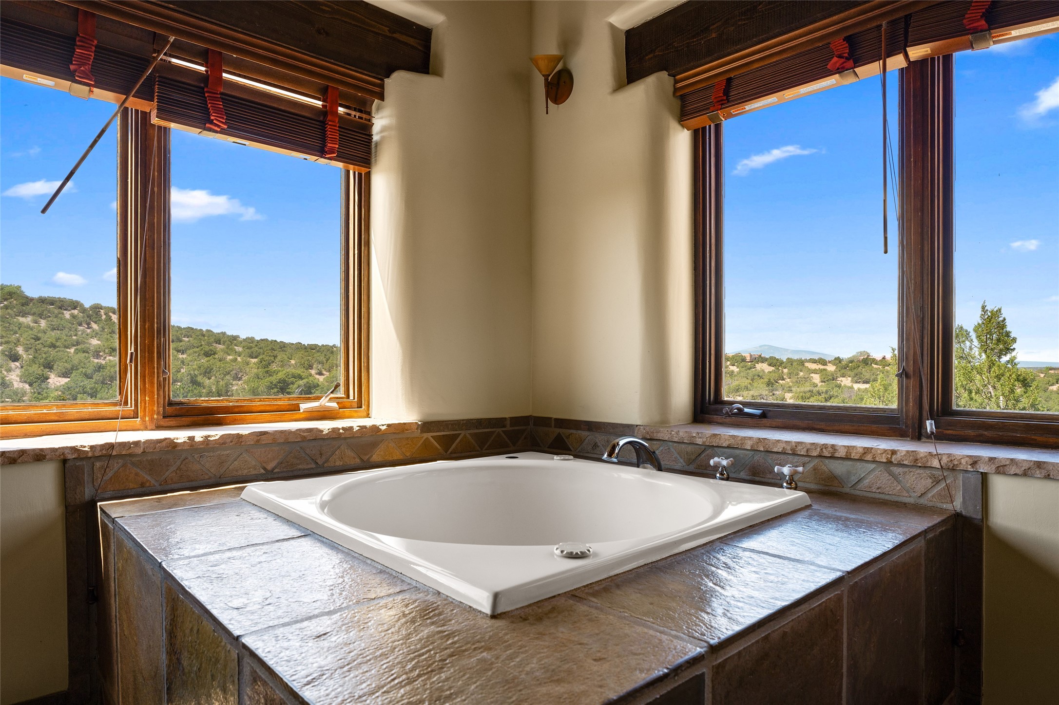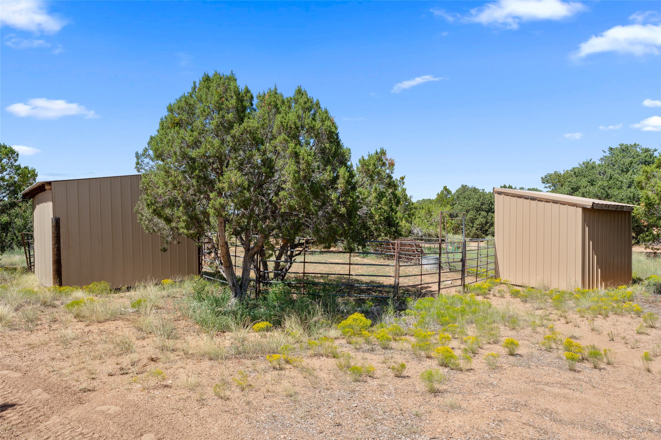 La Querencia is truly a masterful work of art! Built in 1980 with double adobe construction, hand adzed mesquite doors and windows throughout, high coved ceilings with wonderful old vigas, fabulous wrought iron chandeliers, hand cut tin sconces and chandeliers, nichos, curved walls and lovely slate stone tile flooring. It sits on 11.5 horse friendly acres, with an acre of fenced paddock space and tac room as well as proximity to BLM land and huge views to both the Sangre and Jemez mountain ranges. The 4,203 sq ft main house has radiant heat as well as mini splits in all the main rooms for both cooling and heat. Passing through the arched front gate and by the sparkling pool, one enters through magnificent French doors into a large entry/dining room with a fireplace, vigas and latilla ceiling, and views to both sunrise and sunset. Off the entry through incredible tall curved mesquite doors lies the living room with floor to ceiling bookcases, kiva fireplace and 3 sets of French doors opening to the wrap around covered portal for indoor/outdoor living. Down a curved hallway is the primary bedroom suite with an office or sitting space, tall kiva fireplace and large en suite bath with a Japanese soaking tub, spacious shower and his and hers walk in closets. The French doors from the main bedroom open again to the covered portal for nighttime soaking and stargazing from the new Hotspring spa. Down another curved hallway off the entry/dining is a chef's kitchen newly redone with quartz countertops, new cabinets with the same classic cut tin decorative fronts, new sinks, Miele dishwasher, Sub Zero full fridge and freezer. There are also 2 ovens and a 6 burner plus griddle cooktop. The cut tin chandeliers complete the scene and French doors to the covered portal make for easy outdoor grilling and dining. Following the hallway down the other side of the house is the laundry, family/media room and 3 guest bedrooms each with their own bath. The house is oriented around the South facing swimming pool and enclosed courtyard for enjoying protected outdoor seating and swimming. The swimming pool has new pumps, controller and filter, heat pump and sub panel. And the main house has a new boiler, tankless hot water heater and toilets, sinks and faucets have been replaced.The 1297 sq ft 2 bedroom 2 bath casita is pumice poured construction and is nicely separated from the main house for privacy for guests or caretaker, while close to the main 2 car garage. The living space in the guesthouse has great views, kiva fireplace and a new induction cooktop. The two bedrooms each have their own en suite baths, large walk in closets and the second bedroom has outdoor access for privacy for both bedrooms. There is also a new boiler for the radiant heat, tankless hot water heater and mini splits for heat and cooling in all the rooms. A studio/workshop/RV garage was built in 2020 and an extra garage done in 2023 - both close to the horse area. There was also a separate permitted drive added for both RV and horse trailer access. The studio/workshop/ RV garage has Anderson windows and also a mini split for heat and cooling, so could make a very cool artist's studio. The land is beautiful with flower gardens, aspens, fruit trees and a little grassy space all enjoyed off the covered wrap around portal. Don't worry about watering! There is a private well with a new well pit, pressure and pump tank and a whole house generator in case the power goes out, the water won't! This is an incredible estate - spectacular views, profound quiet, friendly neighbors and all about 20 minutes to town!