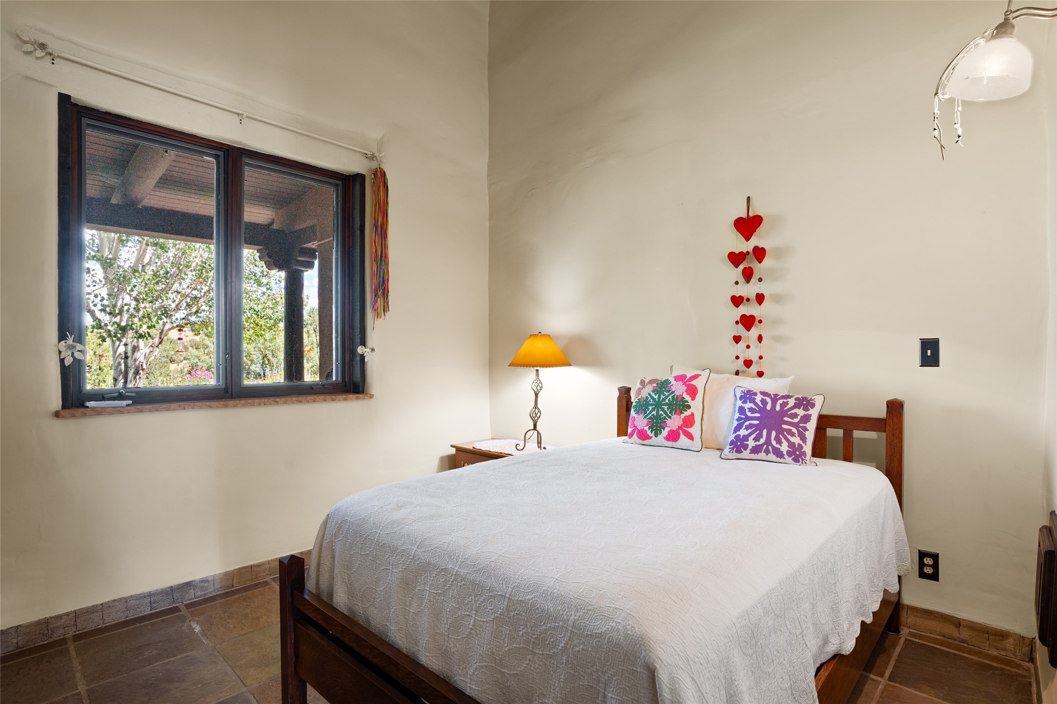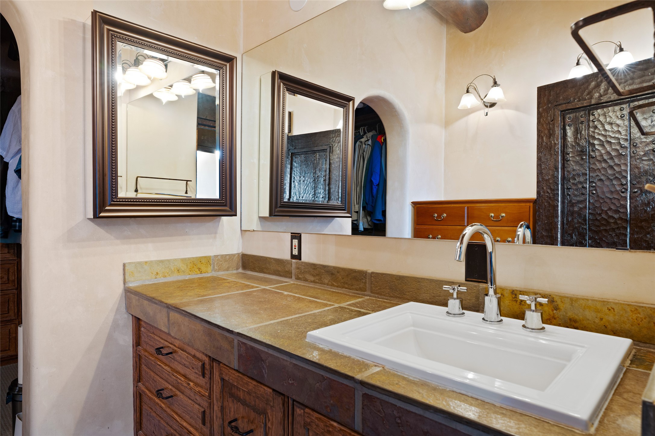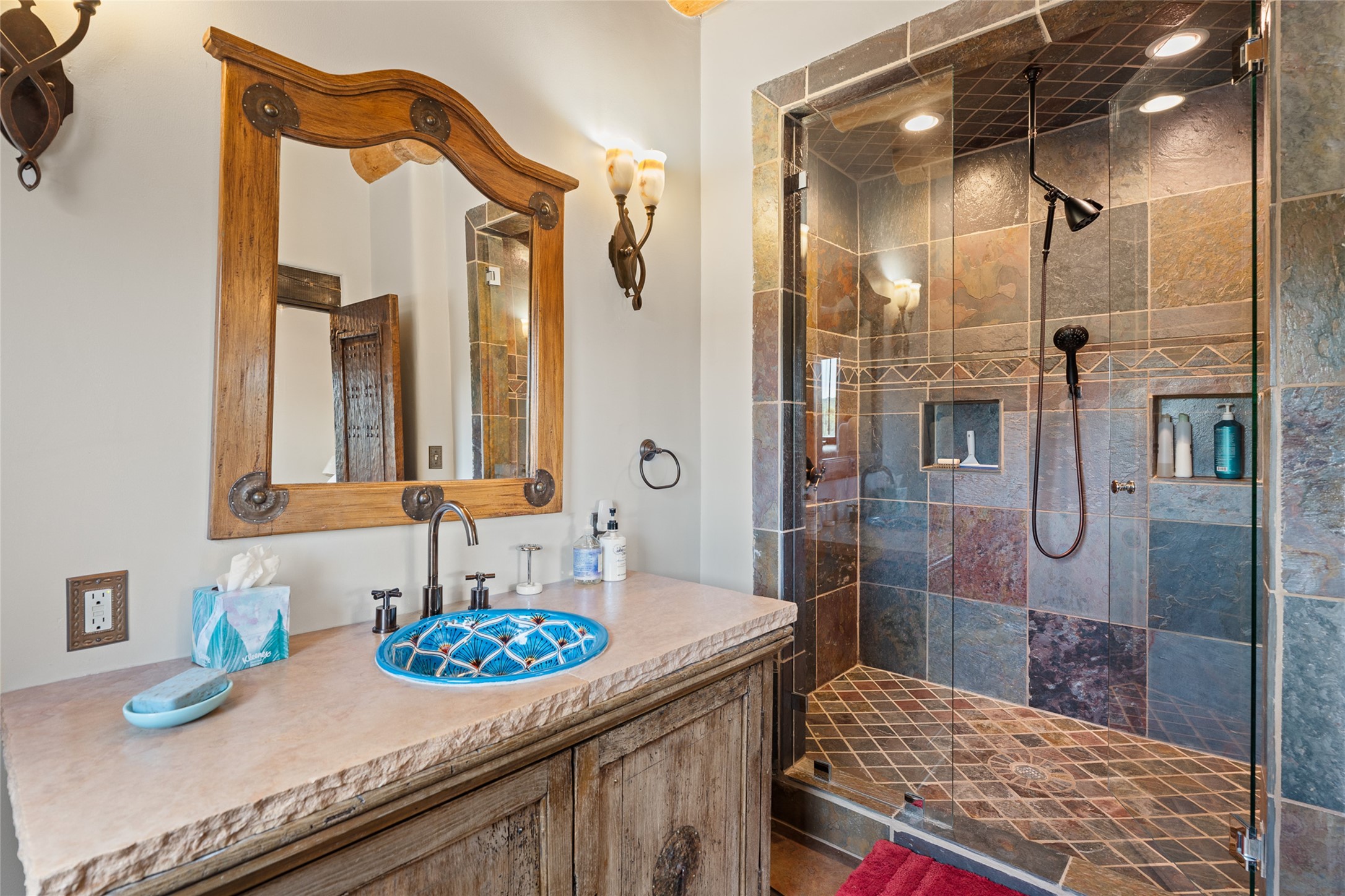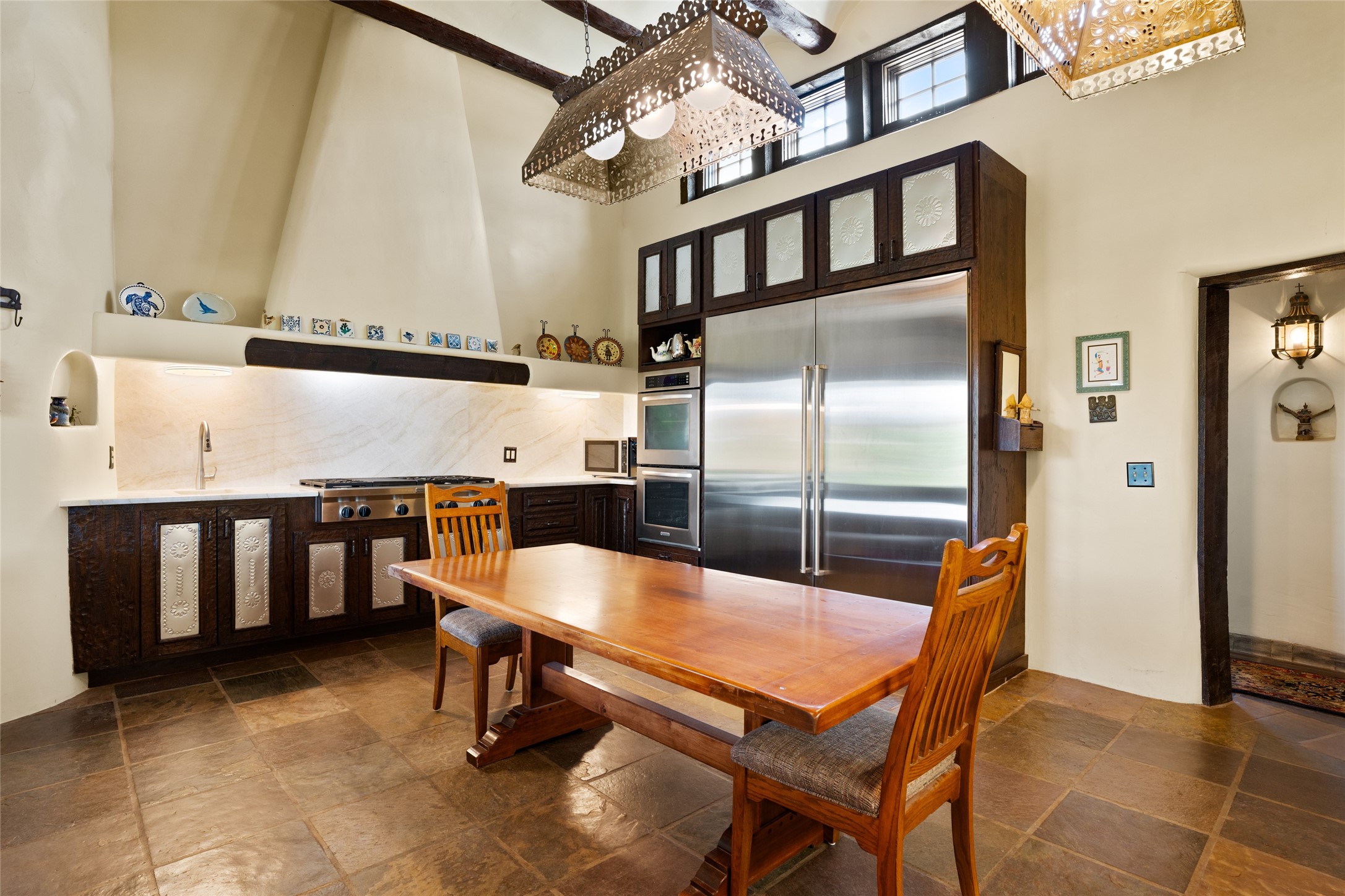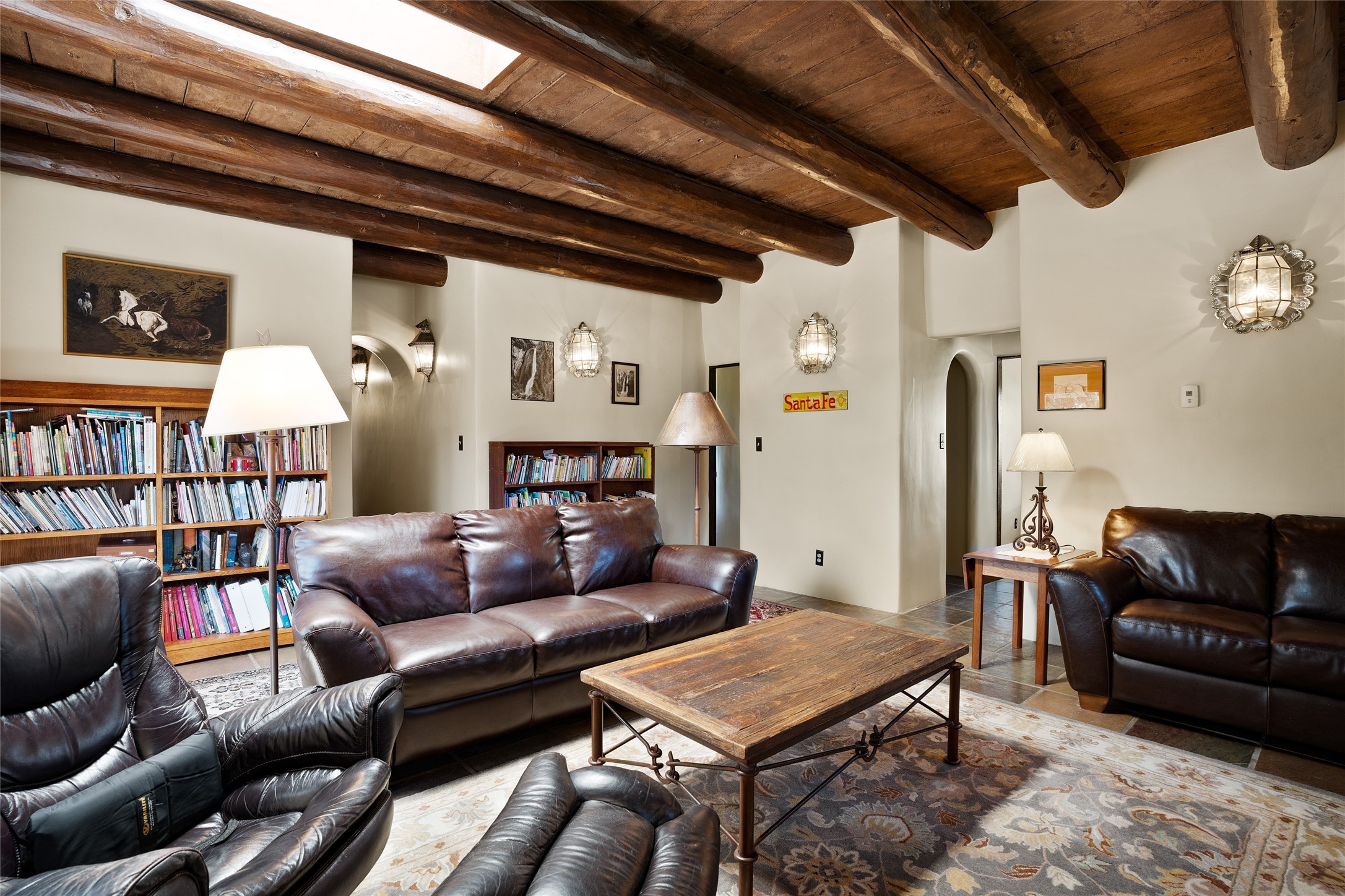 La Querencia is truly a masterful work of art! Built in 1980 with double adobe construction, hand adzed mesquite doors and windows throughout, high coved ceilings with wonderful old vigas, fabulous wrought iron chandeliers, hand cut tin sconces and chandeliers, nichos, curved walls and lovely slate stone tile flooring. It sits on 11.5 horse friendly acres, with an acre of fenced paddock space and tac room as well as proximity to BLM land and huge views to both the Sangre and Jemez mountain ranges. The 4,203 sq ft main house has radiant heat as well as mini splits in all the main rooms for both cooling and heat. Passing through the arched front gate and by the sparkling pool, one enters through magnificent French doors into a large entry/dining room with a fireplace, vigas and latilla ceiling, and views to both sunrise and sunset. Off the entry through incredible tall curved mesquite doors lies the living room with floor to ceiling bookcases, kiva fireplace and 3 sets of French doors opening to the wrap around covered portal for indoor/outdoor living. Down a curved hallway is the primary bedroom suite with an office or sitting space, tall kiva fireplace and large en suite bath with a Japanese soaking tub, spacious shower and his and hers walk in closets. The French doors from the main bedroom open again to the covered portal for nighttime soaking and stargazing from the new Hotspring spa. Down another curved hallway off the entry/dining is a chef's kitchen newly redone with quartz countertops, new cabinets with the same classic cut tin decorative fronts, new sinks, Miele dishwasher, Sub Zero full fridge and freezer. There are also 2 ovens and a 6 burner plus griddle cooktop. The cut tin chandeliers complete the scene and French doors to the covered portal make for easy outdoor grilling and dining. Following the hallway down the other side of the house is the laundry, family/media room and 3 guest bedrooms each with their own bath. The house is oriented around the South facing swimming pool and enclosed courtyard for enjoying protected outdoor seating and swimming. The swimming pool has new pumps, controller and filter, heat pump and sub panel. And the main house has a new boiler, tankless hot water heater and toilets, sinks and faucets have been replaced.The 1297 sq ft 2 bedroom 2 bath casita is pumice poured construction and is nicely separated from the main house for privacy for guests or caretaker, while close to the main 2 car garage. The living space in the guesthouse has great views, kiva fireplace and a new induction cooktop. The two bedrooms each have their own en suite baths, large walk in closets and the second bedroom has outdoor access for privacy for both bedrooms. There is also a new boiler for the radiant heat, tankless hot water heater and mini splits for heat and cooling in all the rooms. A studio/workshop/RV garage was built in 2020 and an extra garage done in 2023 - both close to the horse area. There was also a separate permitted drive added for both RV and horse trailer access. The studio/workshop/ RV garage has Anderson windows and also a mini split for heat and cooling, so could make a very cool artist's studio. The land is beautiful with flower gardens, aspens, fruit trees and a little grassy space all enjoyed off the covered wrap around portal. Don't worry about watering! There is a private well with a new well pit, pressure and pump tank and a whole house generator in case the power goes out, the water won't! This is an incredible estate - spectacular views, profound quiet, friendly neighbors and all about 20 minutes to town!