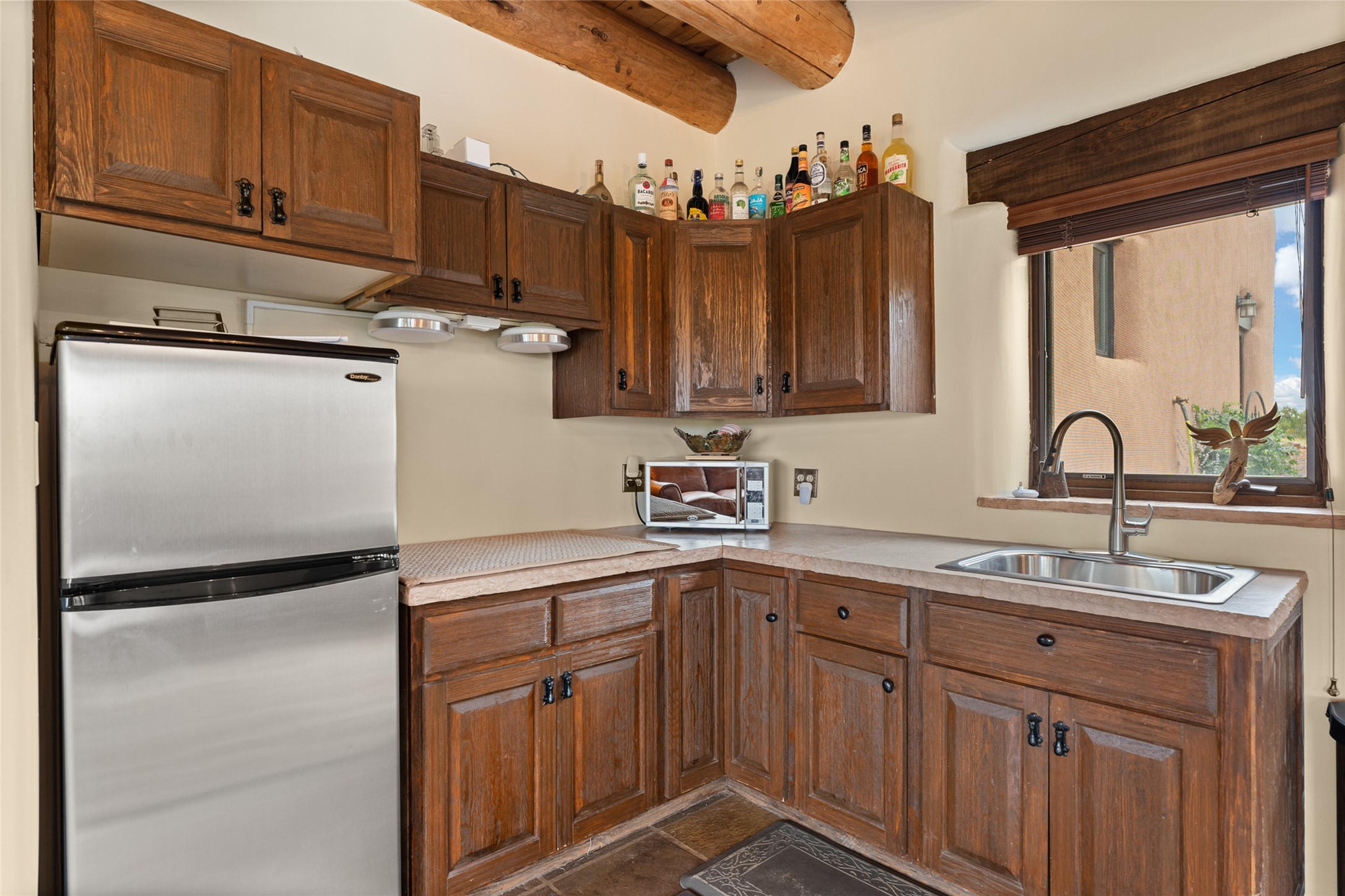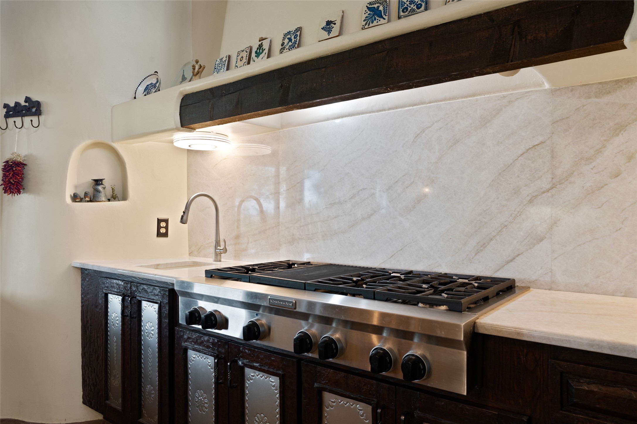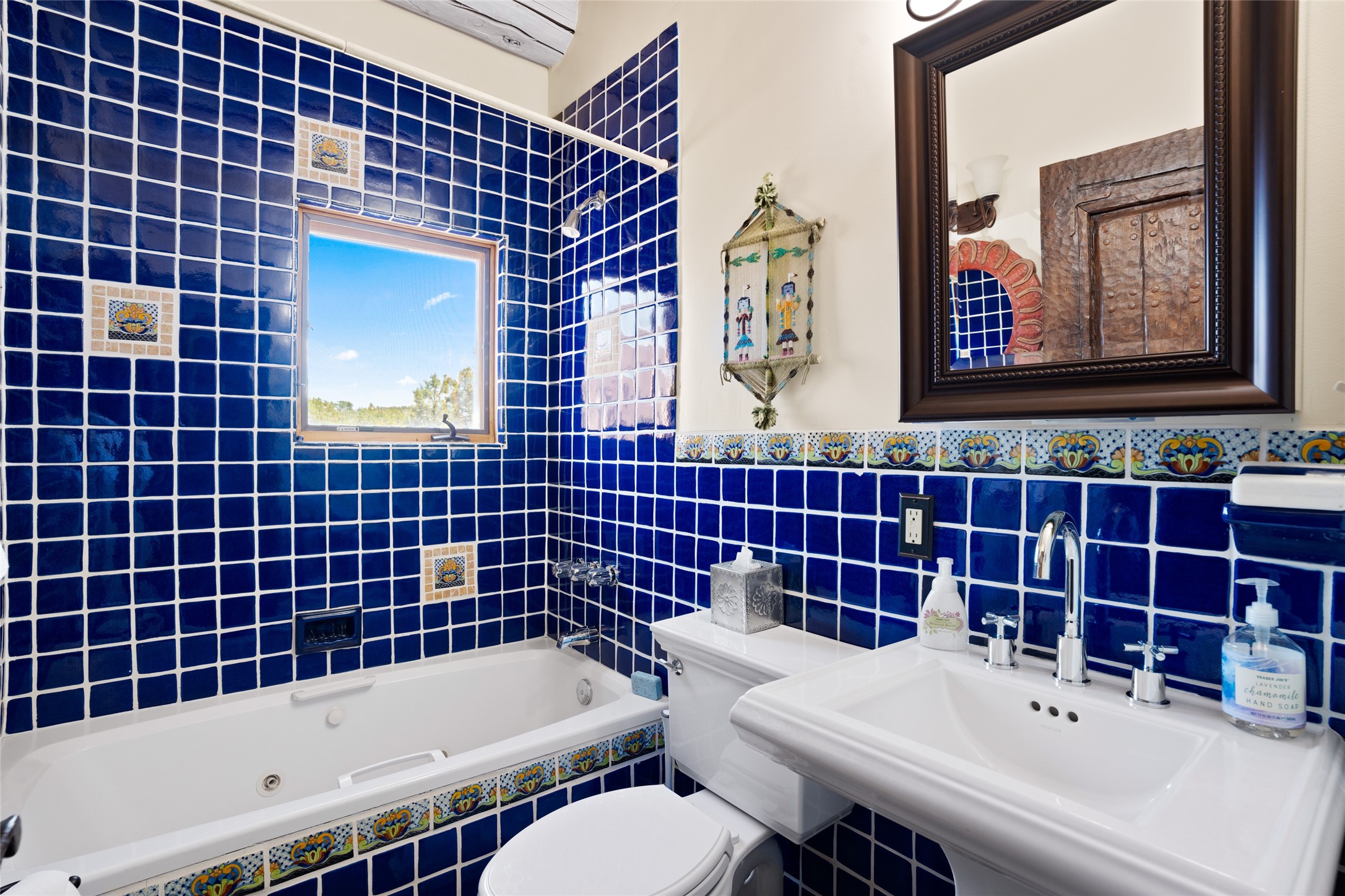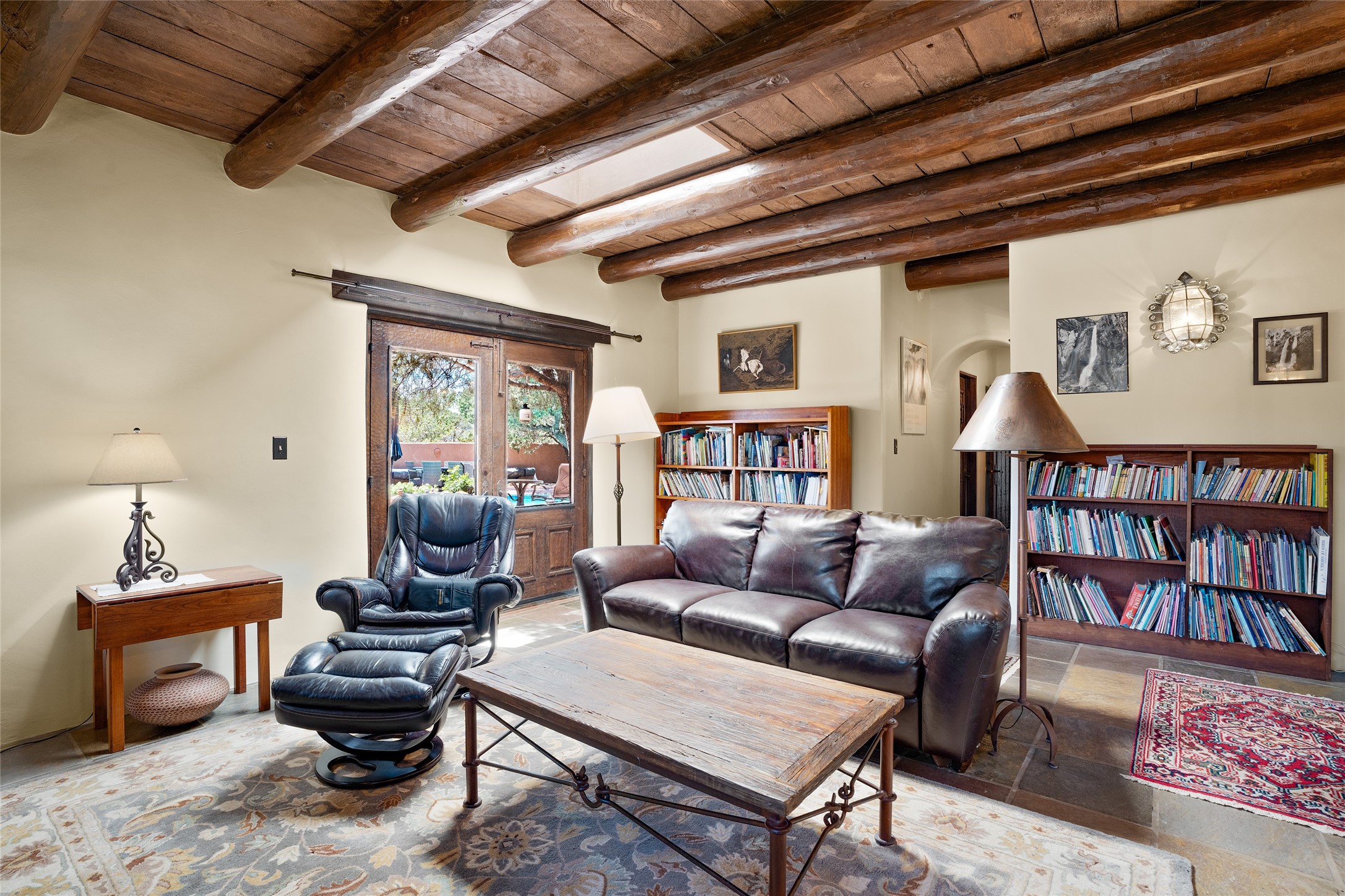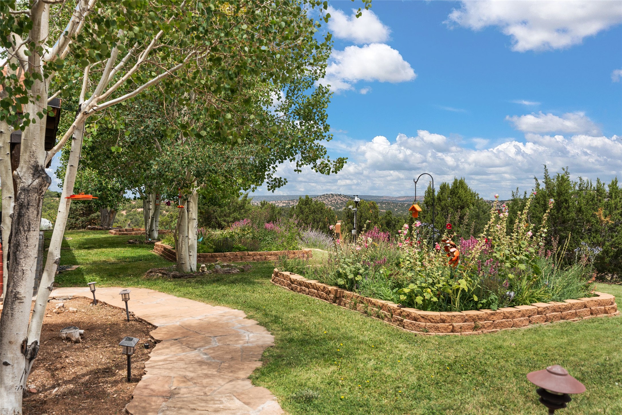 La Querencia is truly a masterful work of art! Built in 1980 with double adobe construction, hand adzed mesquite doors and windows throughout, high coved ceilings with wonderful old vigas, fabulous wrought iron chandeliers, hand cut tin sconces and chandeliers, nichos, curved walls and lovely slate stone tile flooring. It sits on 11.5 horse friendly acres, with an acre of fenced paddock space and tac room as well as proximity to BLM land and huge views to both the Sangre and Jemez mountain ranges. The 4,203 sq ft main house has radiant heat as well as mini splits in all the main rooms for both cooling and heat. Passing through the arched front gate and by the sparkling pool, one enters through magnificent French doors into a large entry/dining room with a fireplace, vigas and latilla ceiling, and views to both sunrise and sunset. Off the entry through incredible tall curved mesquite doors lies the living room with floor to ceiling bookcases, kiva fireplace and 3 sets of French doors opening to the wrap around covered portal for indoor/outdoor living. Down a curved hallway is the primary bedroom suite with an office or sitting space, tall kiva fireplace and large en suite bath with a Japanese soaking tub, spacious shower and his and hers walk in closets. The French doors from the main bedroom open again to the covered portal for nighttime soaking and stargazing from the new Hotspring spa. Down another curved hallway off the entry/dining is a chef's kitchen newly redone with quartz countertops, new cabinets with the same classic cut tin decorative fronts, new sinks, Miele dishwasher, Sub Zero full fridge and freezer. There are also 2 ovens and a 6 burner plus griddle cooktop. The cut tin chandeliers complete the scene and French doors to the covered portal make for easy outdoor grilling and dining. Following the hallway down the other side of the house is the laundry, family/media room and 3 guest bedrooms each with their own bath. The house is oriented around the South facing swimming pool and enclosed courtyard for enjoying protected outdoor seating and swimming. The swimming pool has new pumps, controller and filter, heat pump and sub panel. And the main house has a new boiler, tankless hot water heater and toilets, sinks and faucets have been replaced.The 1297 sq ft 2 bedroom 2 bath casita is pumice poured construction and is nicely separated from the main house for privacy for guests or caretaker, while close to the main 2 car garage. The living space in the guesthouse has great views, kiva fireplace and a new induction cooktop. The two bedrooms each have their own en suite baths, large walk in closets and the second bedroom has outdoor access for privacy for both bedrooms. There is also a new boiler for the radiant heat, tankless hot water heater and mini splits for heat and cooling in all the rooms. A studio/workshop/RV garage was built in 2020 and an extra garage done in 2023 - both close to the horse area. There was also a separate permitted drive added for both RV and horse trailer access. The studio/workshop/ RV garage has Anderson windows and also a mini split for heat and cooling, so could make a very cool artist's studio. The land is beautiful with flower gardens, aspens, fruit trees and a little grassy space all enjoyed off the covered wrap around portal. Don't worry about watering! There is a private well with a new well pit, pressure and pump tank and a whole house generator in case the power goes out, the water won't! This is an incredible estate - spectacular views, profound quiet, friendly neighbors and all about 20 minutes to town!